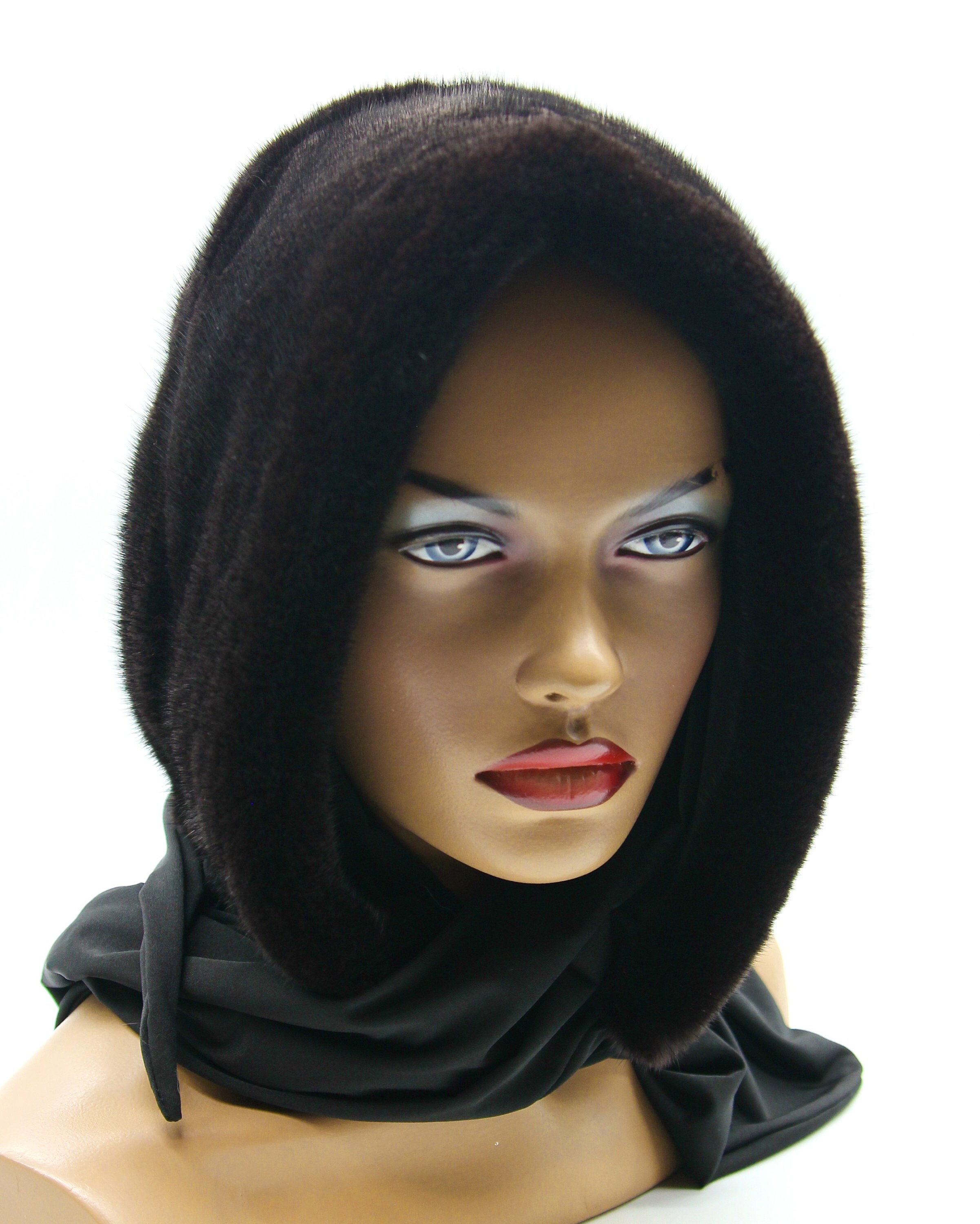 Womens mink fur hat headdress winter hooded shawl scarf dark brown