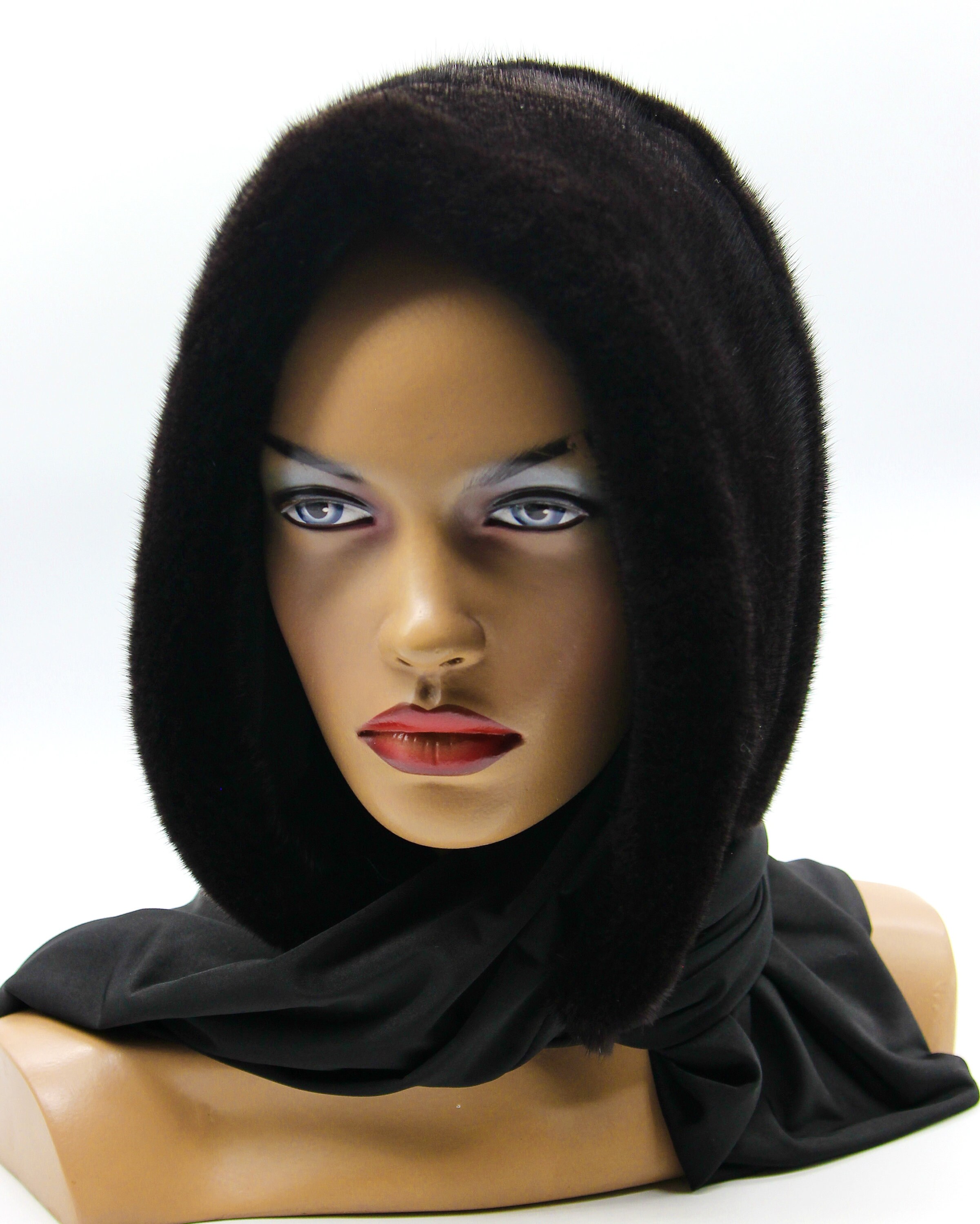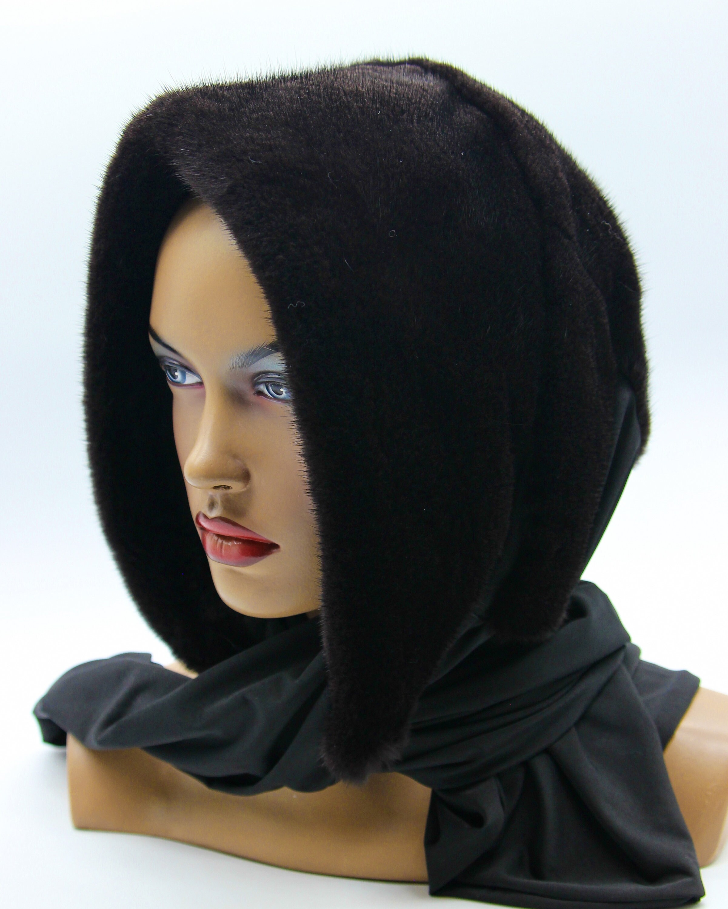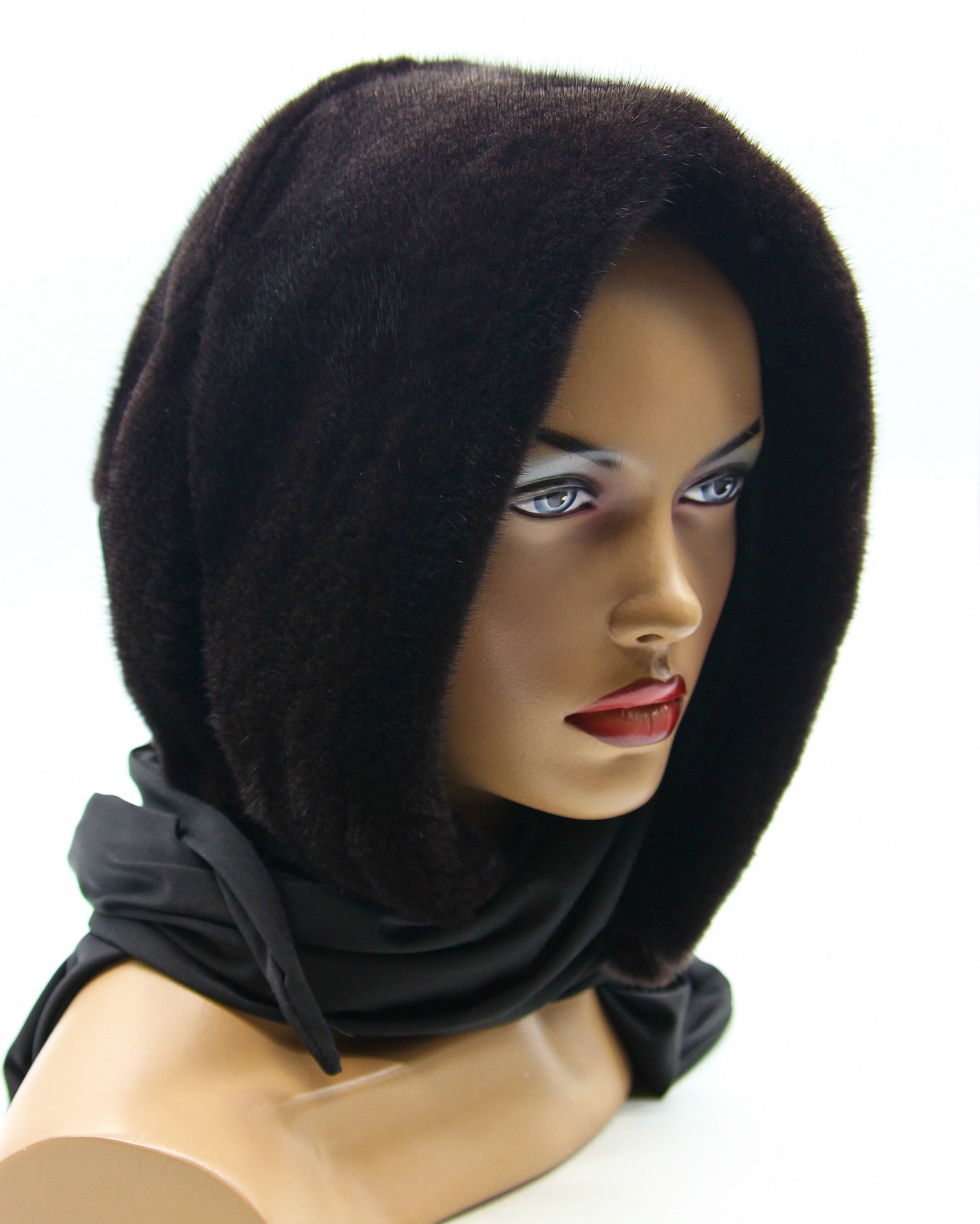 The base is crafted from high-quality knitwear for a comfortable fit and is exquisitely adorned with mink fur. The mink fur, known for its excellent warmth and comfort, adds a layer of sophistication to this versatile headdress. The dark brown color lends an aura of elegance, allowing it to blend seamlessly with your winter wardrobe.
