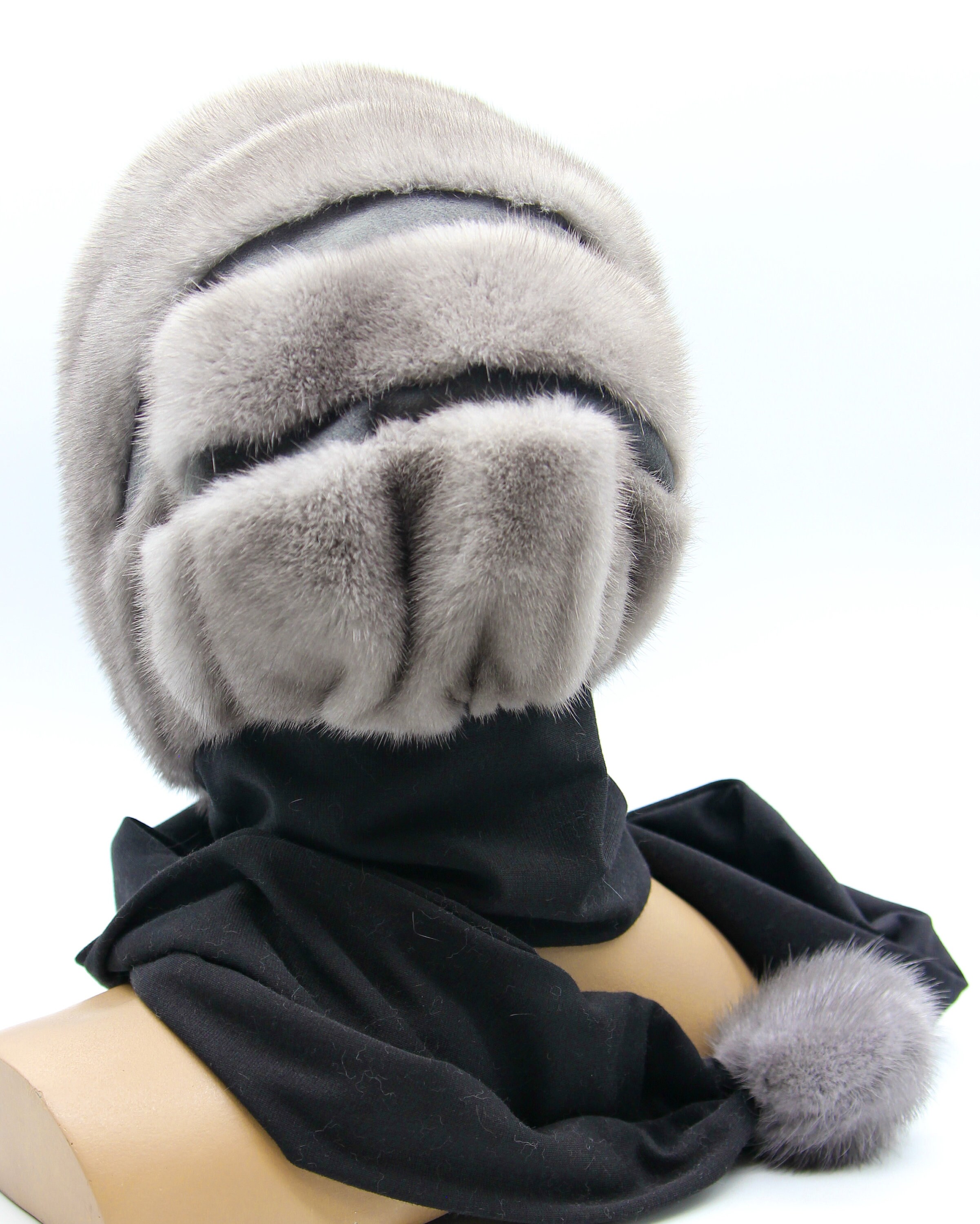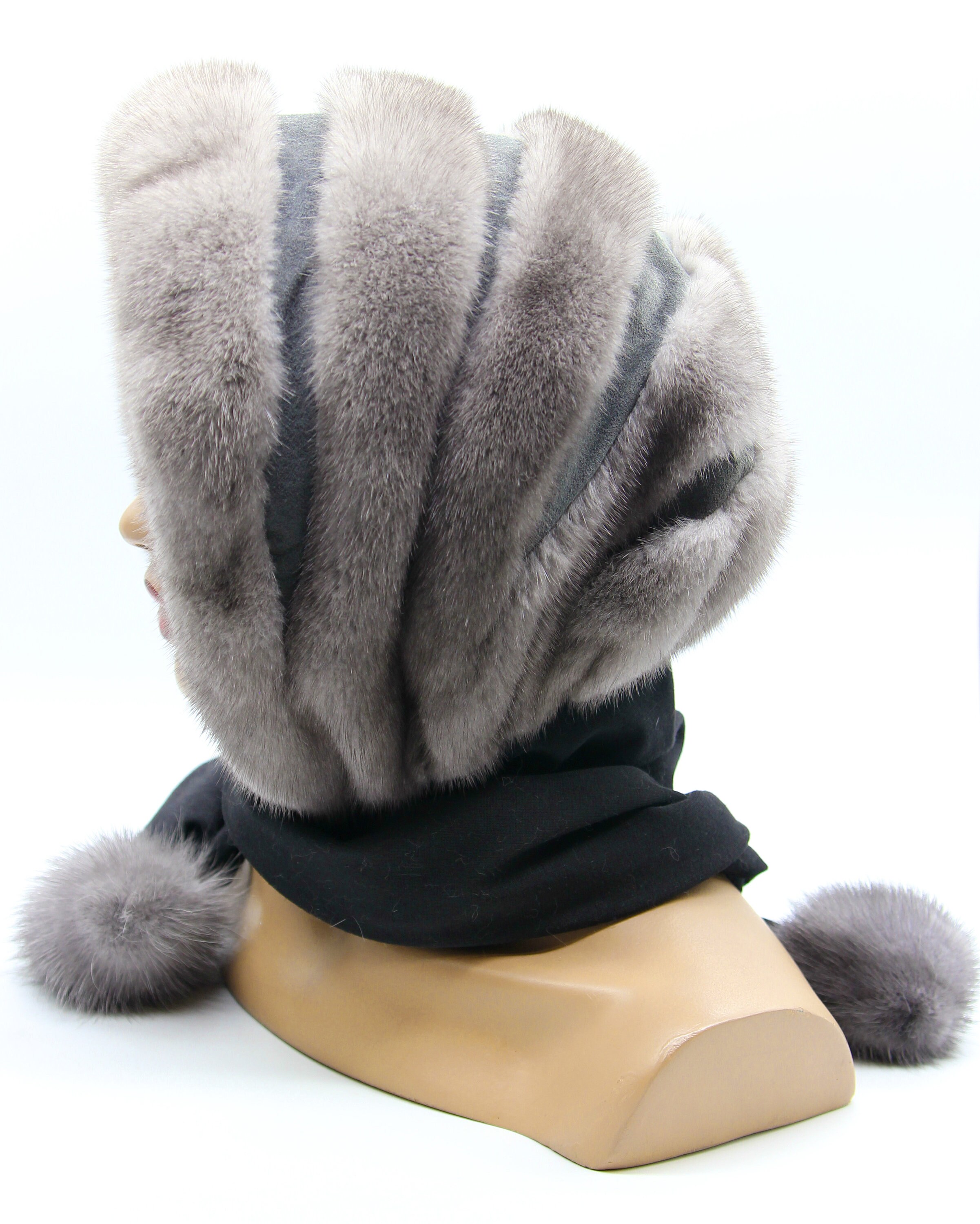 Designed and meticulously crafted in Ukraine, we introduce our Fur Hat Scarf - an adaptable winter accessory that also serves as a Women's Headdress and Winter Hooded Shawl. Its superior knitwear base is intricately interwoven with alternating strips of genuine mink fur and suede, creating a unique texture and aesthetic that radiates luxury and style.