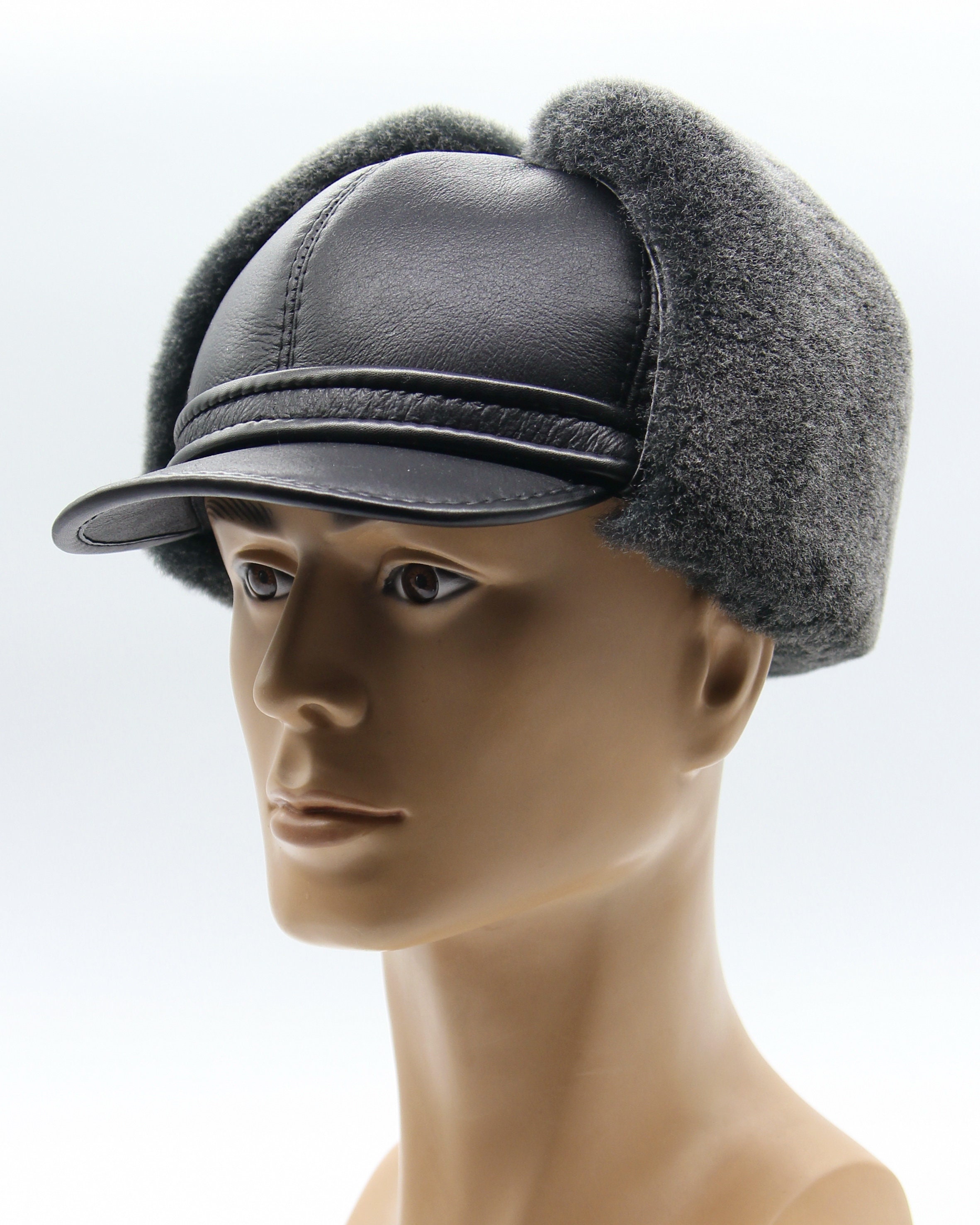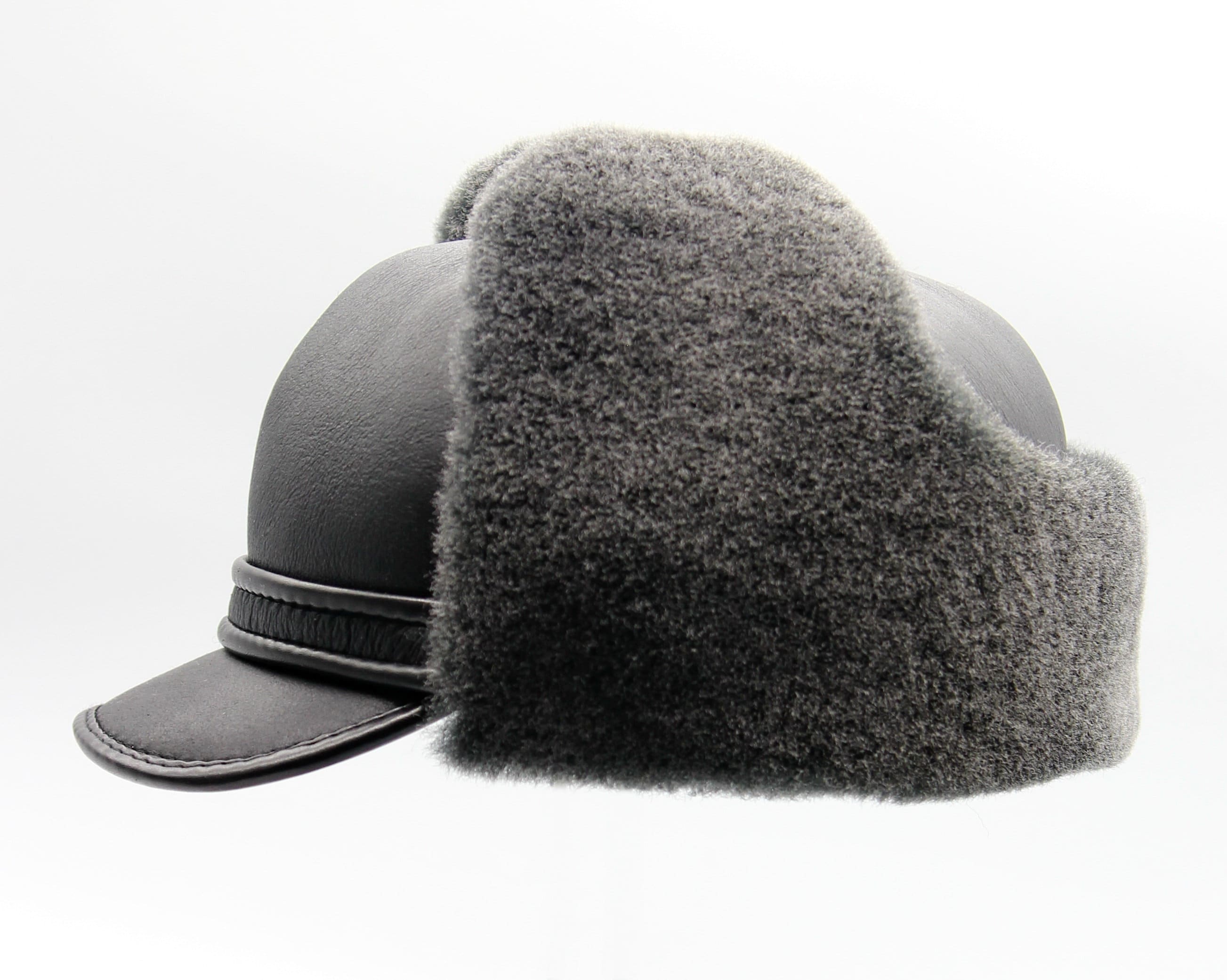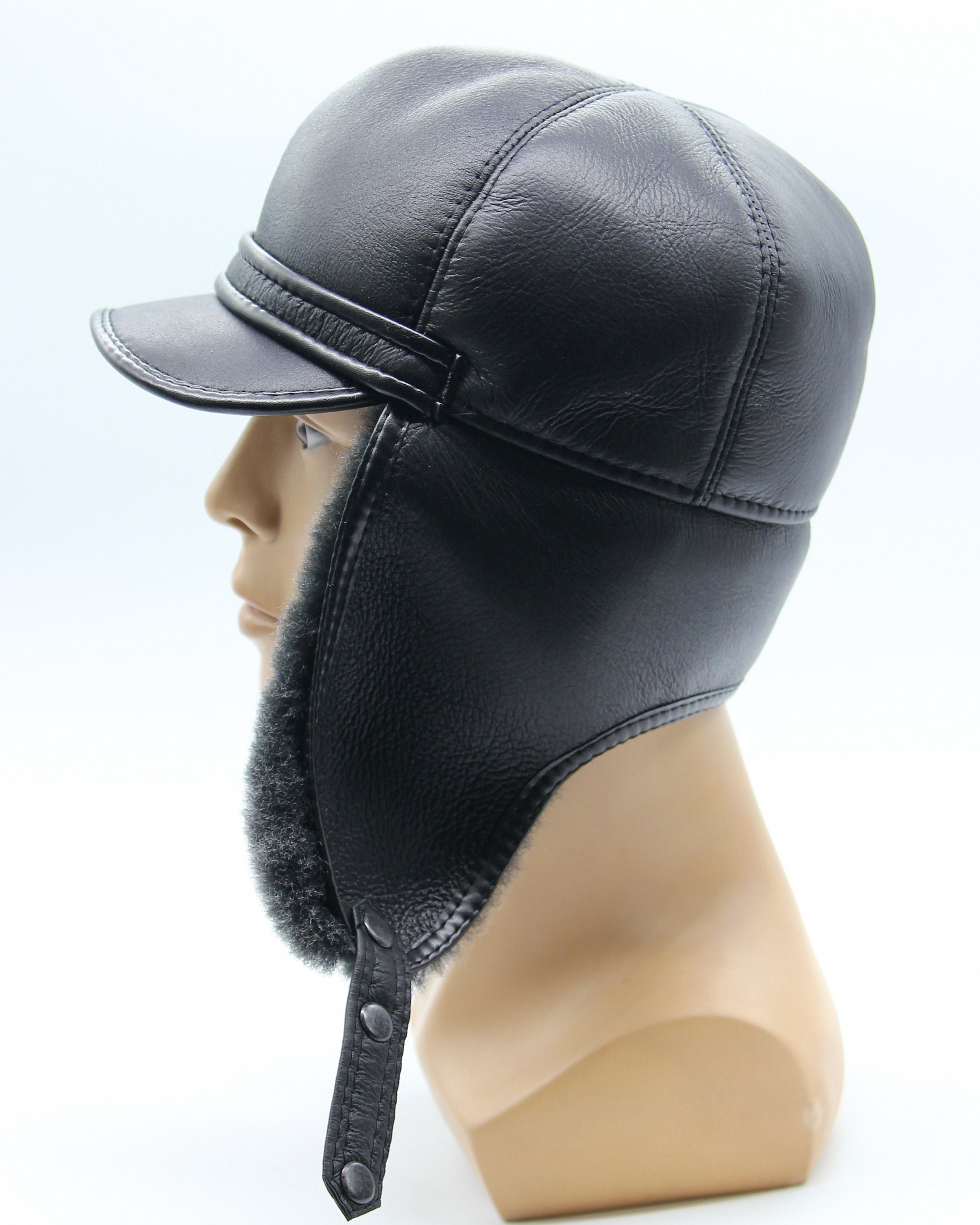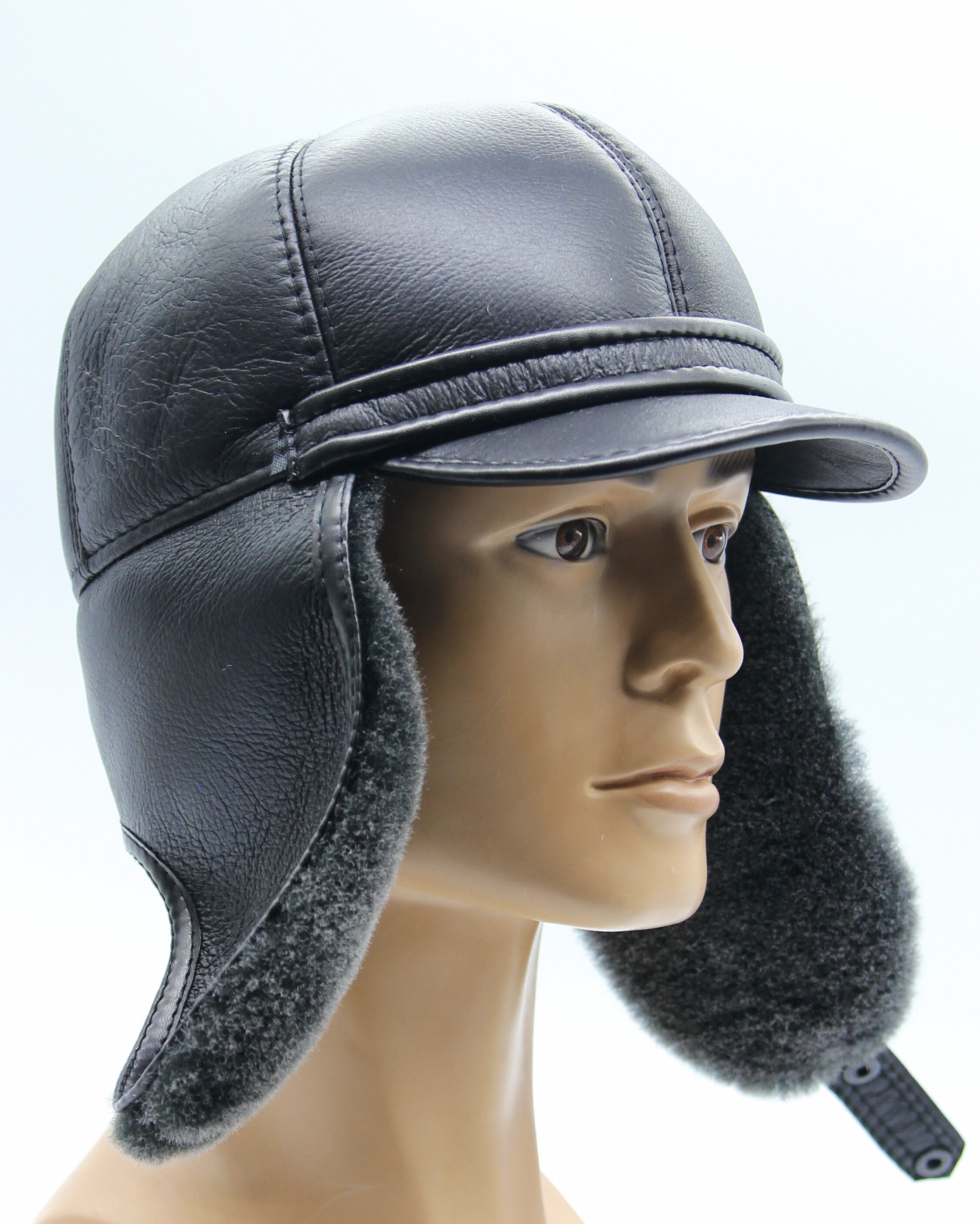 Black Shearling Visor Cap - Men's Aviator Ushanka Fur Hat with Sheepskin
