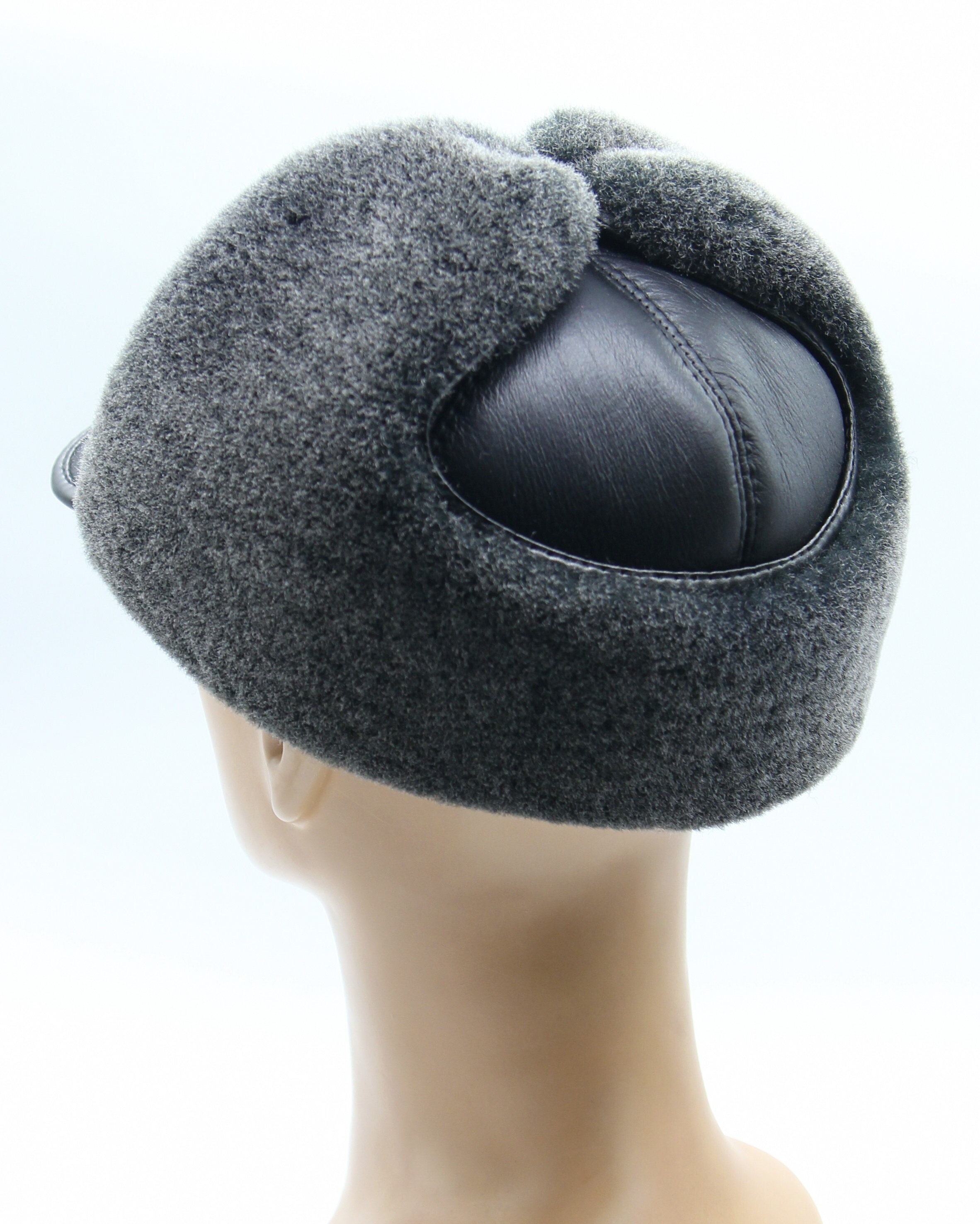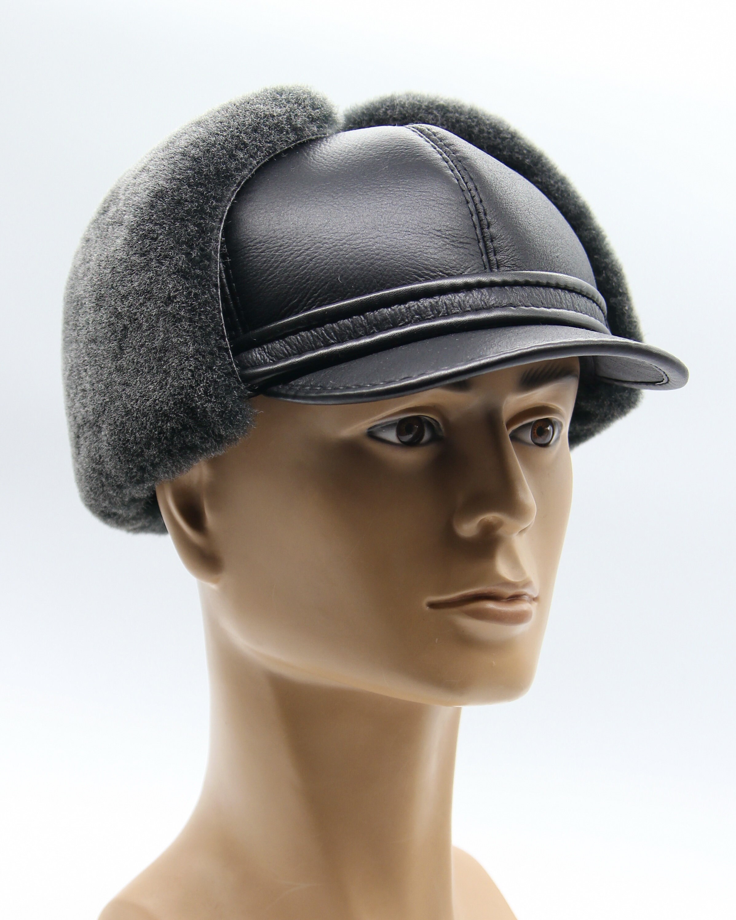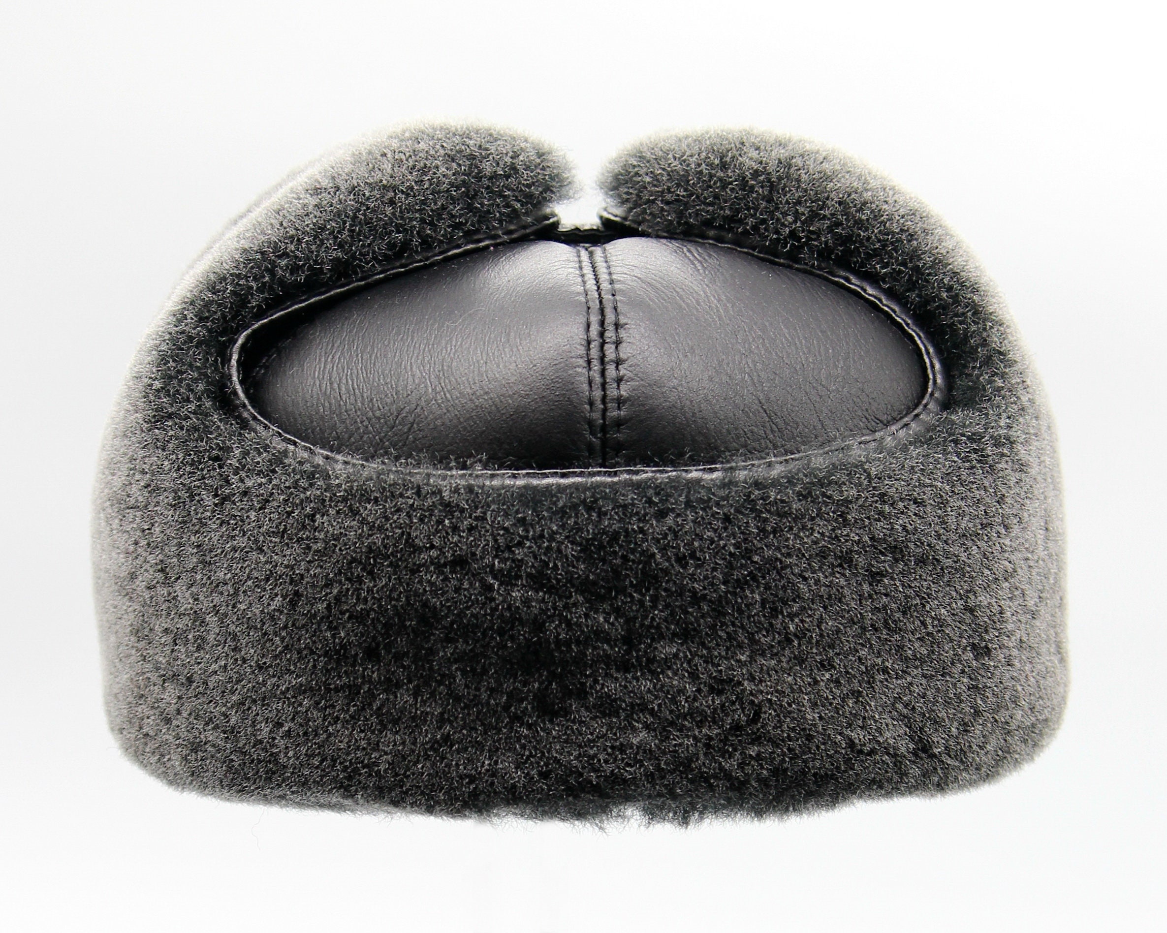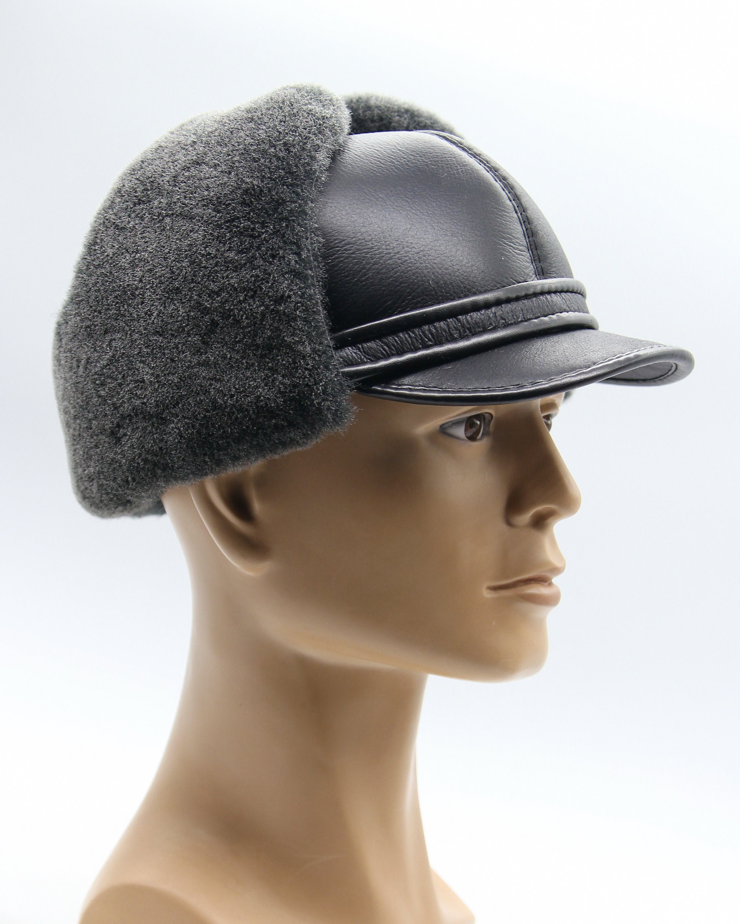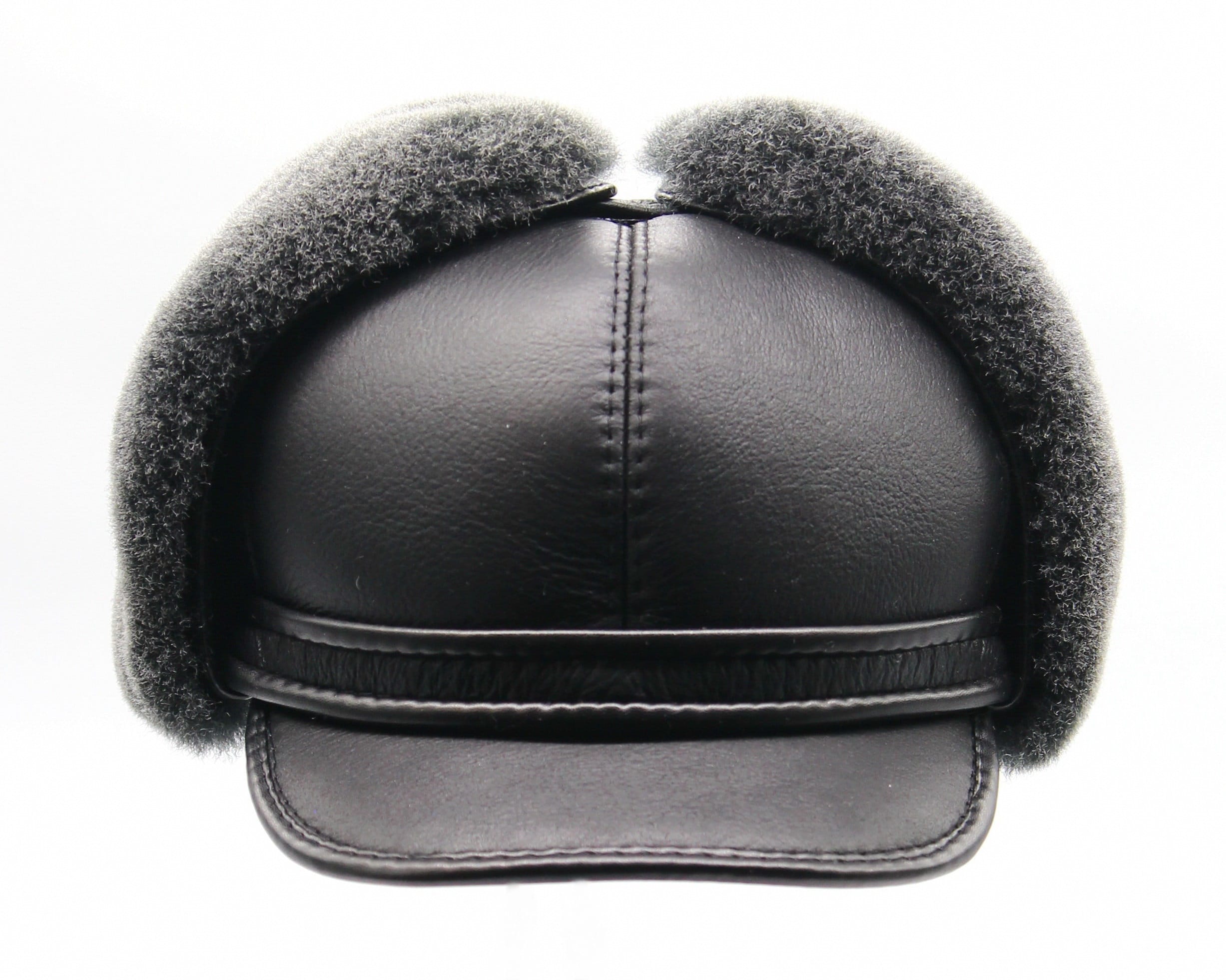 Black Shearling Visor Cap - Men's Aviator Ushanka Fur Hat with Sheepskin