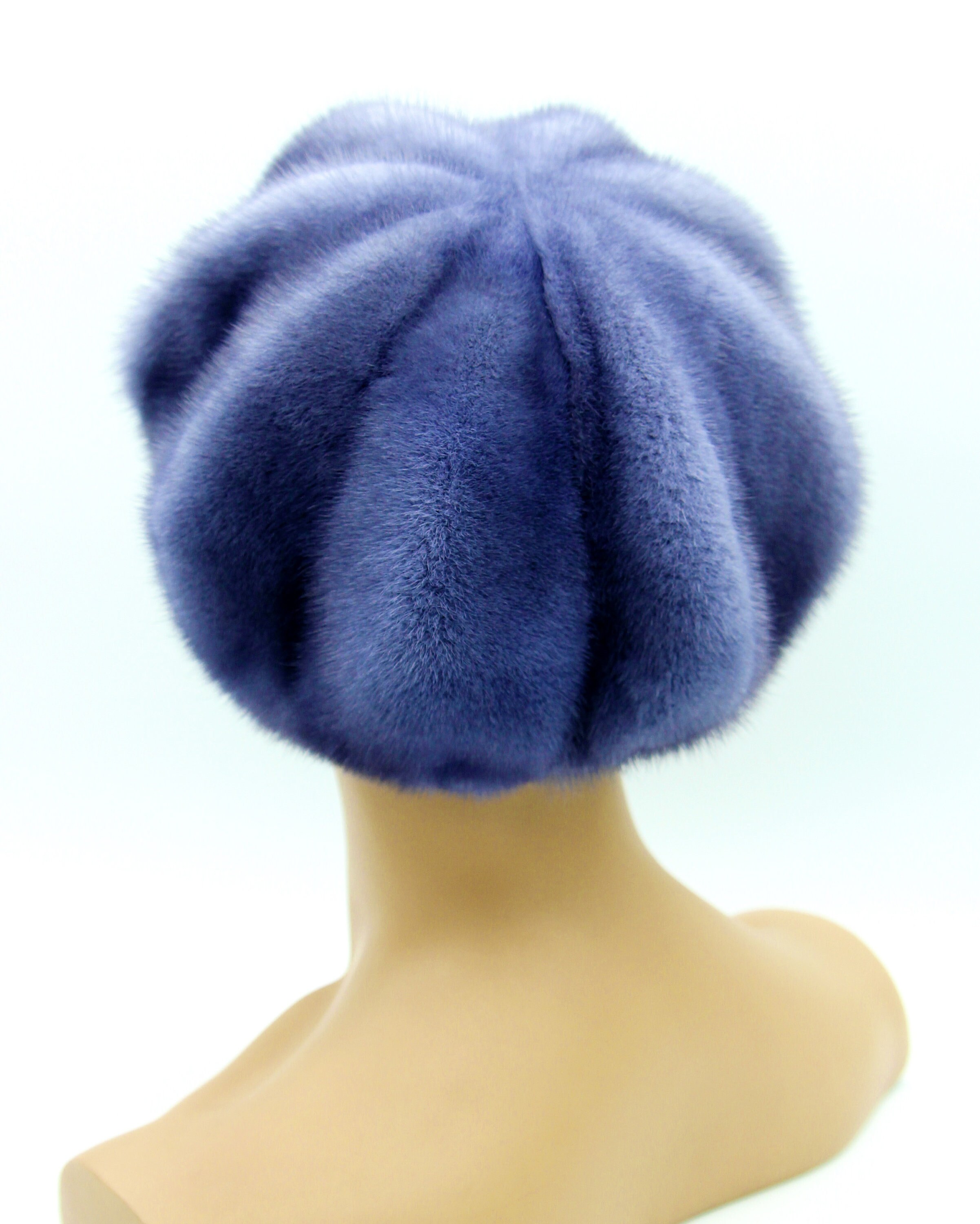 Hand-stitched in Ukraine using specific technique for ribbed texture. My uncle taught me this method years back - working mink to create vertical ribs in a fur hat takes practice. Purple version gets dyed achieving lilac tone, then constructed with ribs for this fur hat.