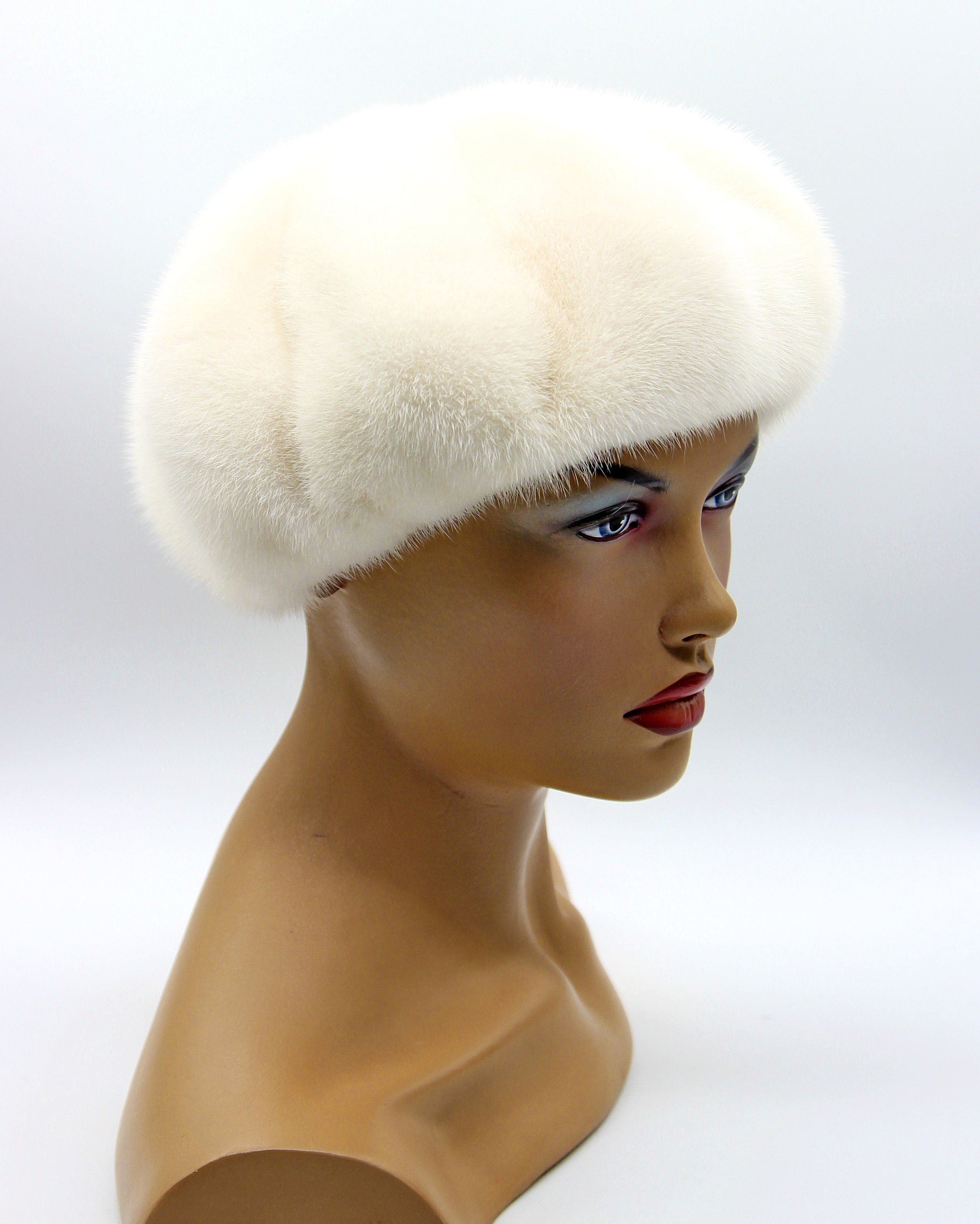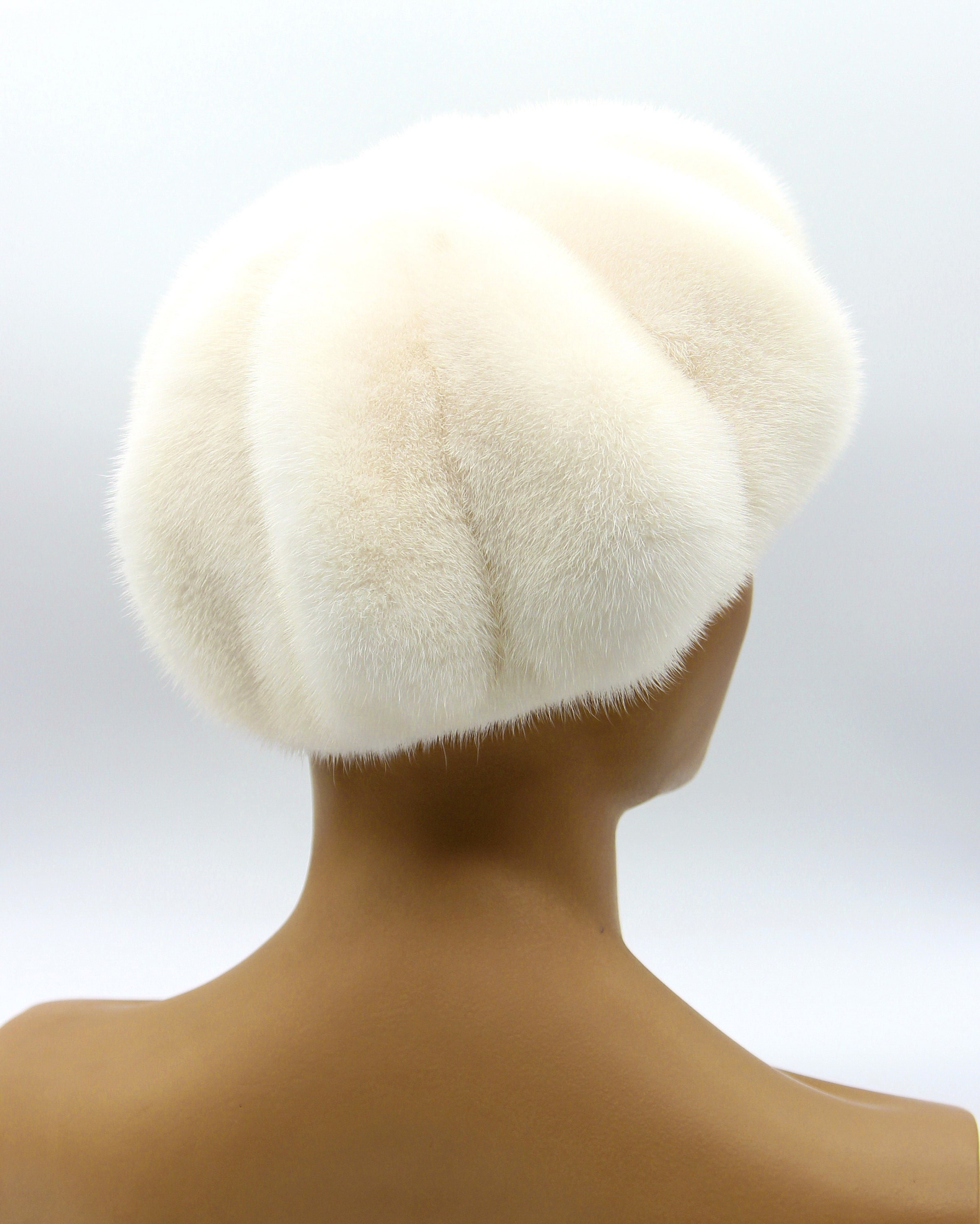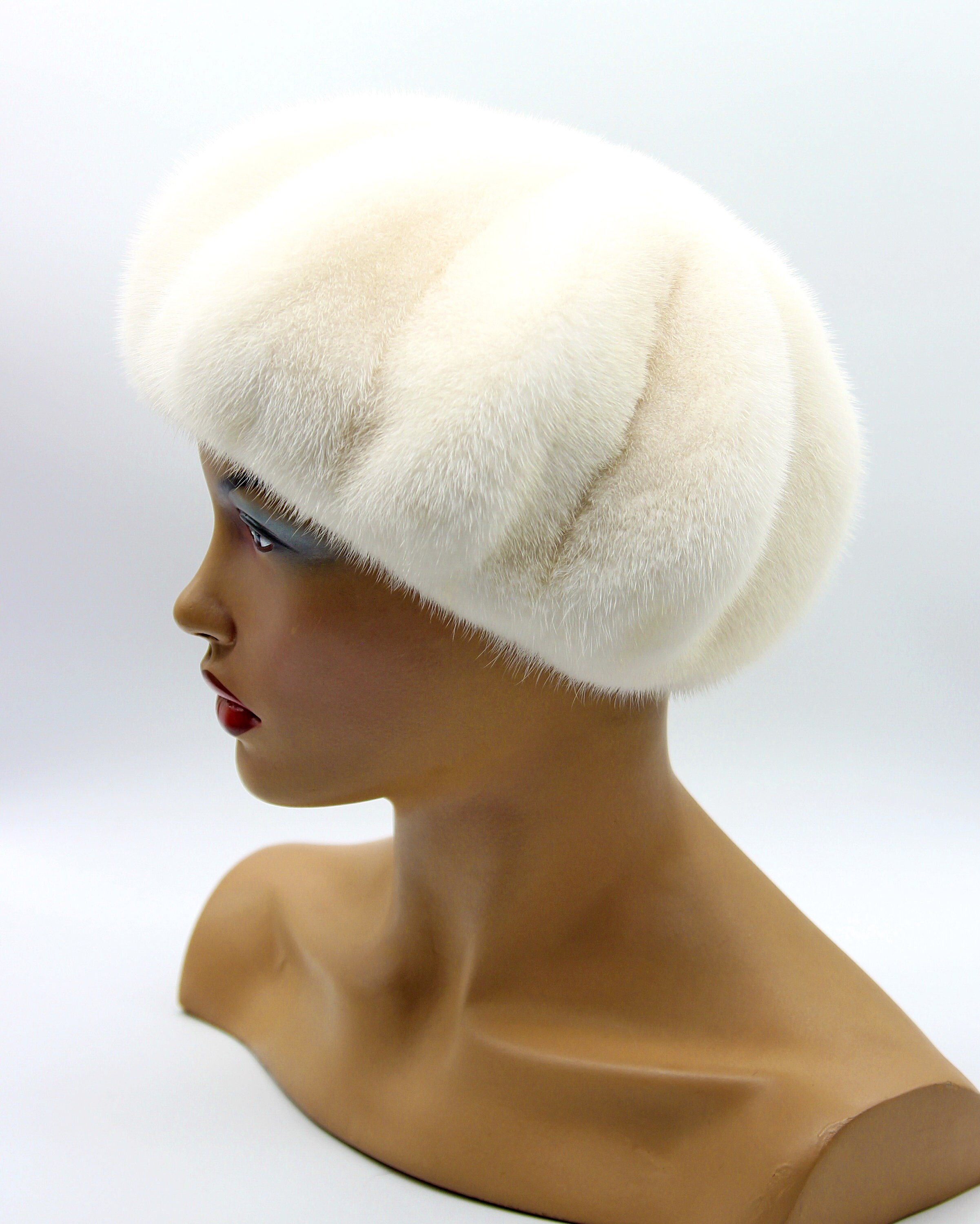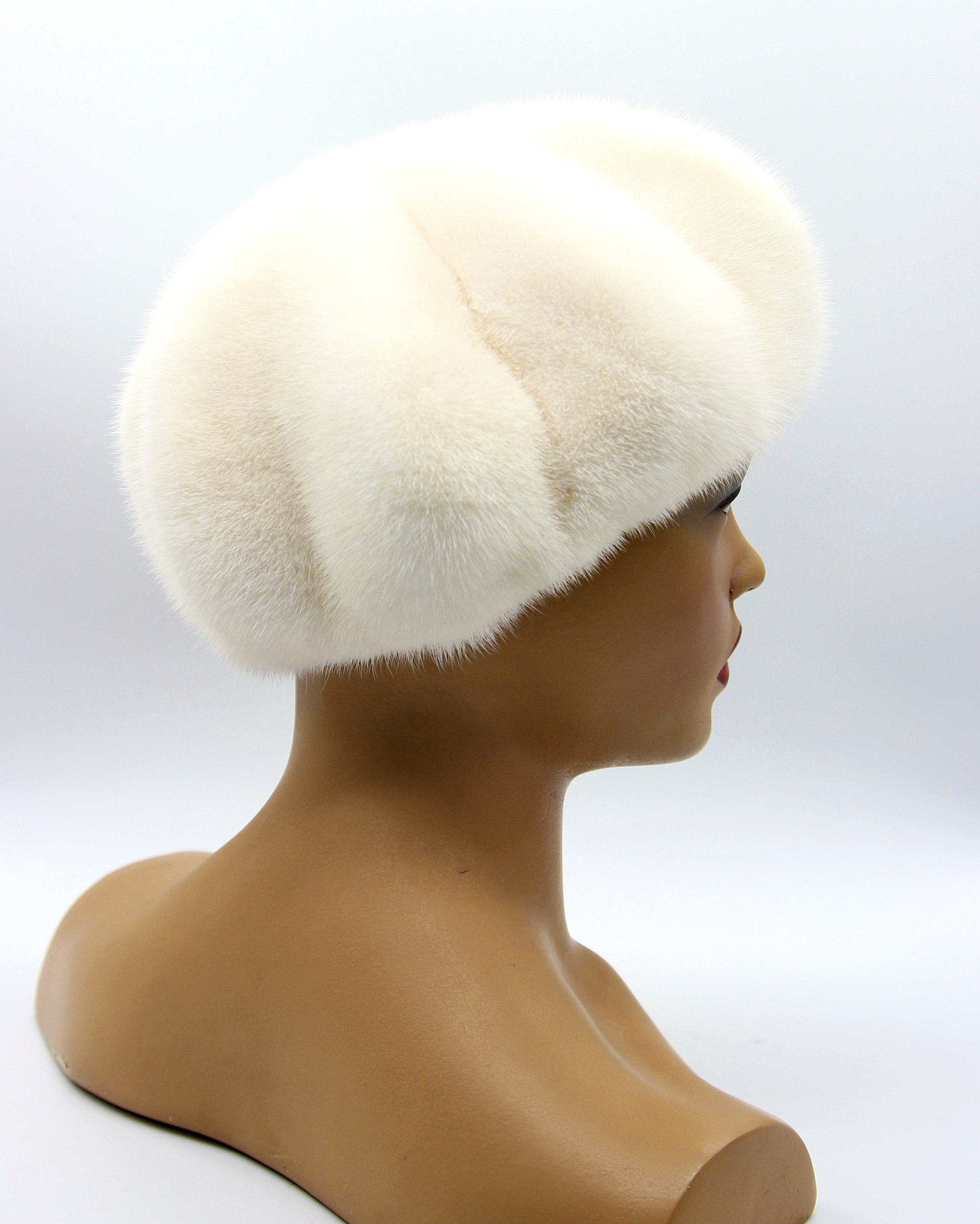 This fur hat for women features ribbed texture throughout. Not smooth flat fur - vertical ribs create pattern in this mink fur hat adding visual dimension. Available white or purple.
