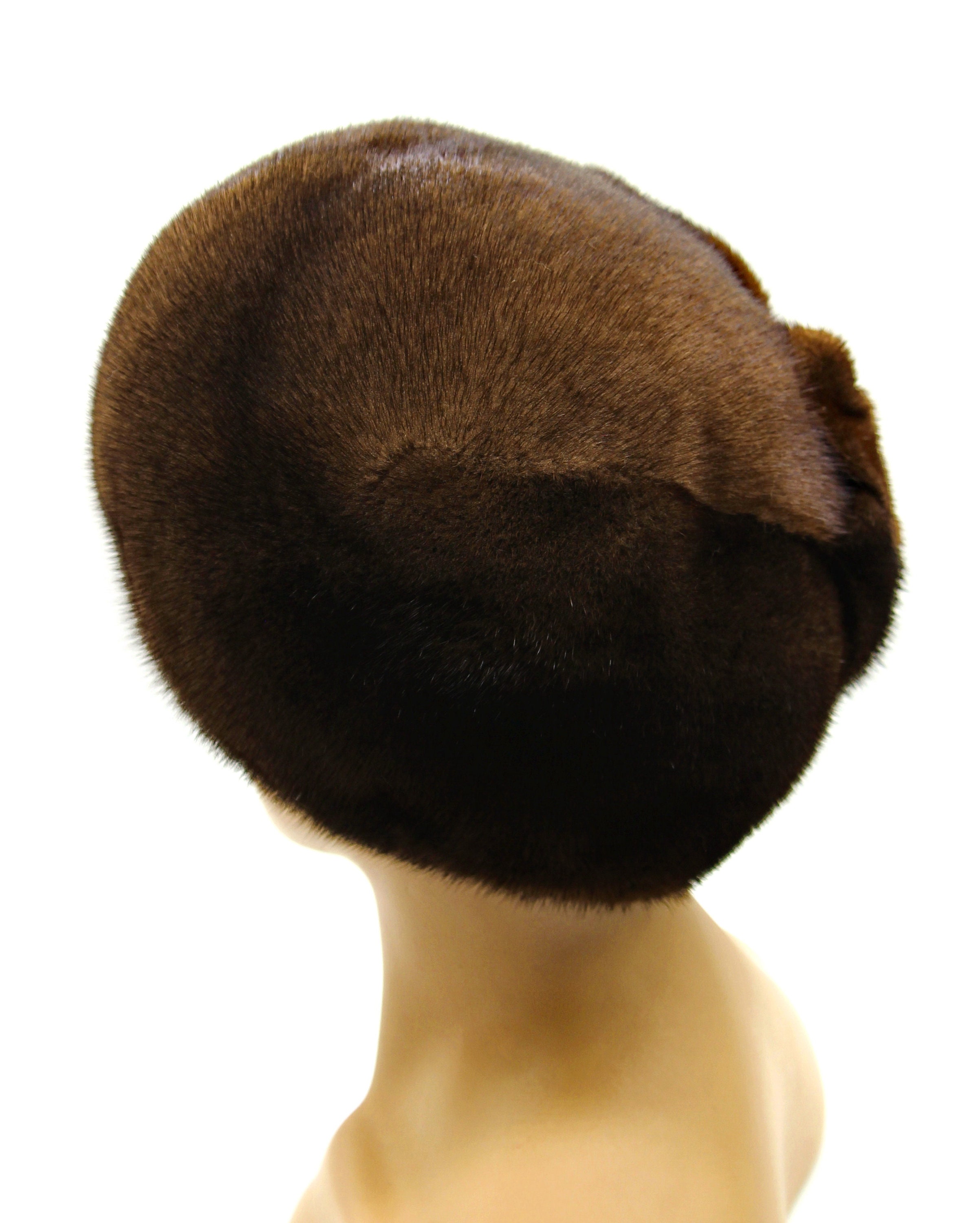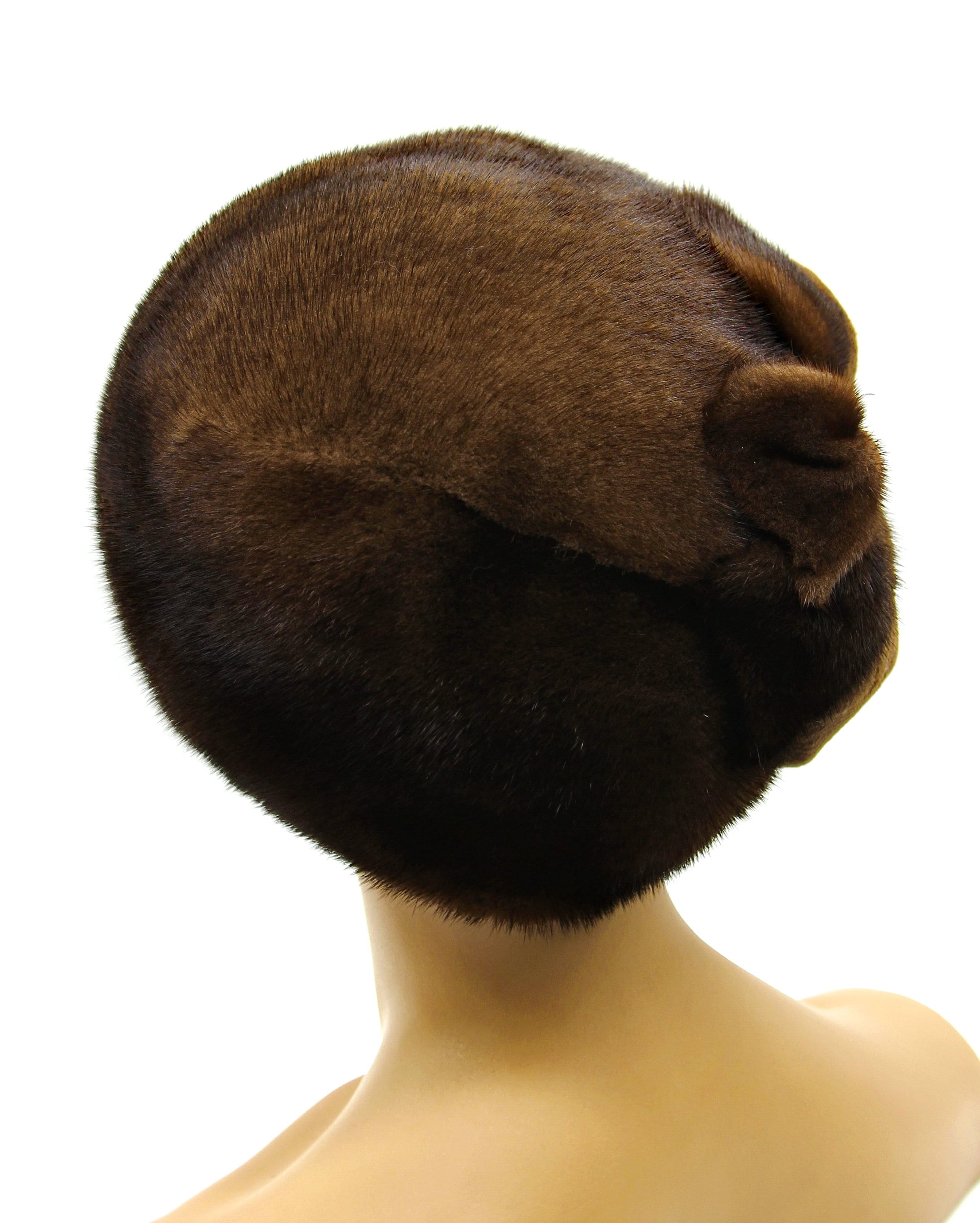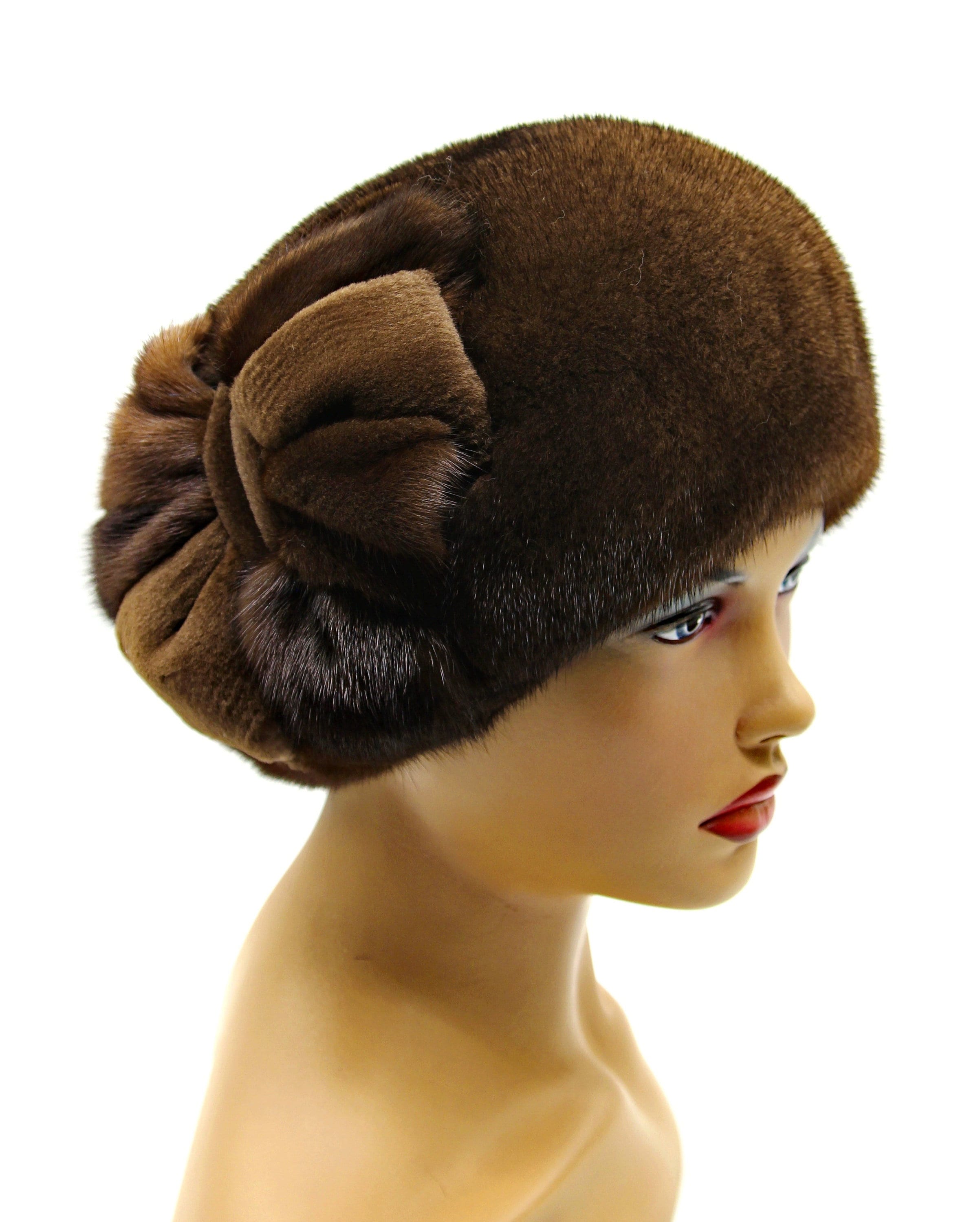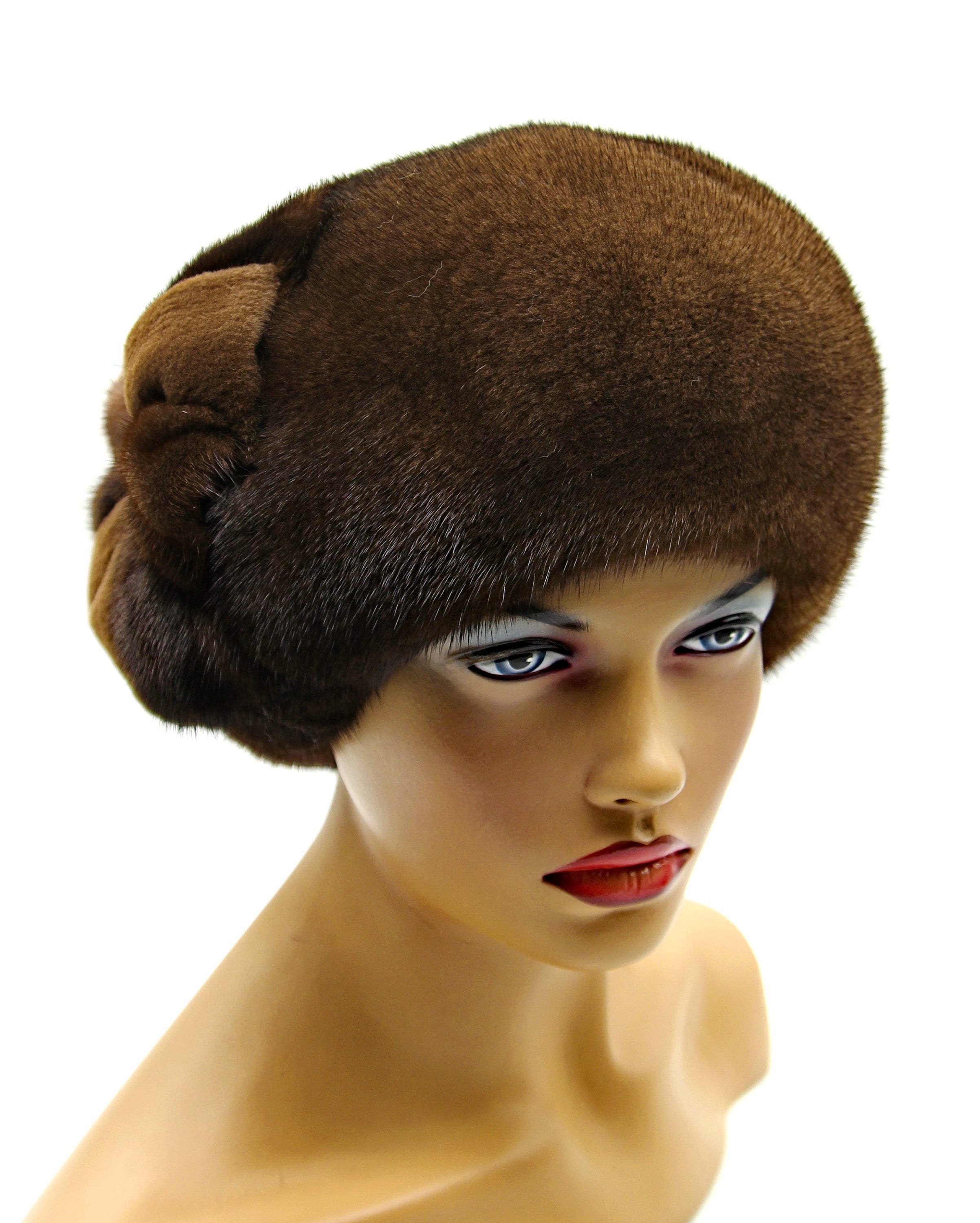 This fur hat for women combines pastel brown color with flower accent. Soft natural tone with feminine floral detail. Two features together in this mink fur hat - gentle pastel and decorative flower making your fur hat both elegant and distinctive.