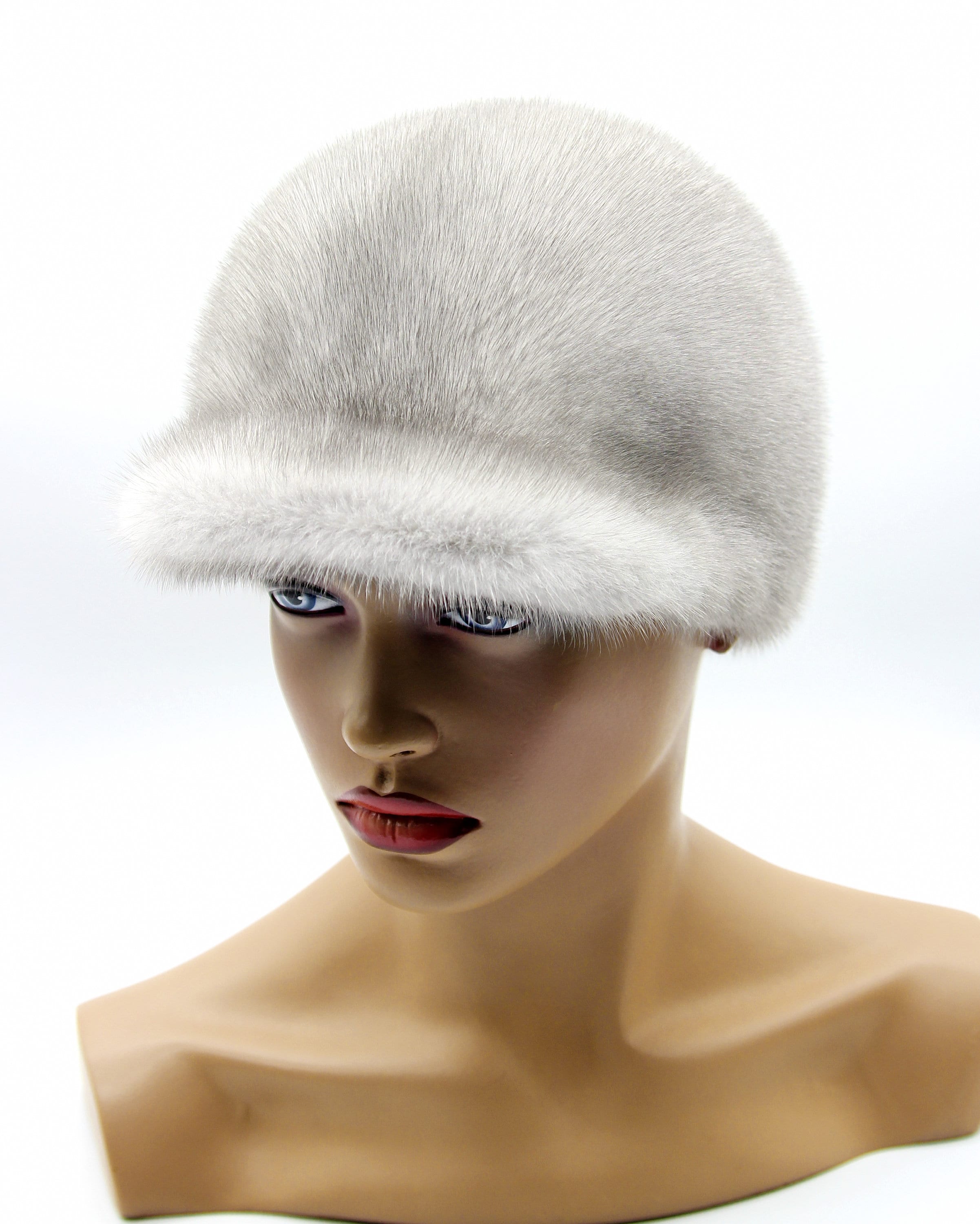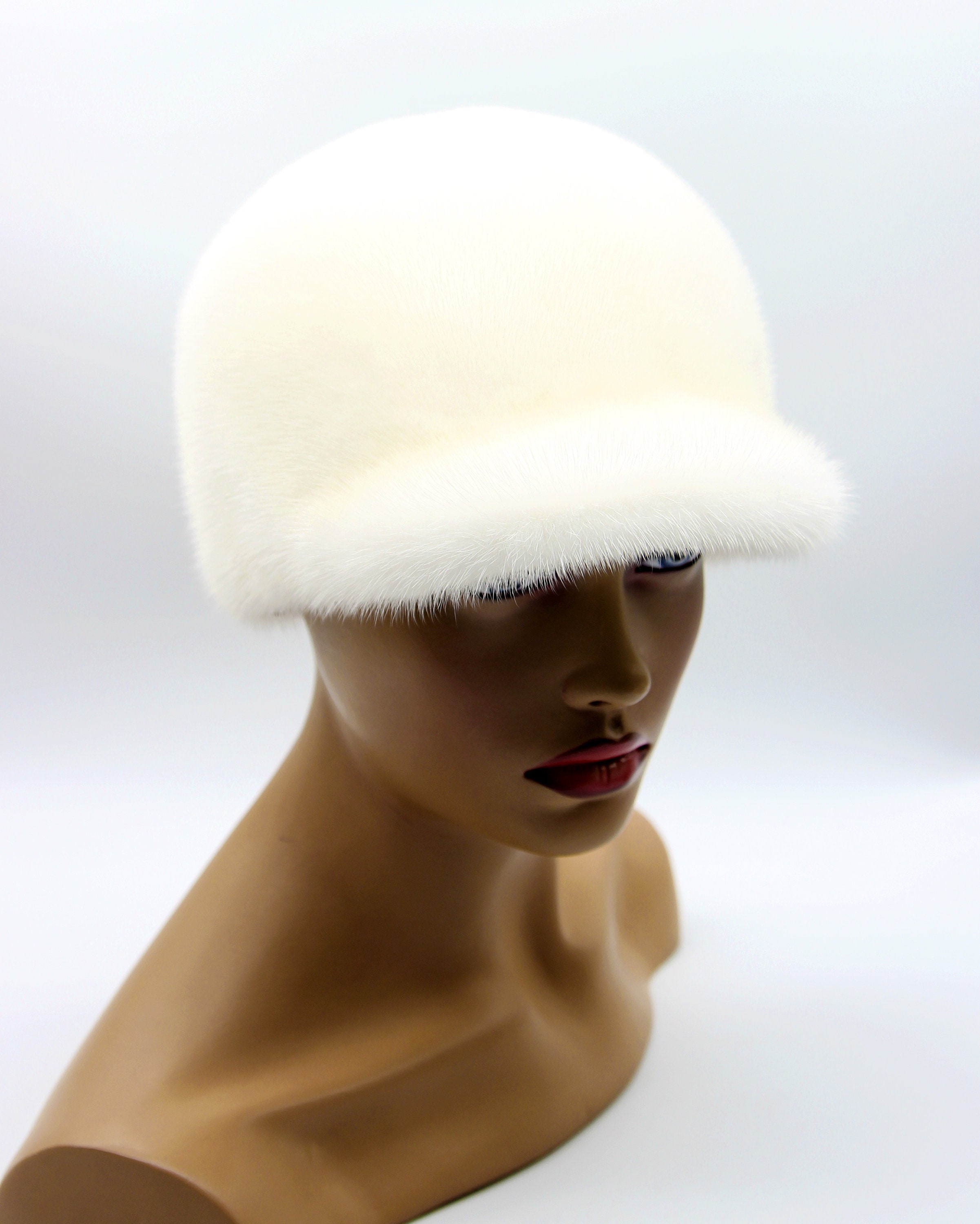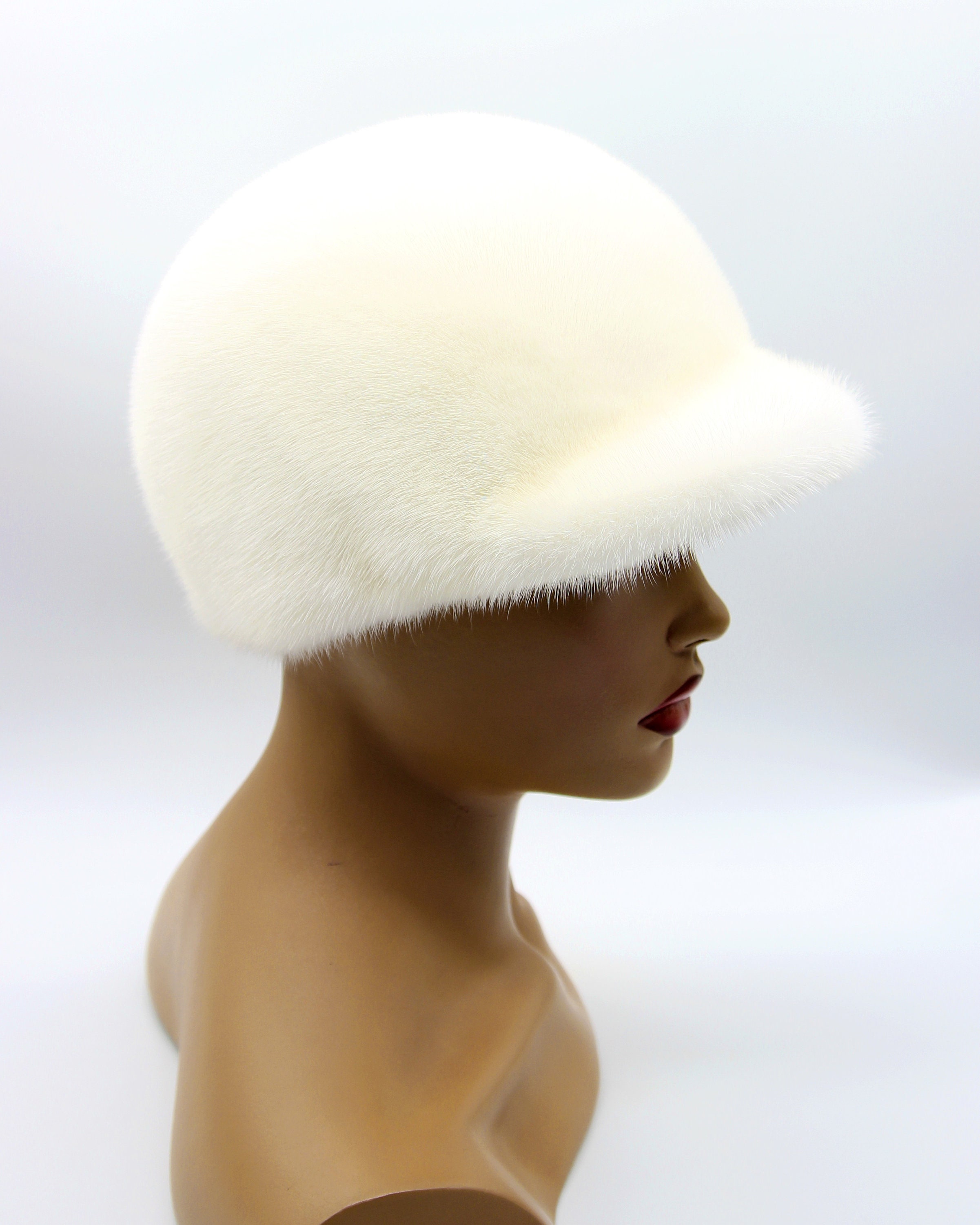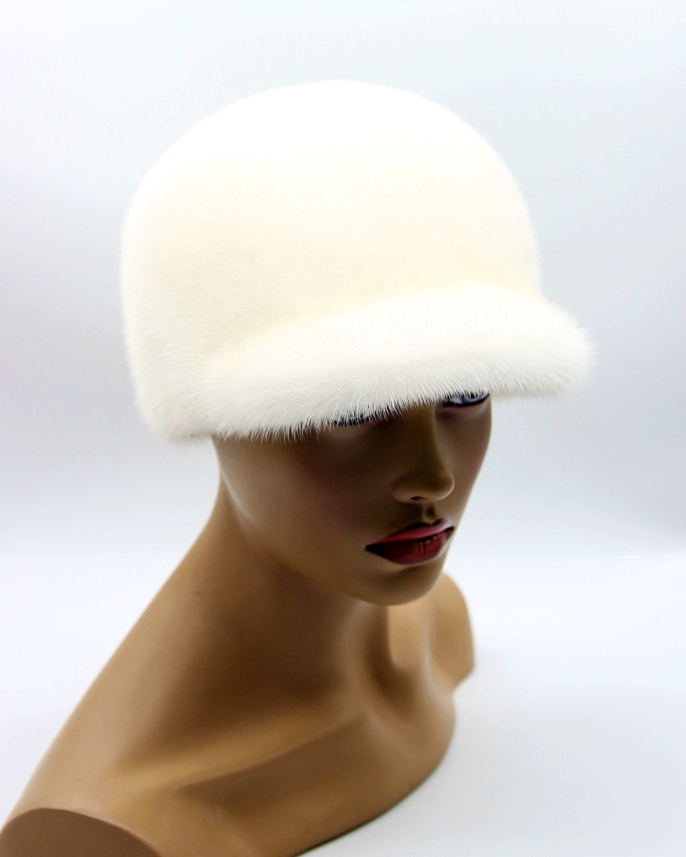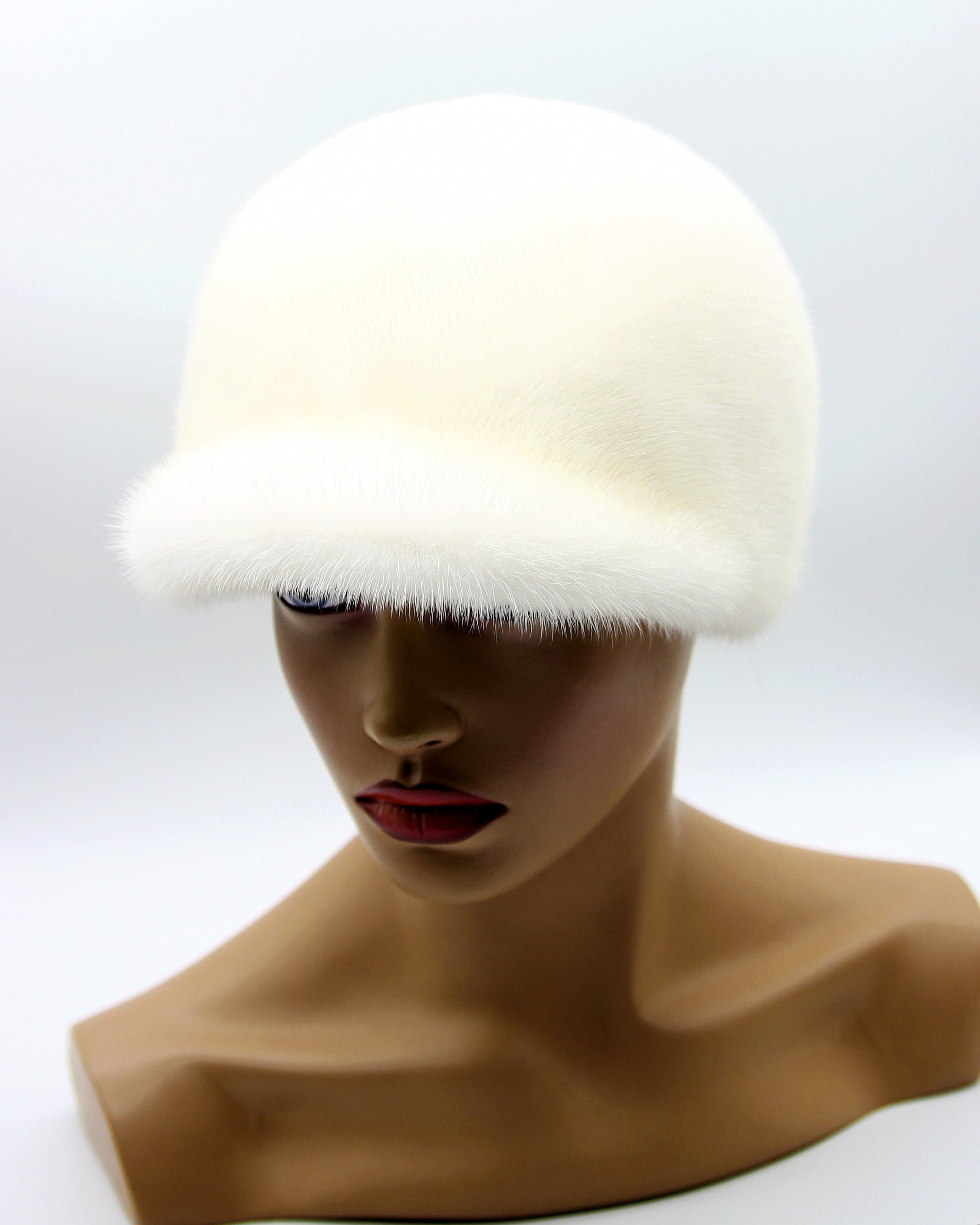 Mink cap with visor - doing this in Ukraine for folks wanting fur hat with actual brim protection. White mink worked into cap shape with short visor sticking out front. Totally different from round hats cause brim changes how whole thing functions.