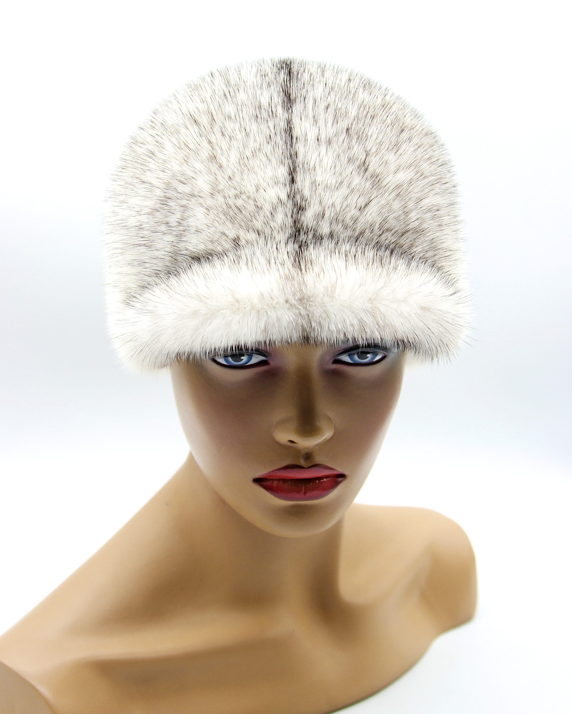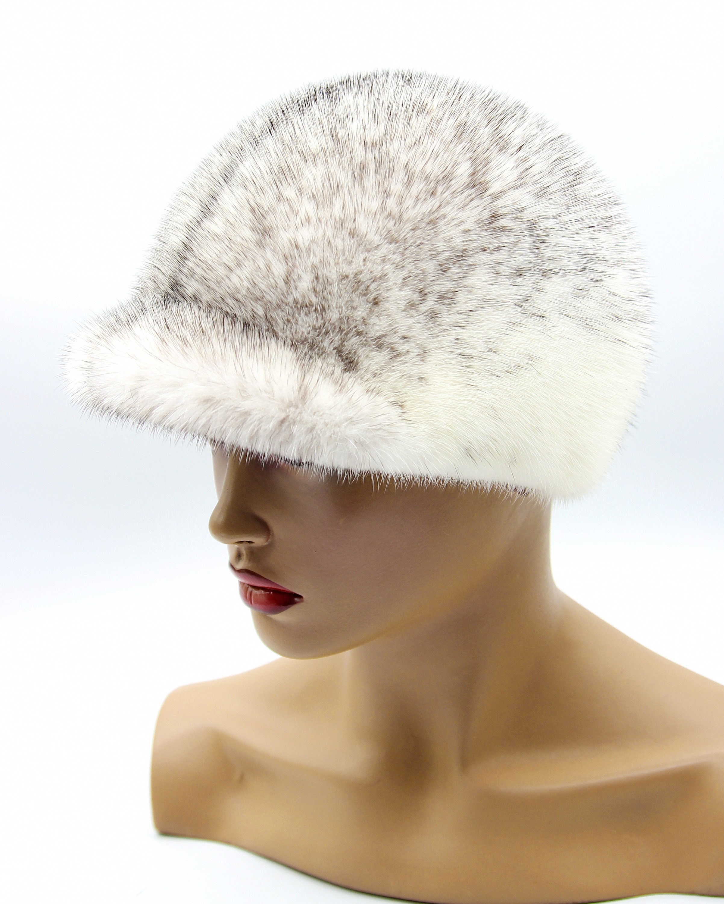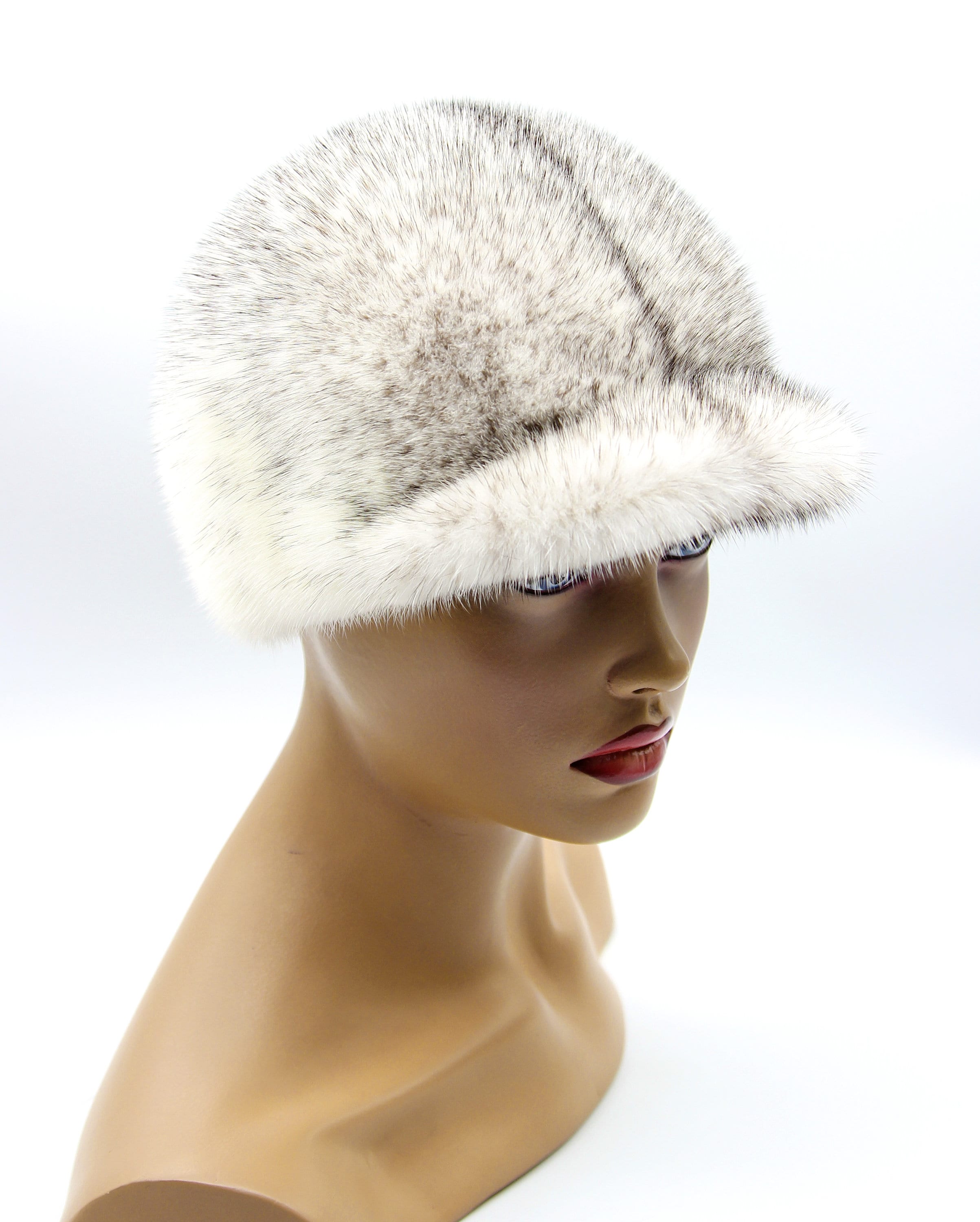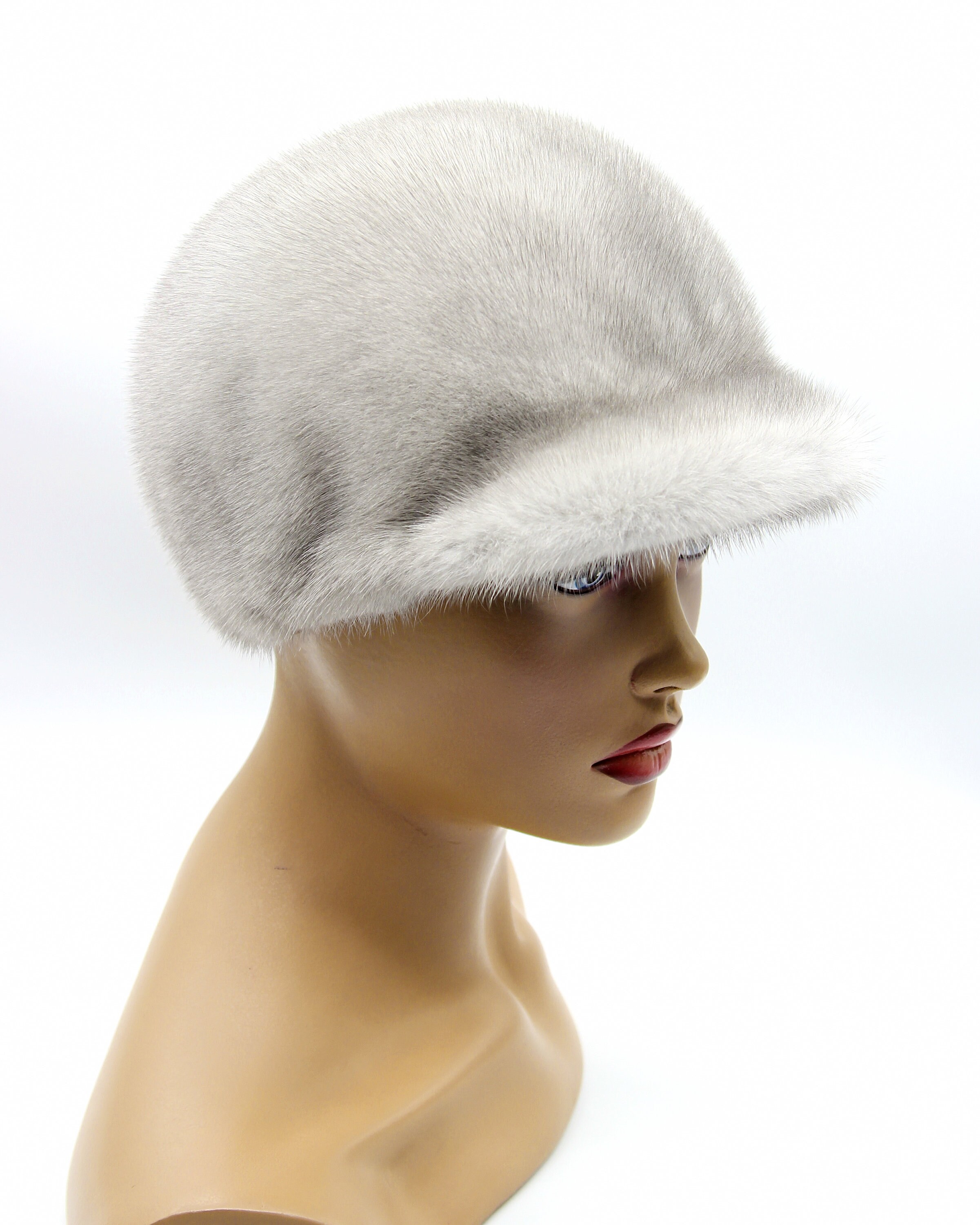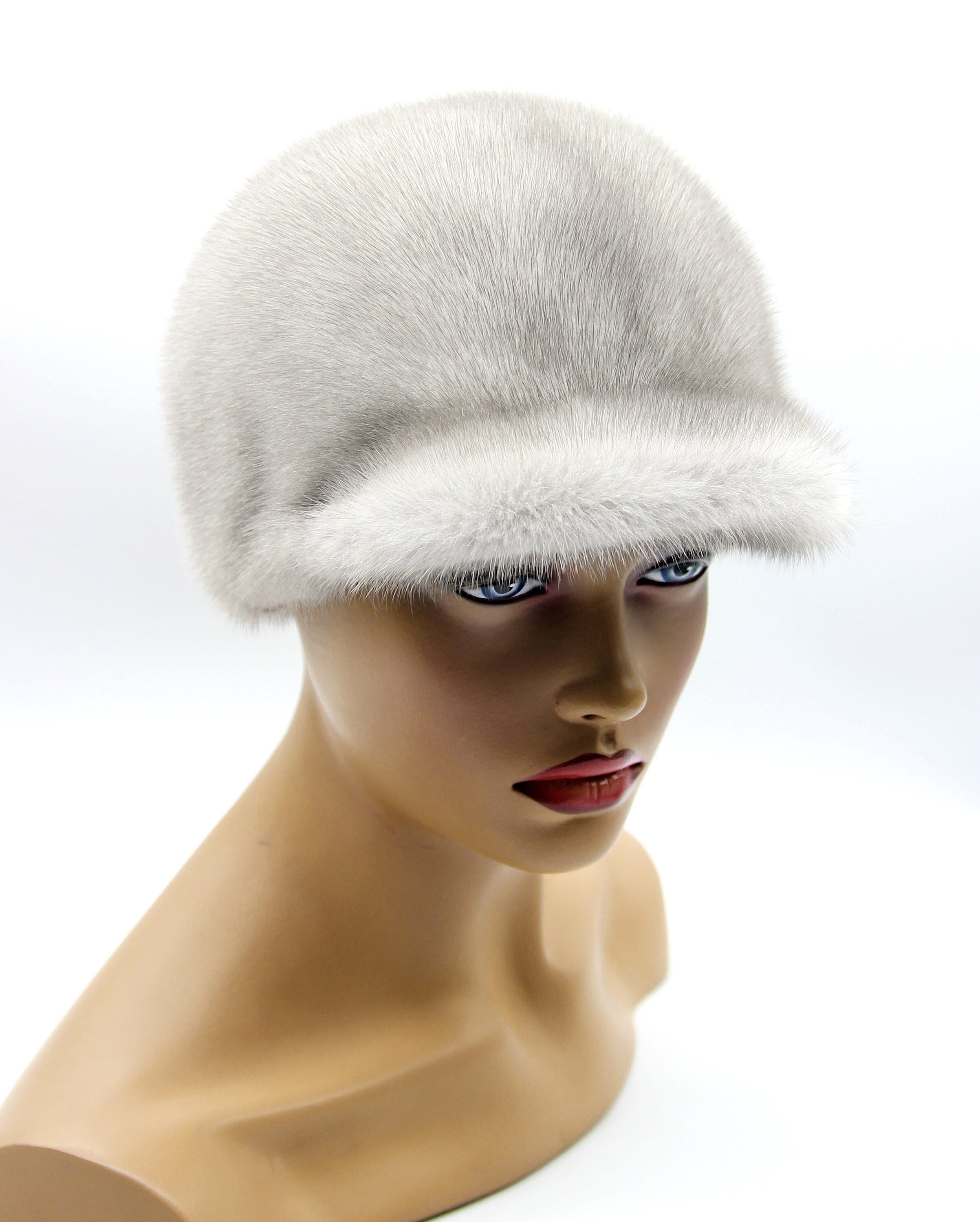 Mink cap with visor - doing this in Ukraine for folks wanting fur hat with actual brim protection. White mink worked into cap shape with short visor sticking out front. Totally different from round hats cause brim changes how whole thing functions.