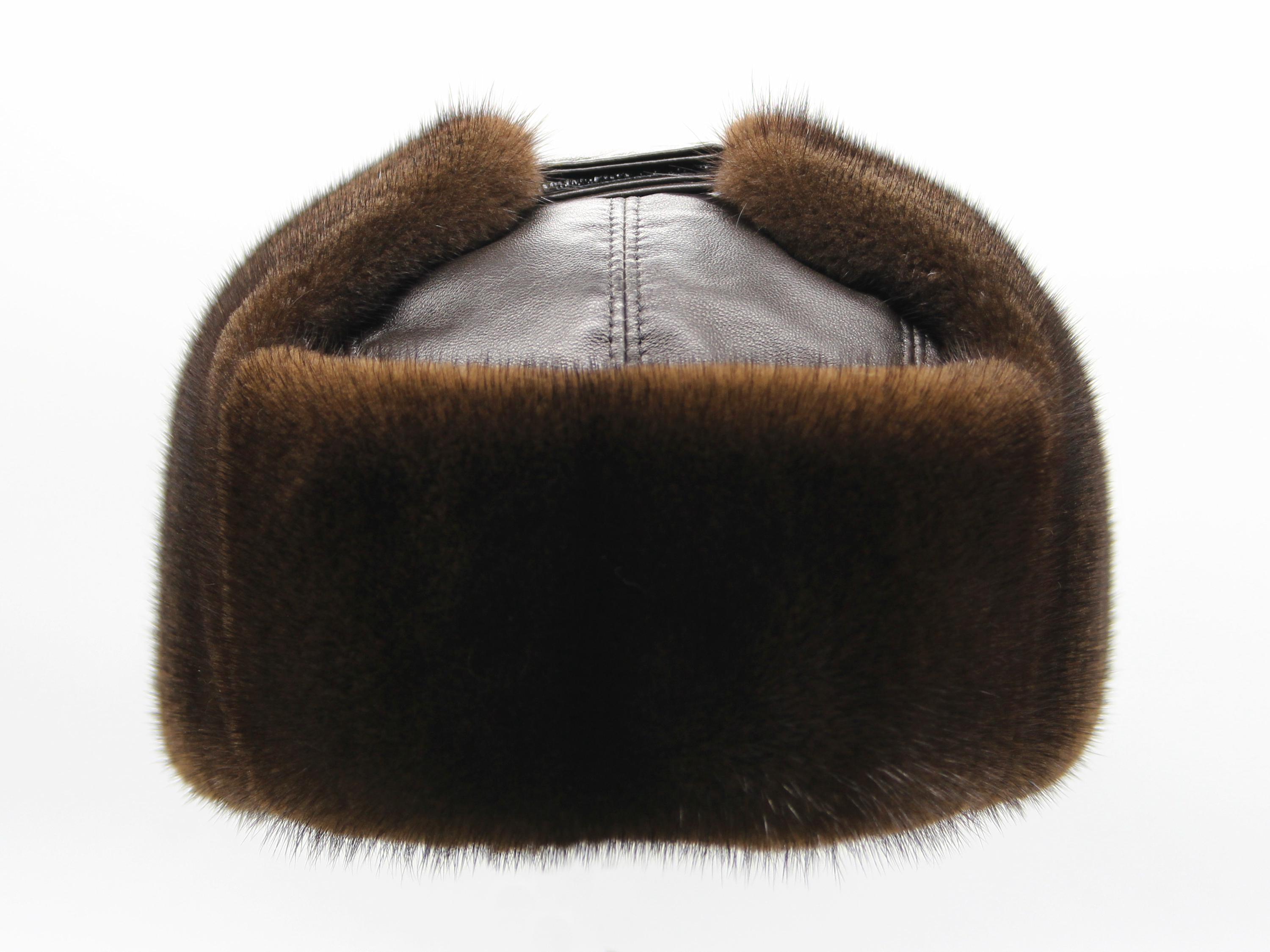 Brown Leather Ushanka Hat - Men's Winter Trapper with Mink Fur Trim