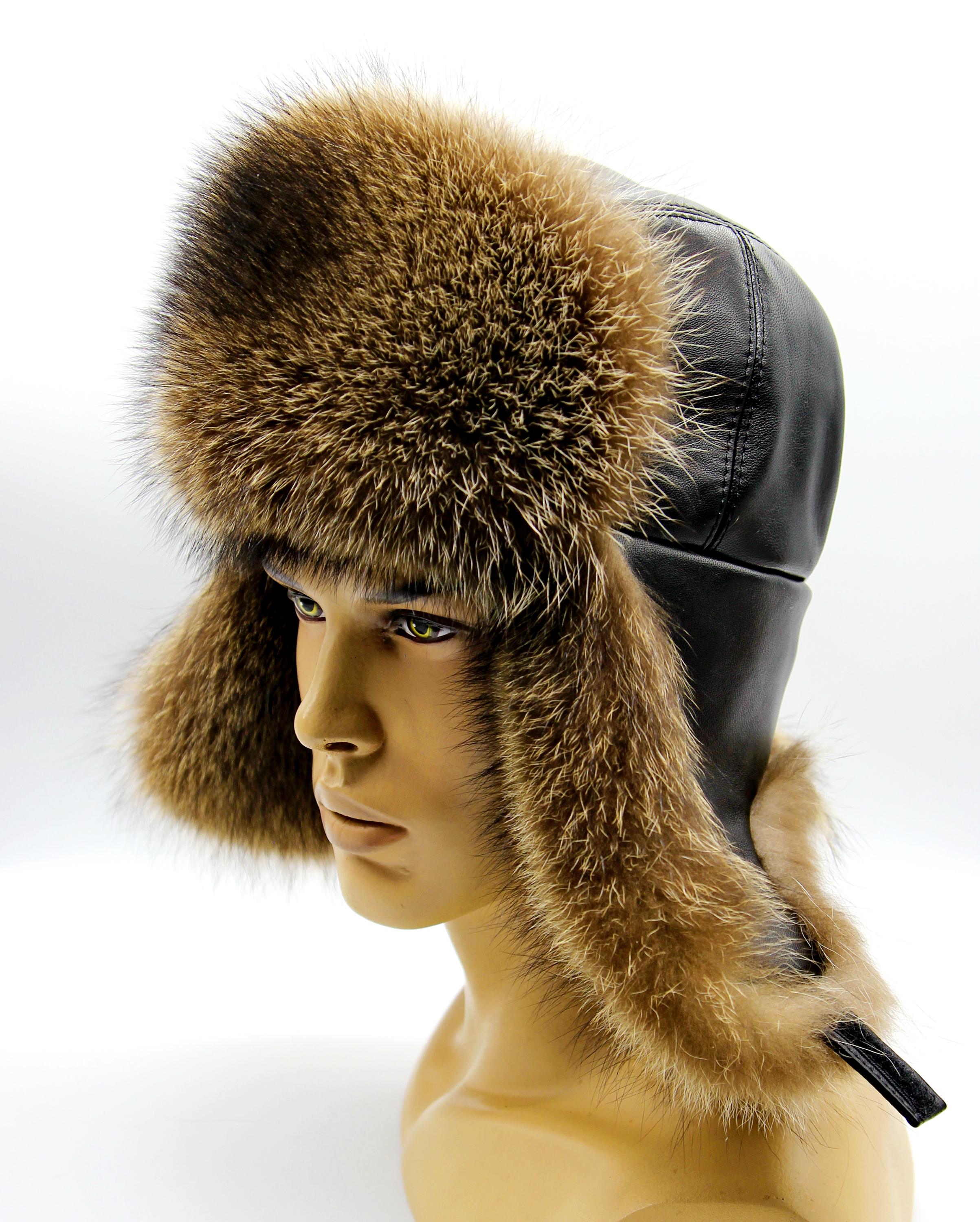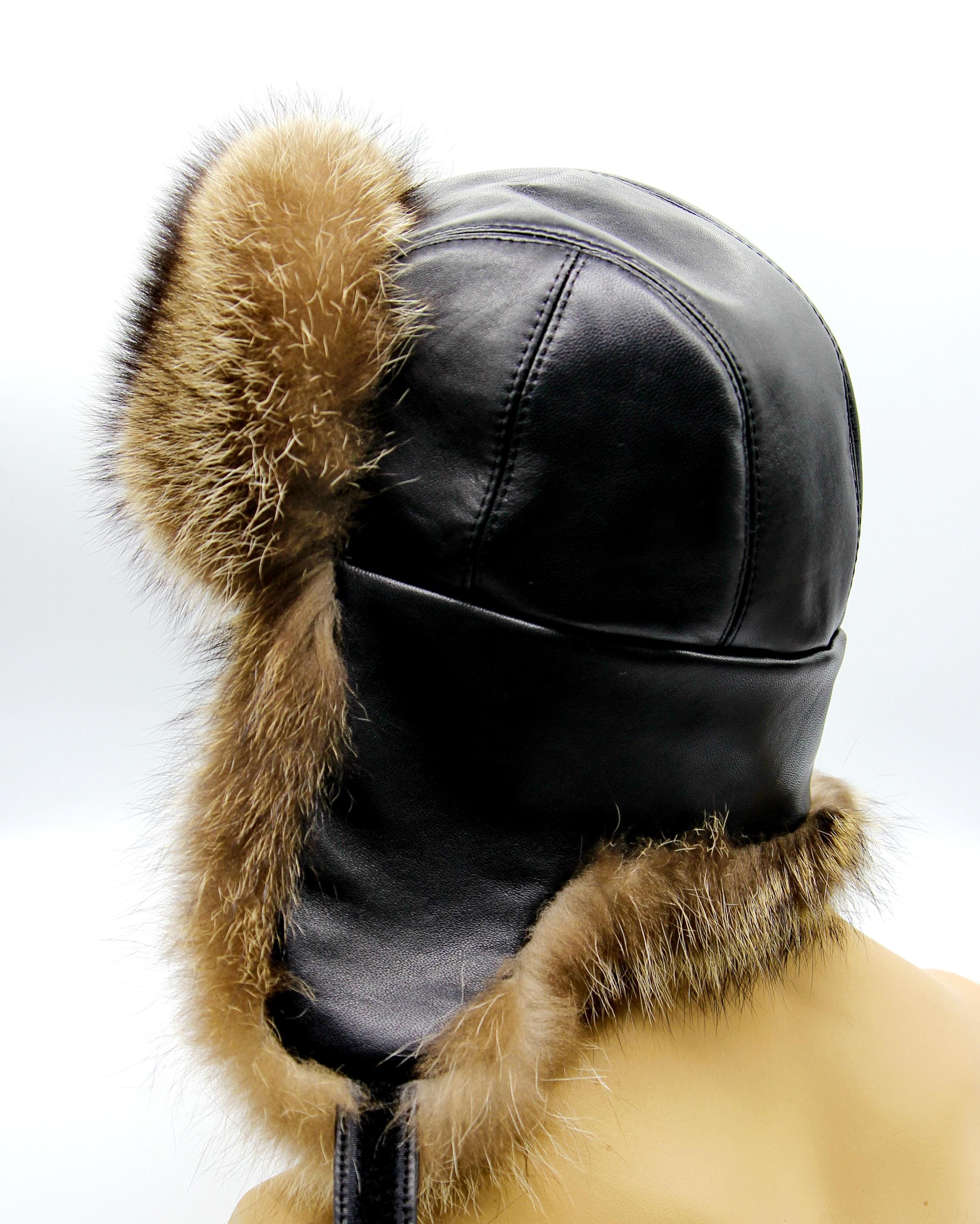Raccoon Fur Black Leather Ushanka - Dense Insulation Winter Hat for Men