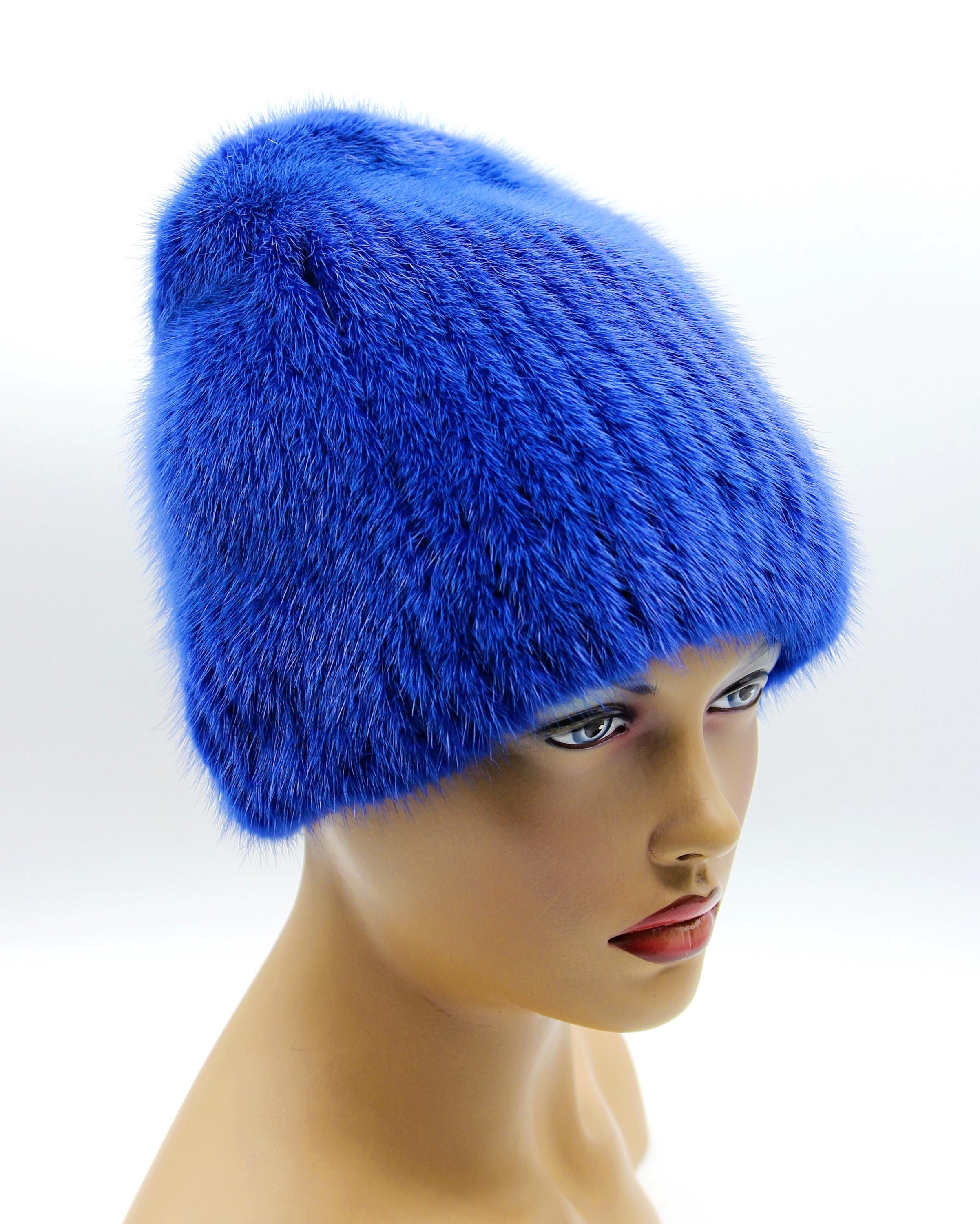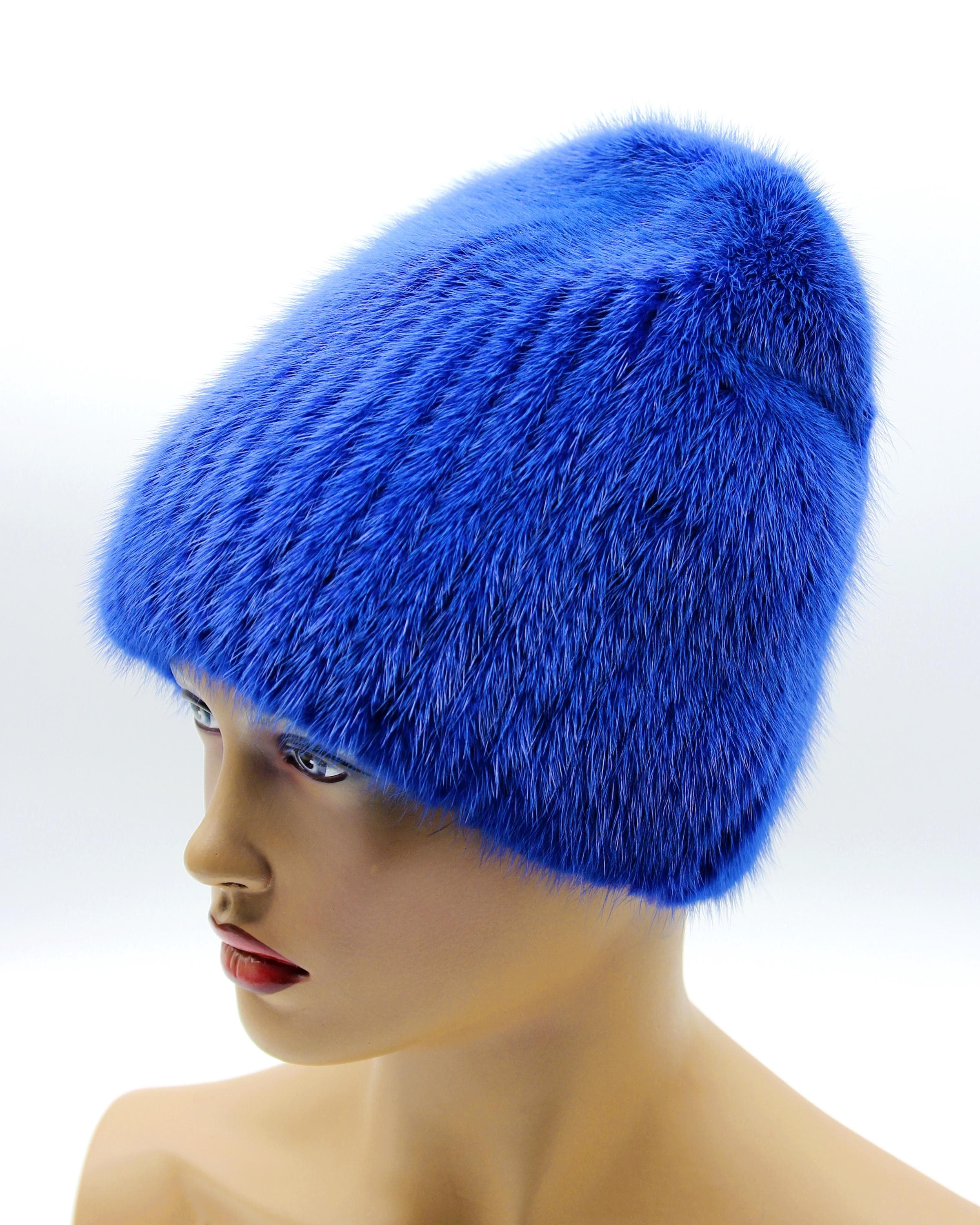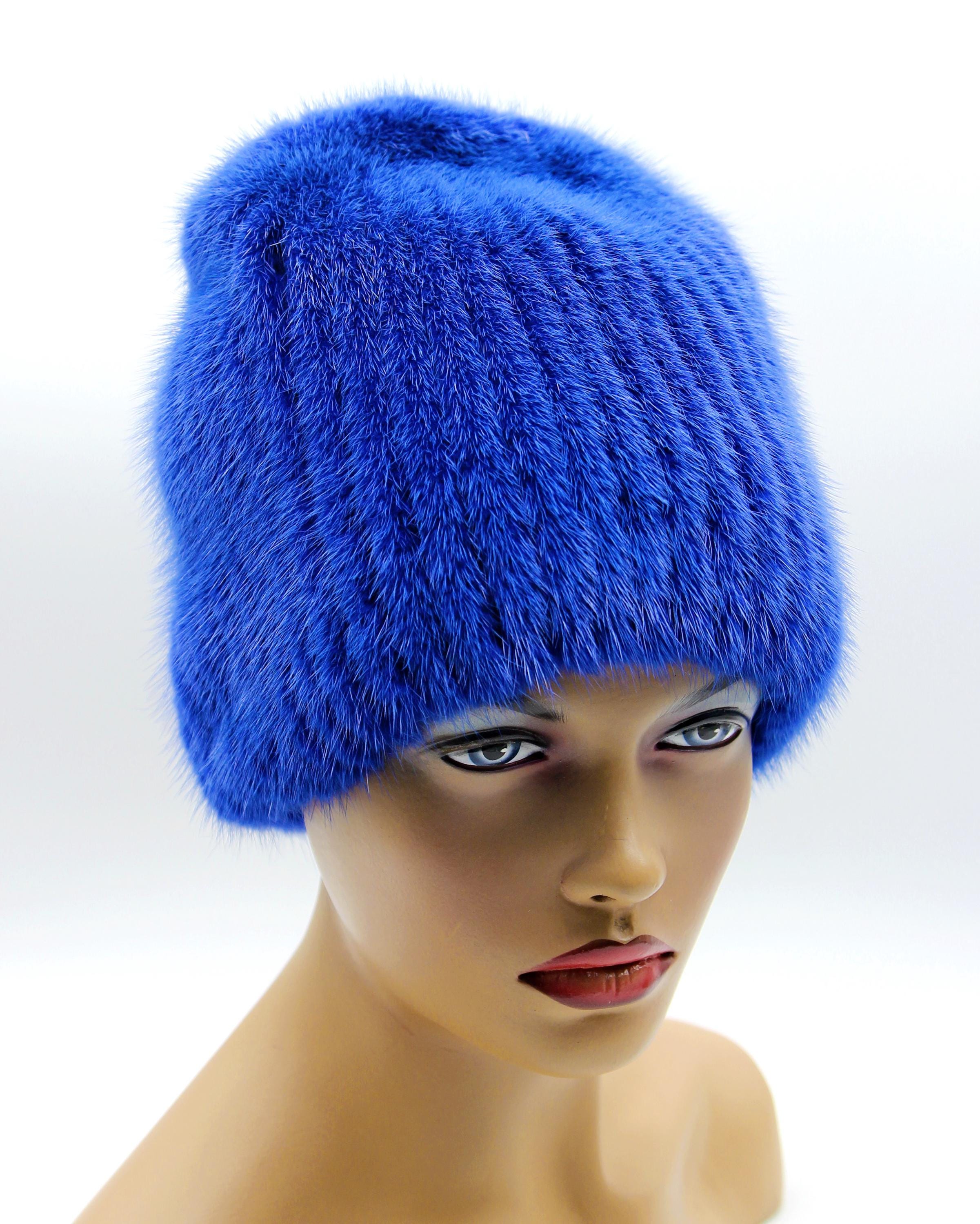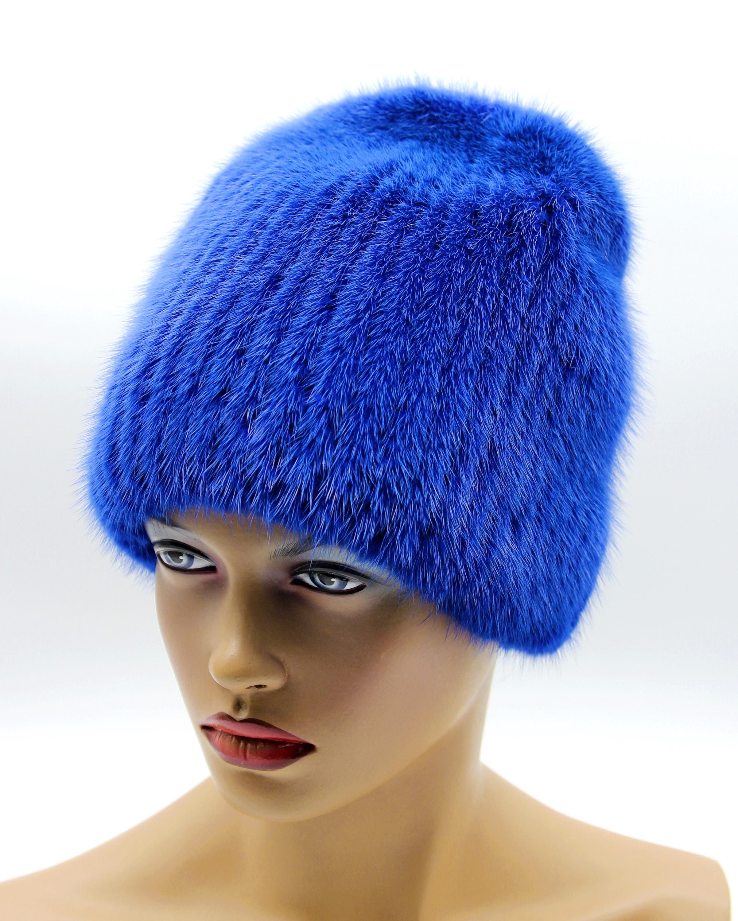 Blue Mink Fur Beanie Hat - Women's Winter Knitted Base Construction