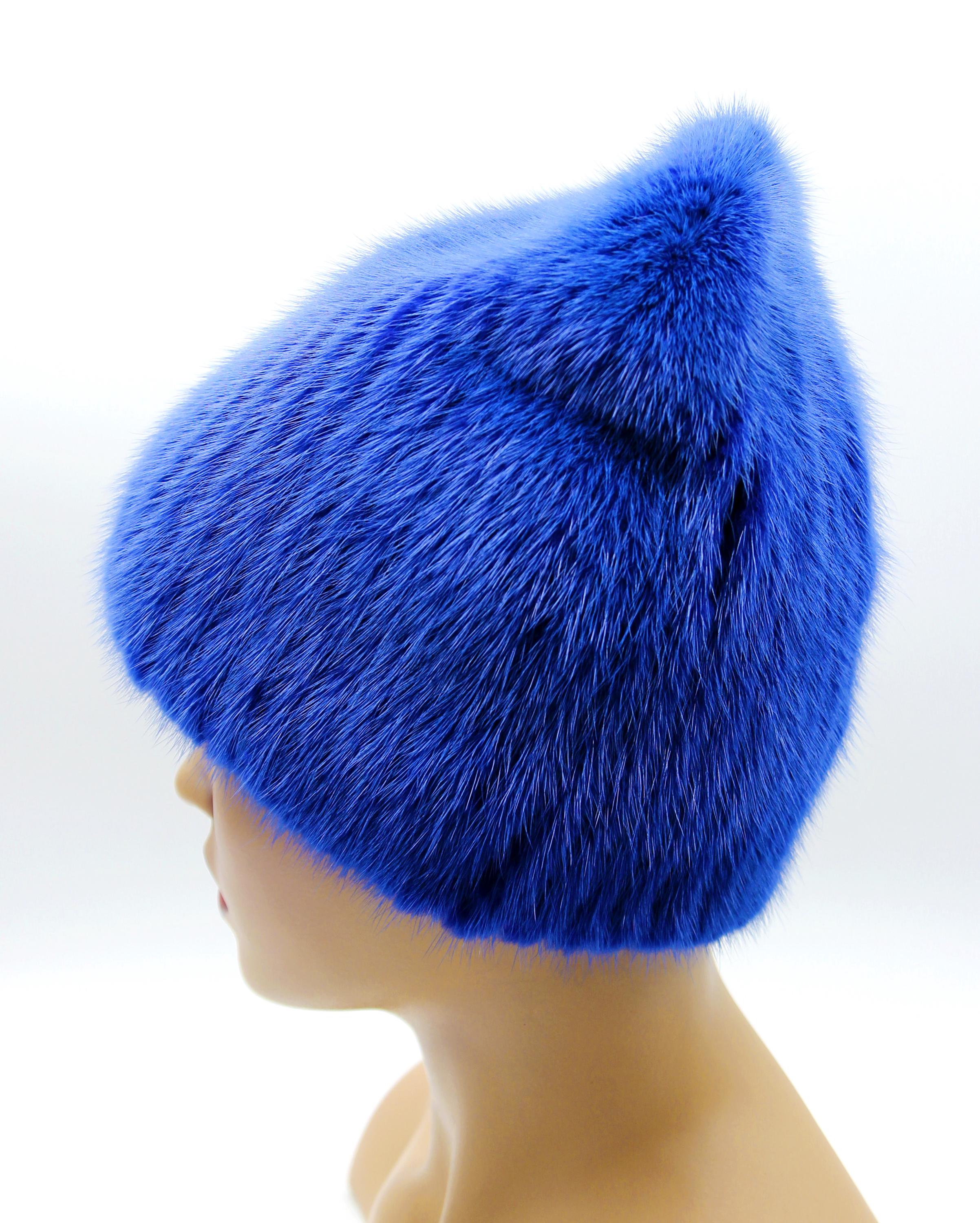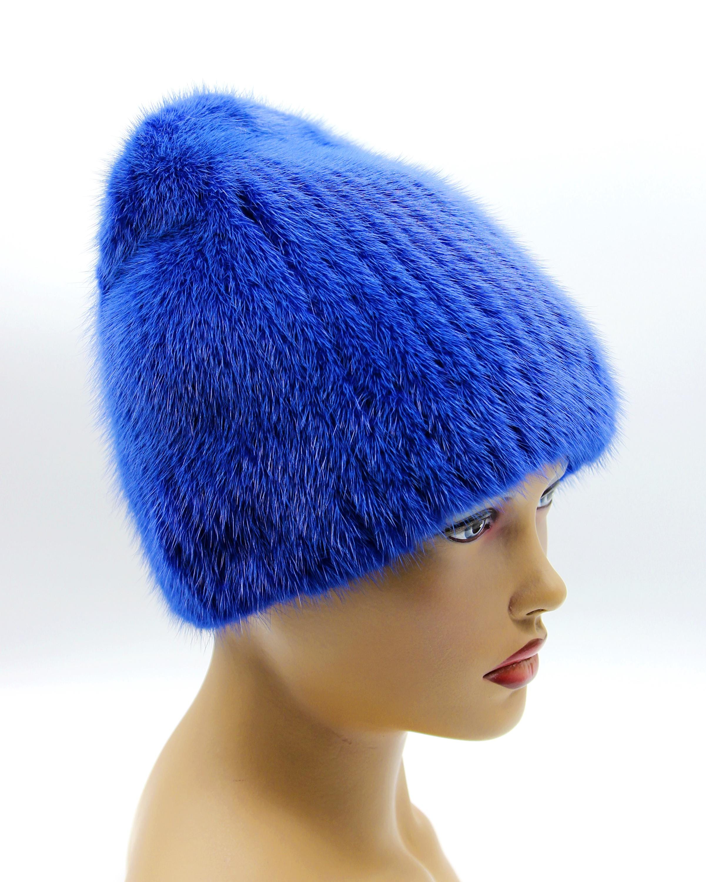 This blue mink fur beanie uses traditional let-out technique where full pelts get released into strips and sewn onto soft knitted foundation. Developed over 6 years of working with my uncle in our Ukrainian workshop to create sporty style that combines genuine mink with comfortable wear.