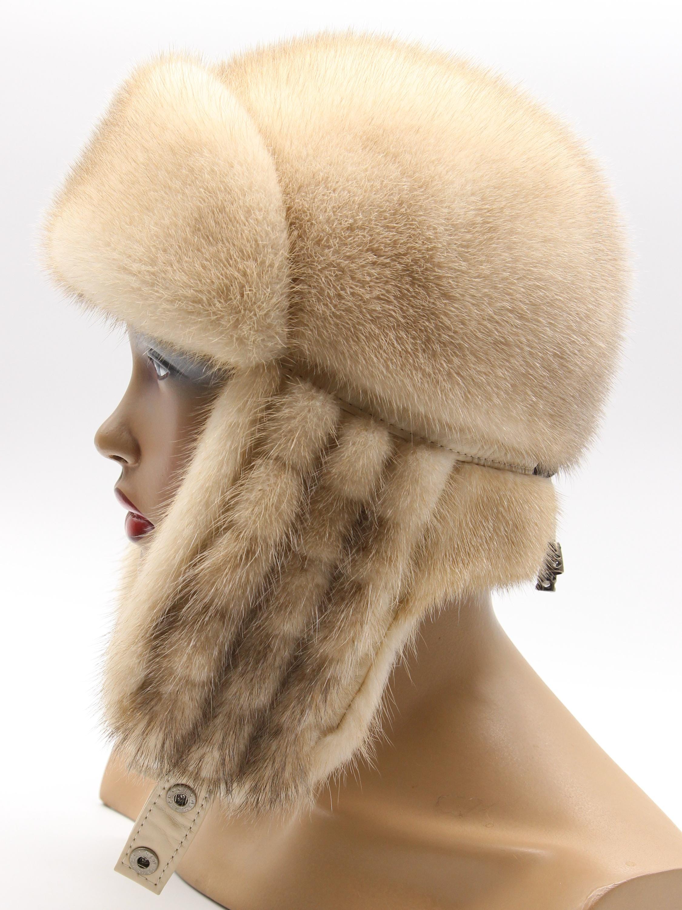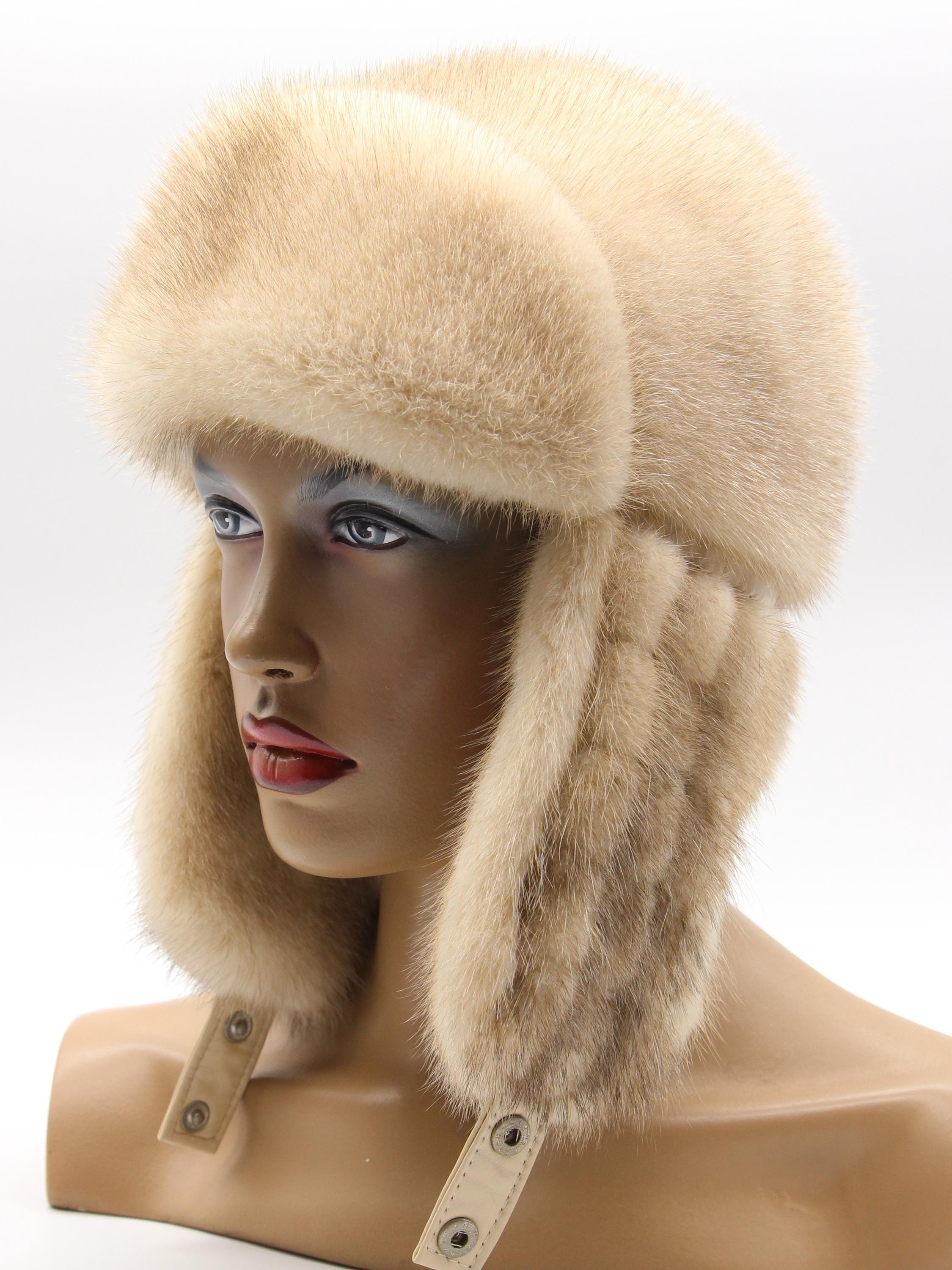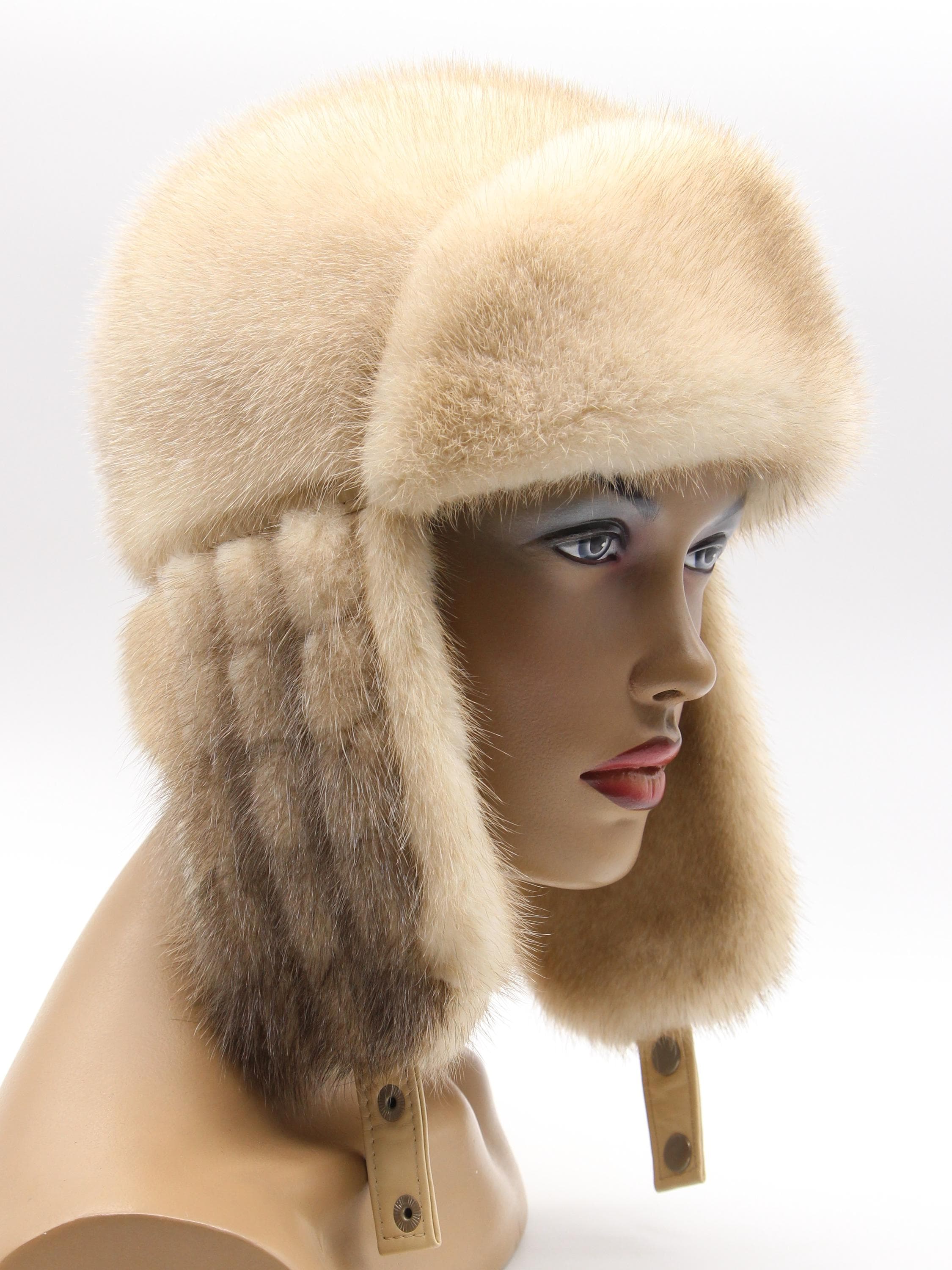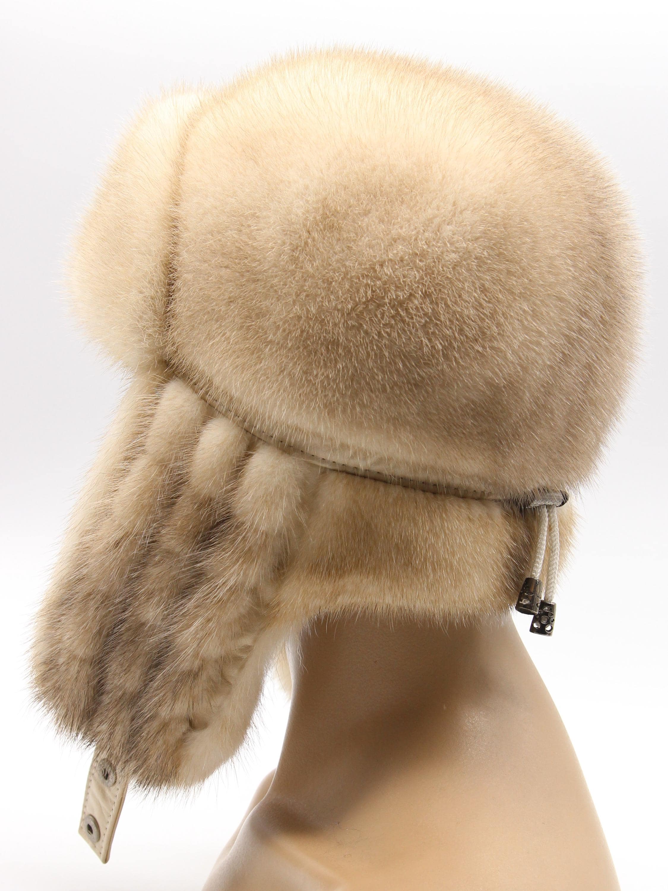 Handmade Pastel Beige Mink Fur Ushanka Hat for Women – Luxury Winter Trapper