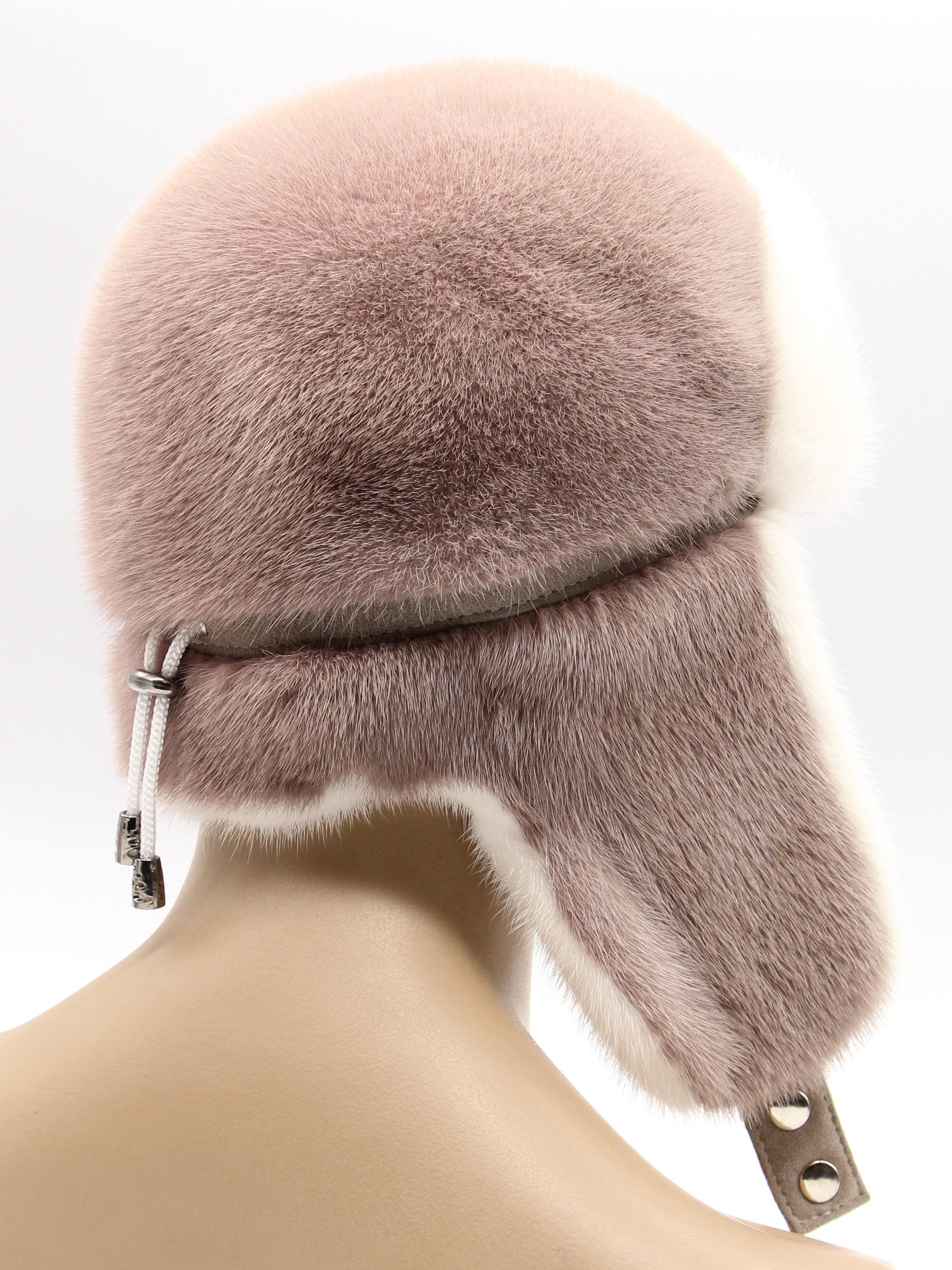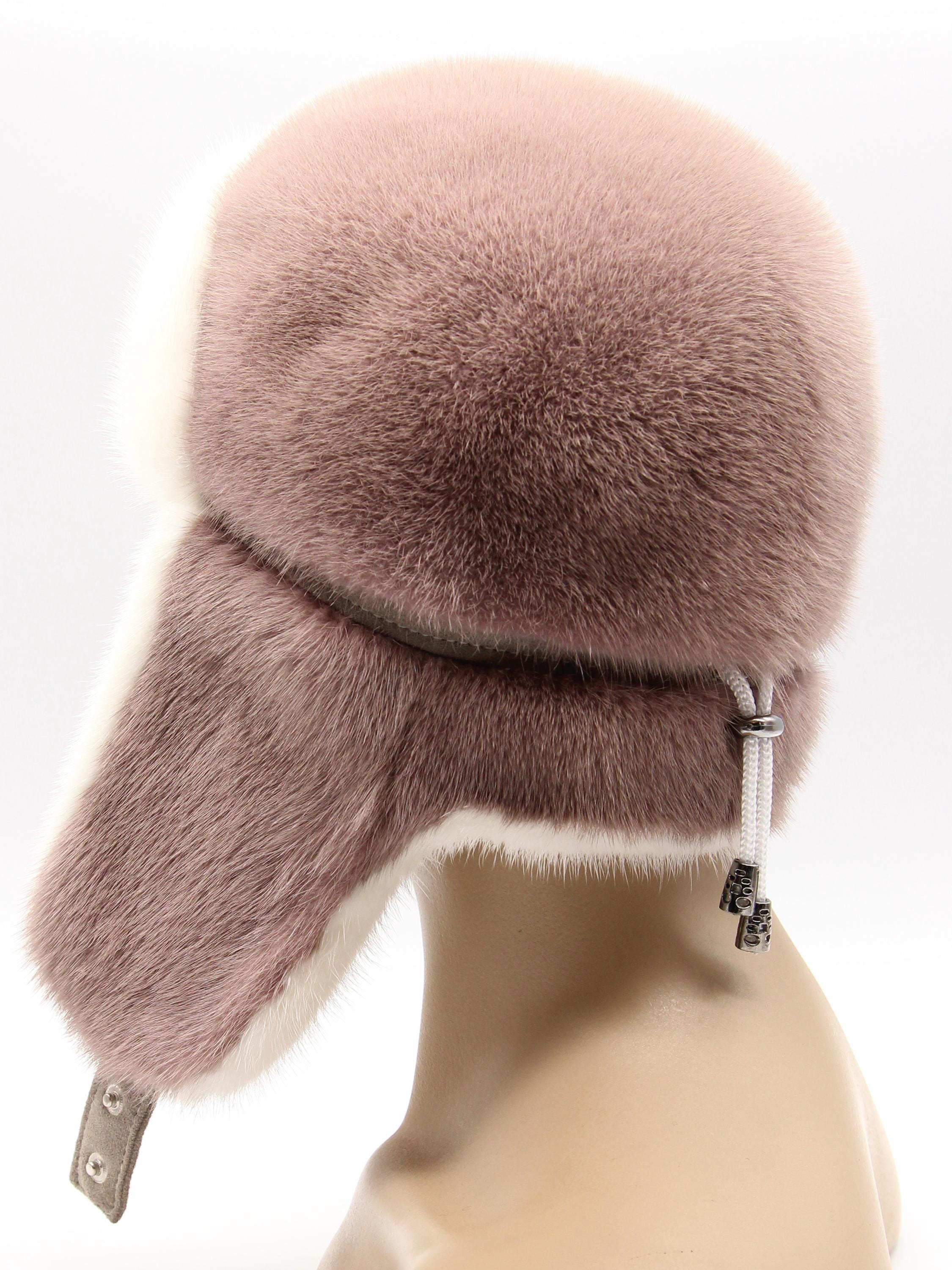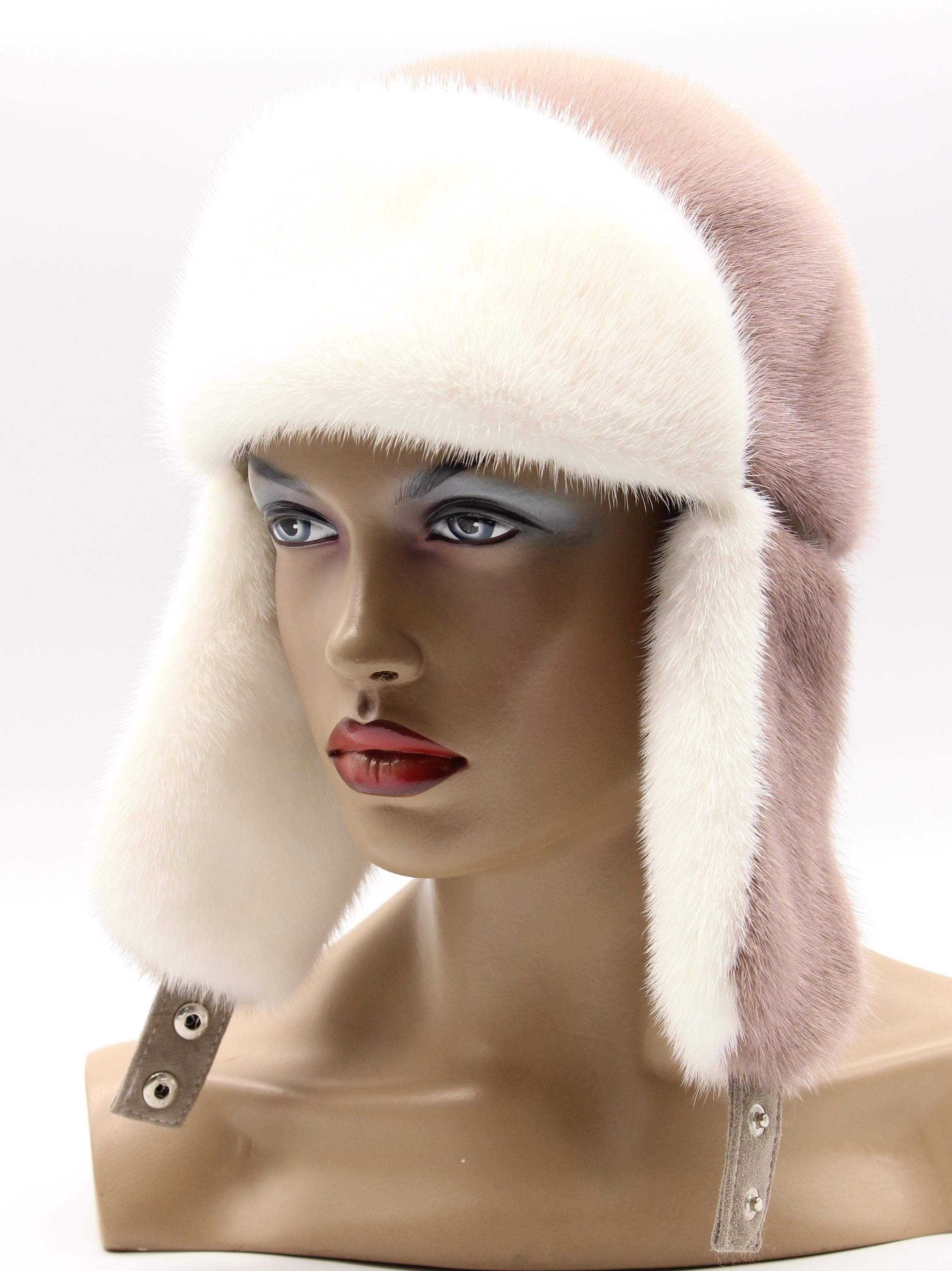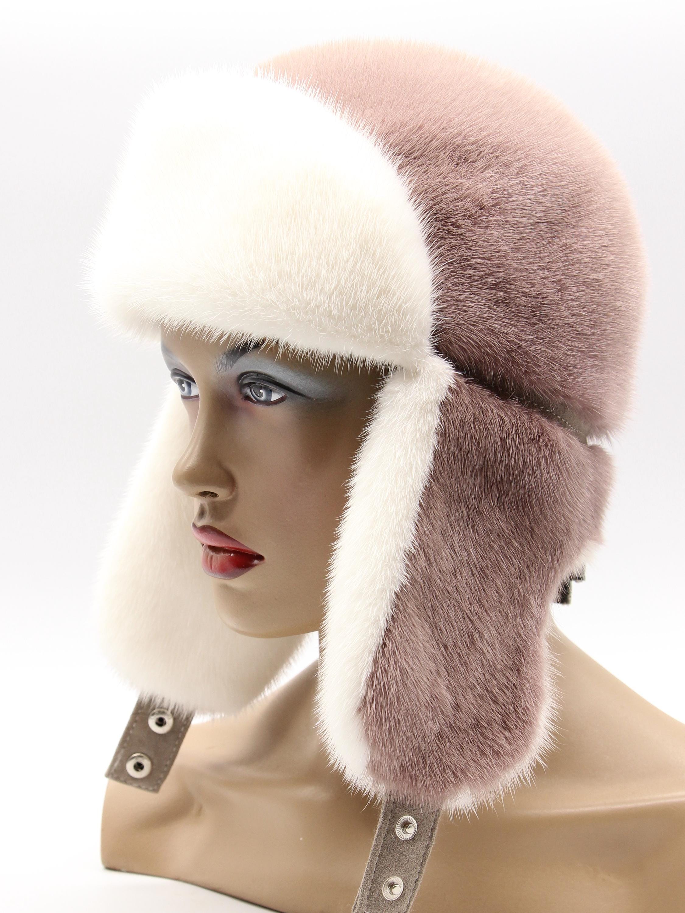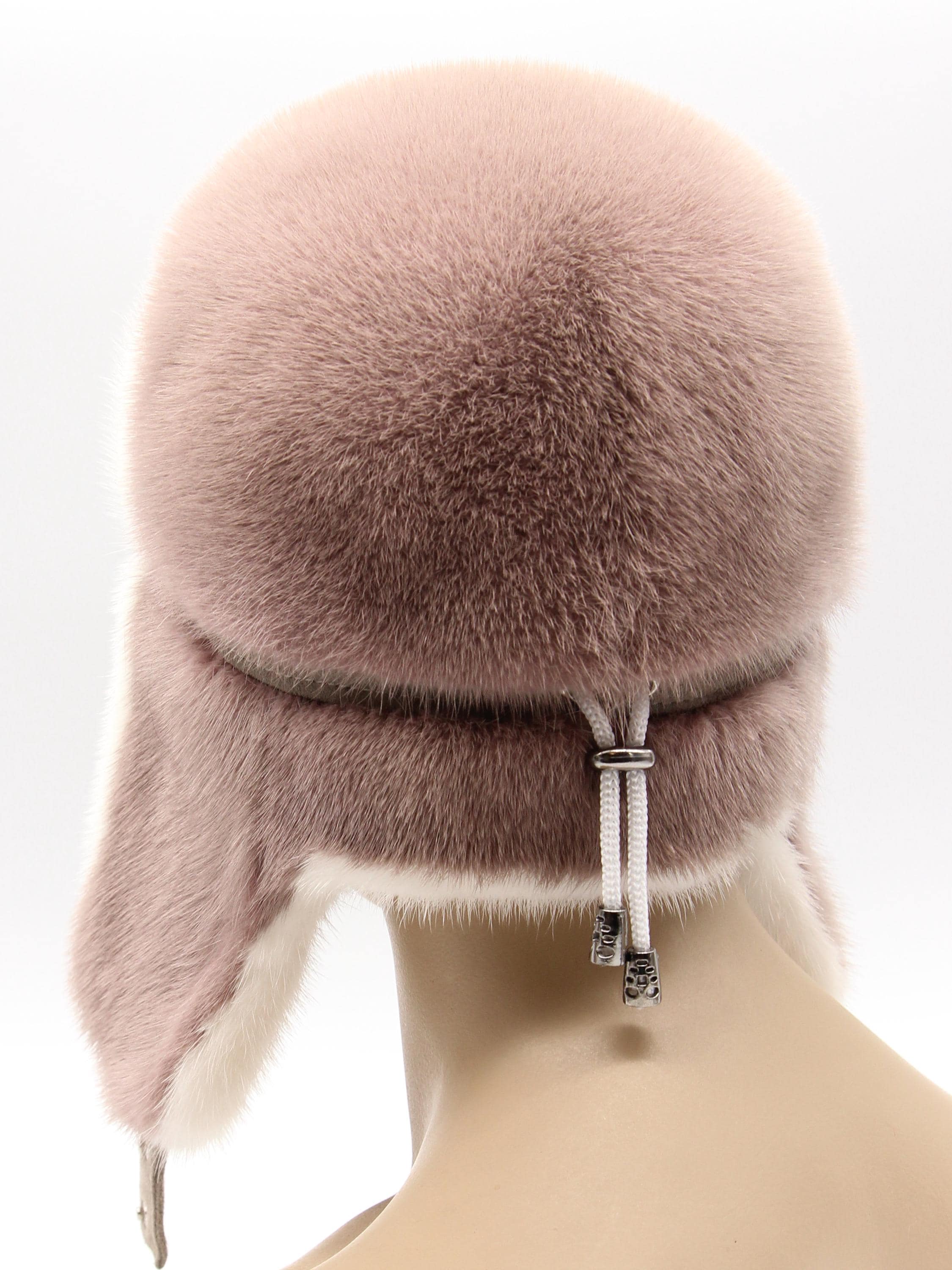 Handmade Powder Pink Mink Fur Ushanka Hat with White Forehead and Inner Earflaps for Women