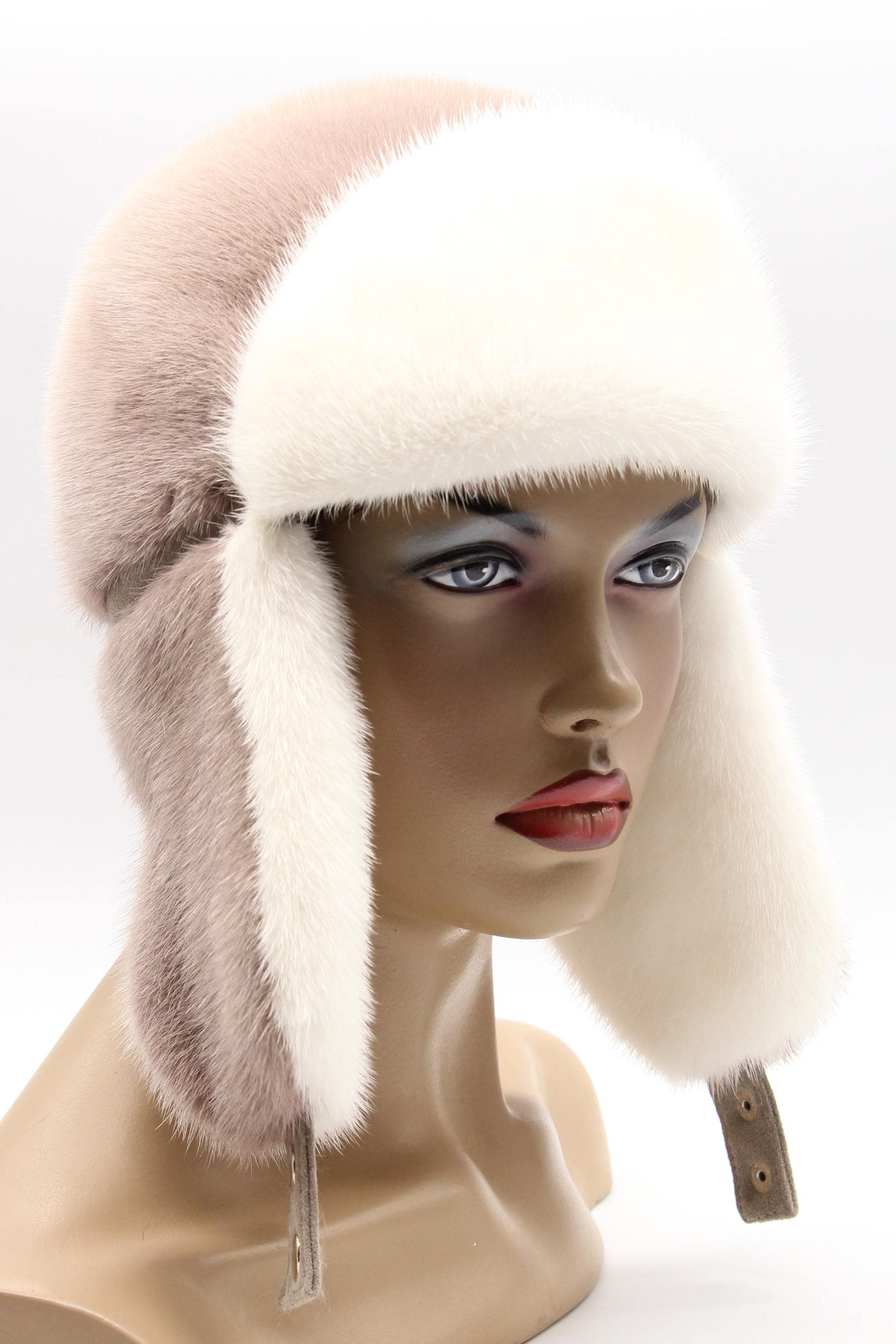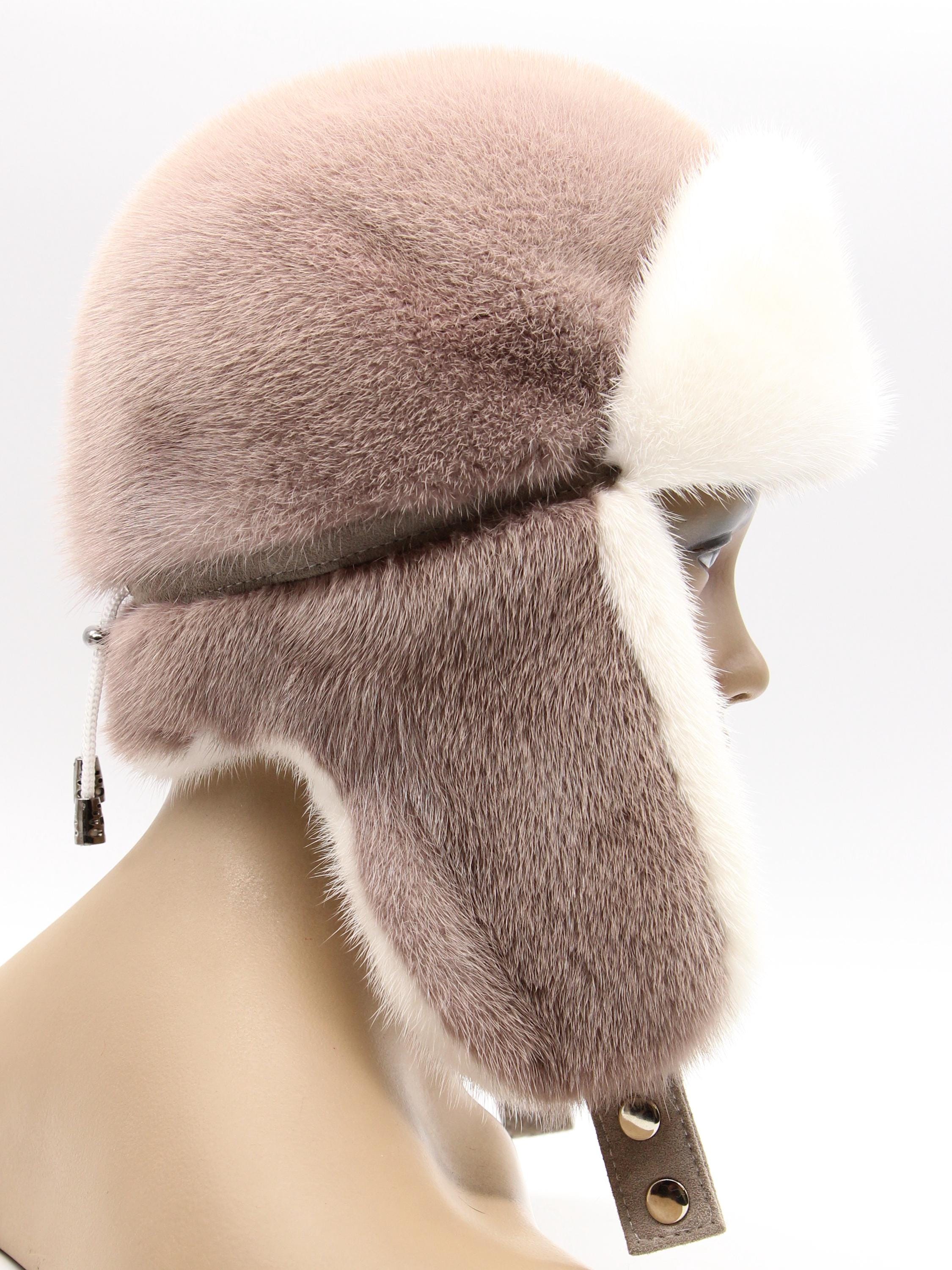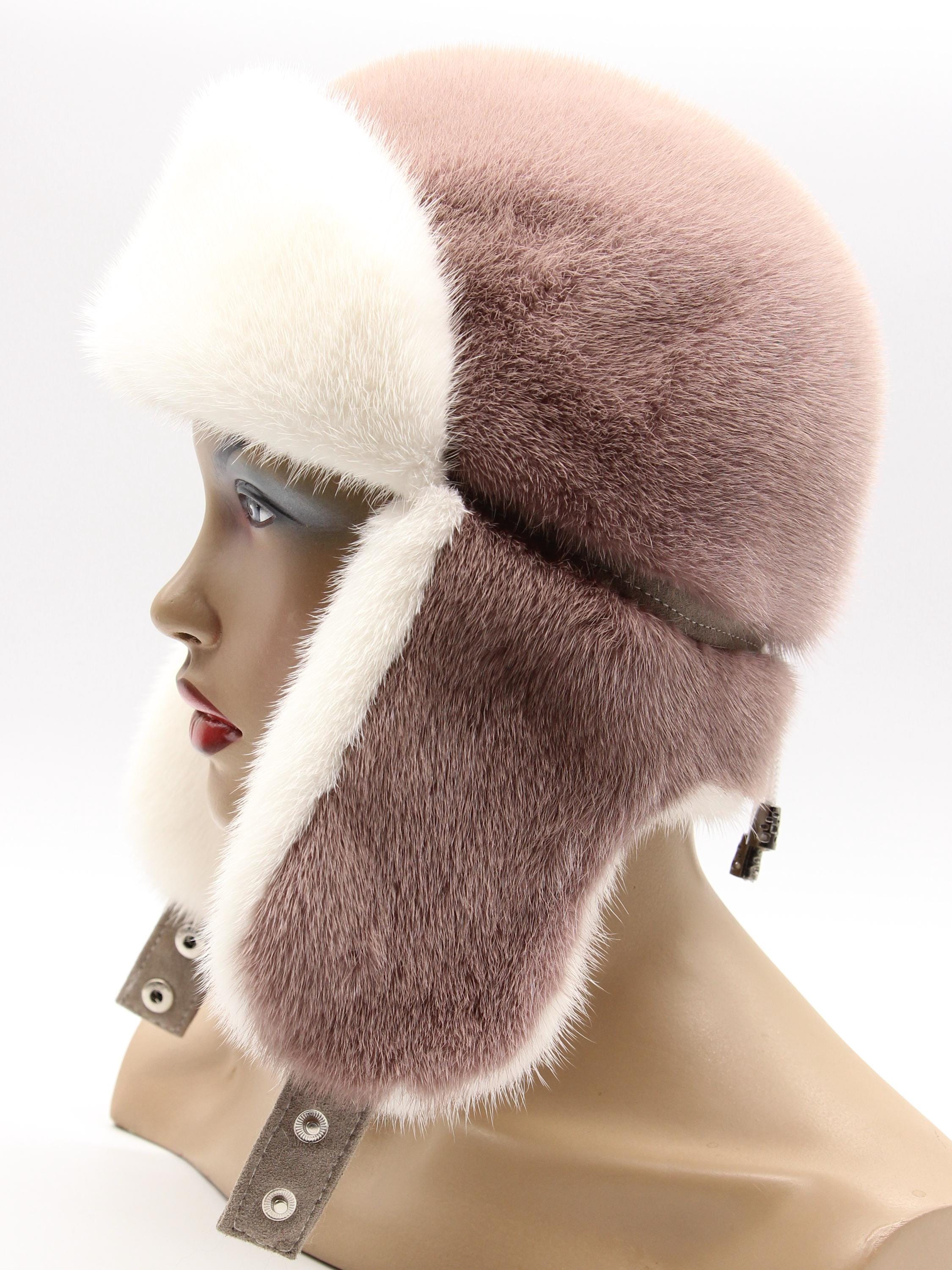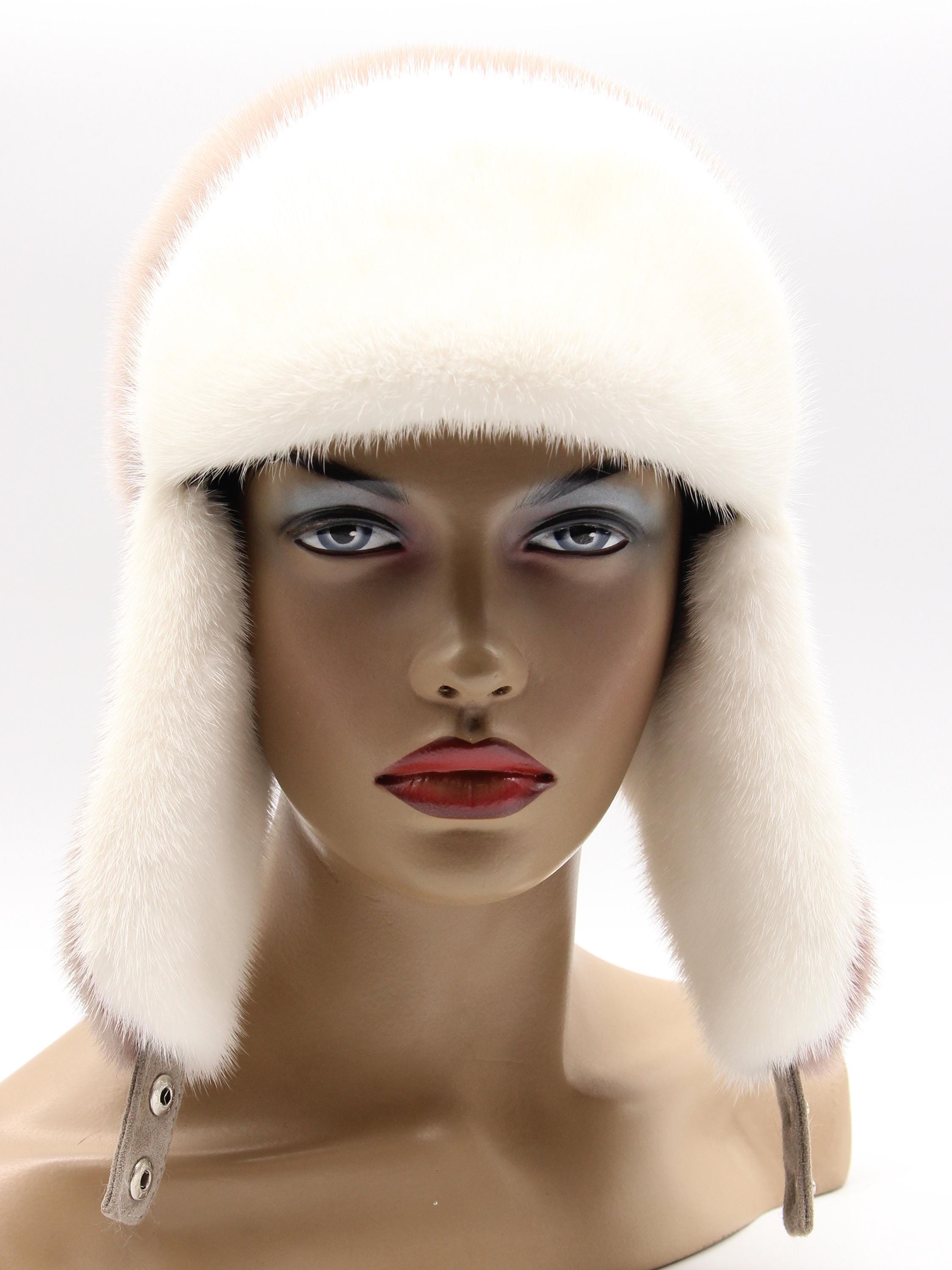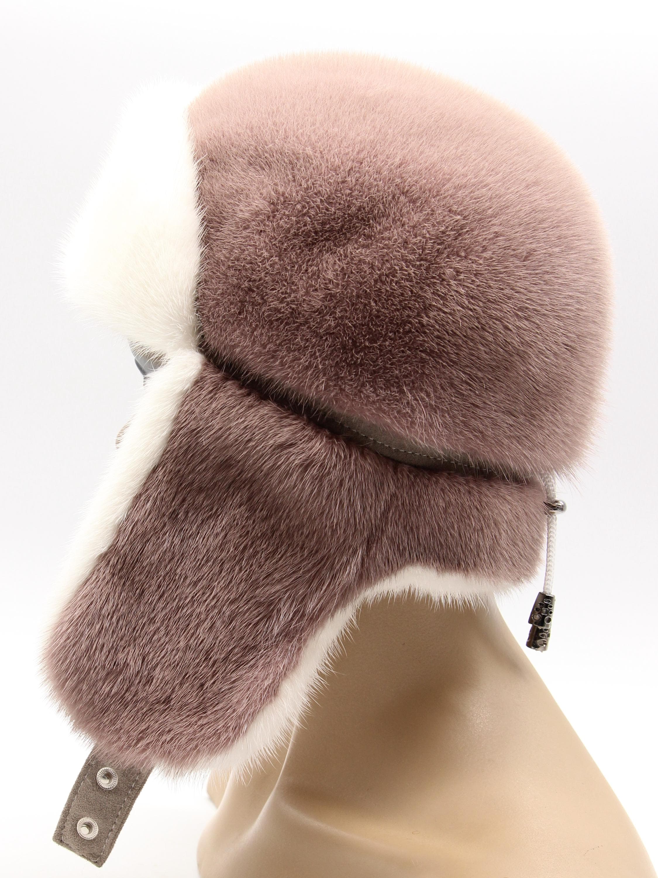 Handmade Powder Pink Mink Fur Ushanka Hat with White Forehead and Inner Earflaps for Women