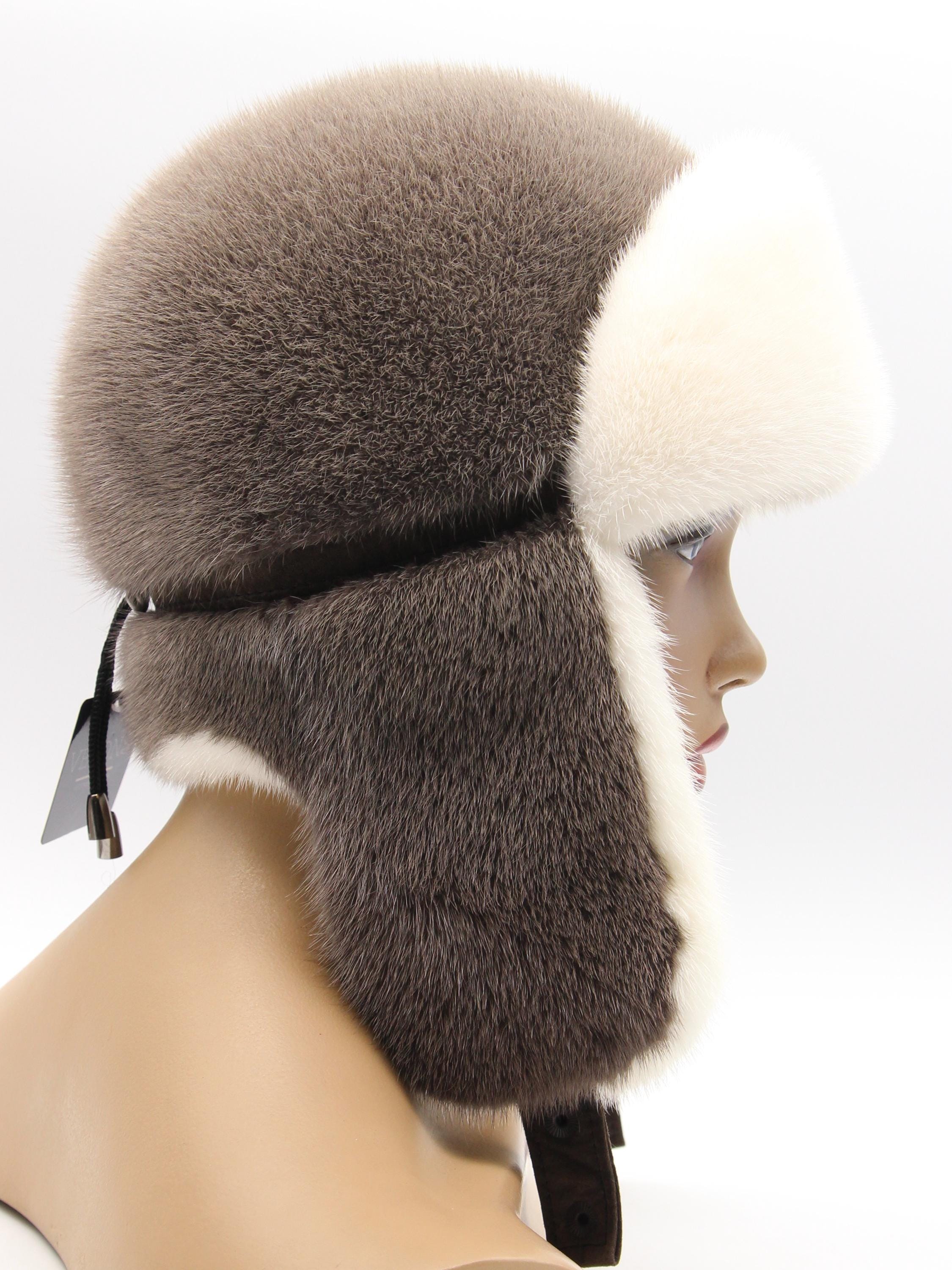 Cappuccino brown mink ushanka with white forehead and white inner earflaps. That warm coffee-with-cream tone that's softer and warmer than regular brown.