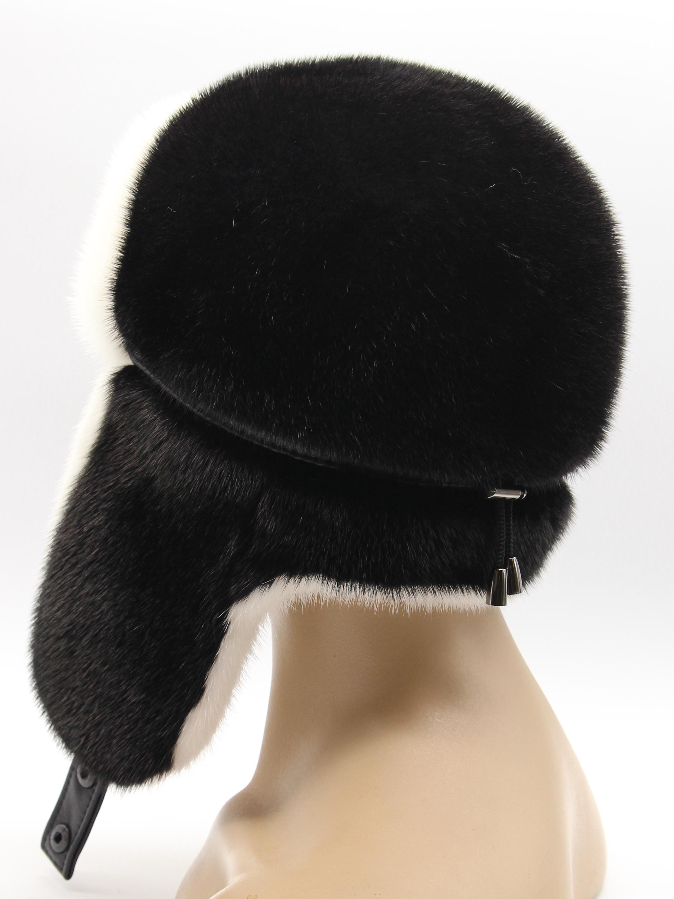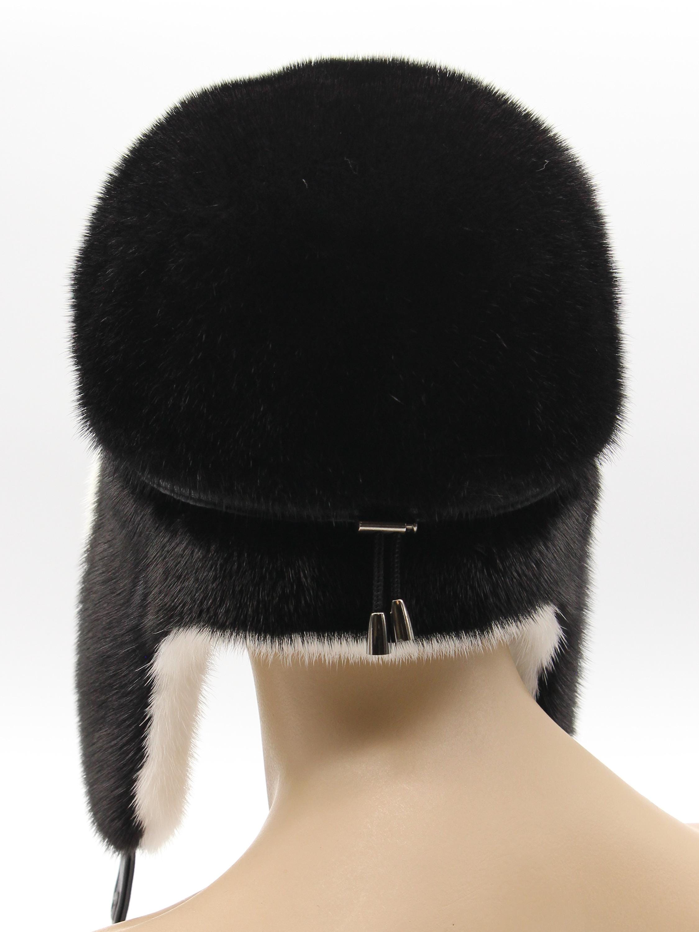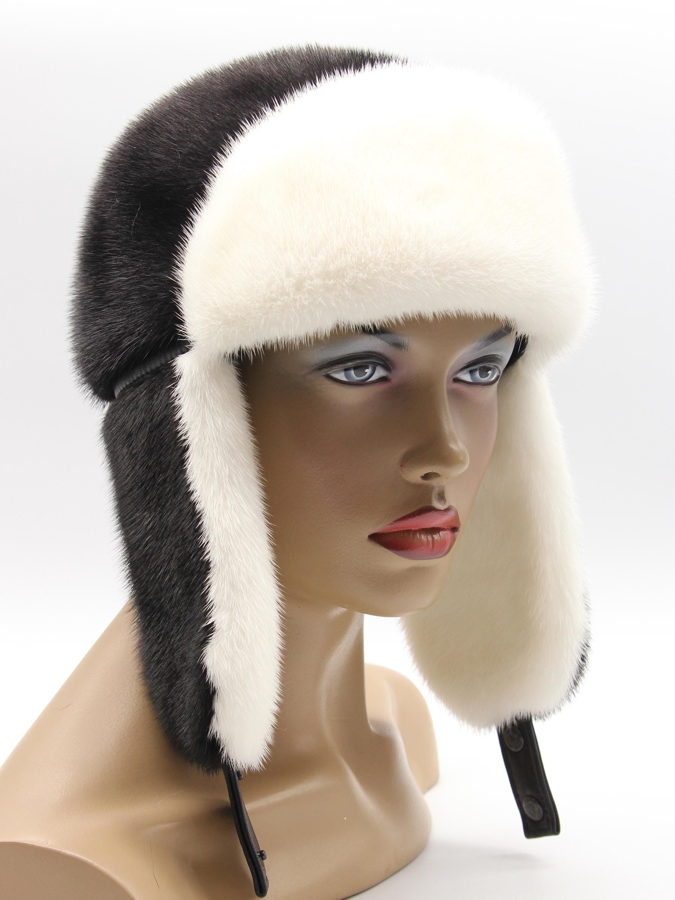 Handmade Black Mink Fur Ushanka Hat with White Forehead and Inner Earflaps for Women