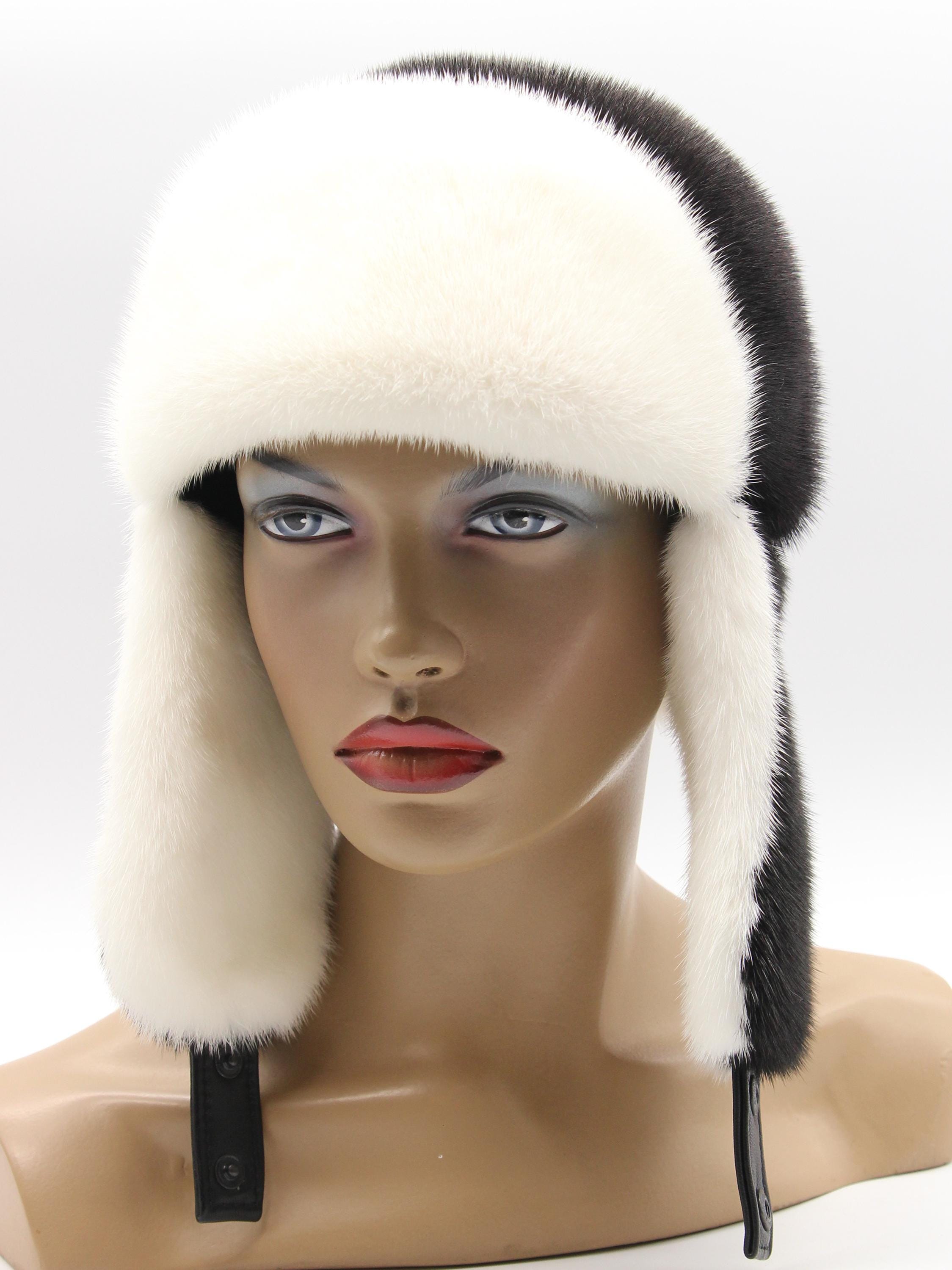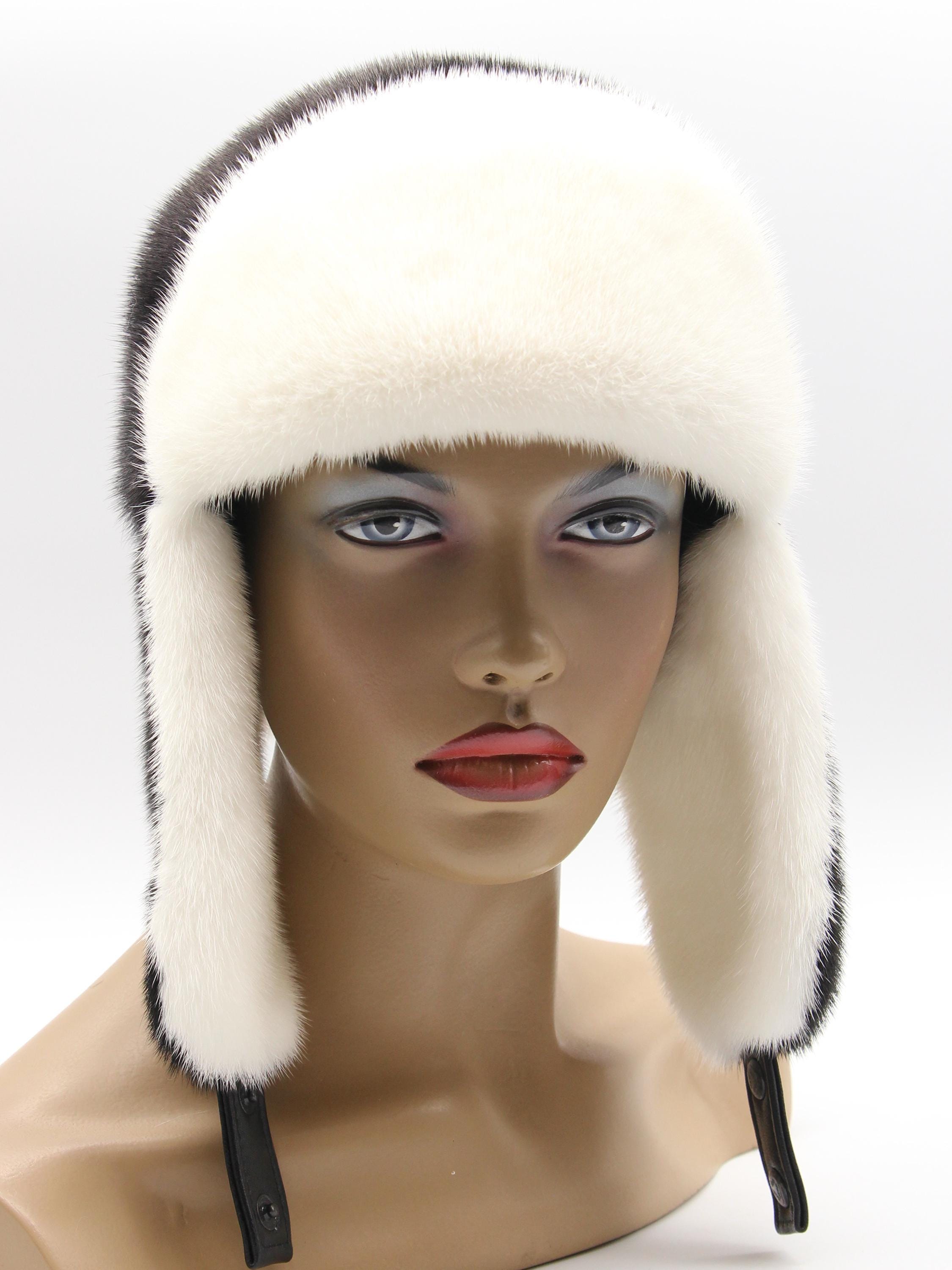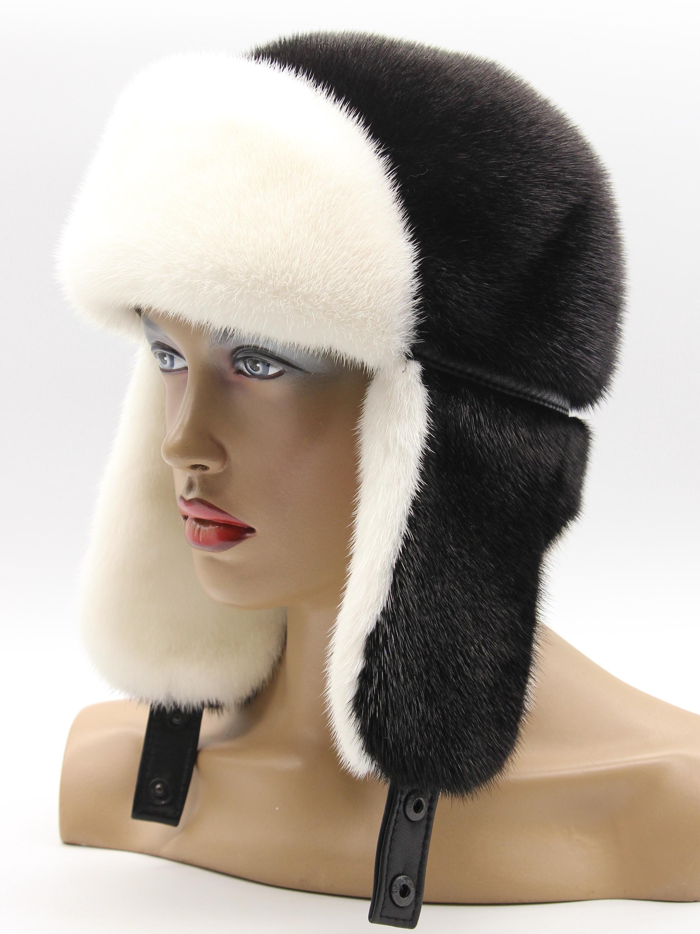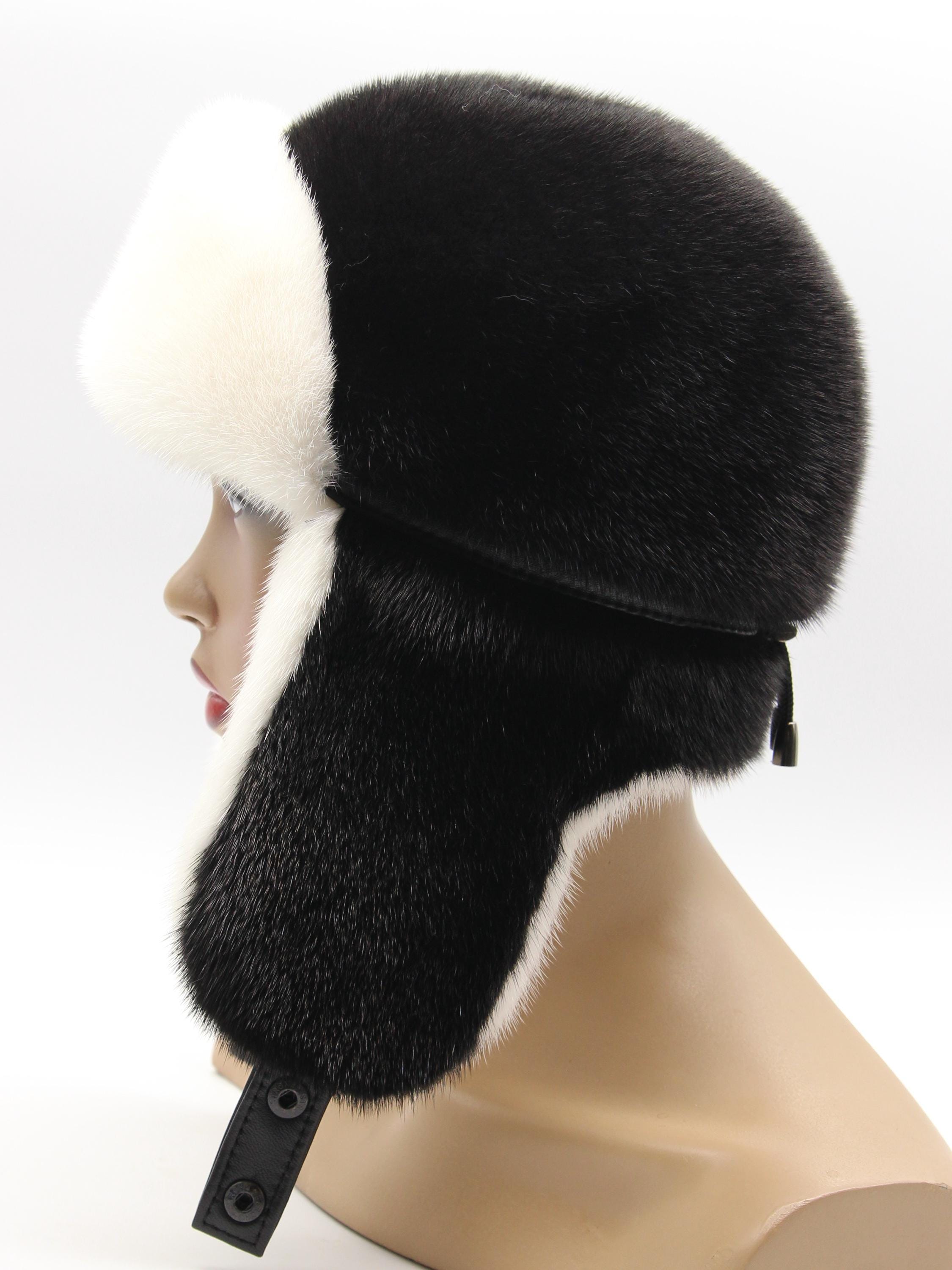 Handmade Black Mink Fur Ushanka Hat with White Forehead and Inner Earflaps for Women