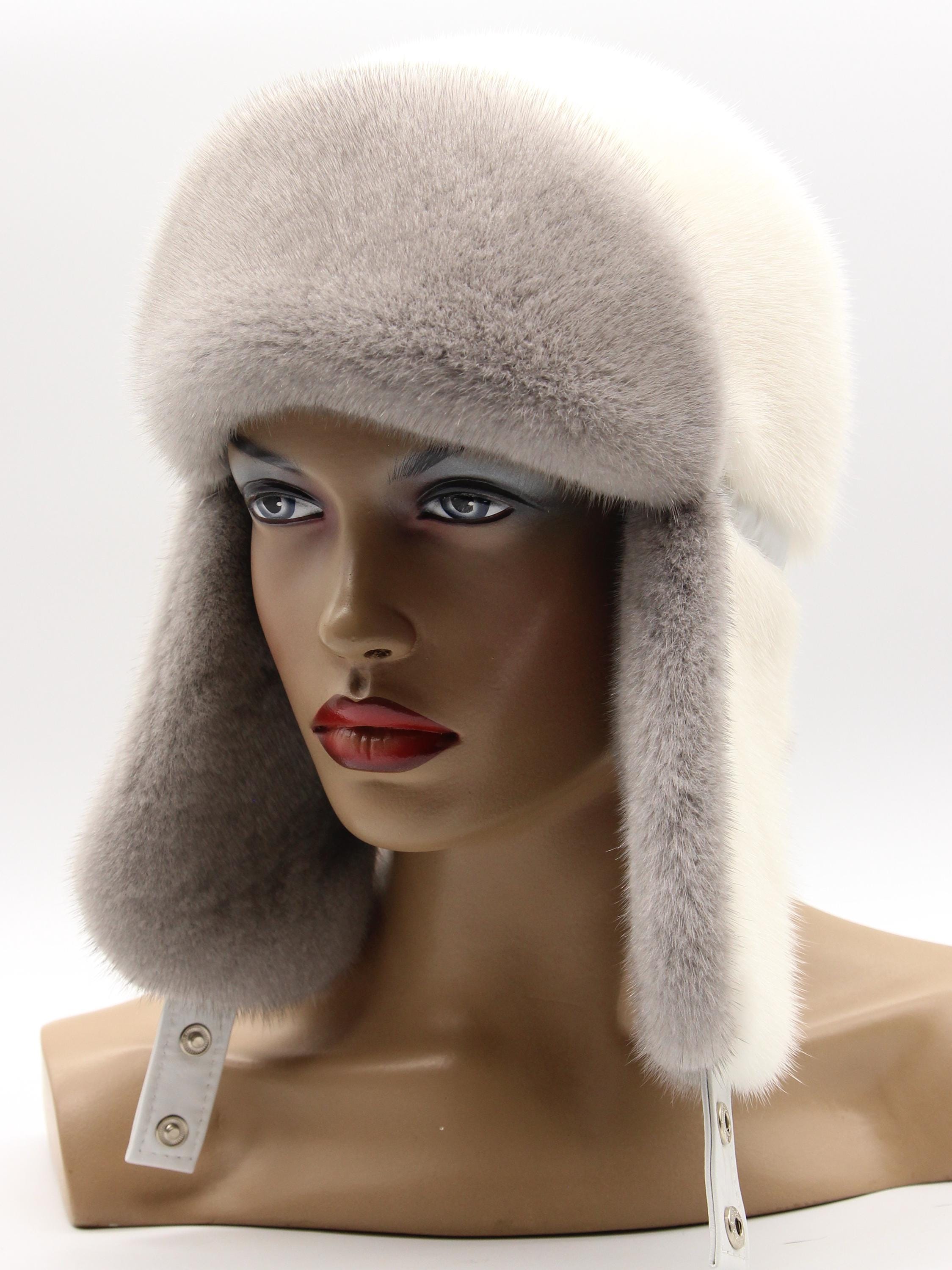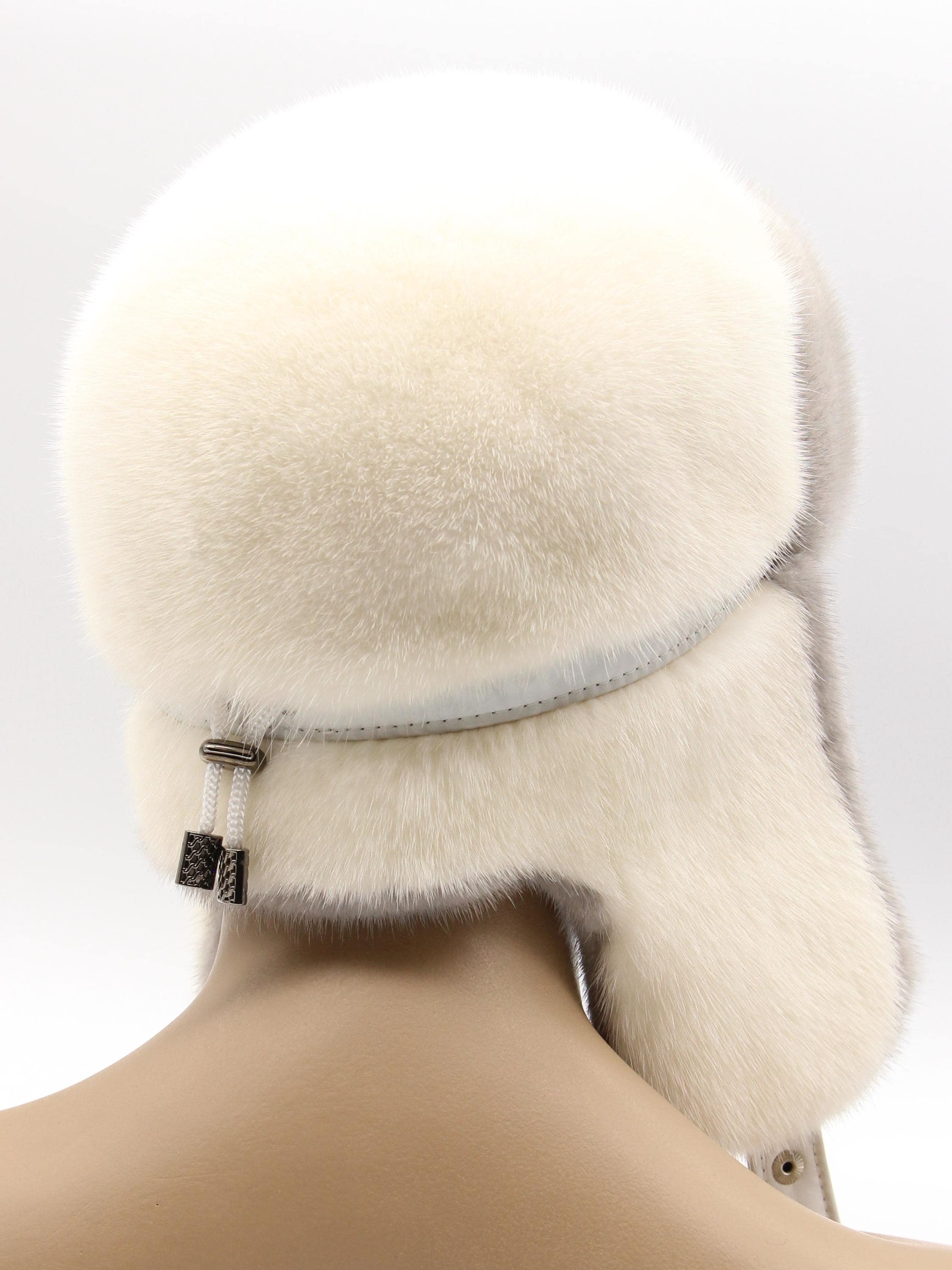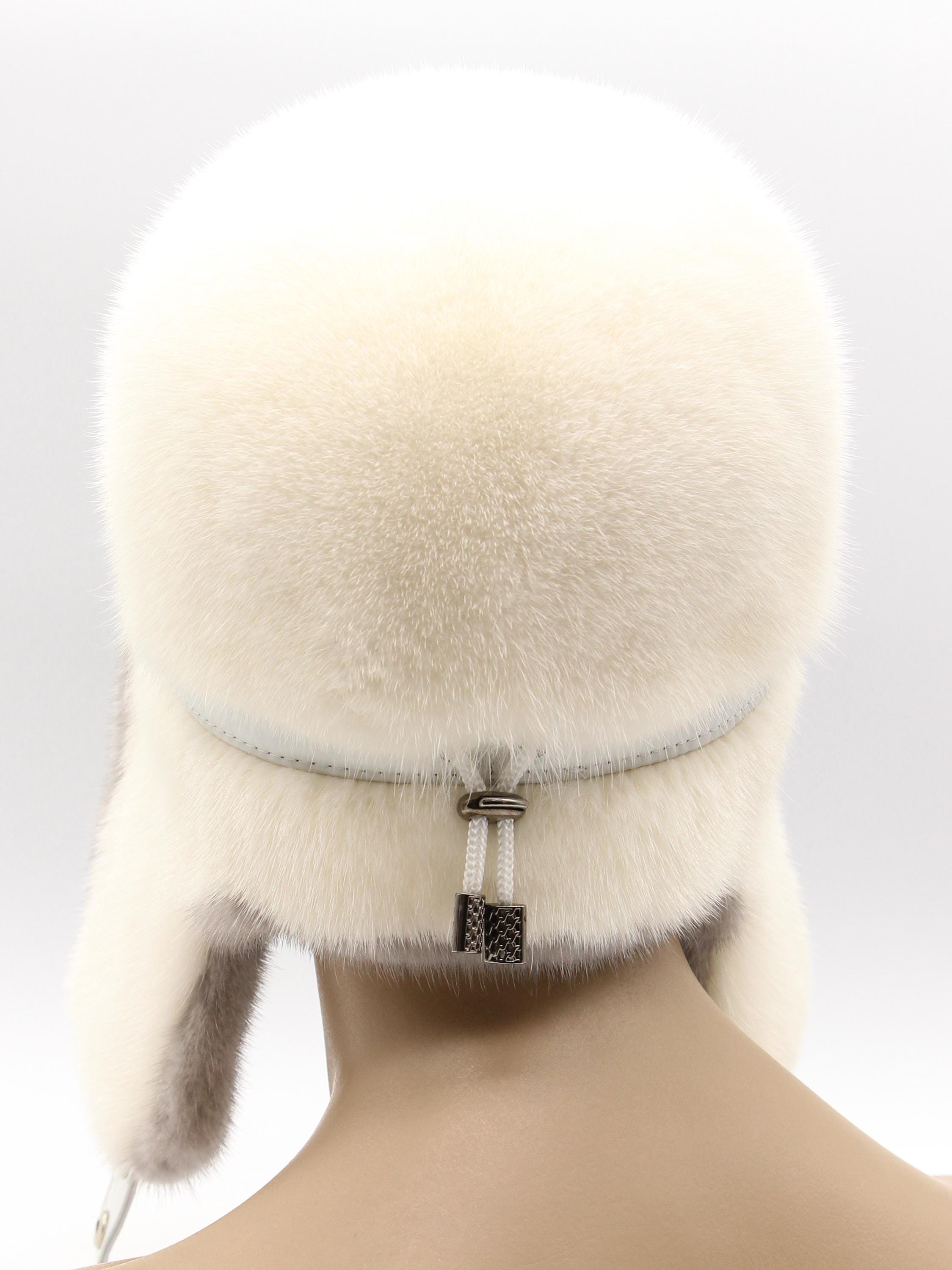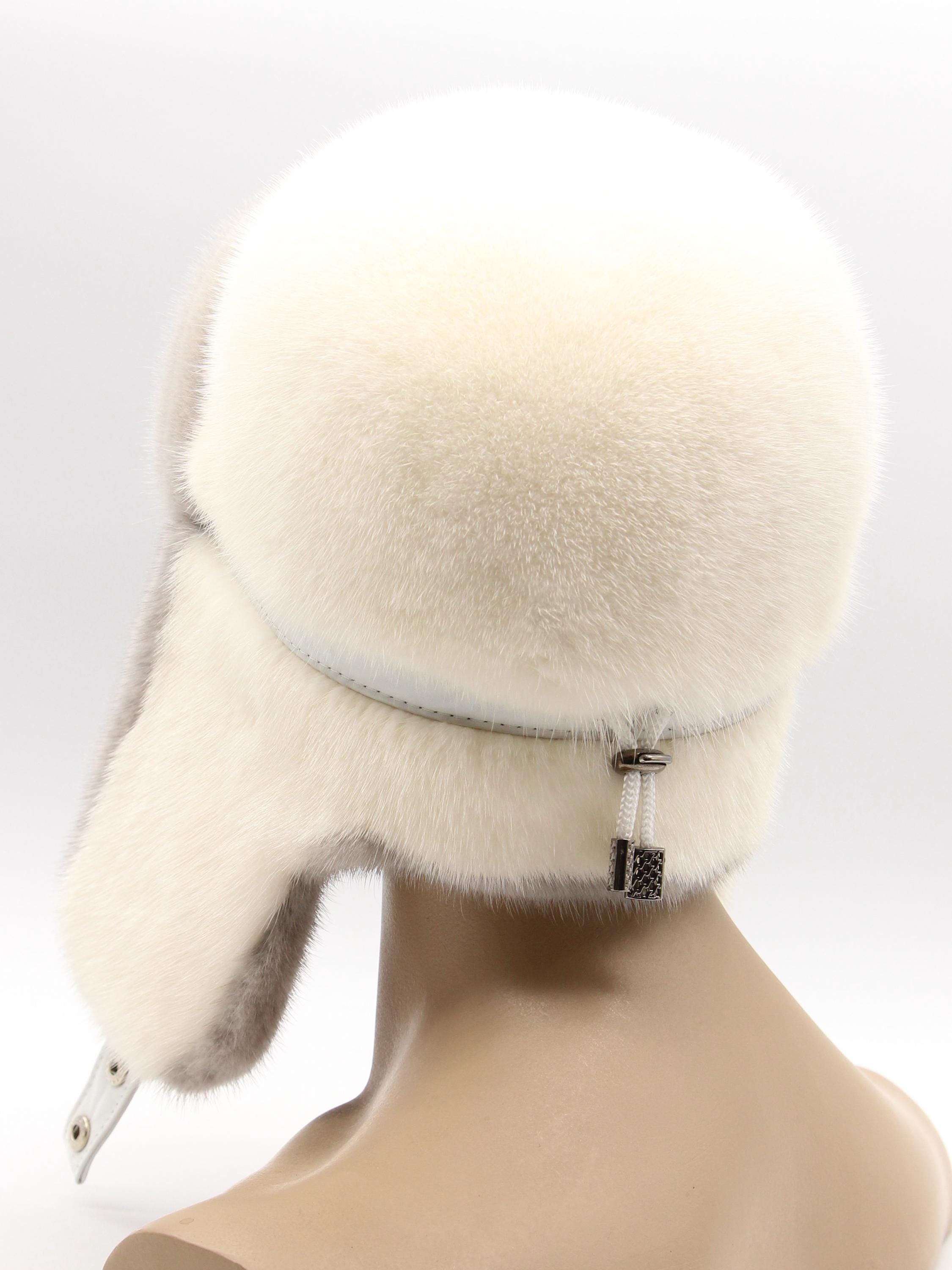 Handmade White Mink Fur Ushanka Hat with Sapphire Blue Forehead and Inner Earflaps