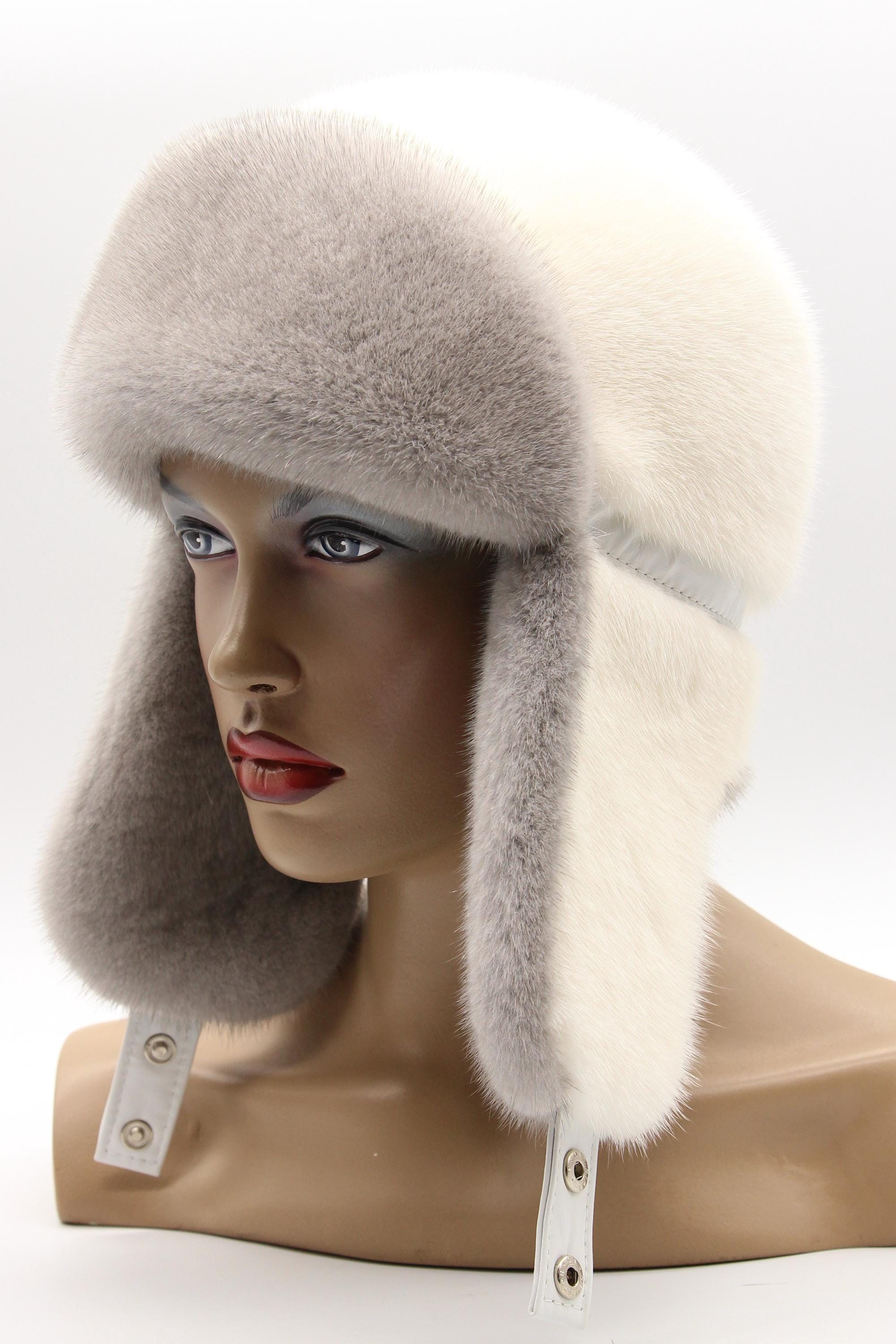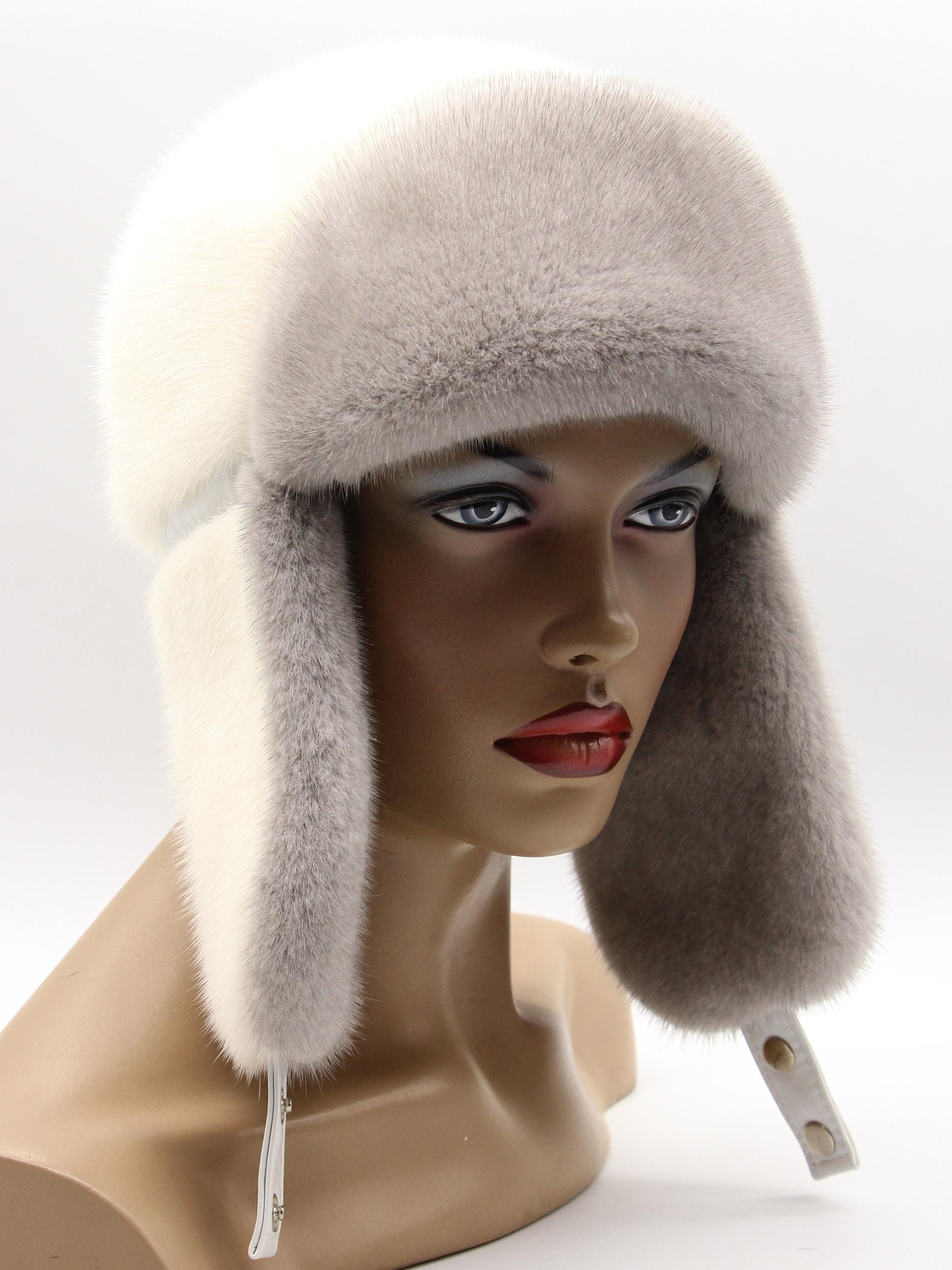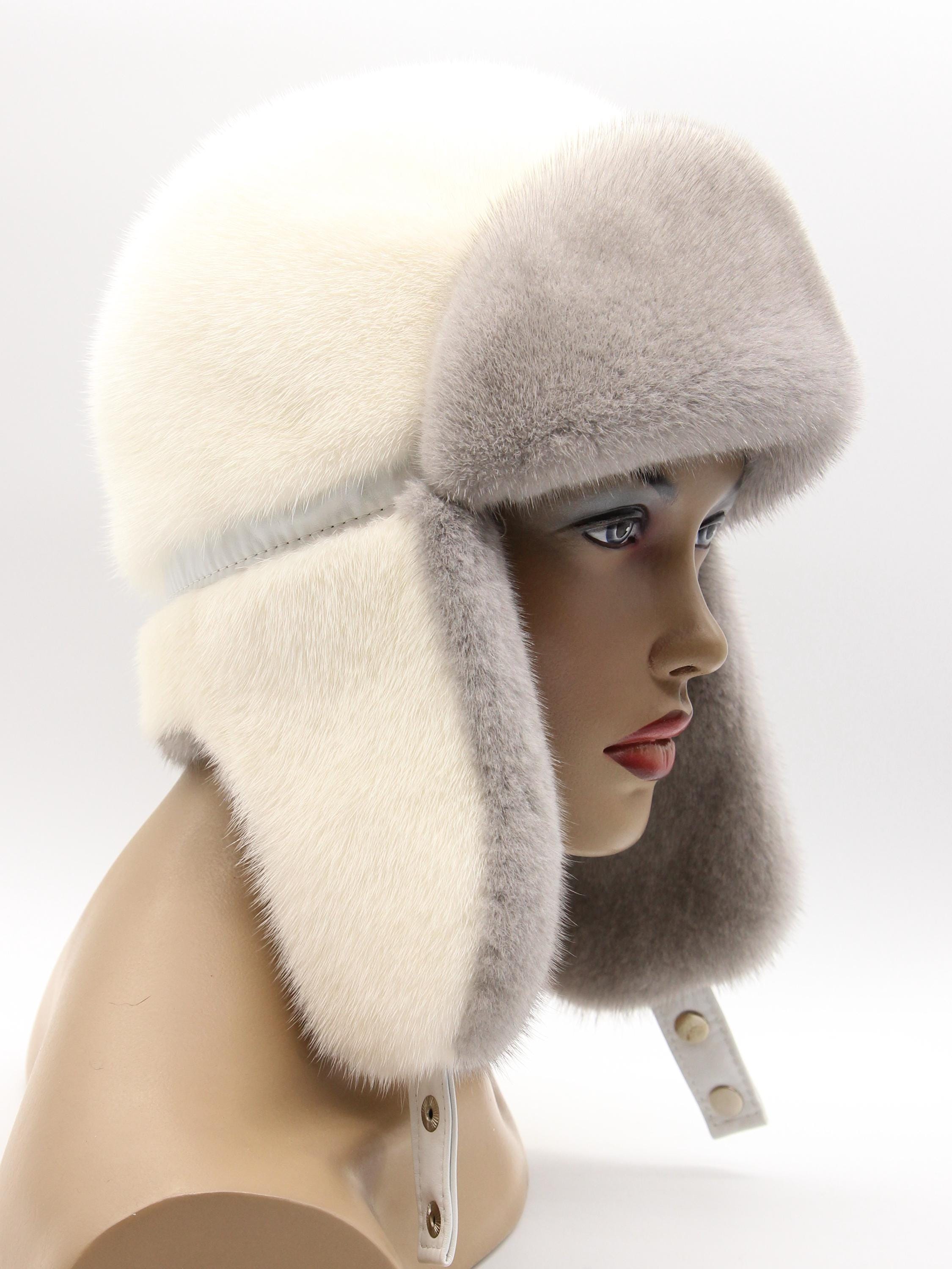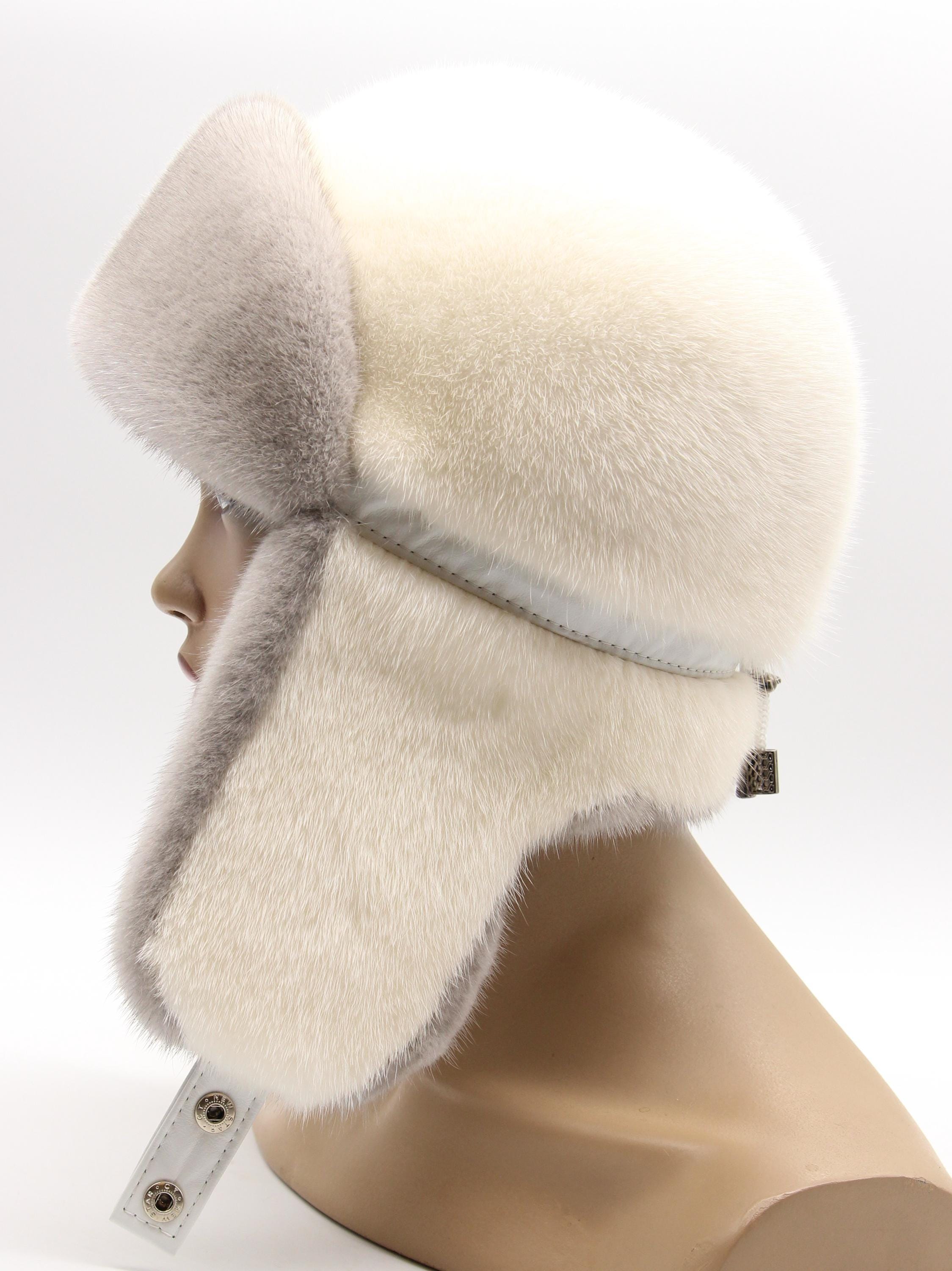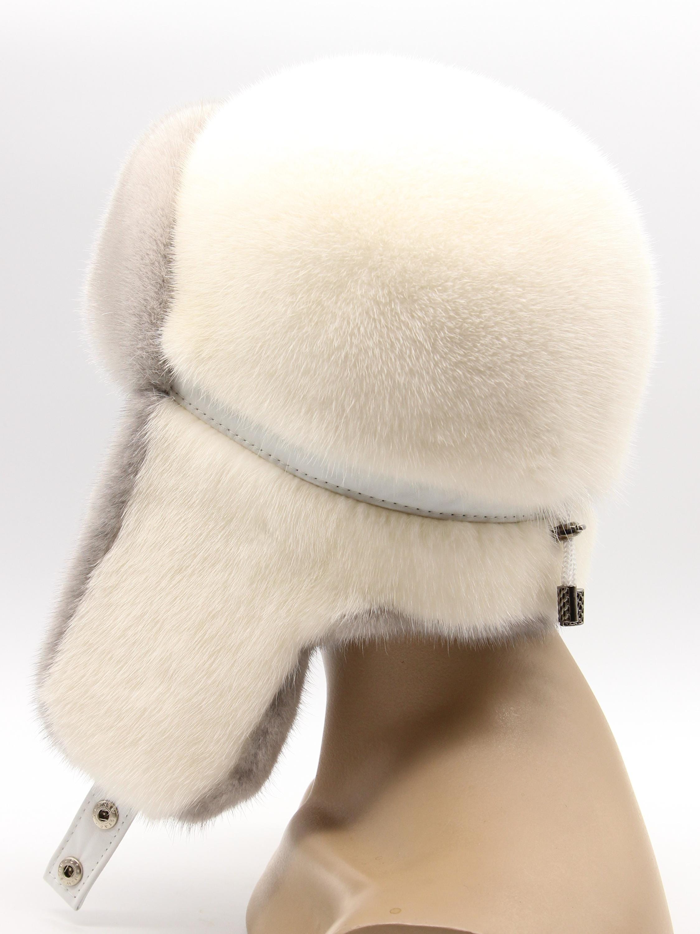Handmade White Mink Fur Ushanka Hat with Sapphire Blue Forehead and Inner Earflaps