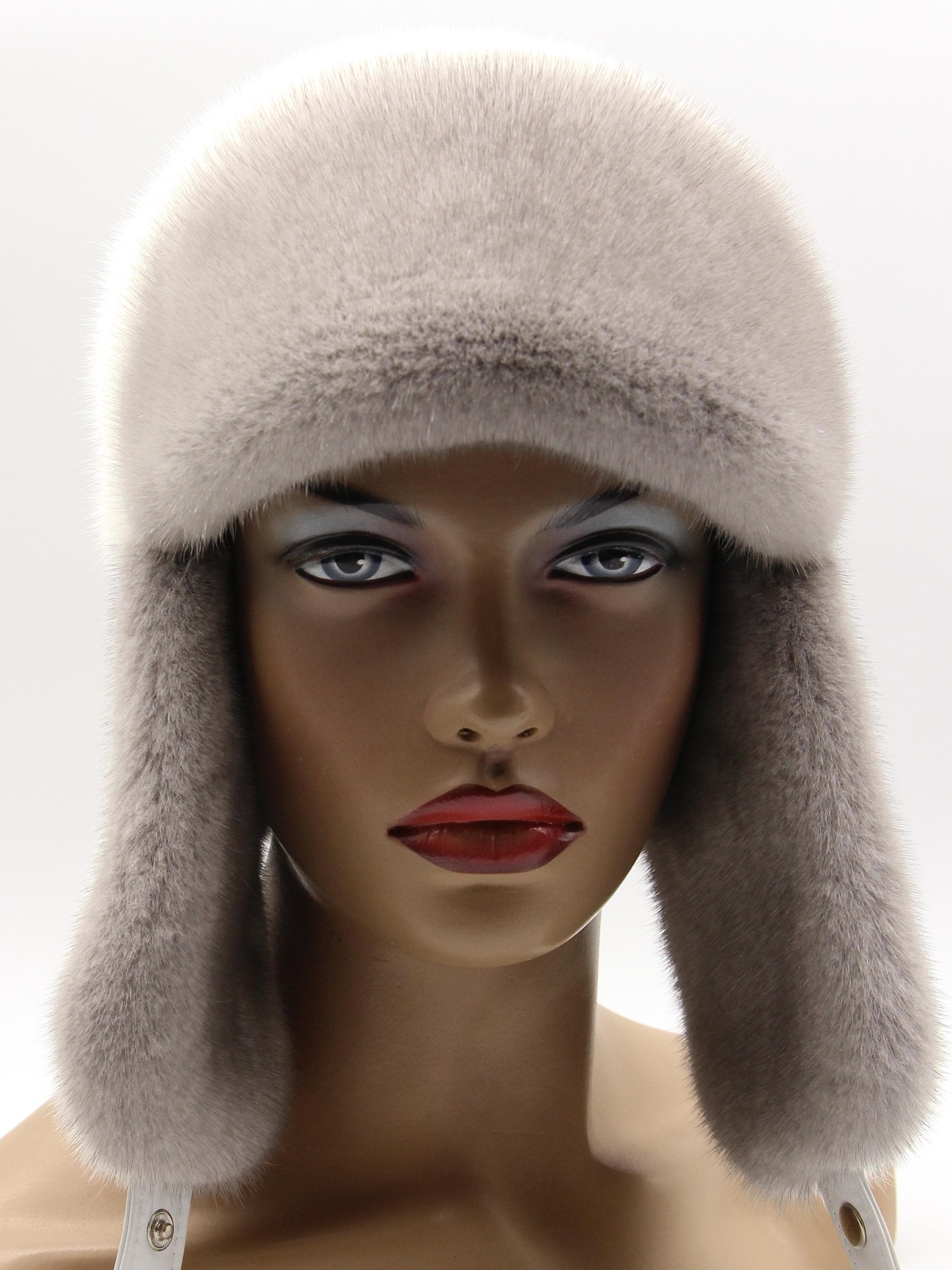 White mink ushanka with sapphire blue forehead and sapphire inner earflaps. Not your typical color combo – this one turns heads but stays sophisticated enough for serious settings.
