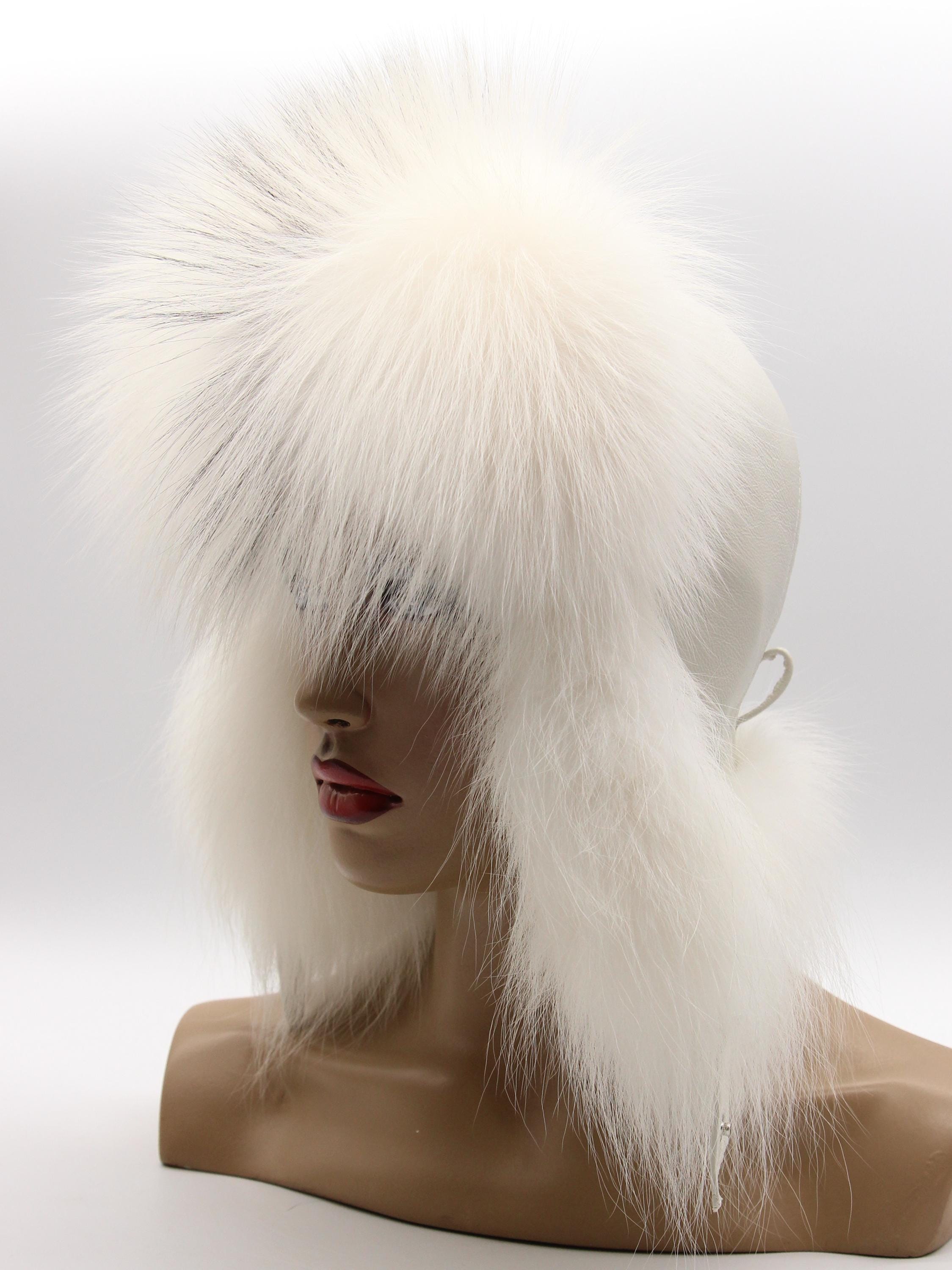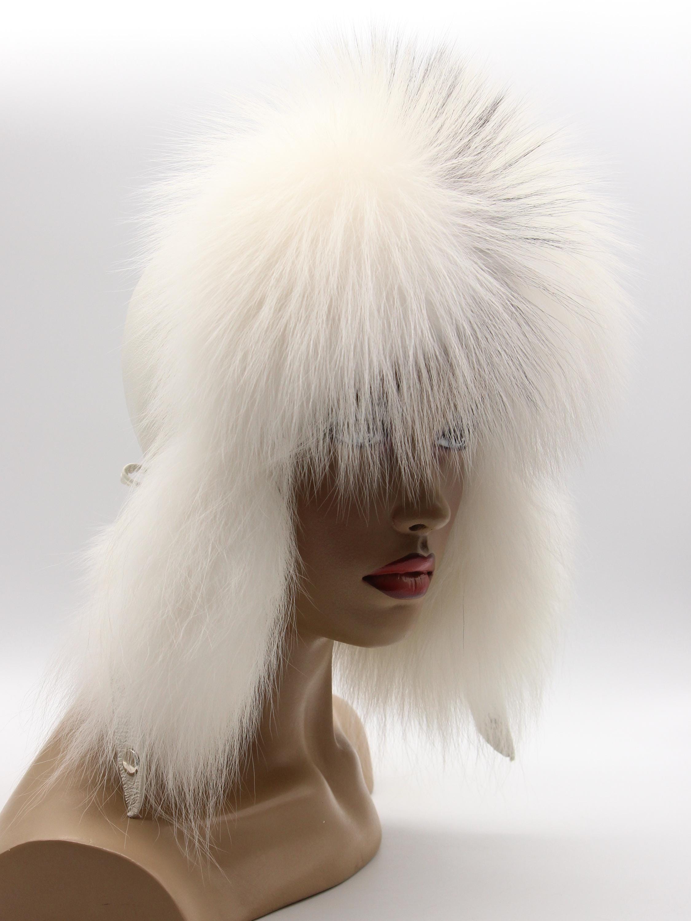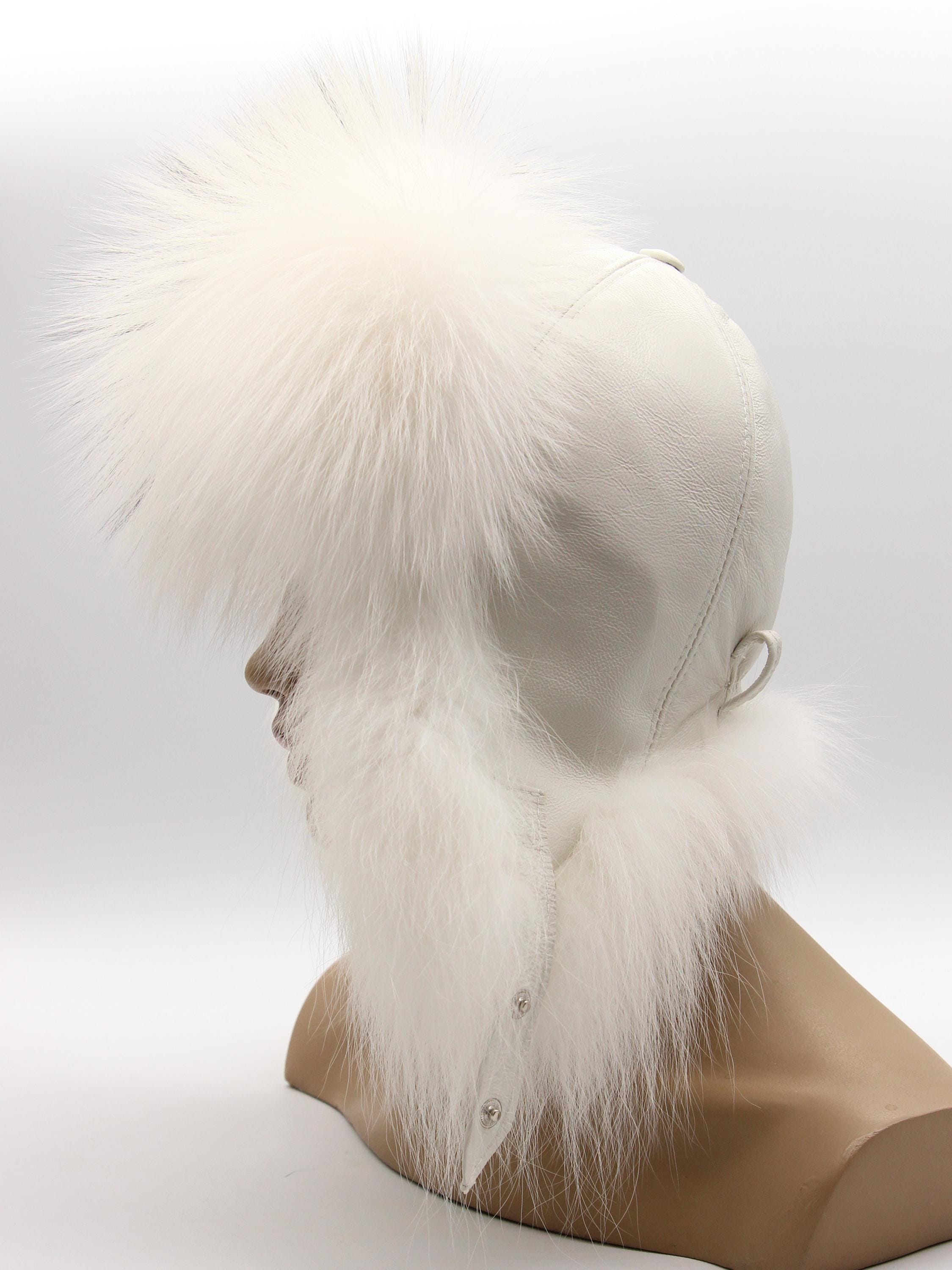 White leather forms main body and crown structure. White fox fur trims all edges and covers entire earflaps inside and out. When earflaps hang or you tie them different ways, that real fox frames your face keeping ears protected from cold.
