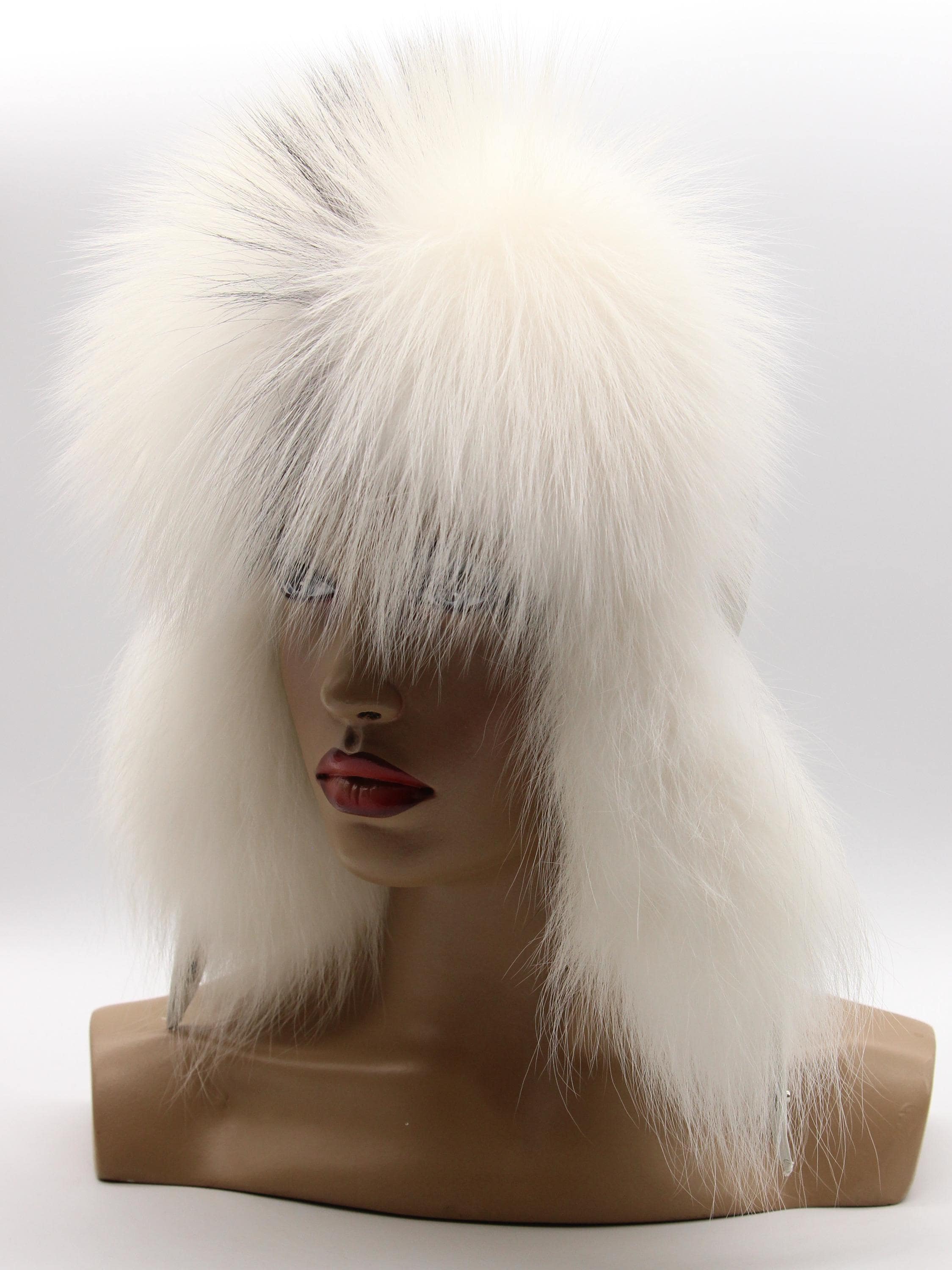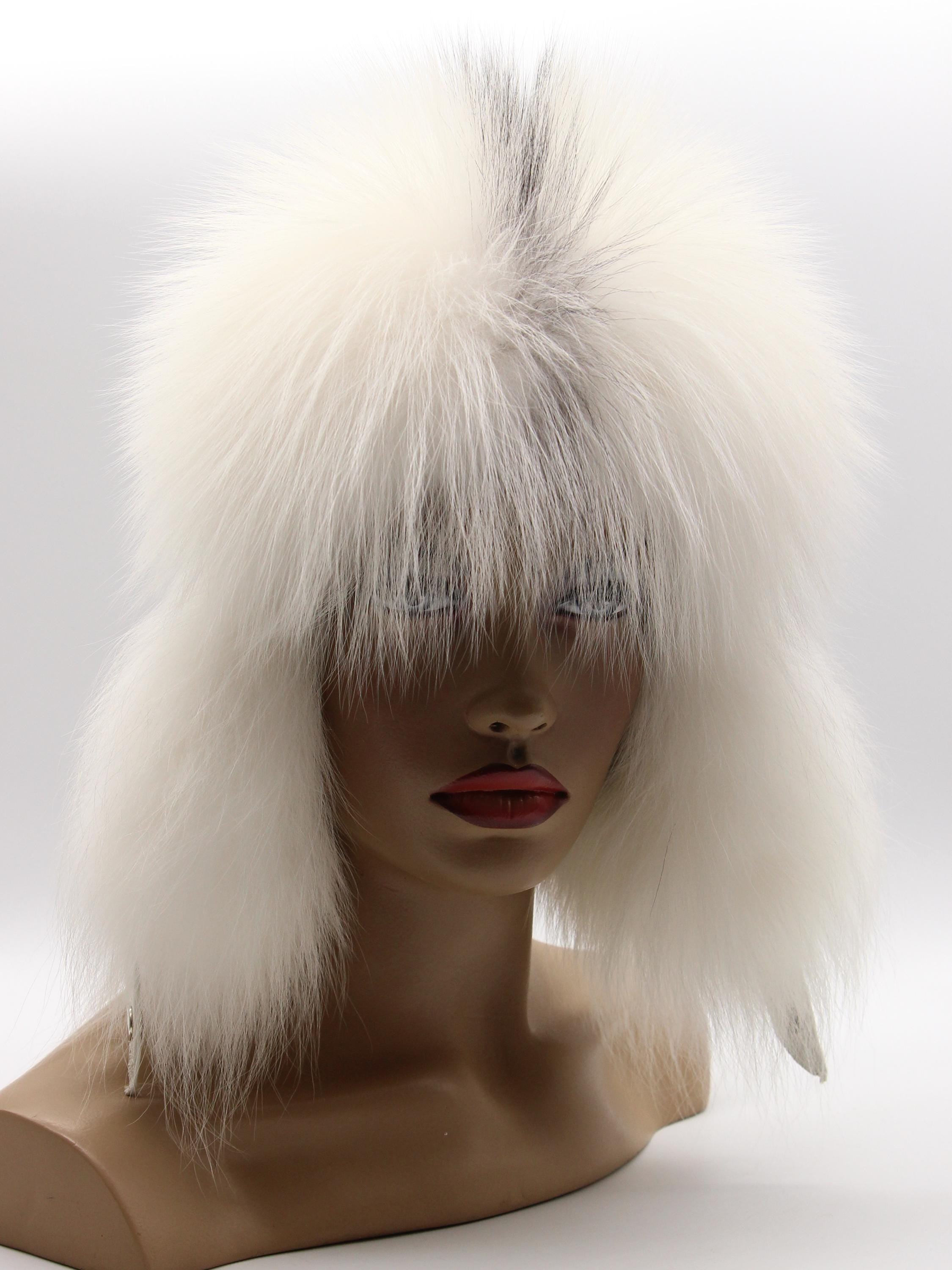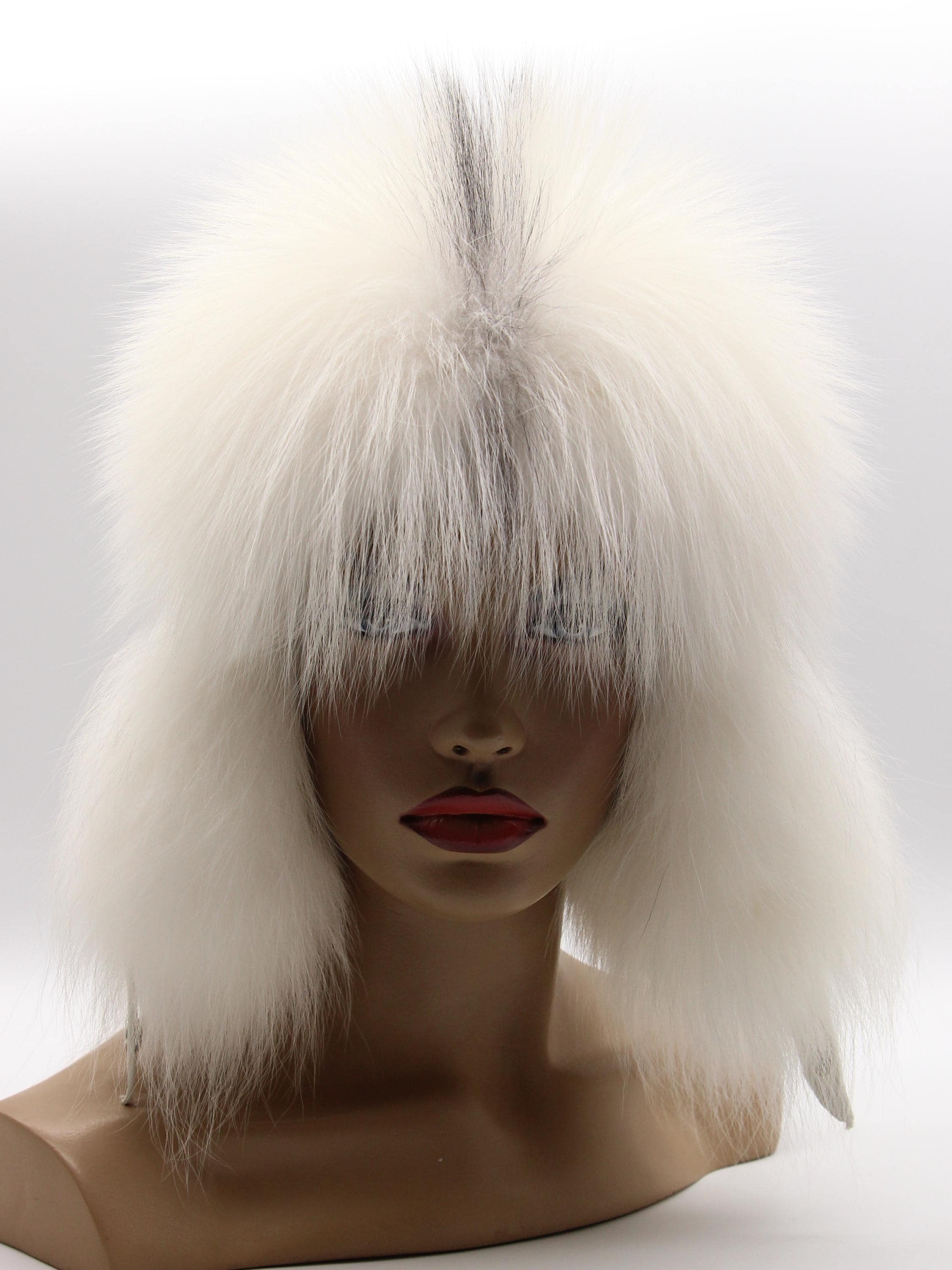 White leather forms main body and crown structure. White fox fur trims all edges and covers entire earflaps inside and out. When earflaps hang or you tie them different ways, that real fox frames your face keeping ears protected from cold.