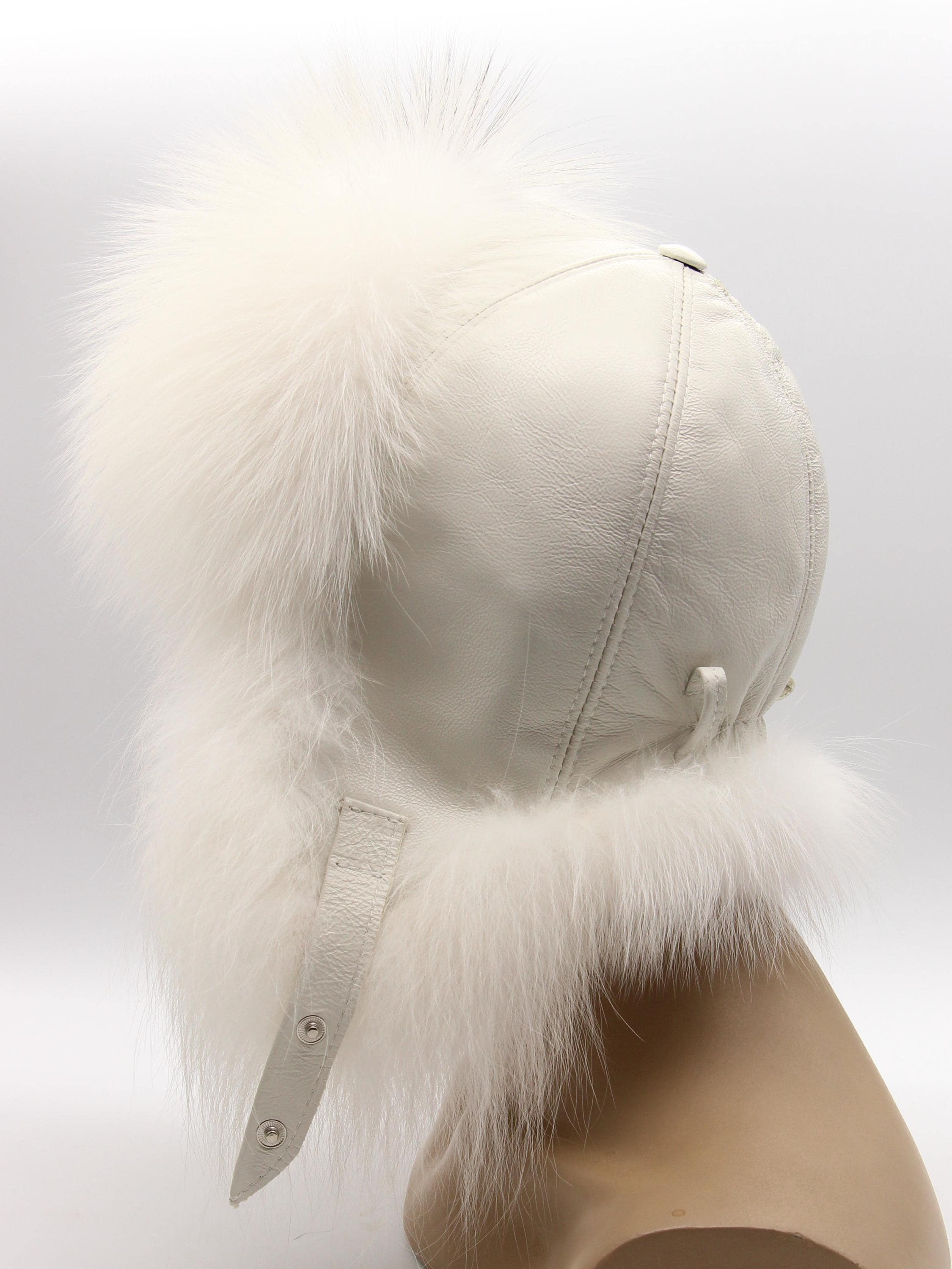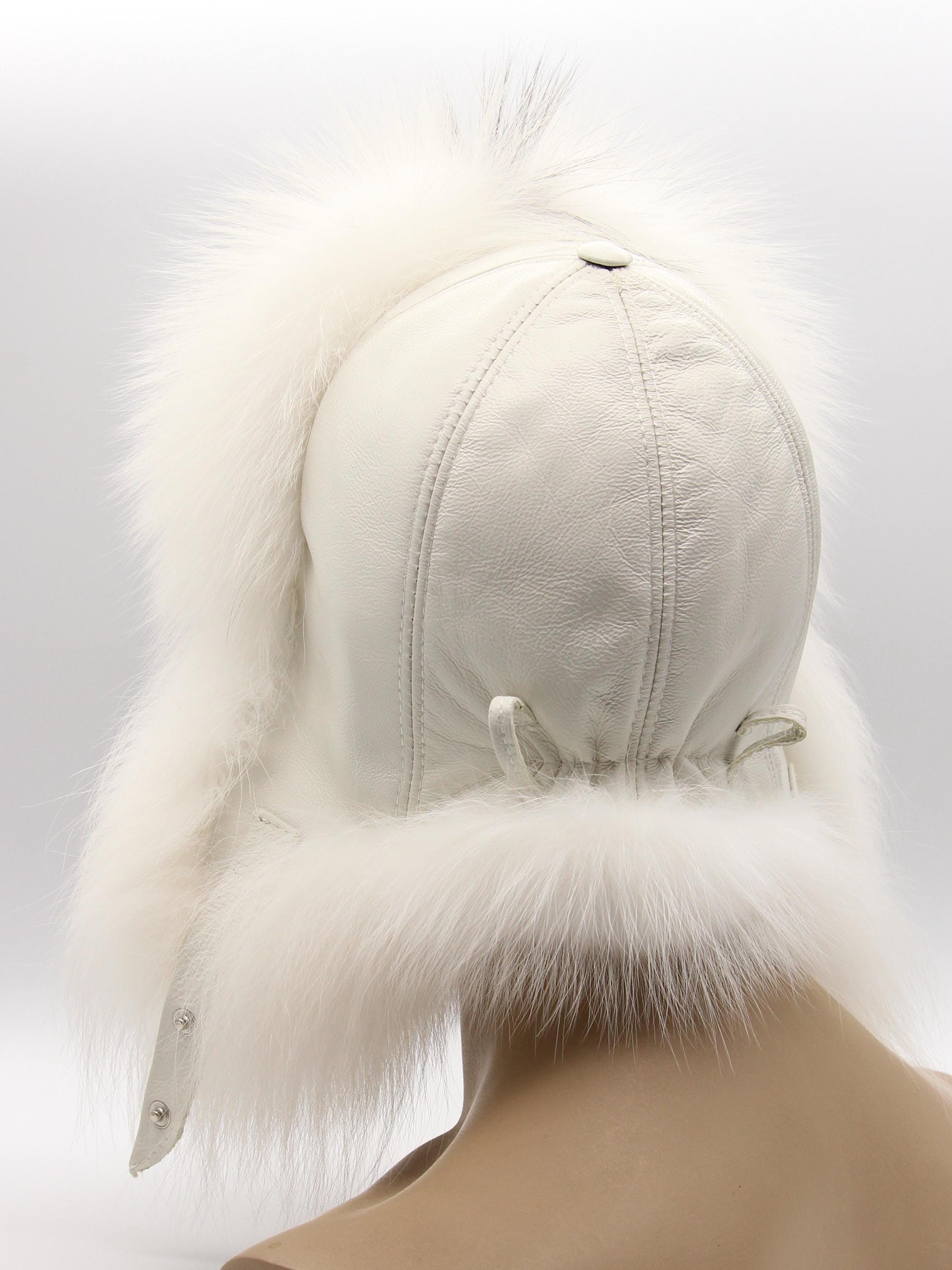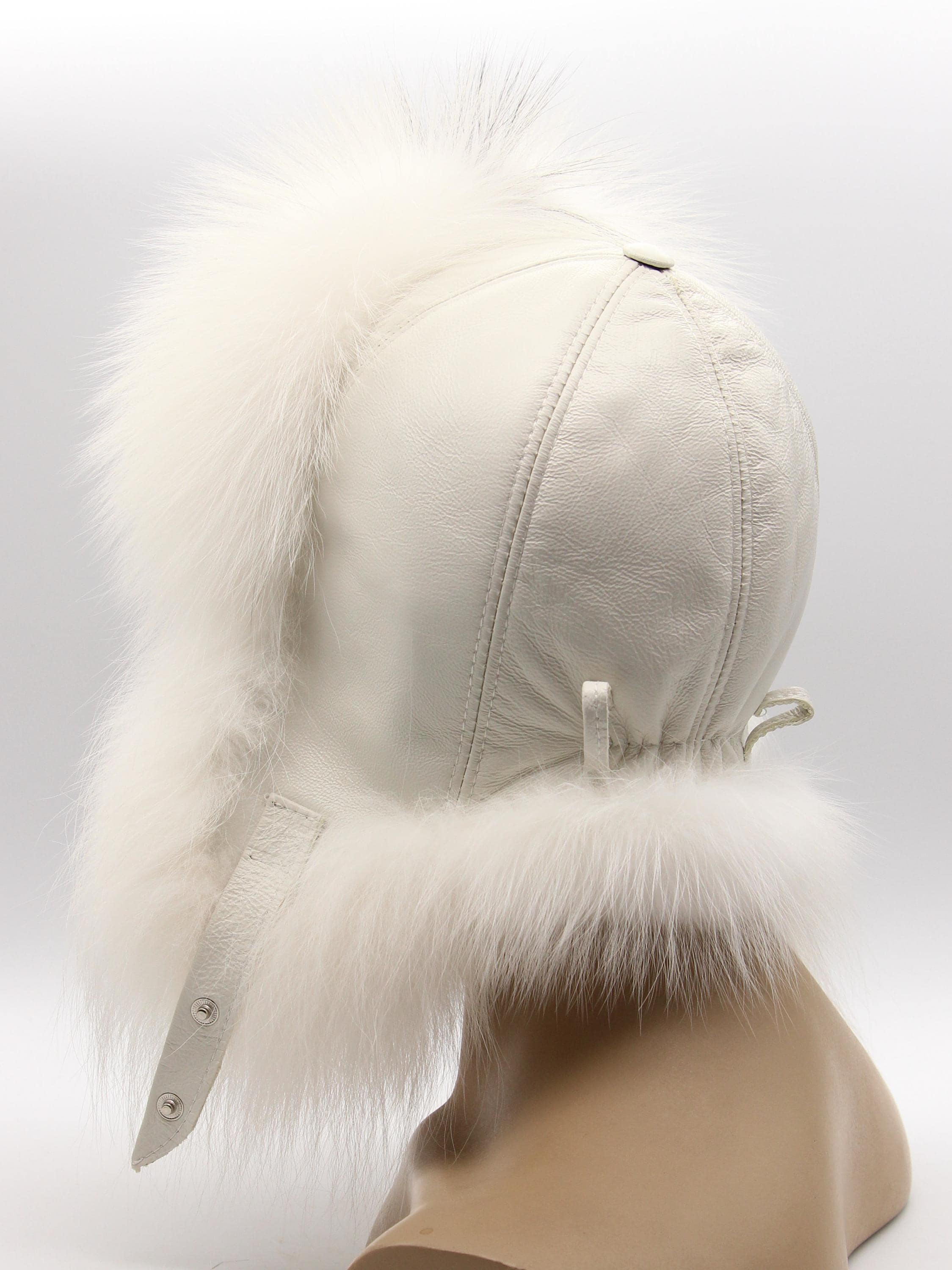 White leather ushanka with white fox fur trim. Bold monochromatic design mixing sleek white leather with genuine white fox creating striking contemporary look that actually delivers warmth.