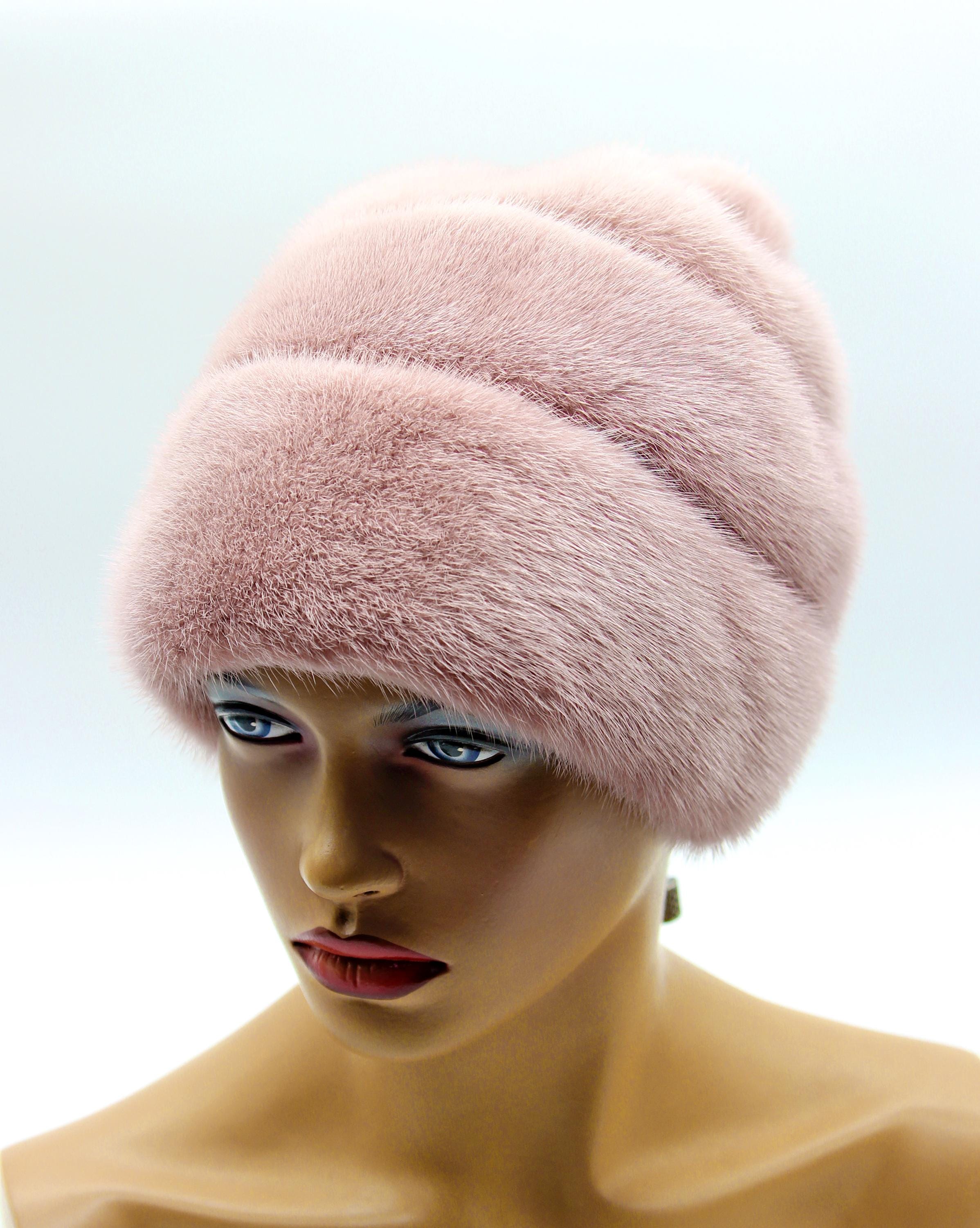 Powder pink mink hat with suede strips - yeah, it's different from what you usually see. Been making these in Ukraine for years now, learned from my uncle who's been at it since forever. The pink works surprisingly well, not too girly but definitely feminine. Got thick mink sections alternating with thin leather bands creating this texture thing people seem to notice.