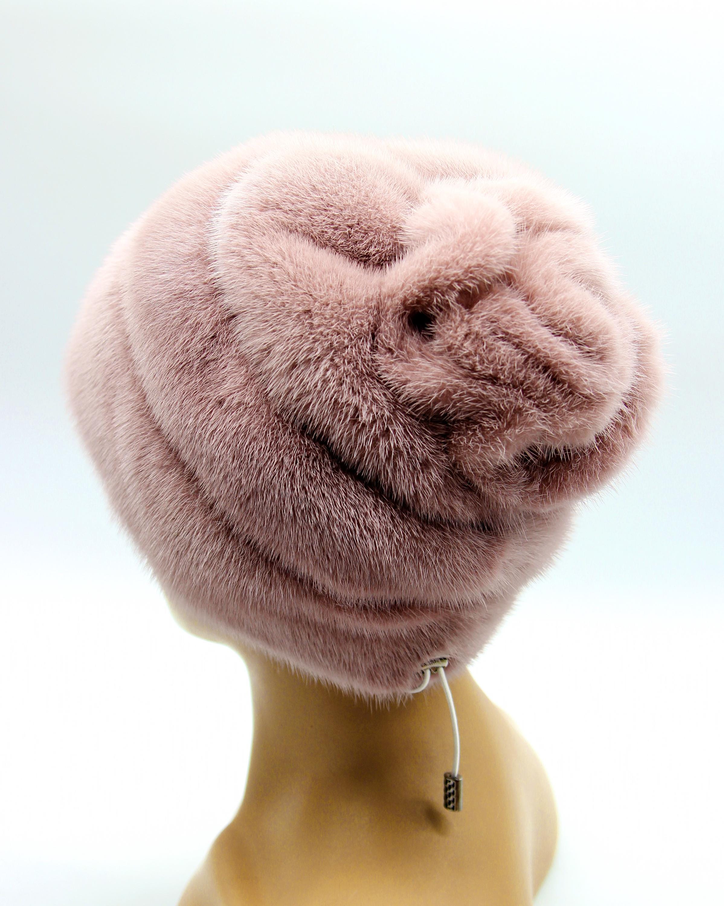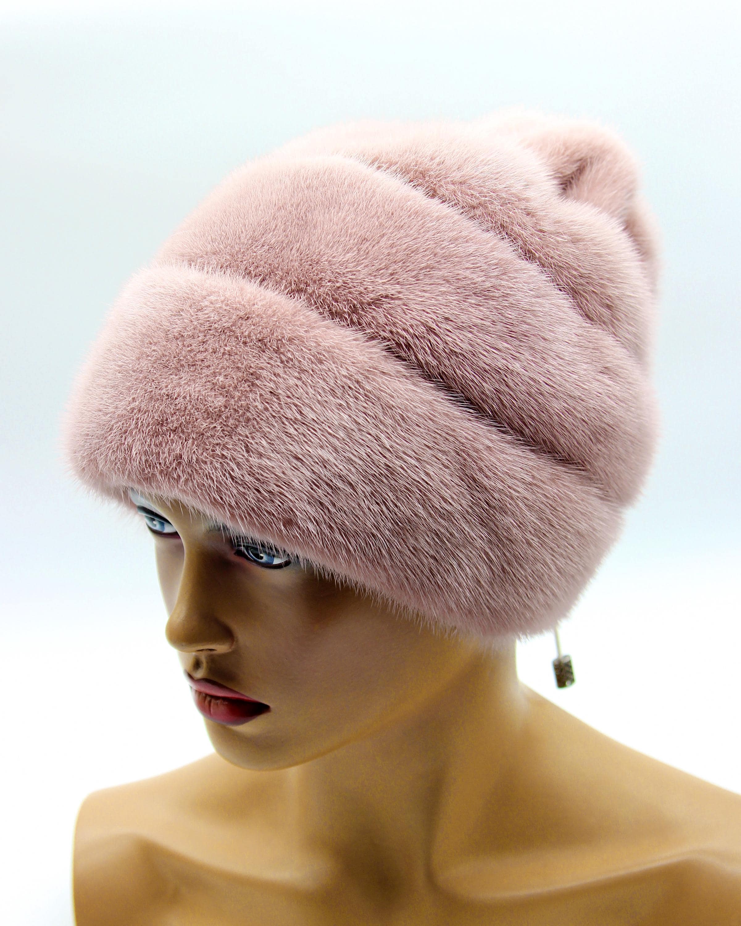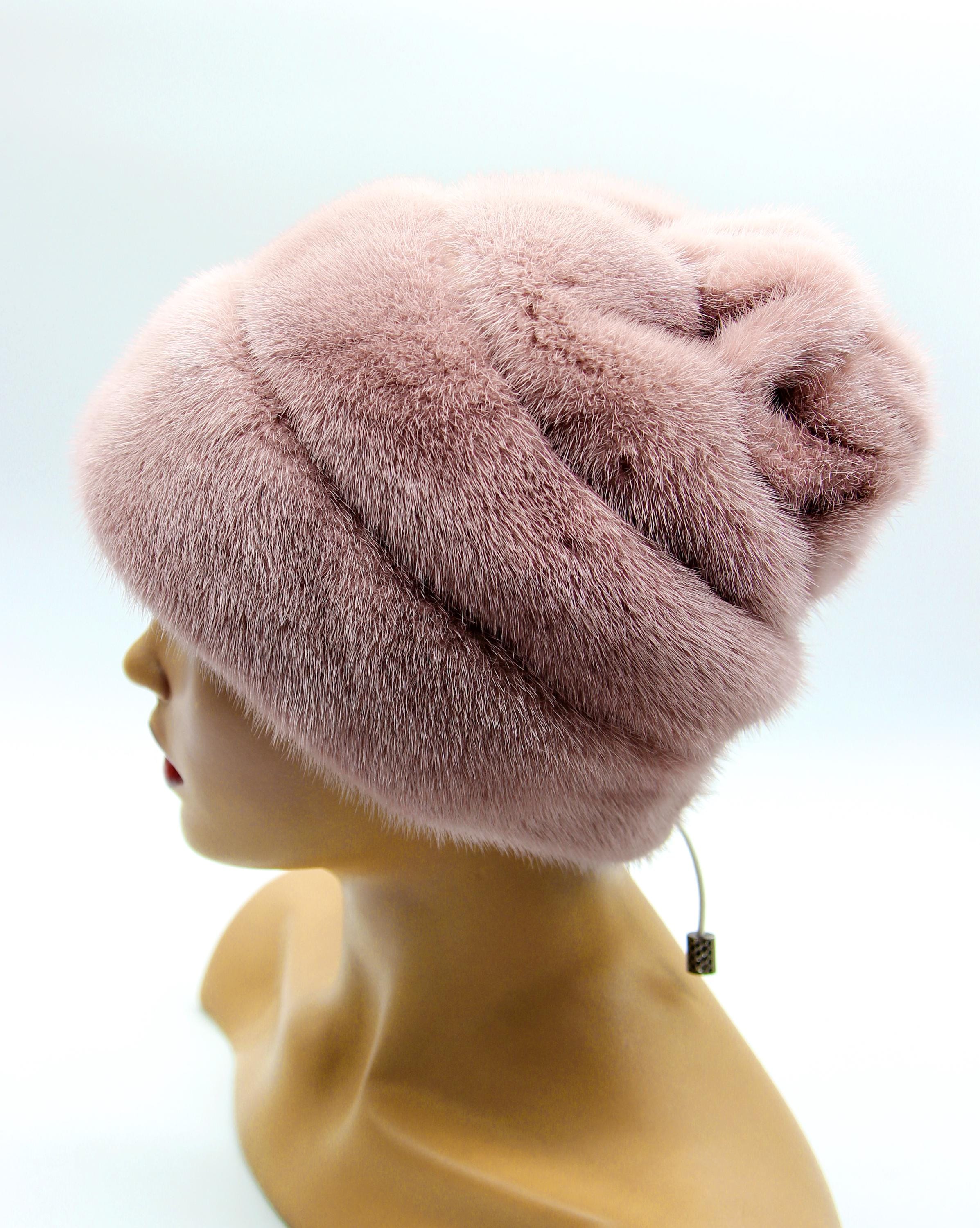 Powder Pink Mink Fur Hat Women Winter with Suede Stripes - Handmade Luxury Warm Headwear Rose Back