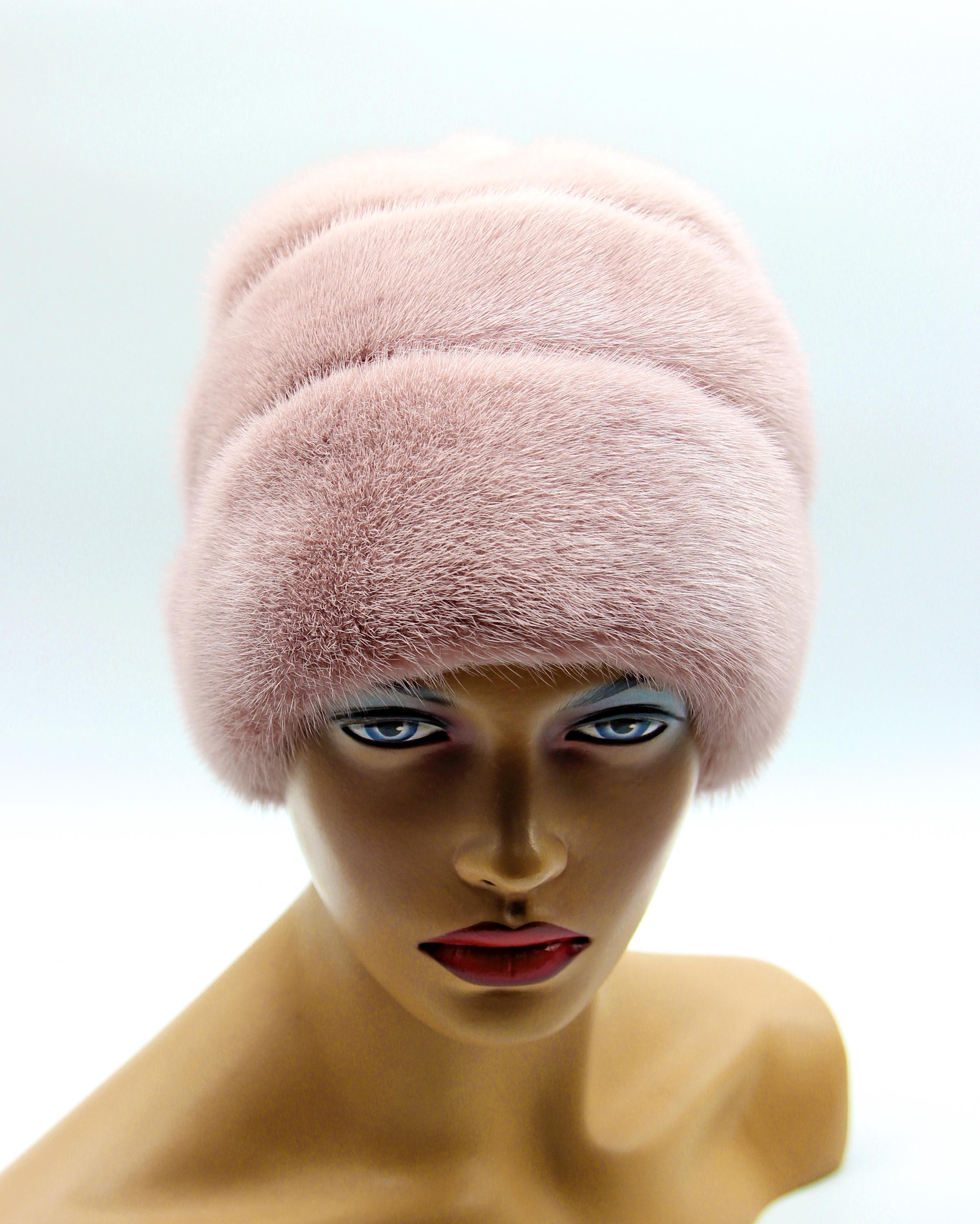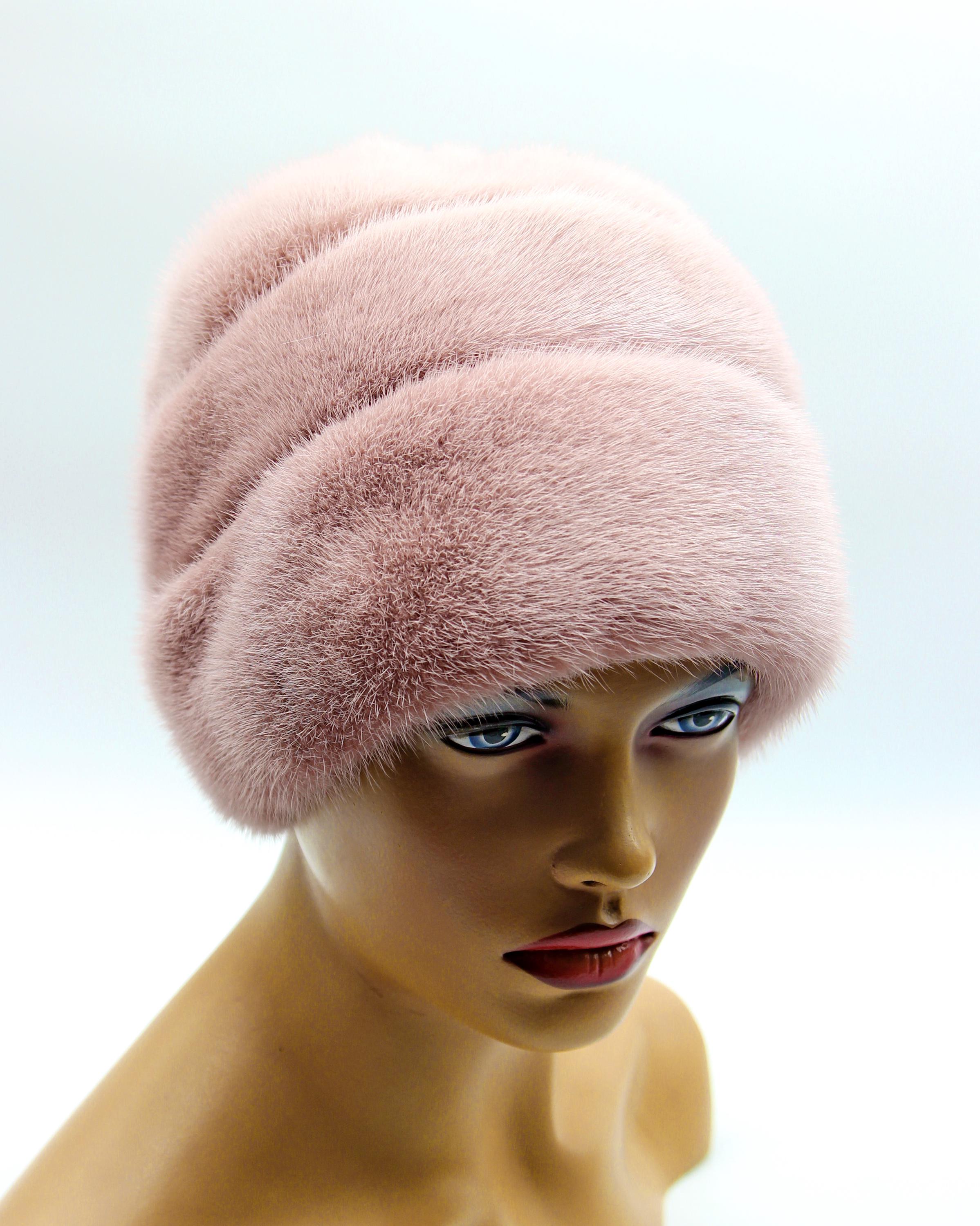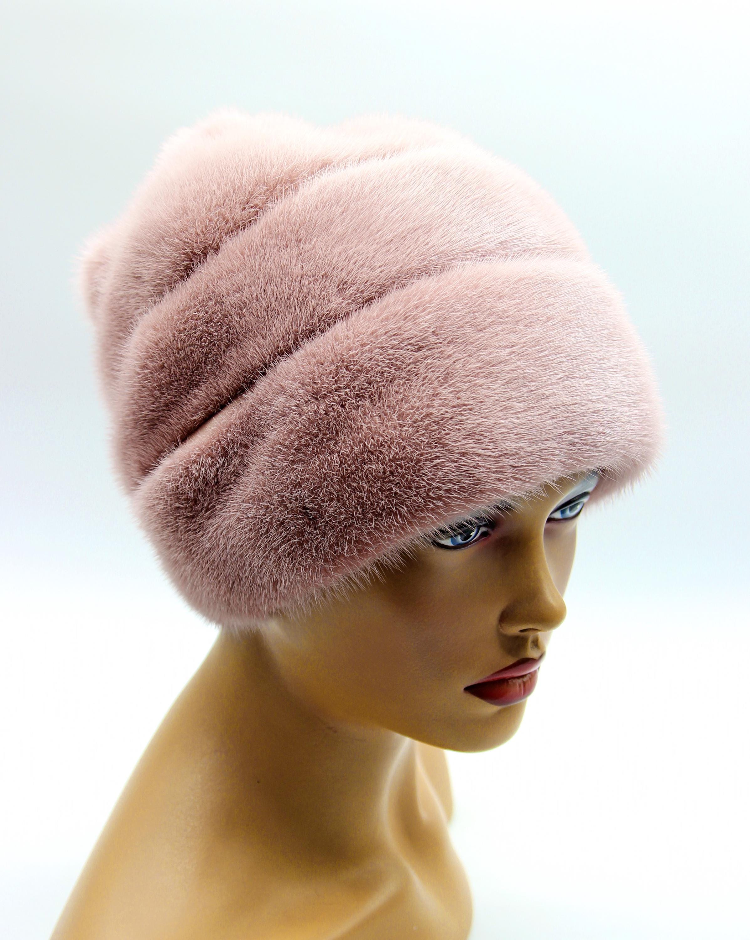 Powder Pink Mink Fur Hat Women Winter with Suede Stripes - Handmade Luxury Warm Headwear Rose Back