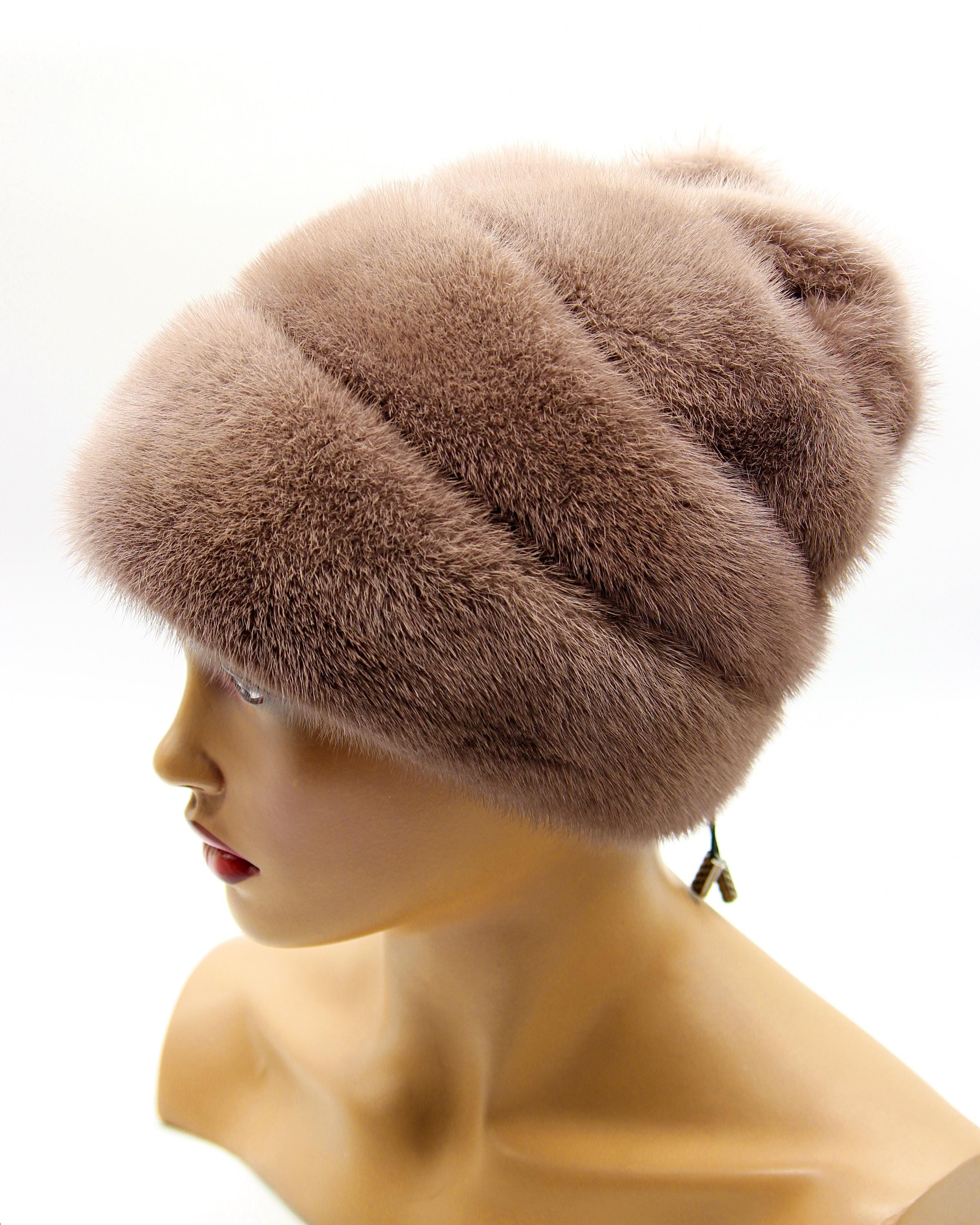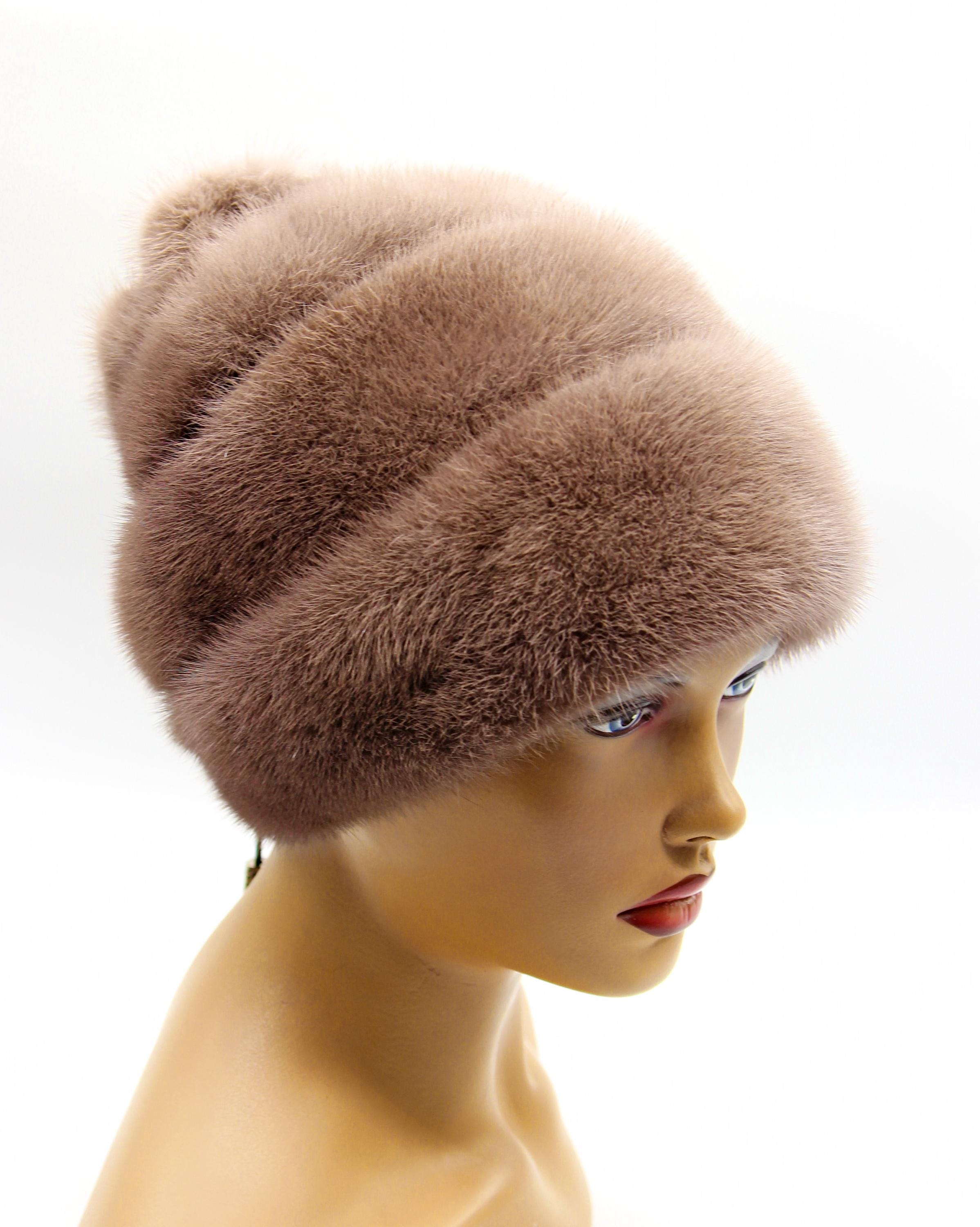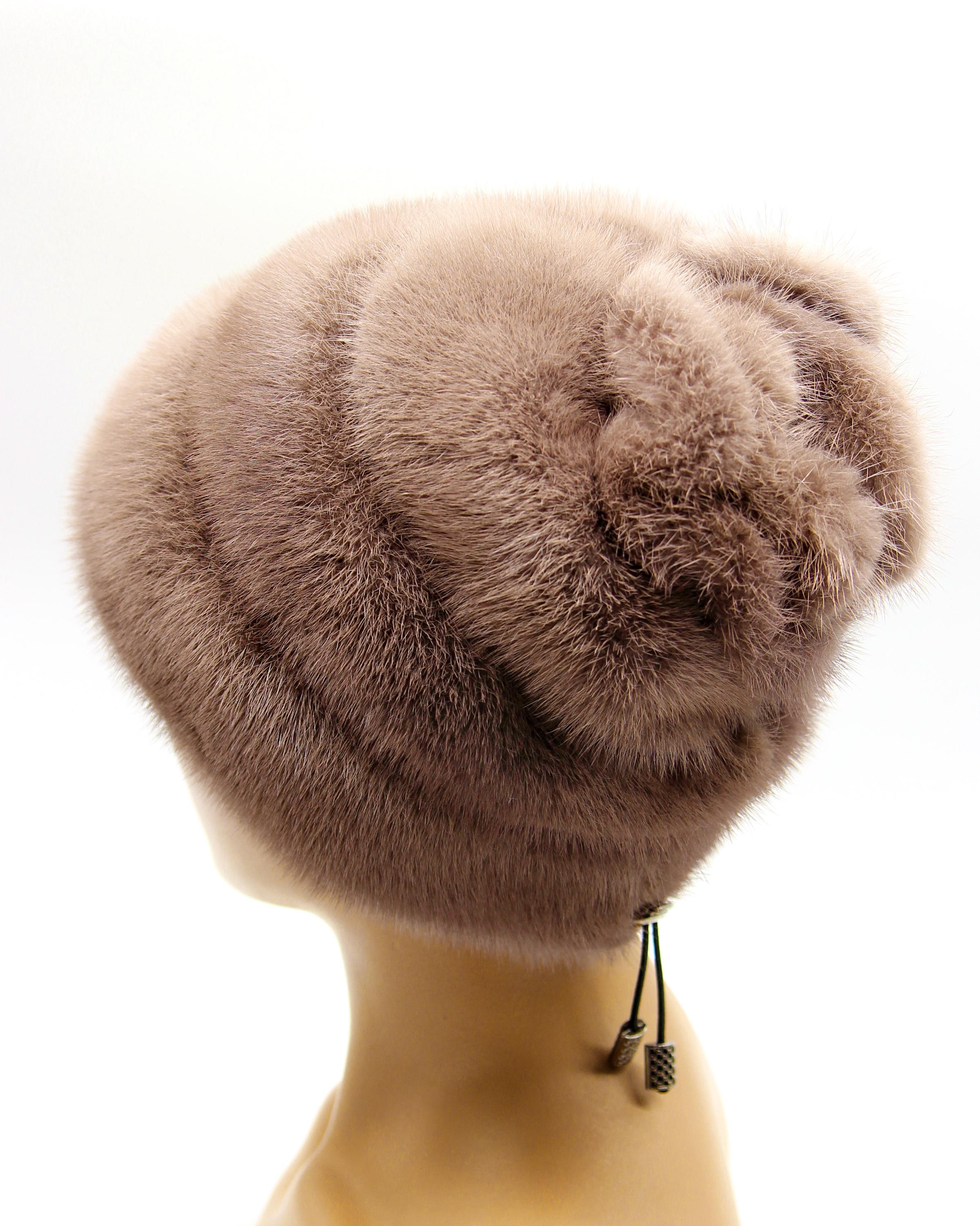 Cocoa Brown Mink Fur Hat Women Winter with Suede Stripes - Handmade Luxury Warm Headwear Rose Back