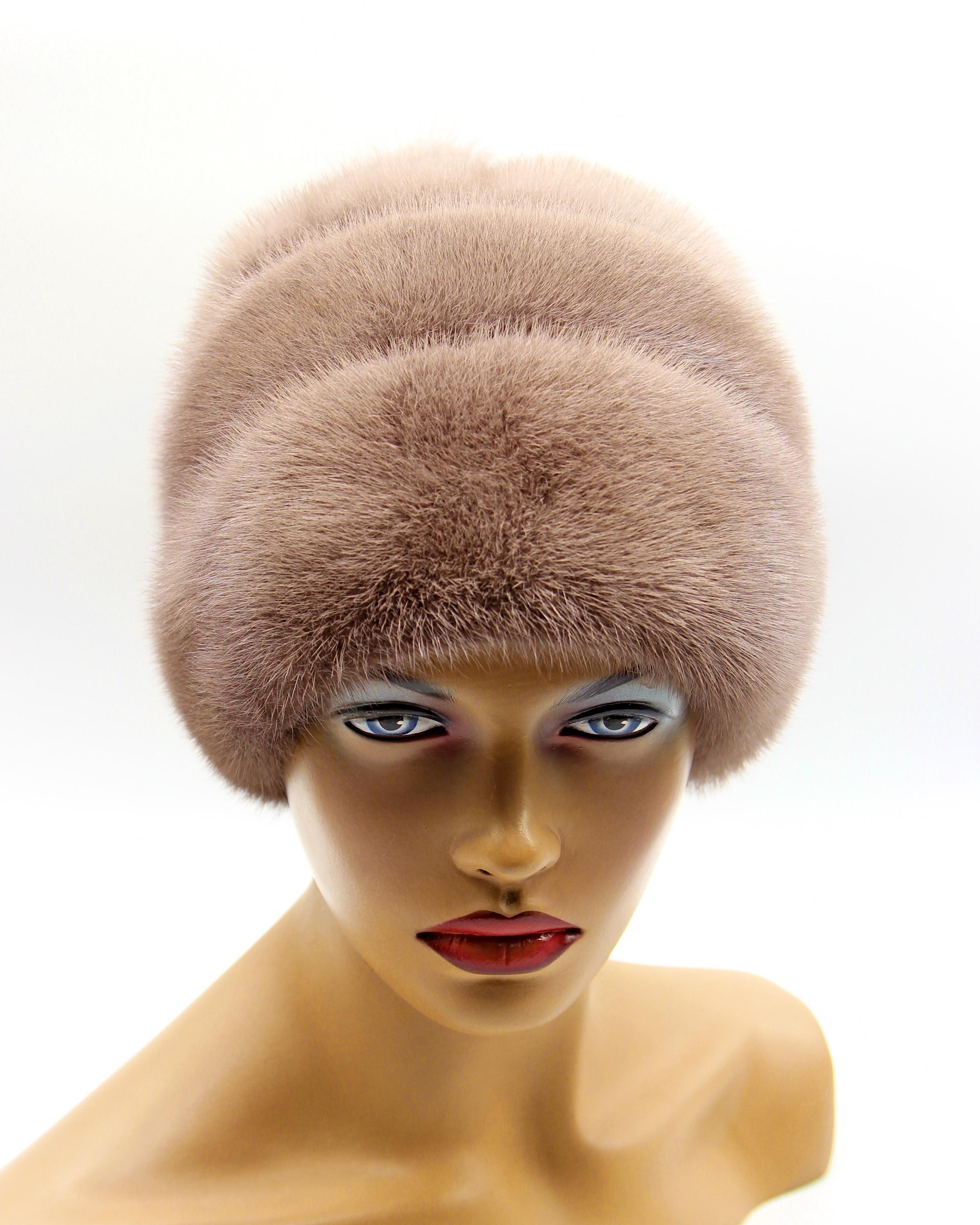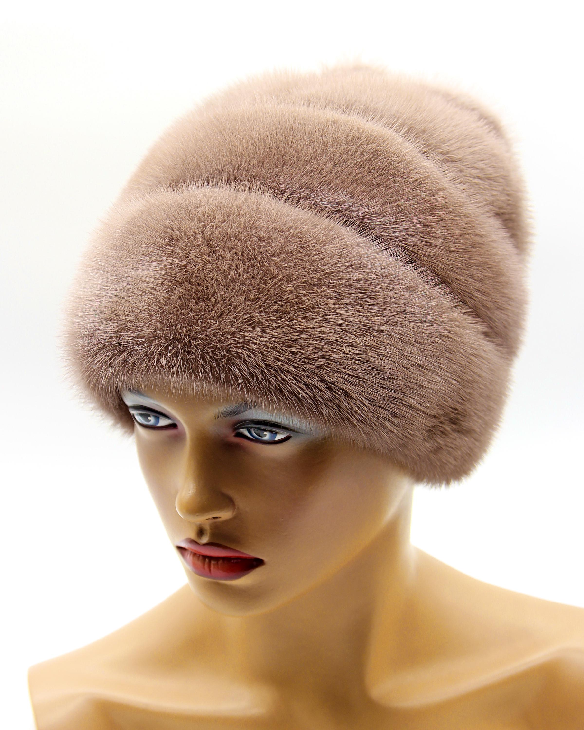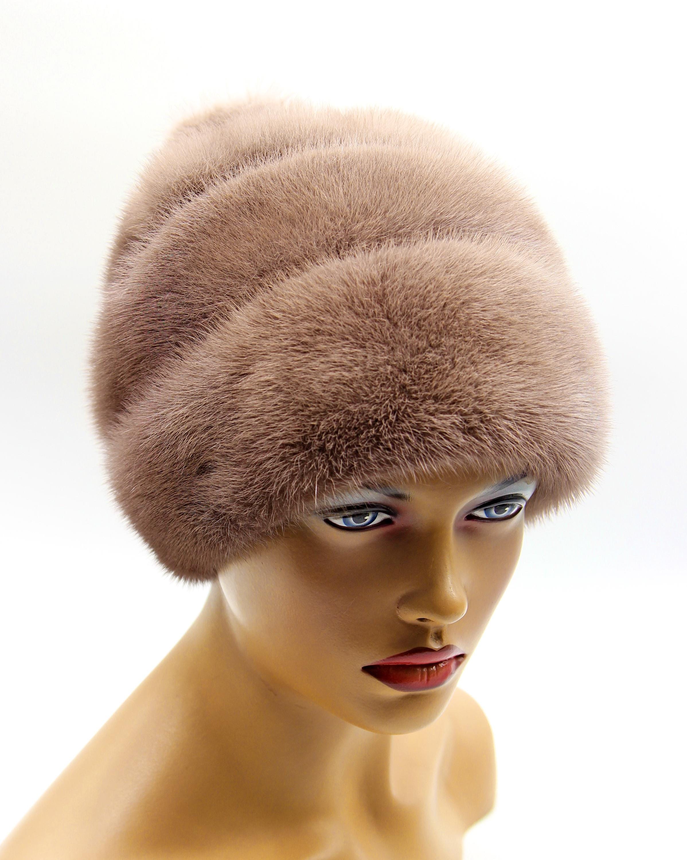 Cocoa Brown Mink Fur Hat Women Winter with Suede Stripes - Handmade Luxury Warm Headwear Rose Back