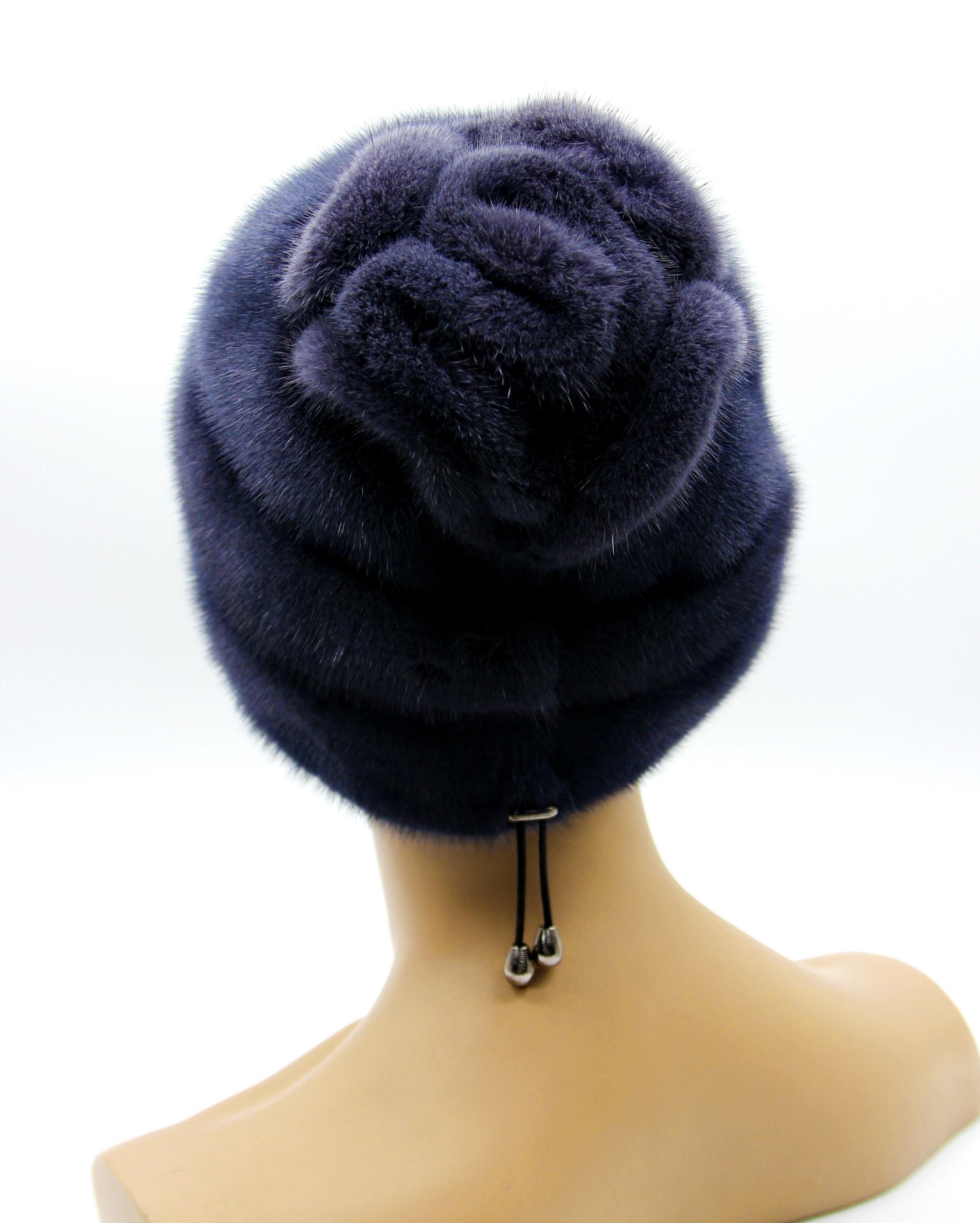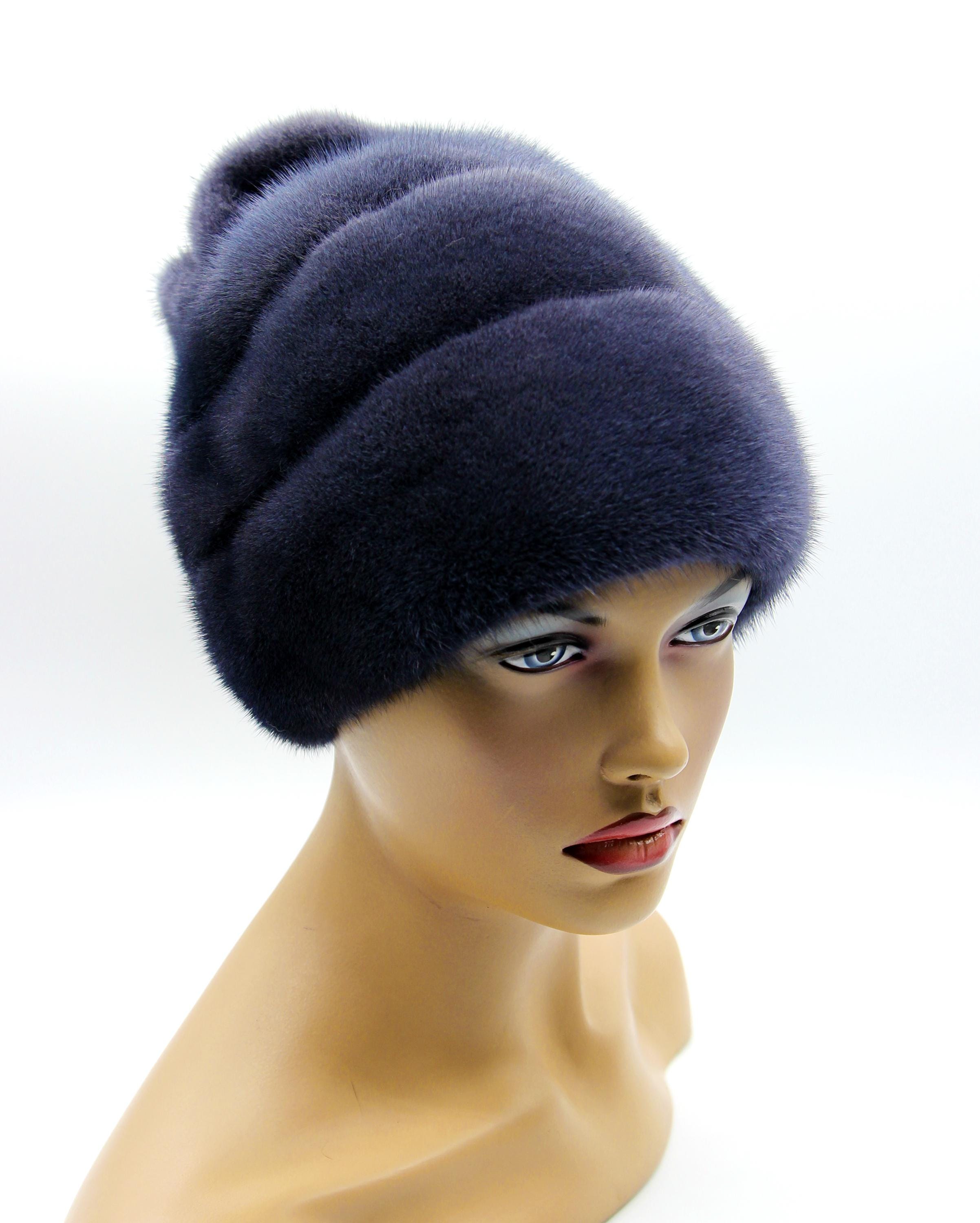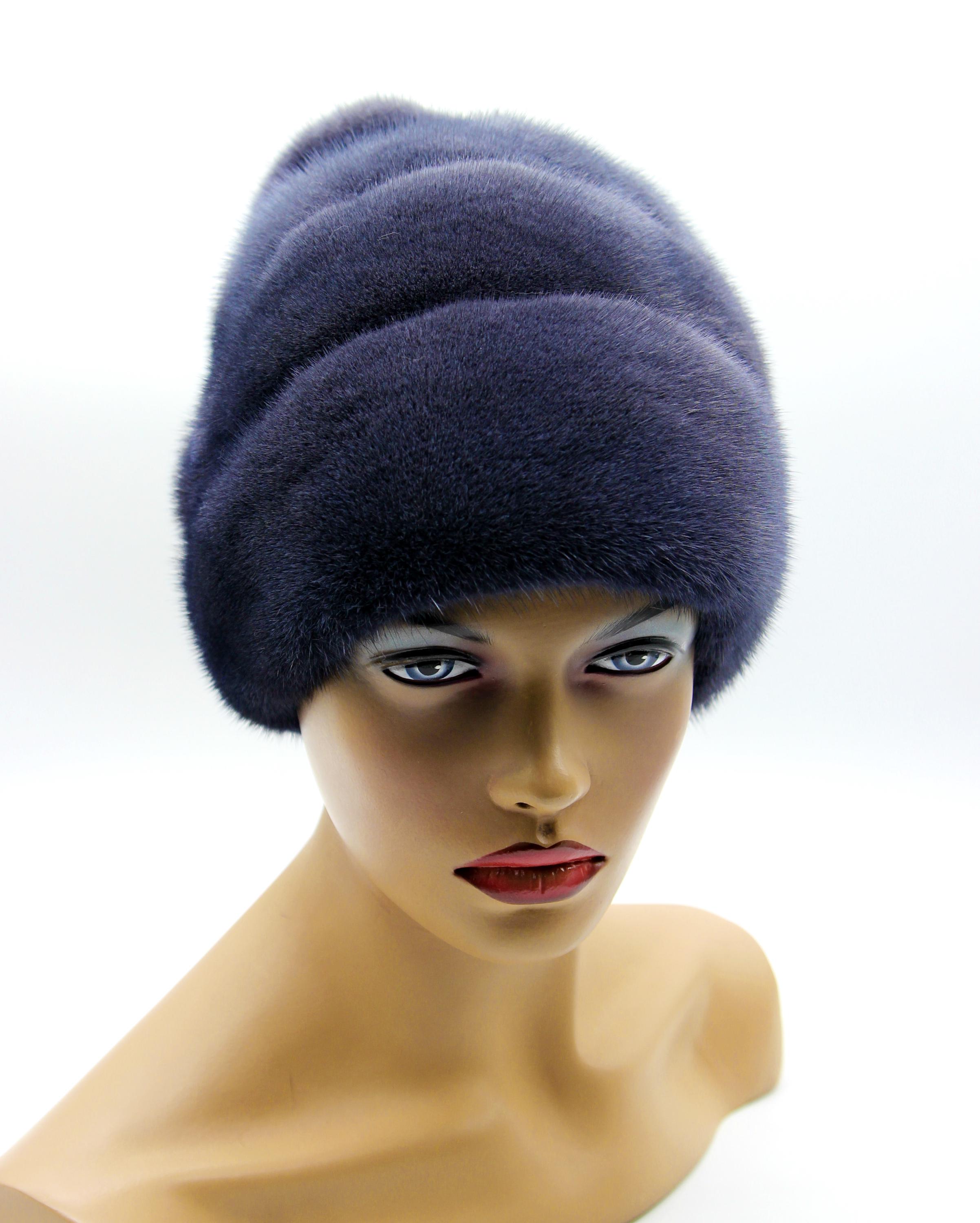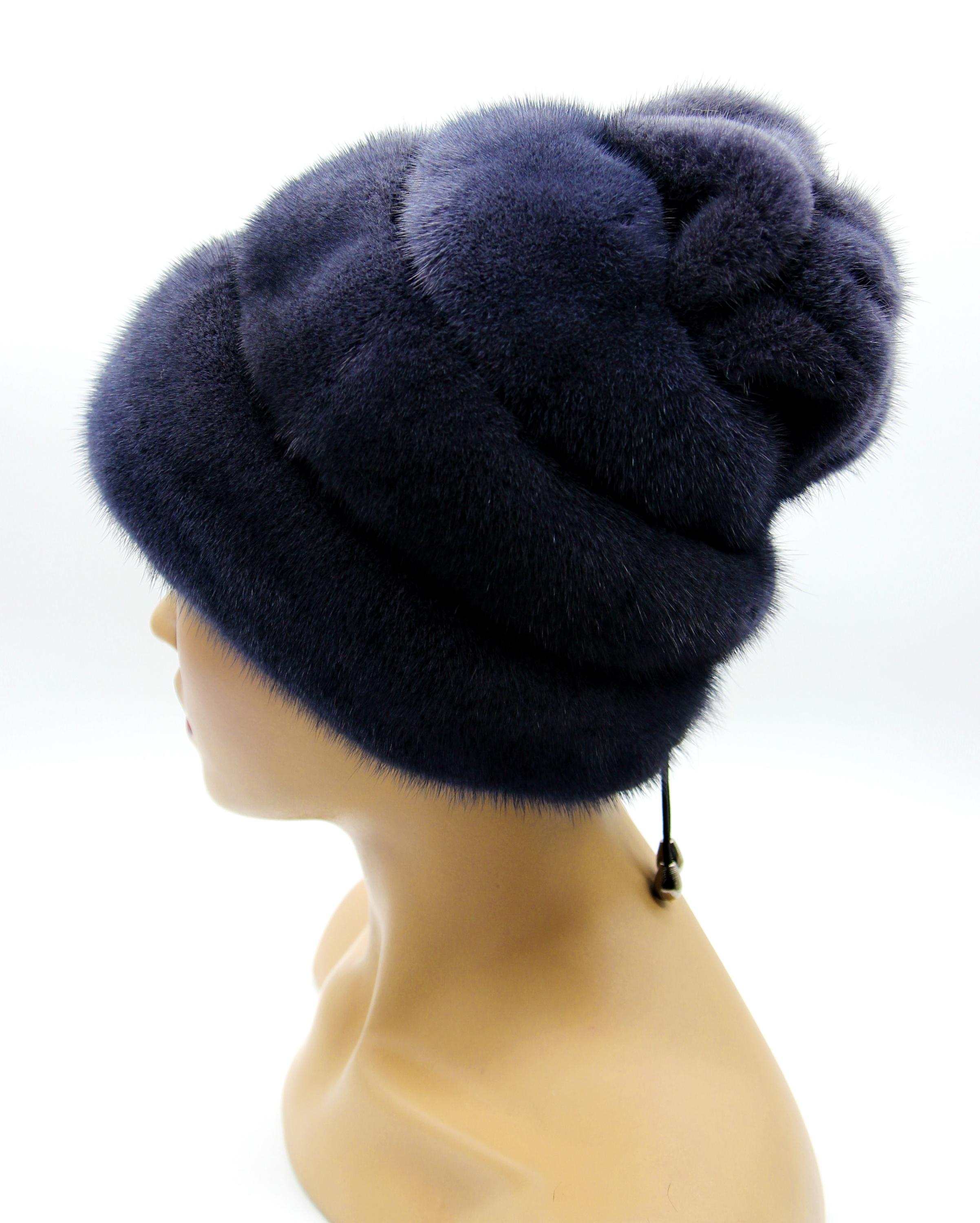 Graphite Blue Grey Mink Fur Hat Women Winter with Suede Stripes - Handmade Luxury Warm Headwear Rose Back