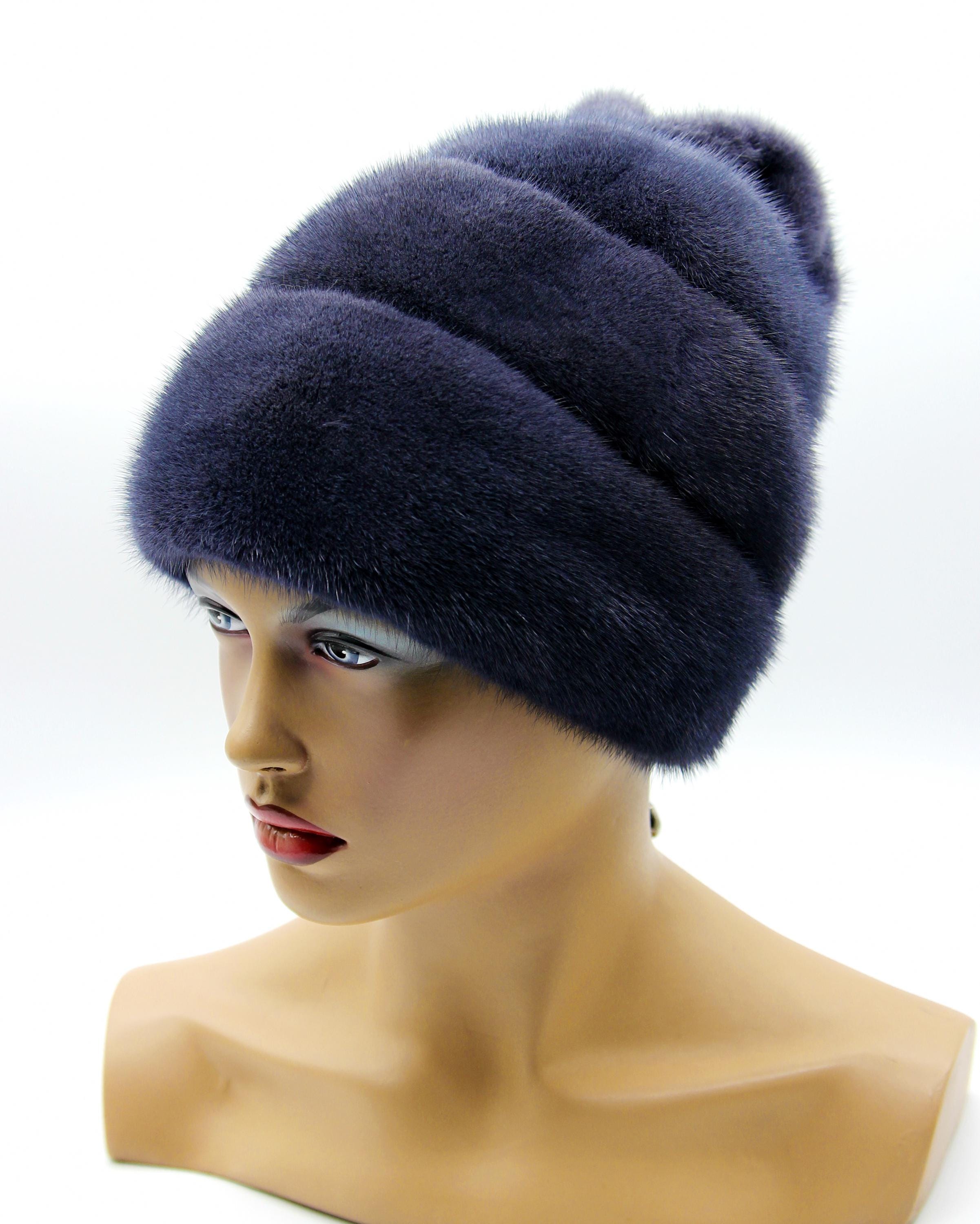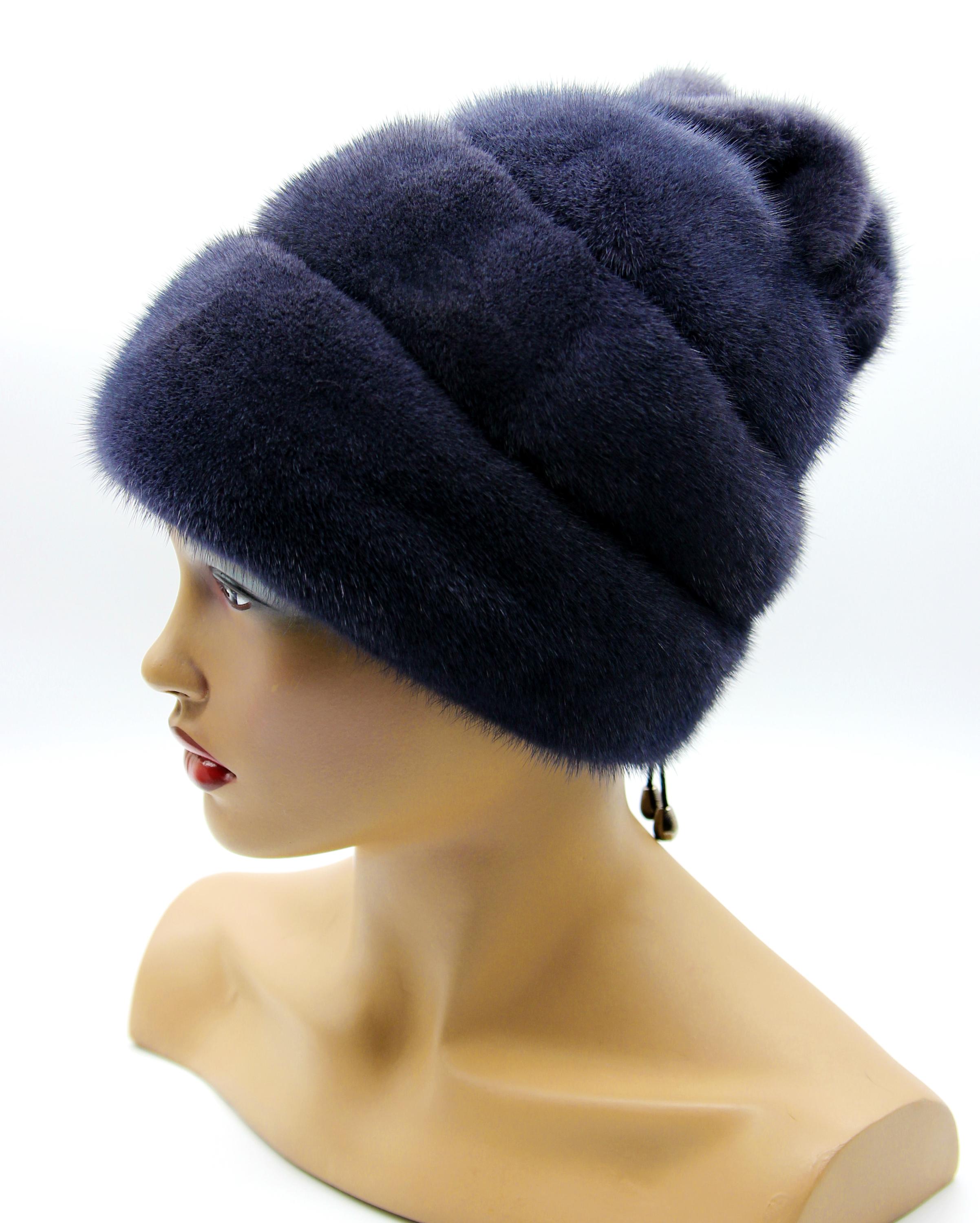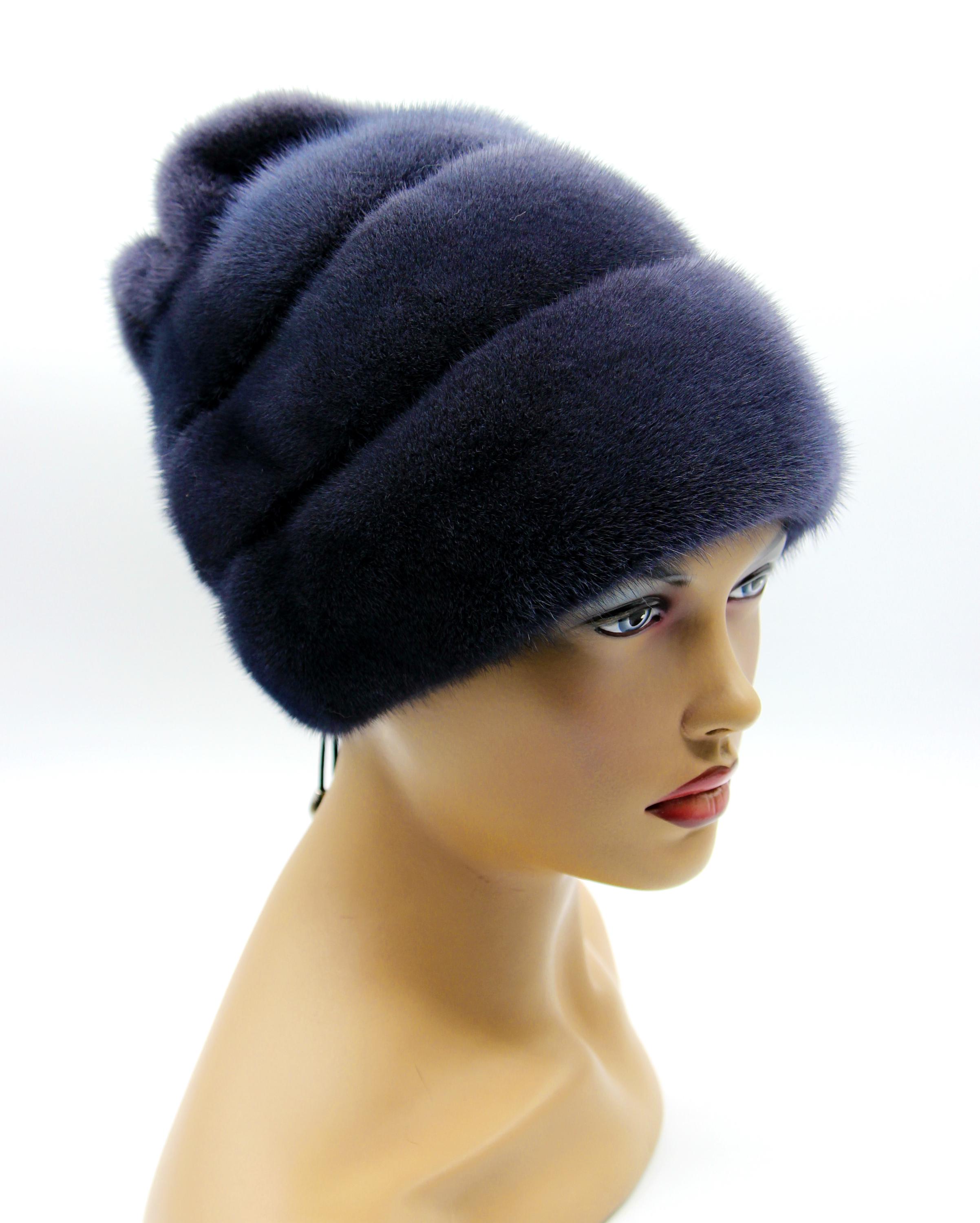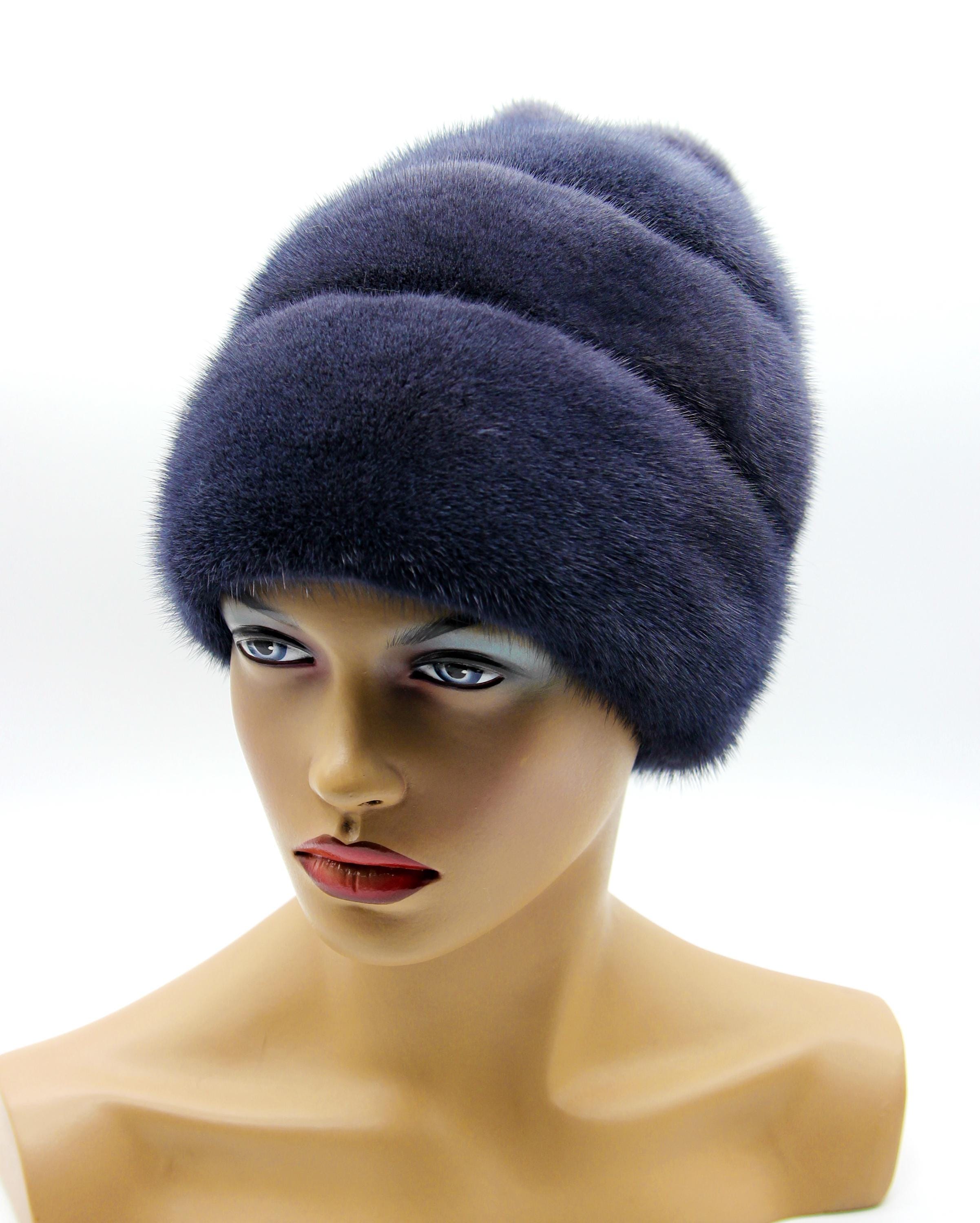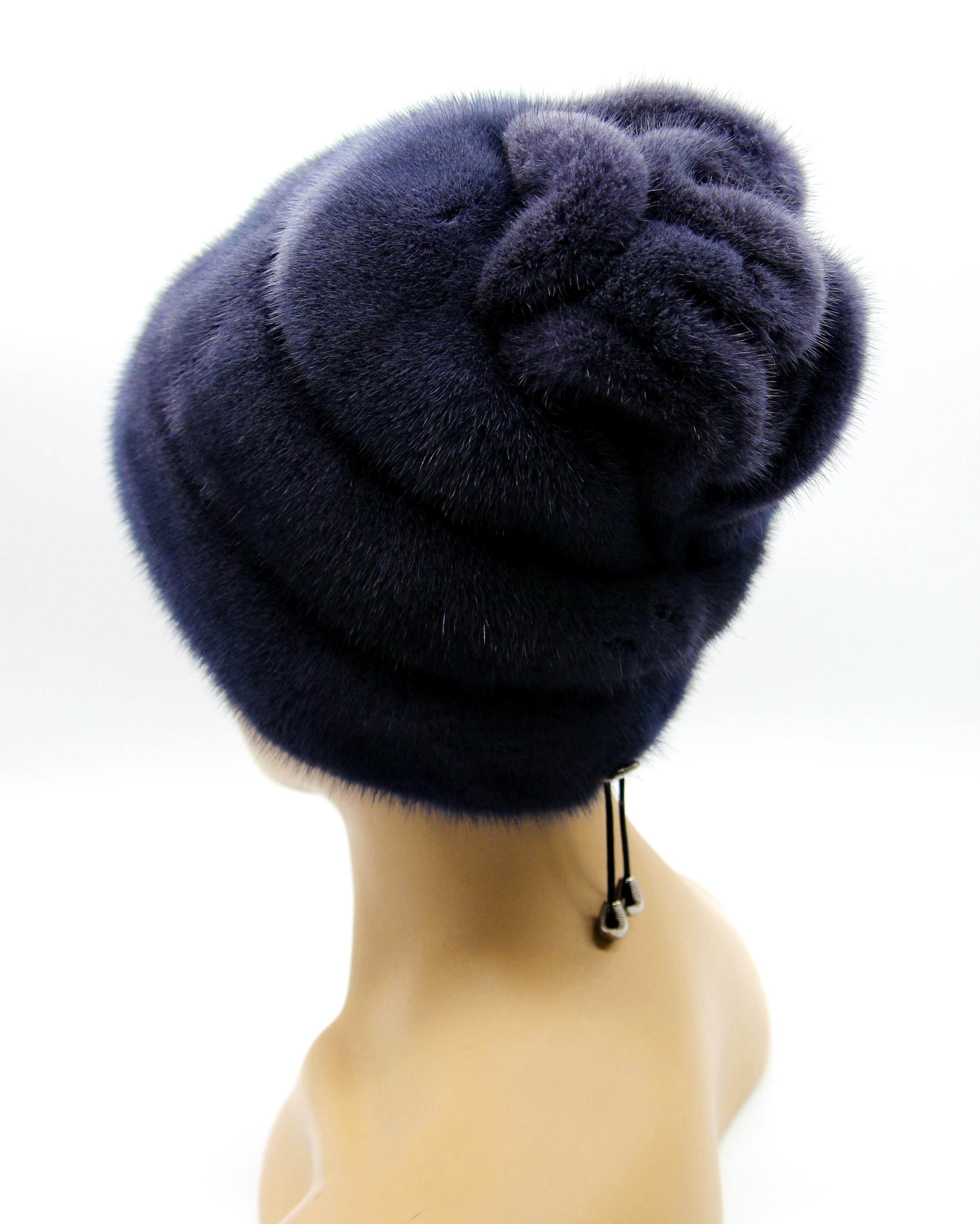 Graphite Blue Grey Mink Fur Hat Women Winter with Suede Stripes - Handmade Luxury Warm Headwear Rose Back