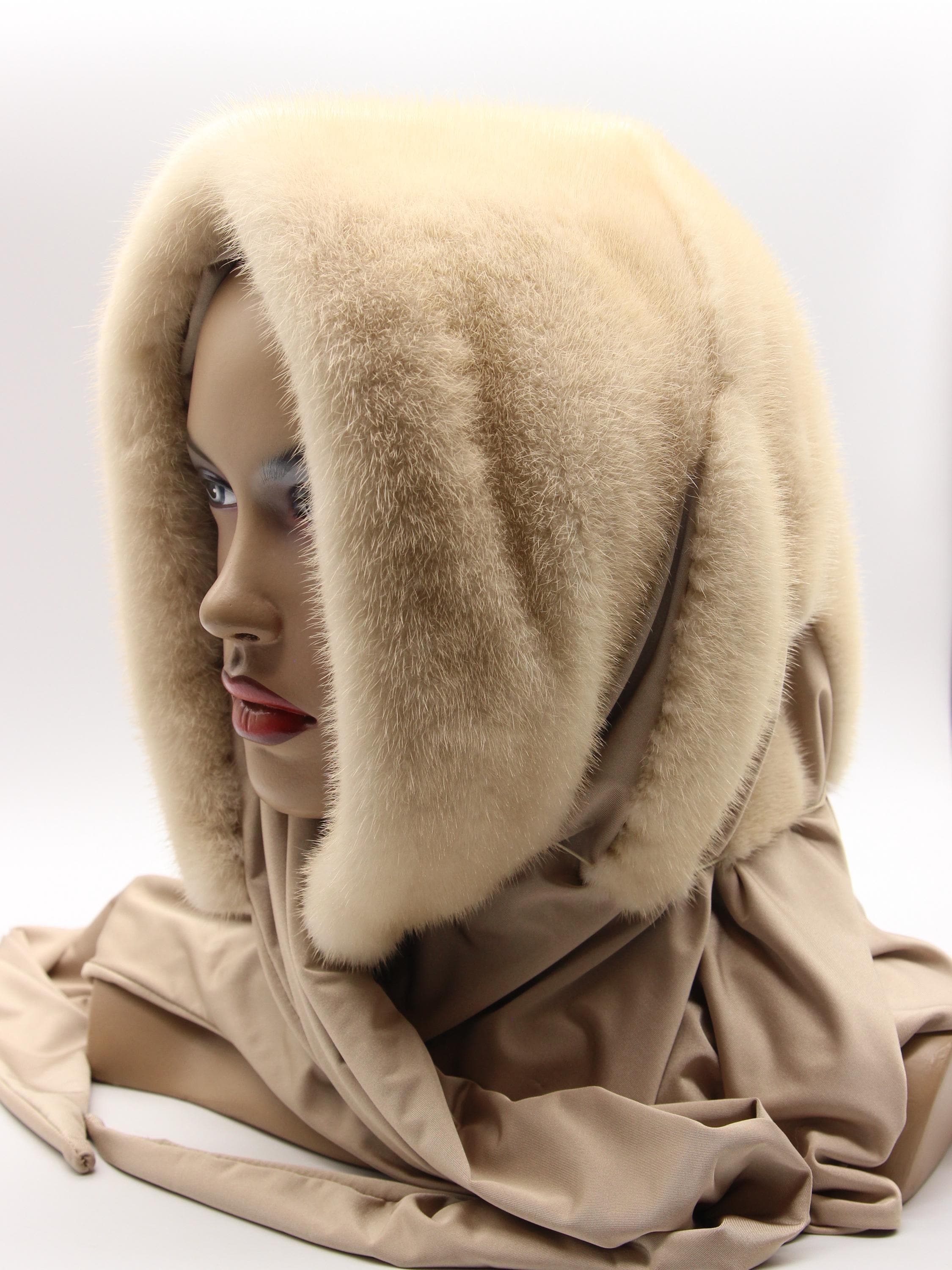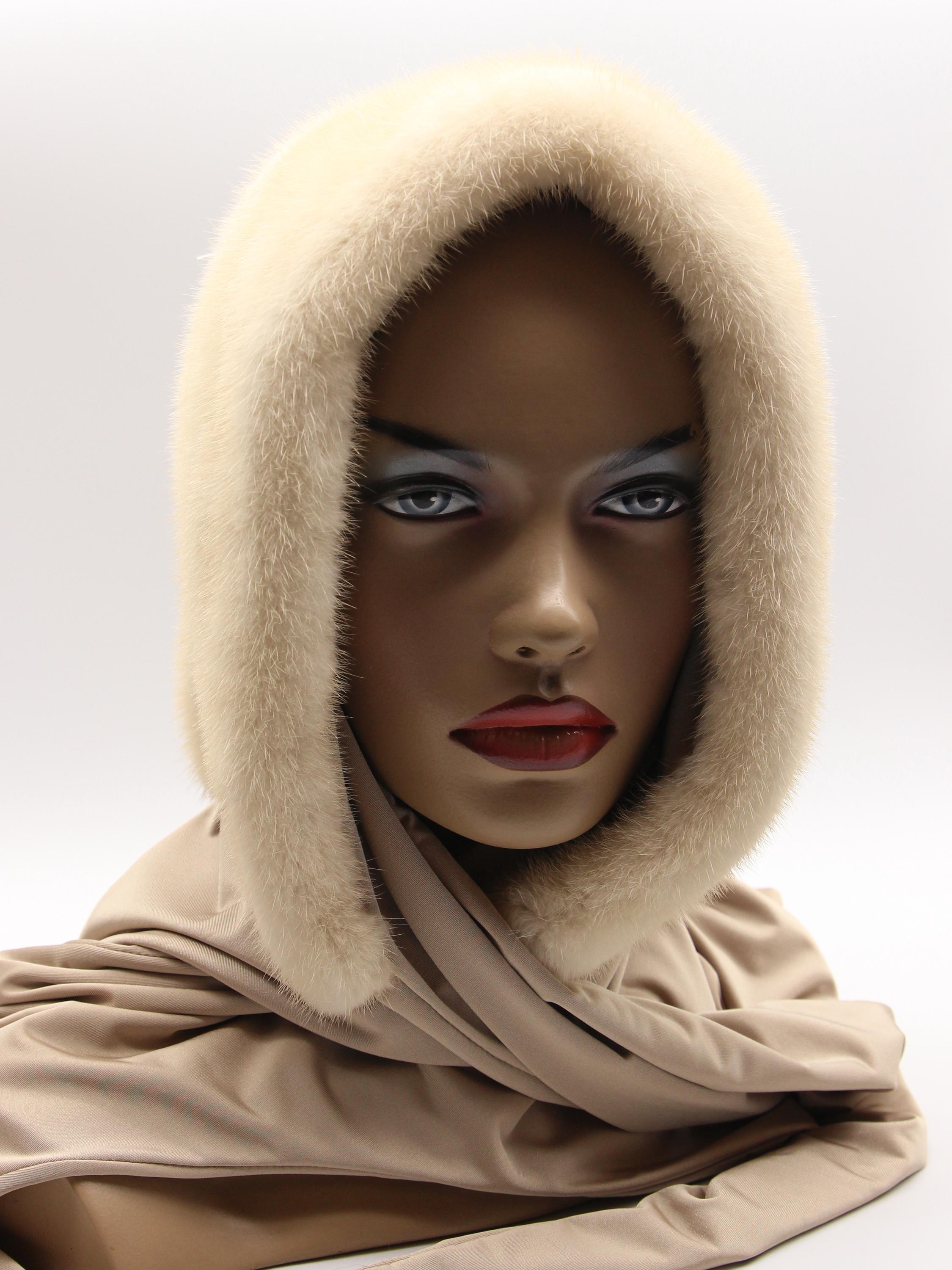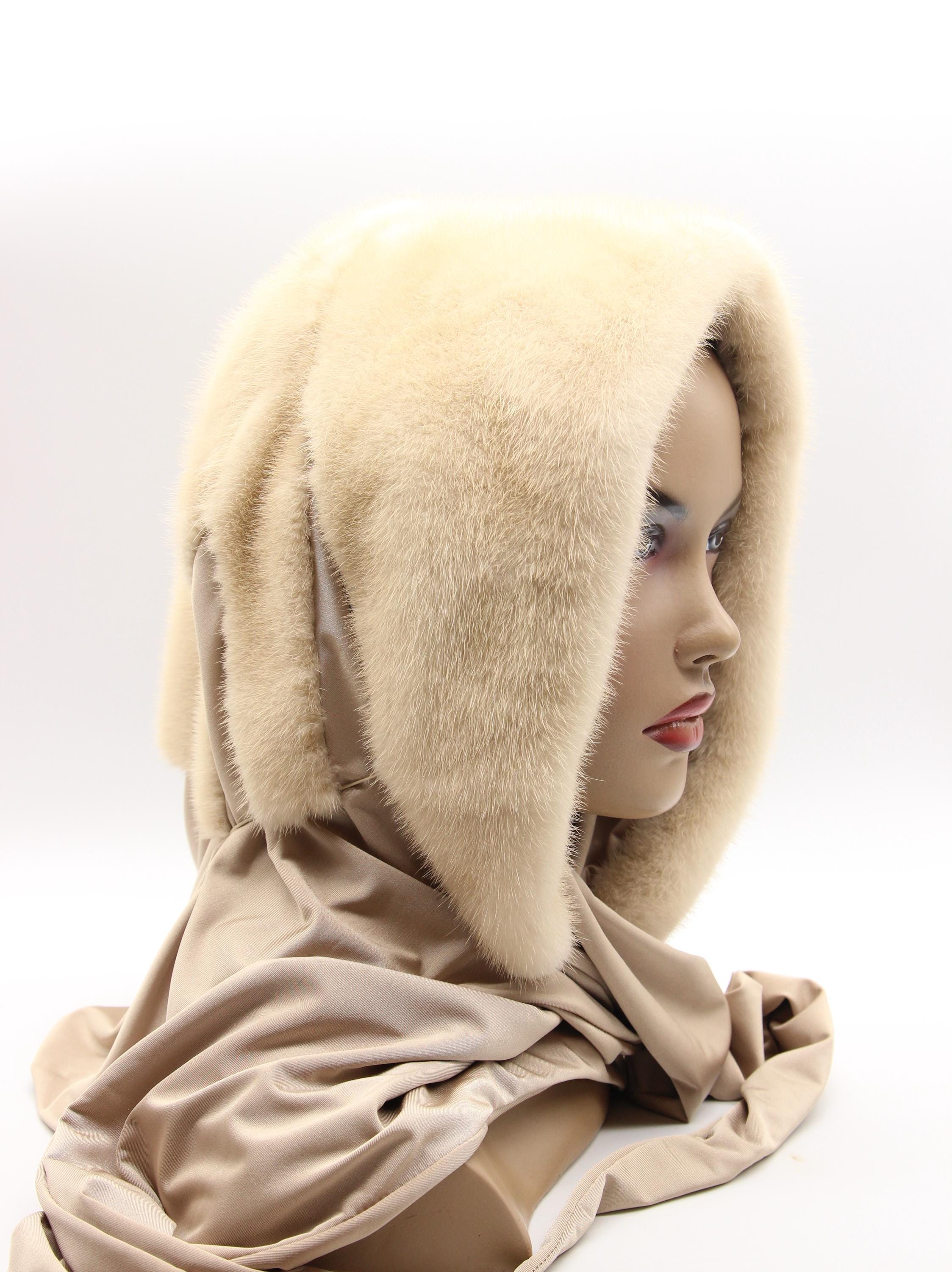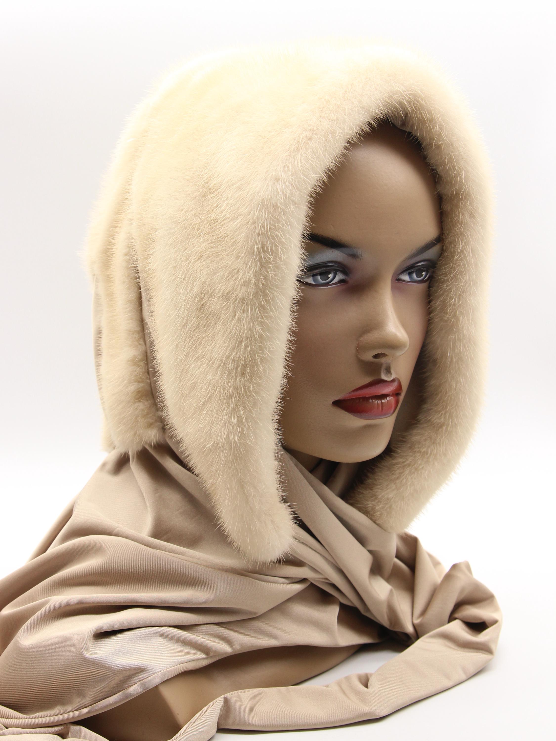 Pearl Beige Natural Mink Fur Hat Hooded Scarf - Undyed Cream Winter Wrap