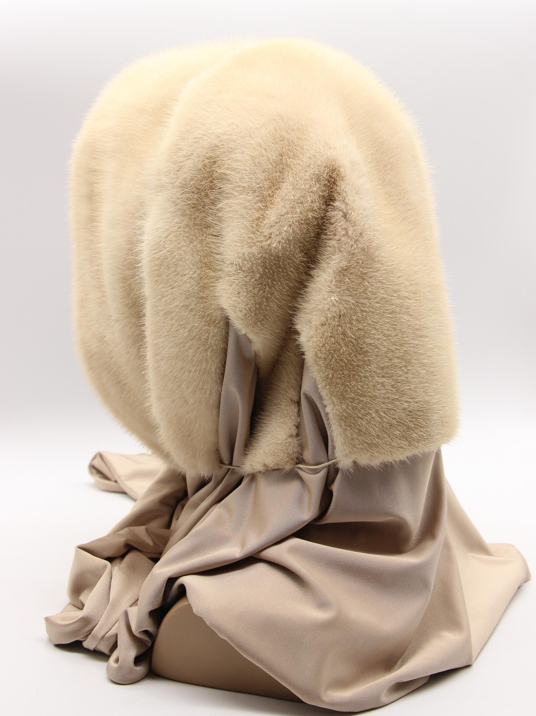 Pearl beige natural mink fur hat hooded scarf in warm cream shade - functions as winter head wrap, fur hat, cowl, or shawl. Natural undyed mink with pearl cream-beige tone, hand-stitched on jersey foundation. One size adapts through flexible draping without ties. Rare natural pearl color carrying warm luminous characteristics.