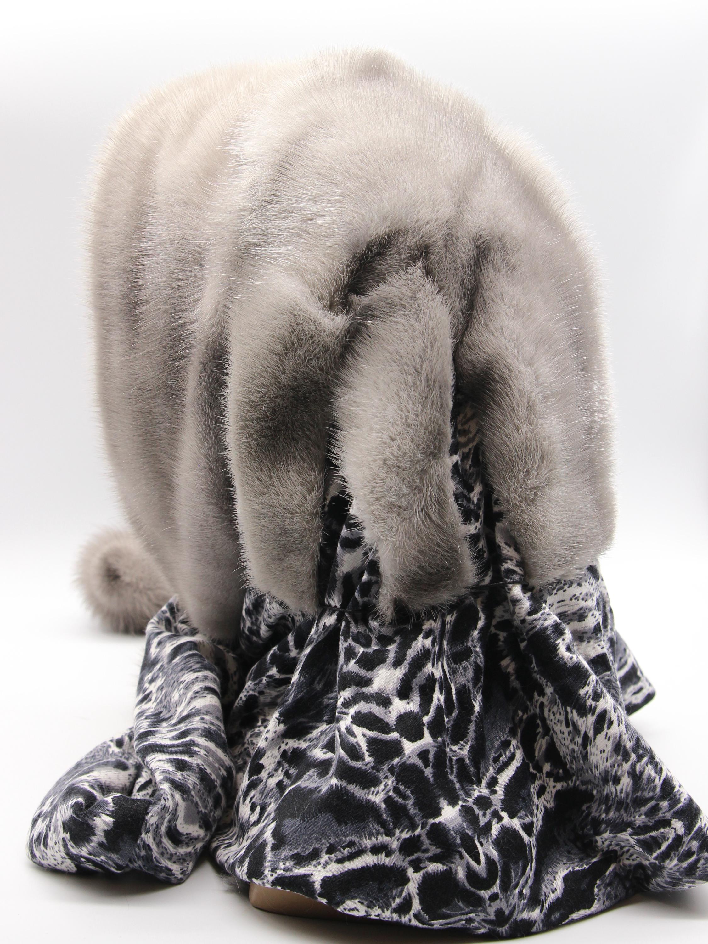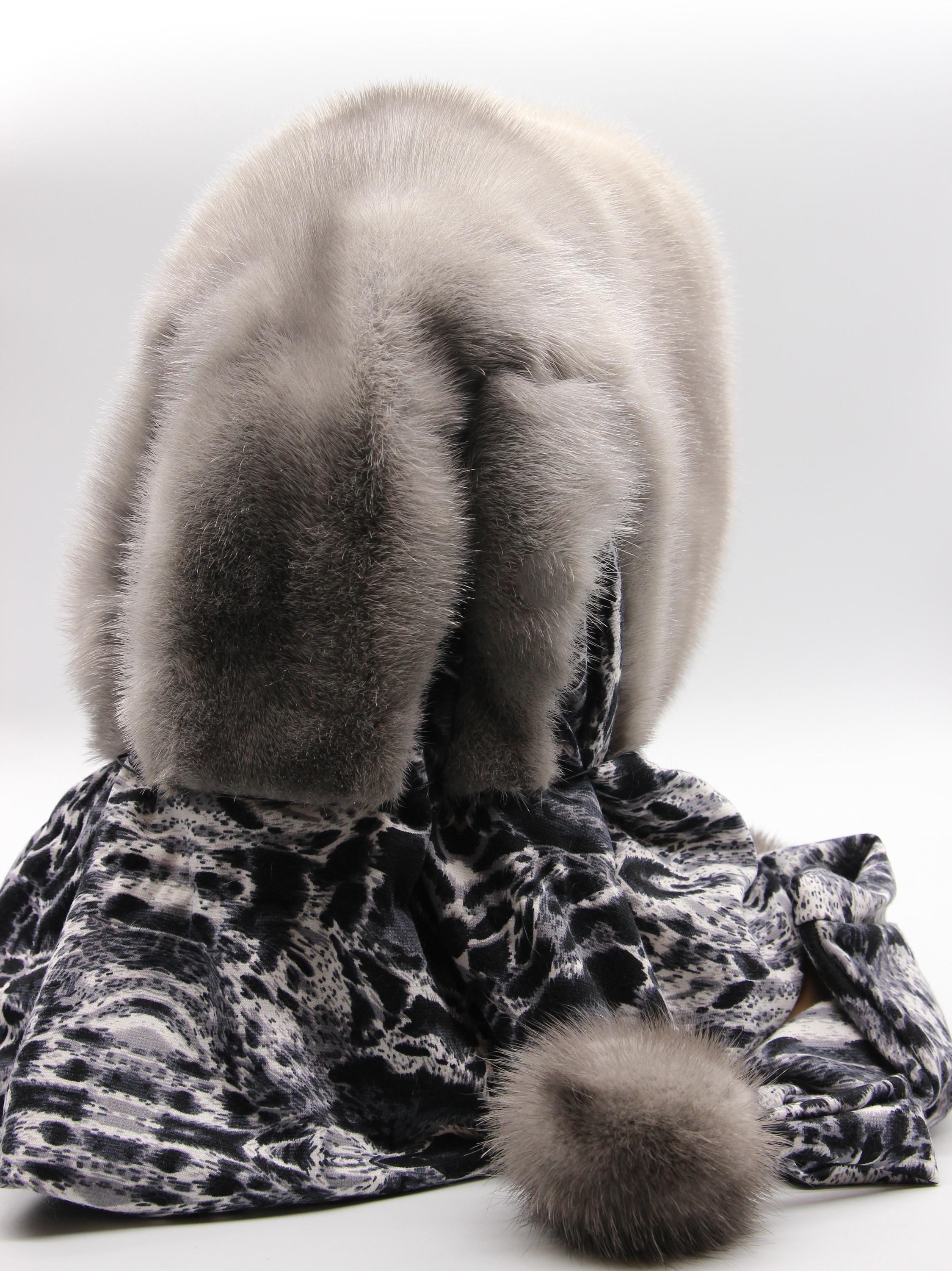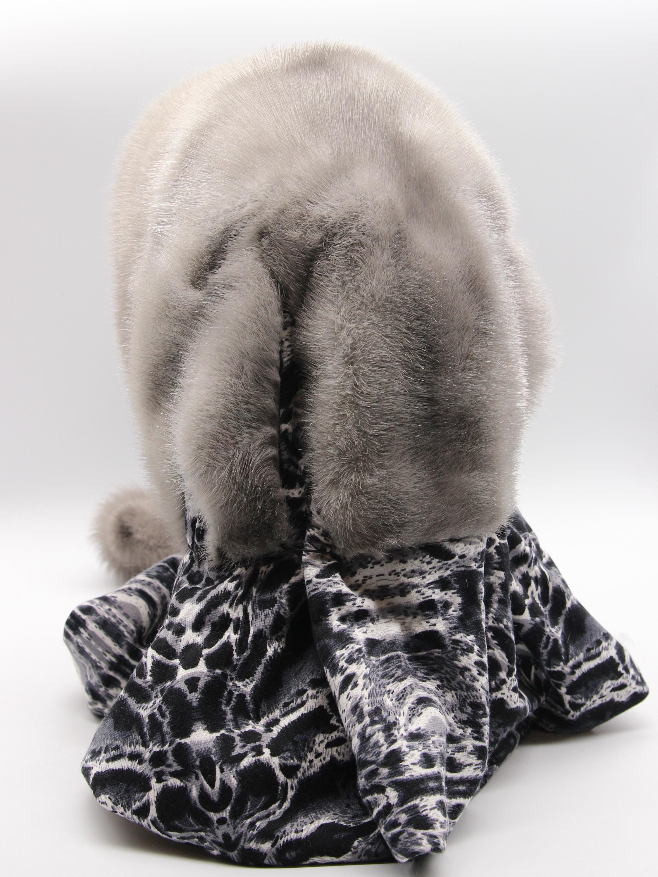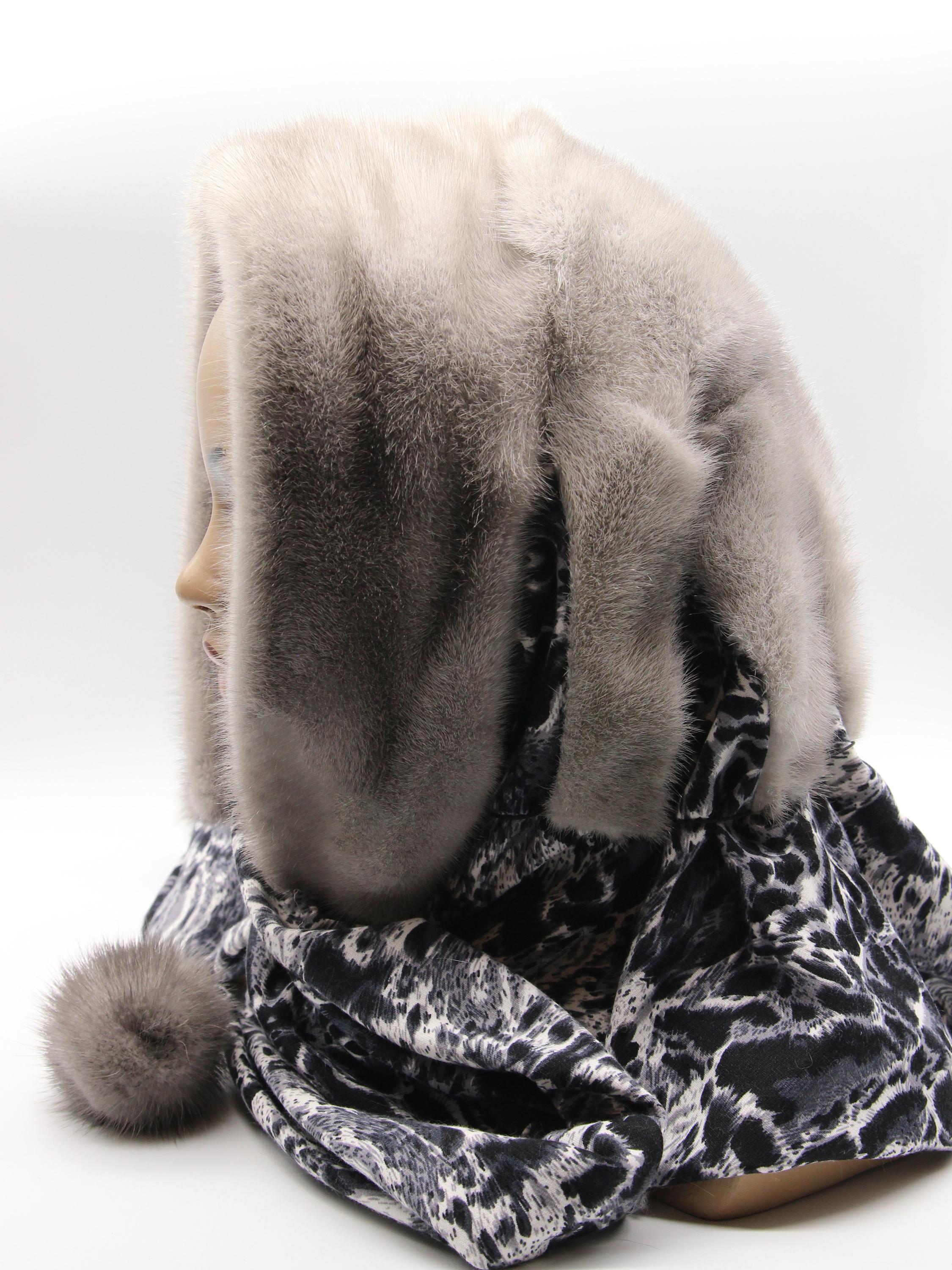 Sapphire grey natural mink fur hood with blurred leopard print scarf combination - functions as winter head wrap, fur hat with scarf, or hooded shawl. Natural undyed sapphire mink hood paired with fabric scarf featuring watercolor leopard print in blue-grey gradient, hand-stitched construction. One size adapts through flexible draping - the fur hood covers your head while the gradient leopard scarf wraps naturally. Sophisticated animal print merging with rare natural sapphire fur.