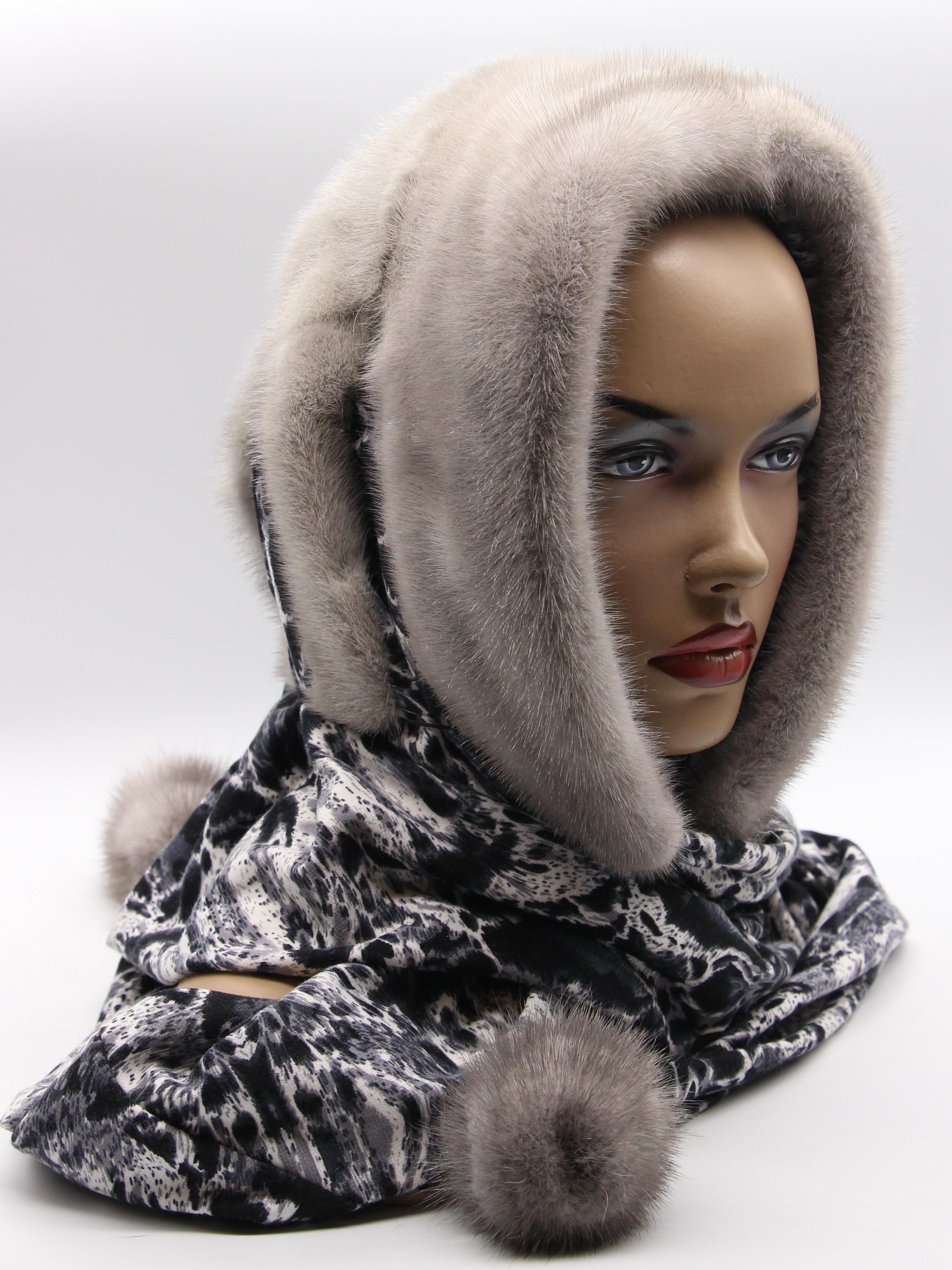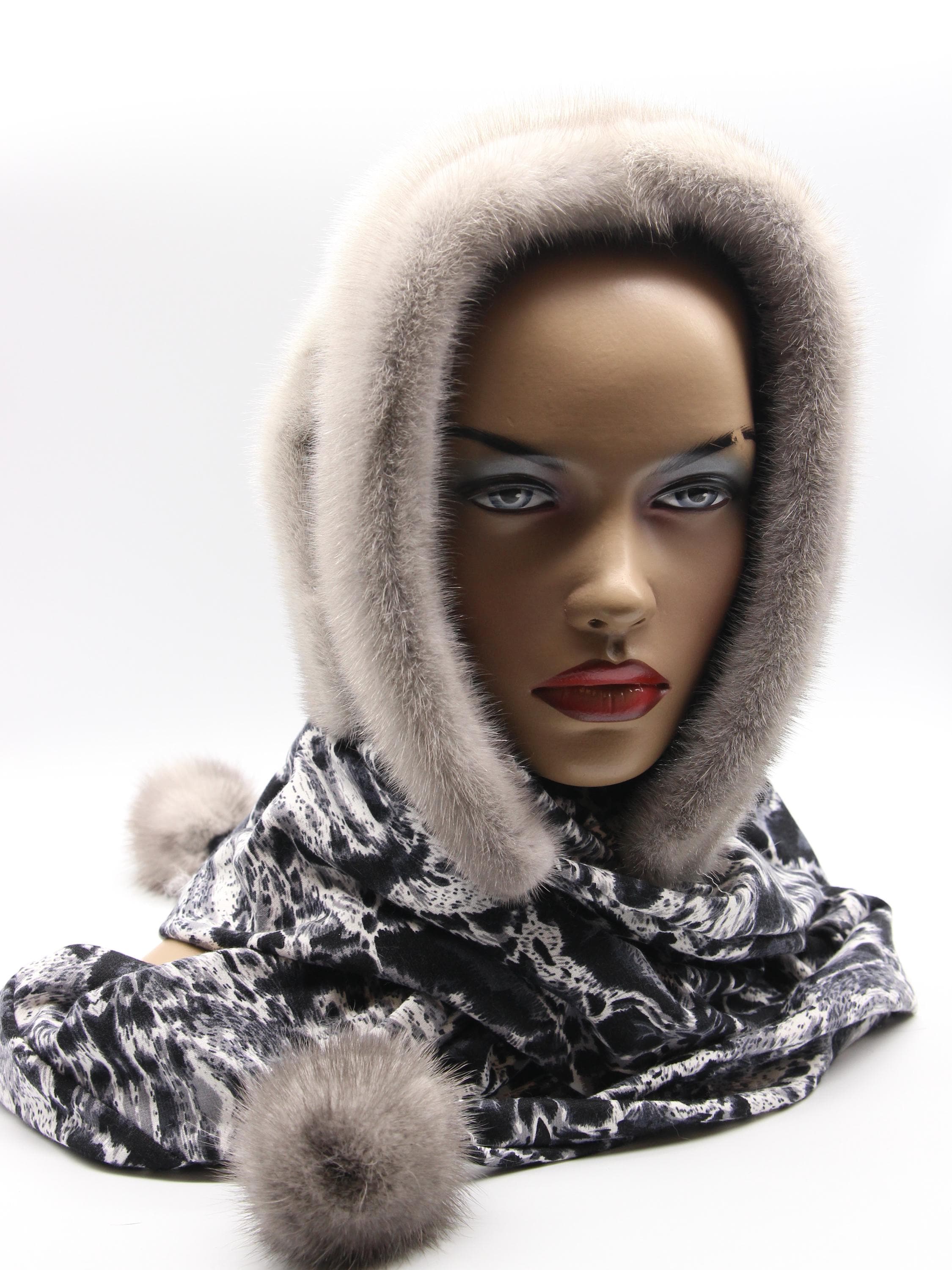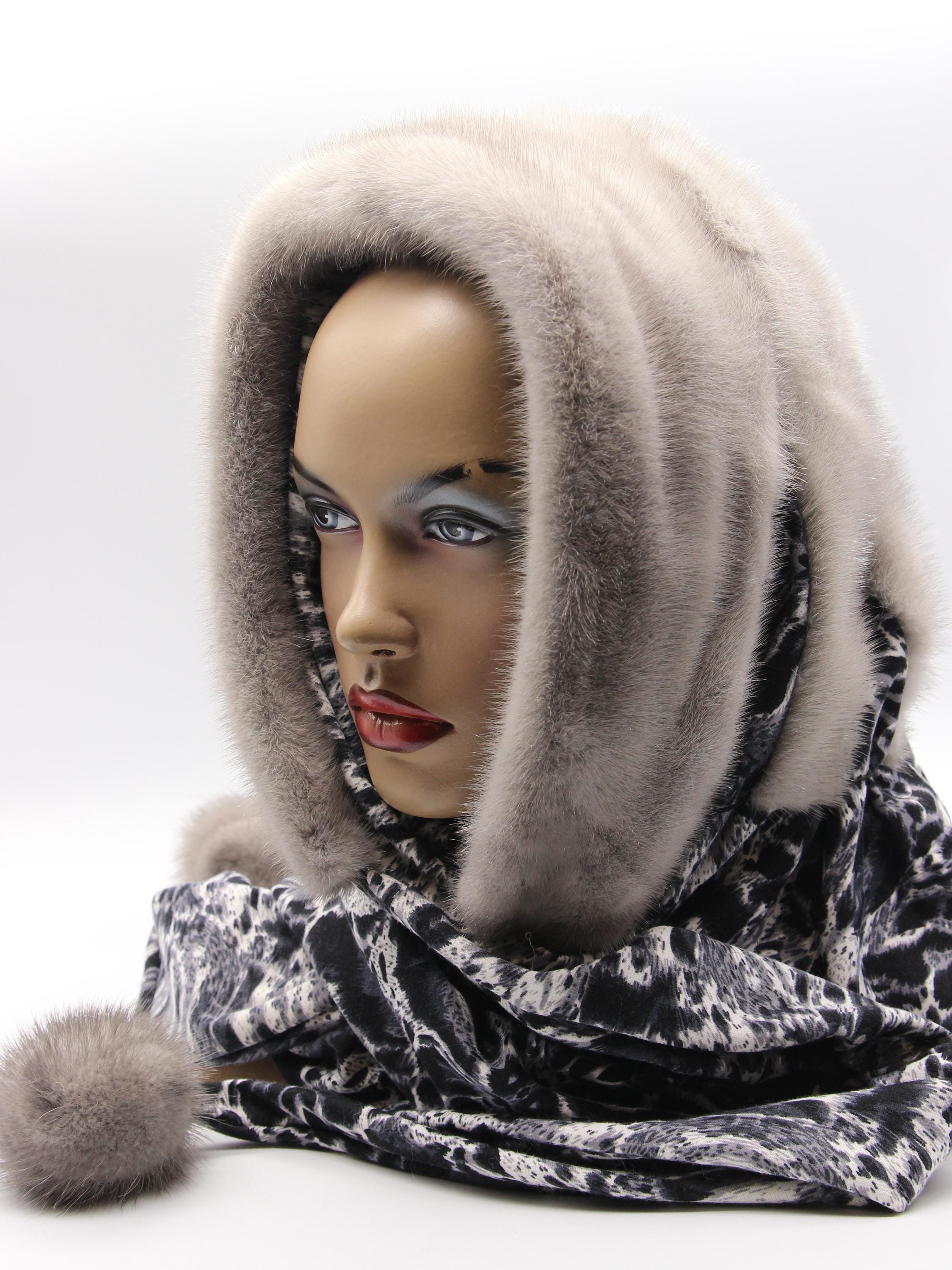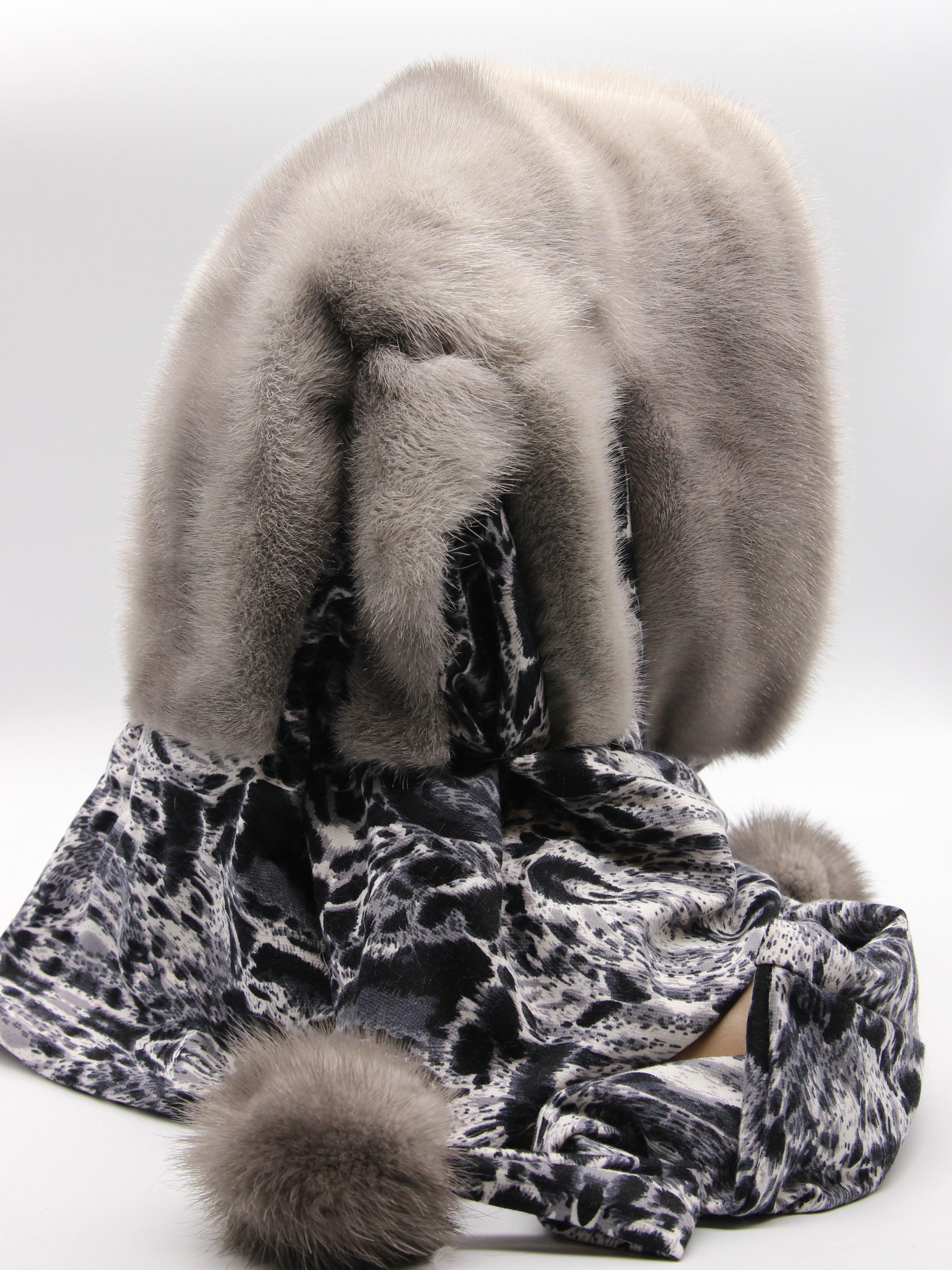 Sapphire grey natural mink fur hood with blurred leopard print scarf combination - functions as winter head wrap, fur hat with scarf, or hooded shawl. Natural undyed sapphire mink hood paired with fabric scarf featuring watercolor leopard print in blue-grey gradient, hand-stitched construction. One size adapts through flexible draping - the fur hood covers your head while the gradient leopard scarf wraps naturally. Sophisticated animal print merging with rare natural sapphire fur.