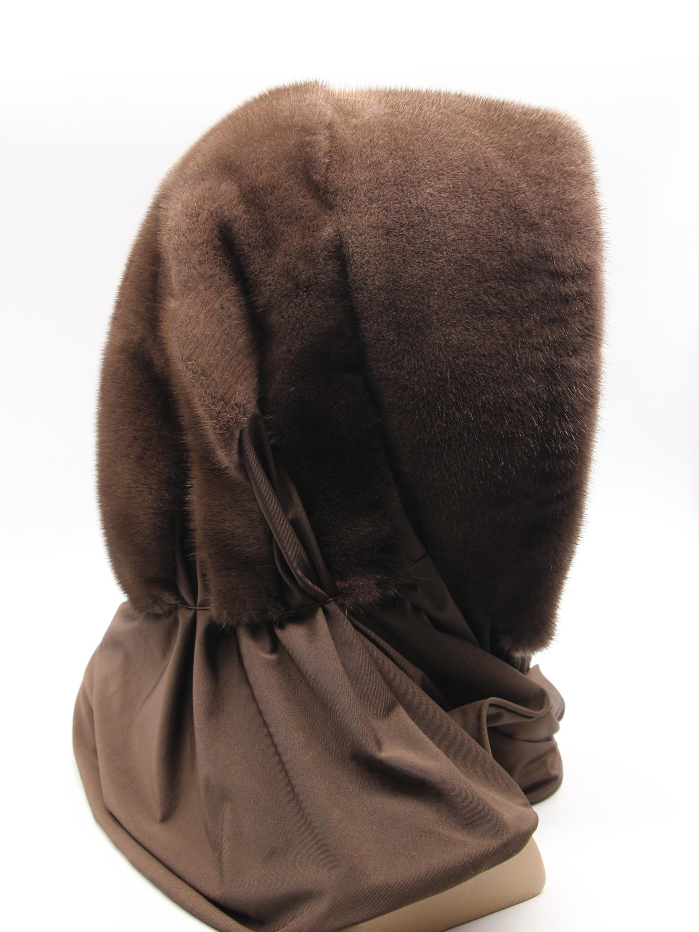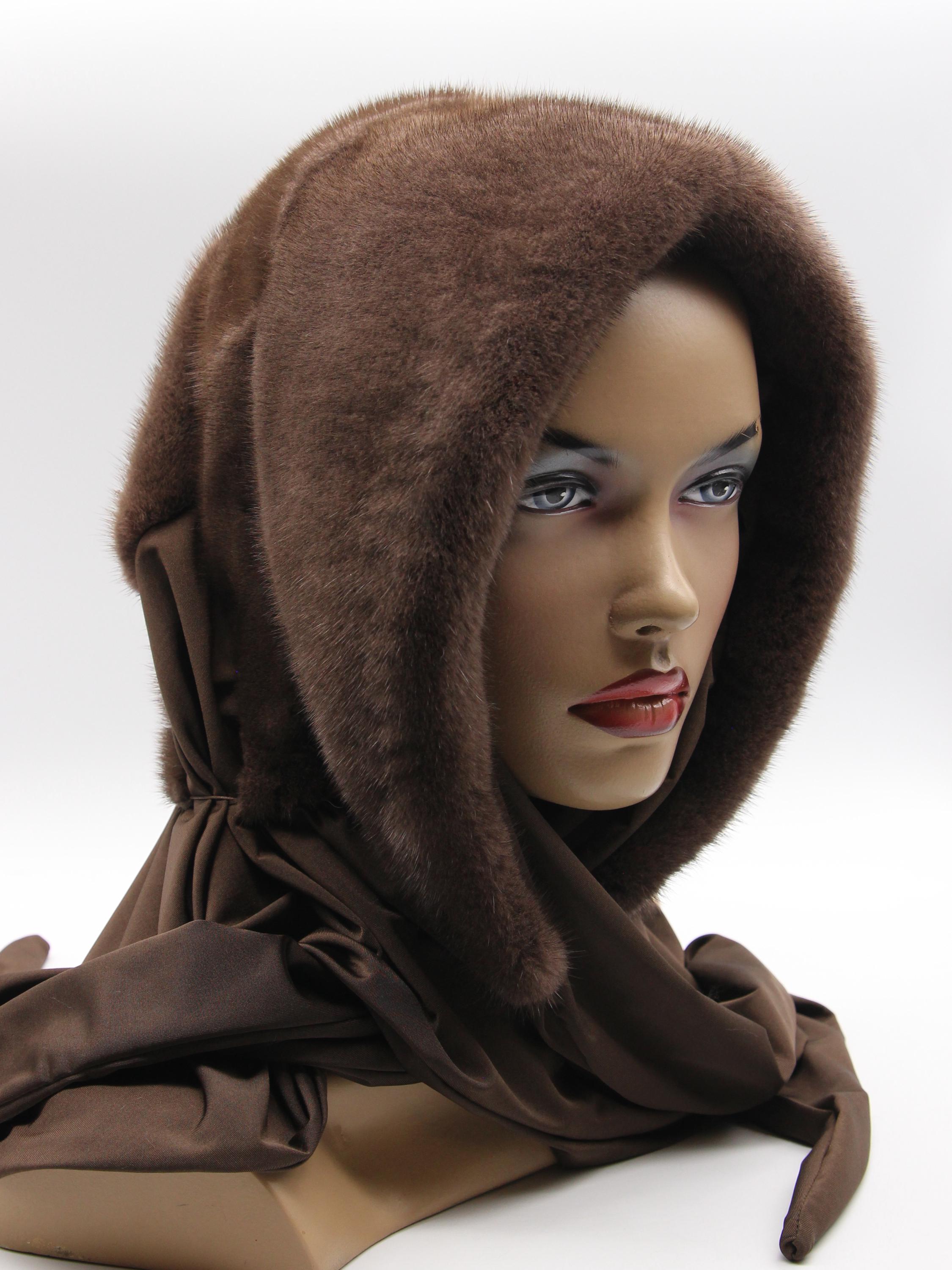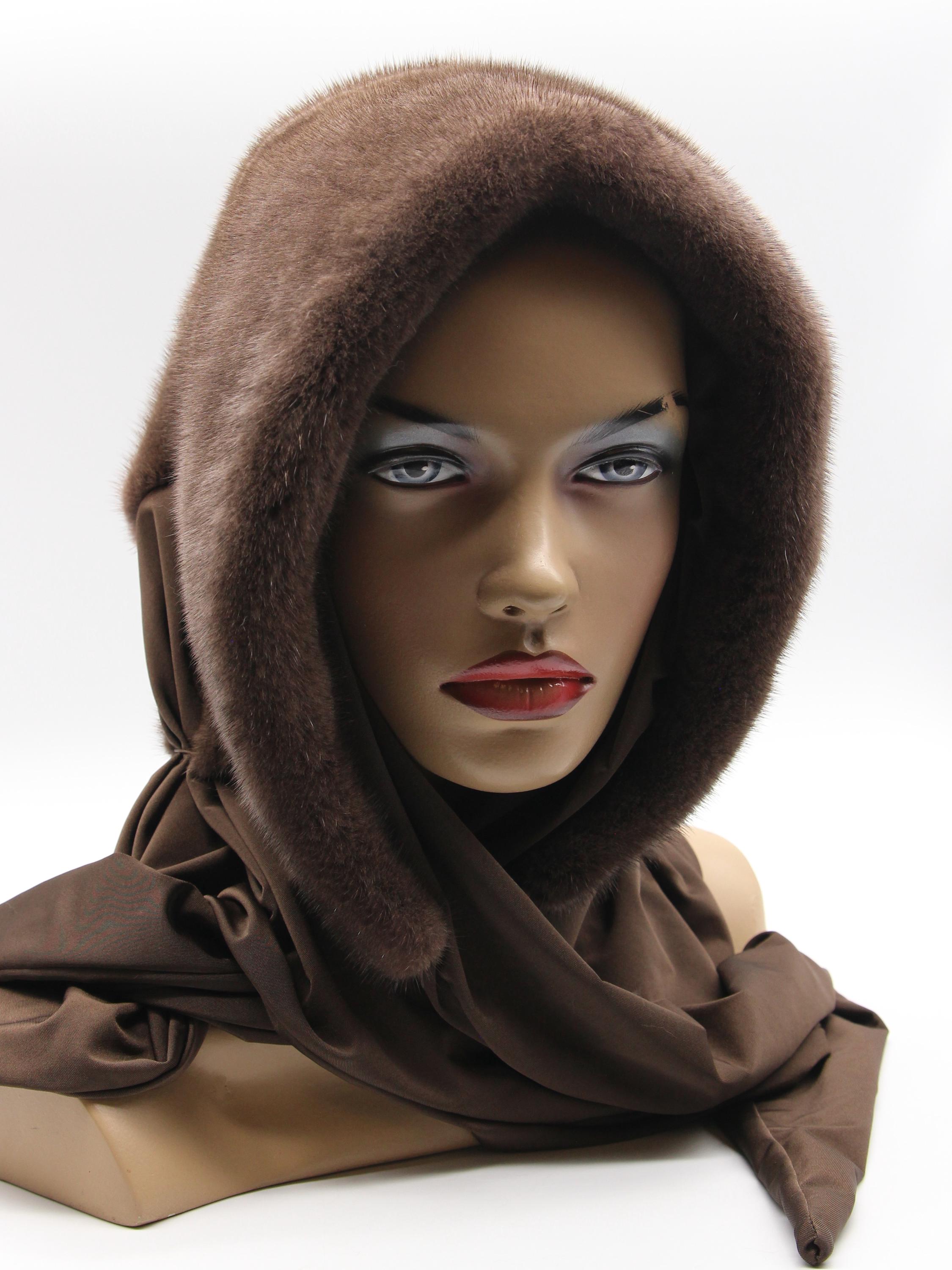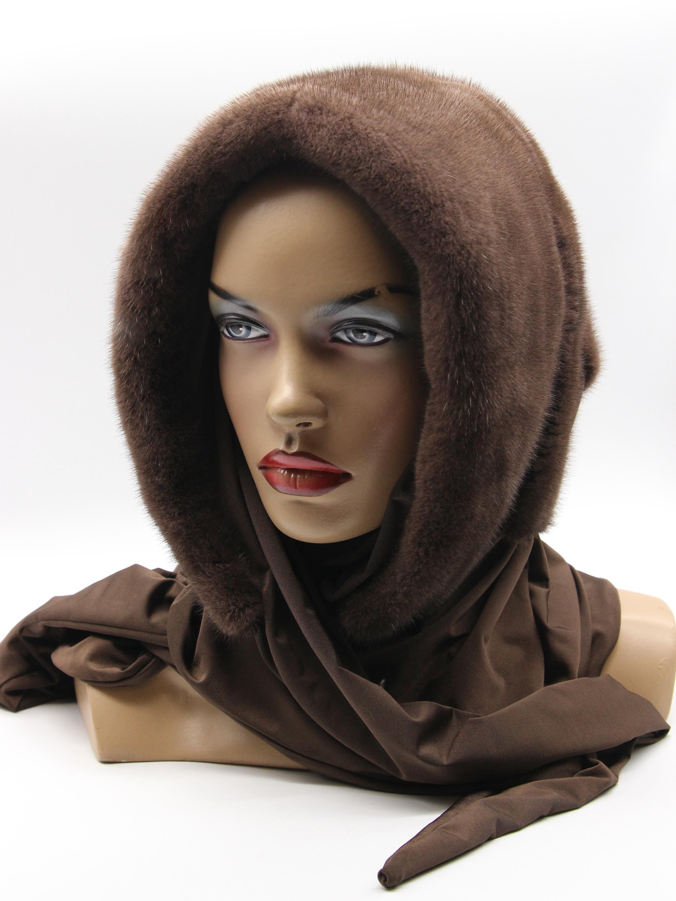 Chocolate brown dyed mink fur hood with light brown fabric scarf combination - functions as winter head wrap, fur hat with scarf, or hooded shawl. Rich chocolate brown mink hood paired with light brown solid fabric scarf, hand-stitched construction. One size adapts through flexible draping - the fur hood covers your head while the neutral fabric scarf wraps naturally. Classic two-tone brown combination carrying warm sophistication.