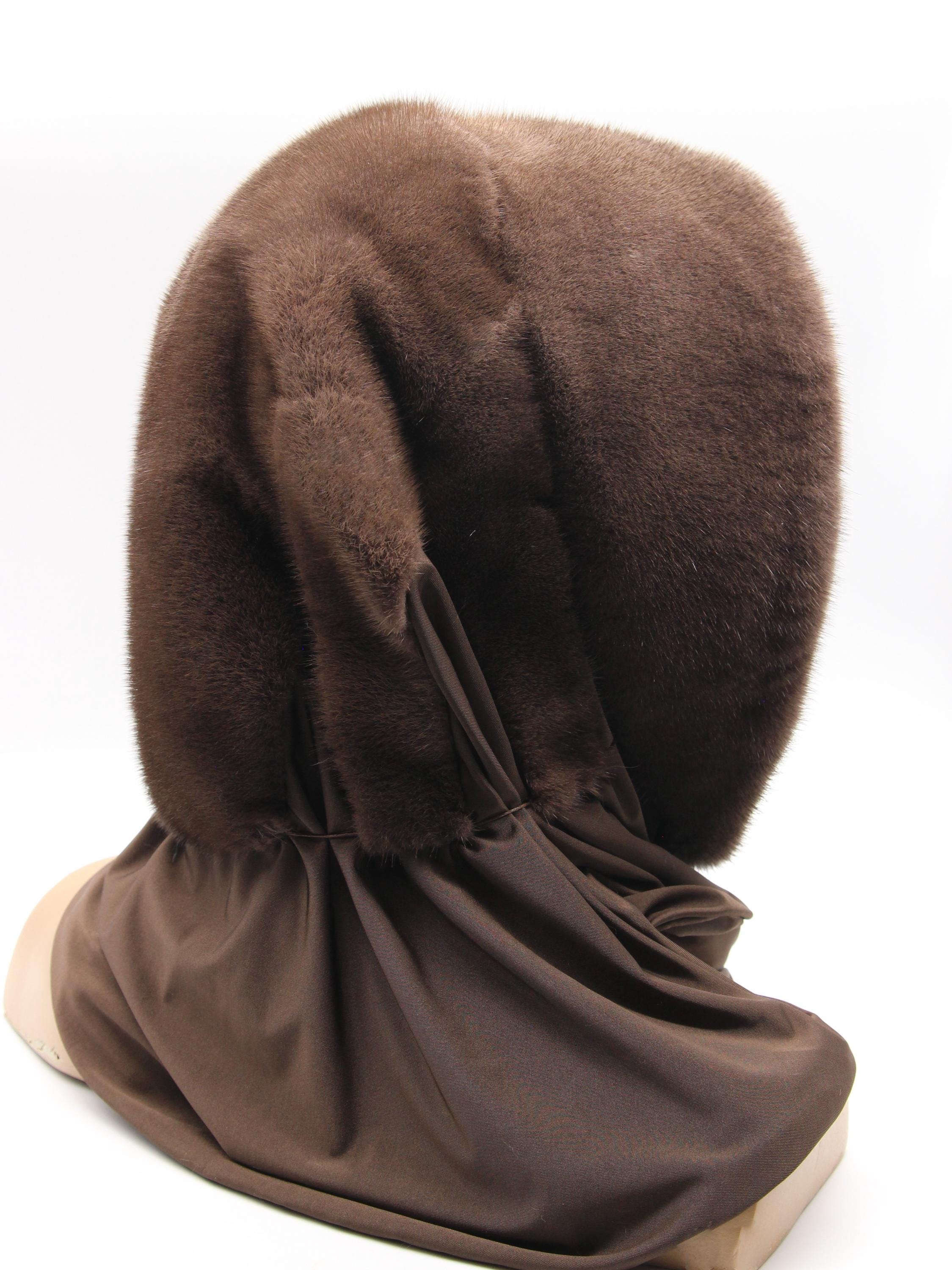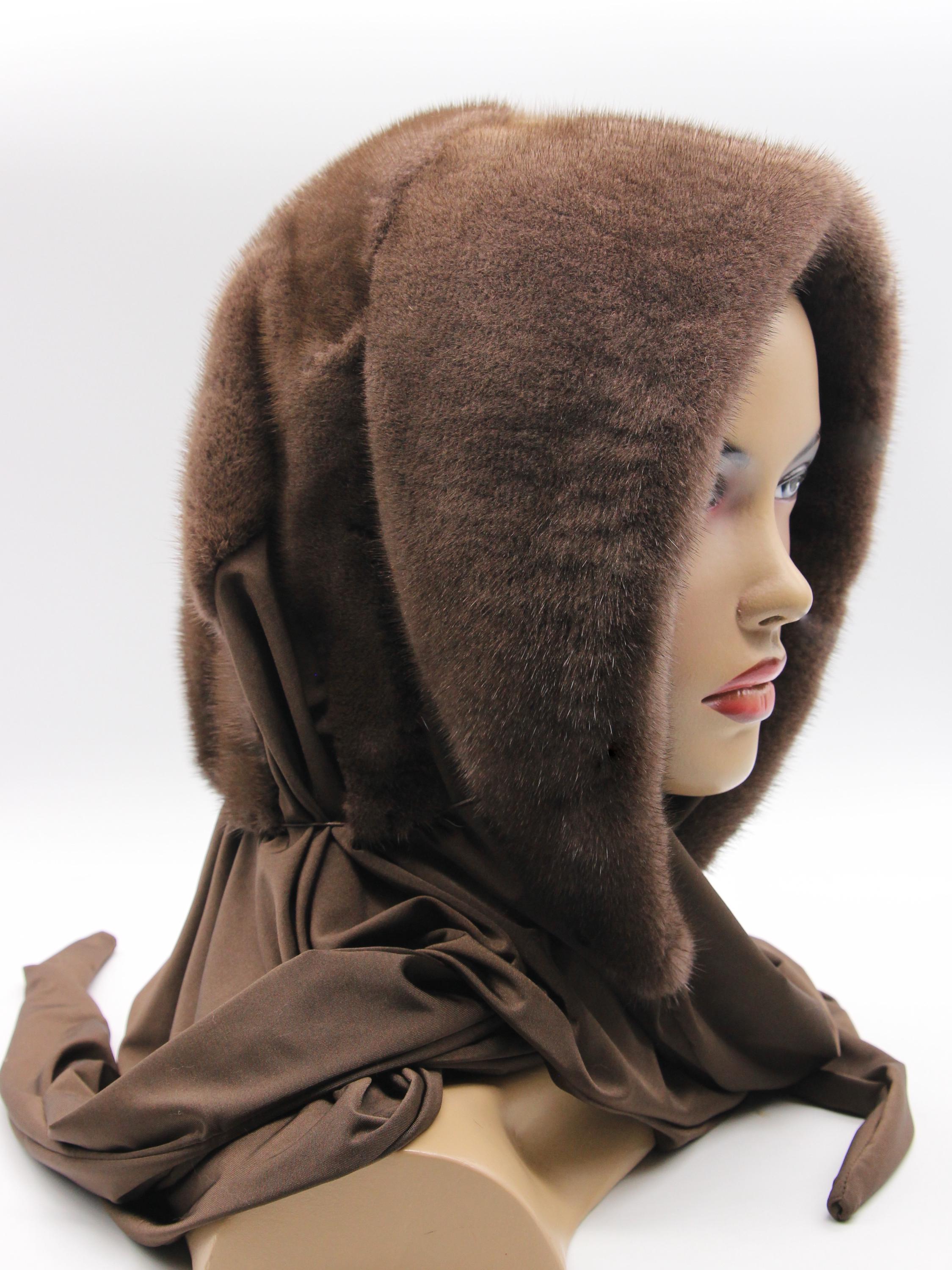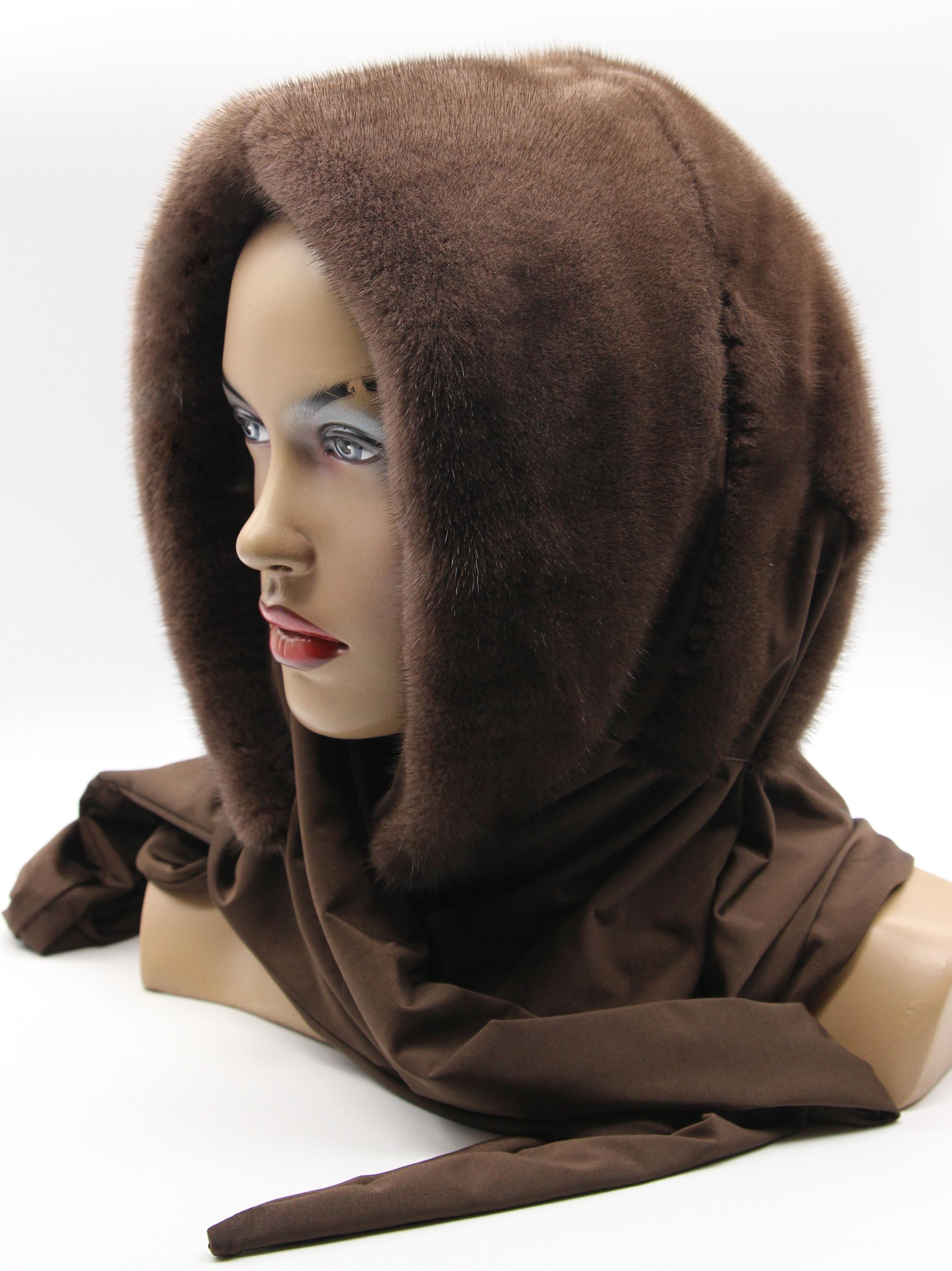 Chocolate brown dyed mink fur hood with light brown fabric scarf combination - functions as winter head wrap, fur hat with scarf, or hooded shawl. Rich chocolate brown mink hood paired with light brown solid fabric scarf, hand-stitched construction. One size adapts through flexible draping - the fur hood covers your head while the neutral fabric scarf wraps naturally. Classic two-tone brown combination carrying warm sophistication.