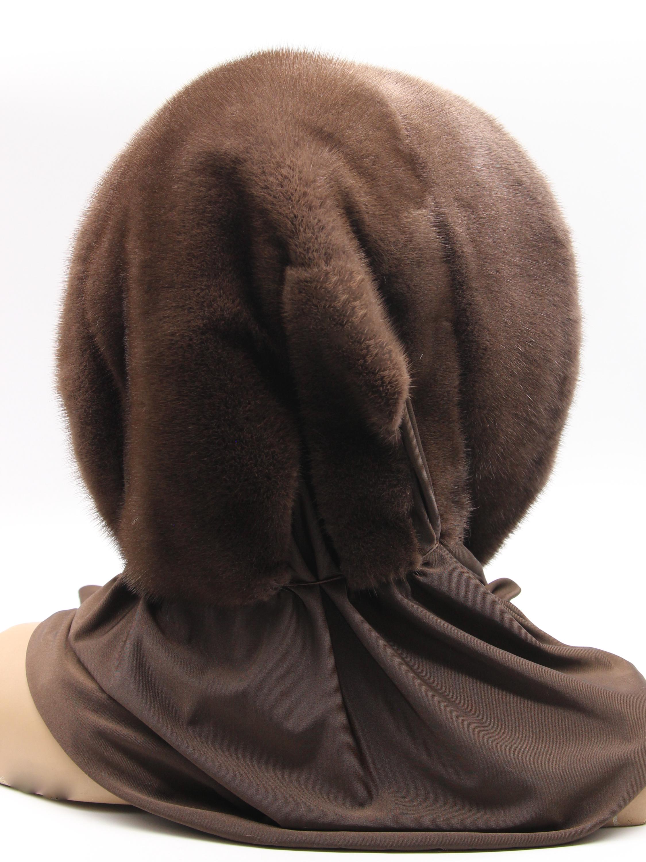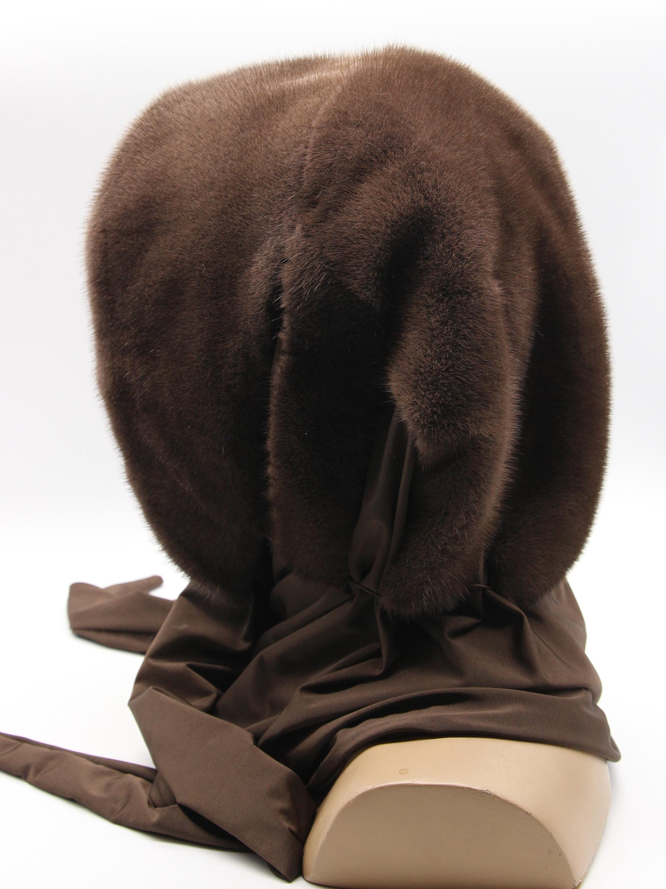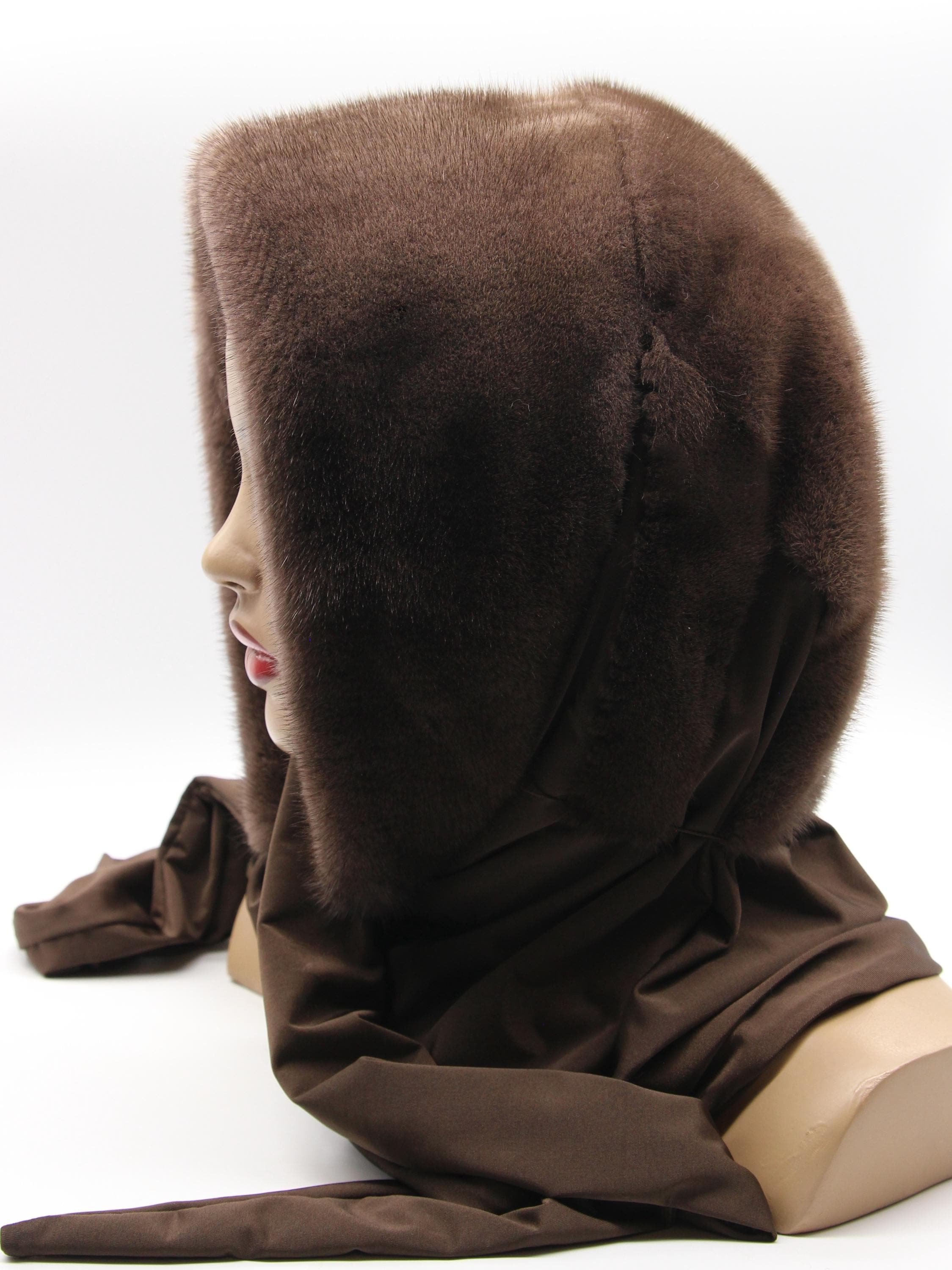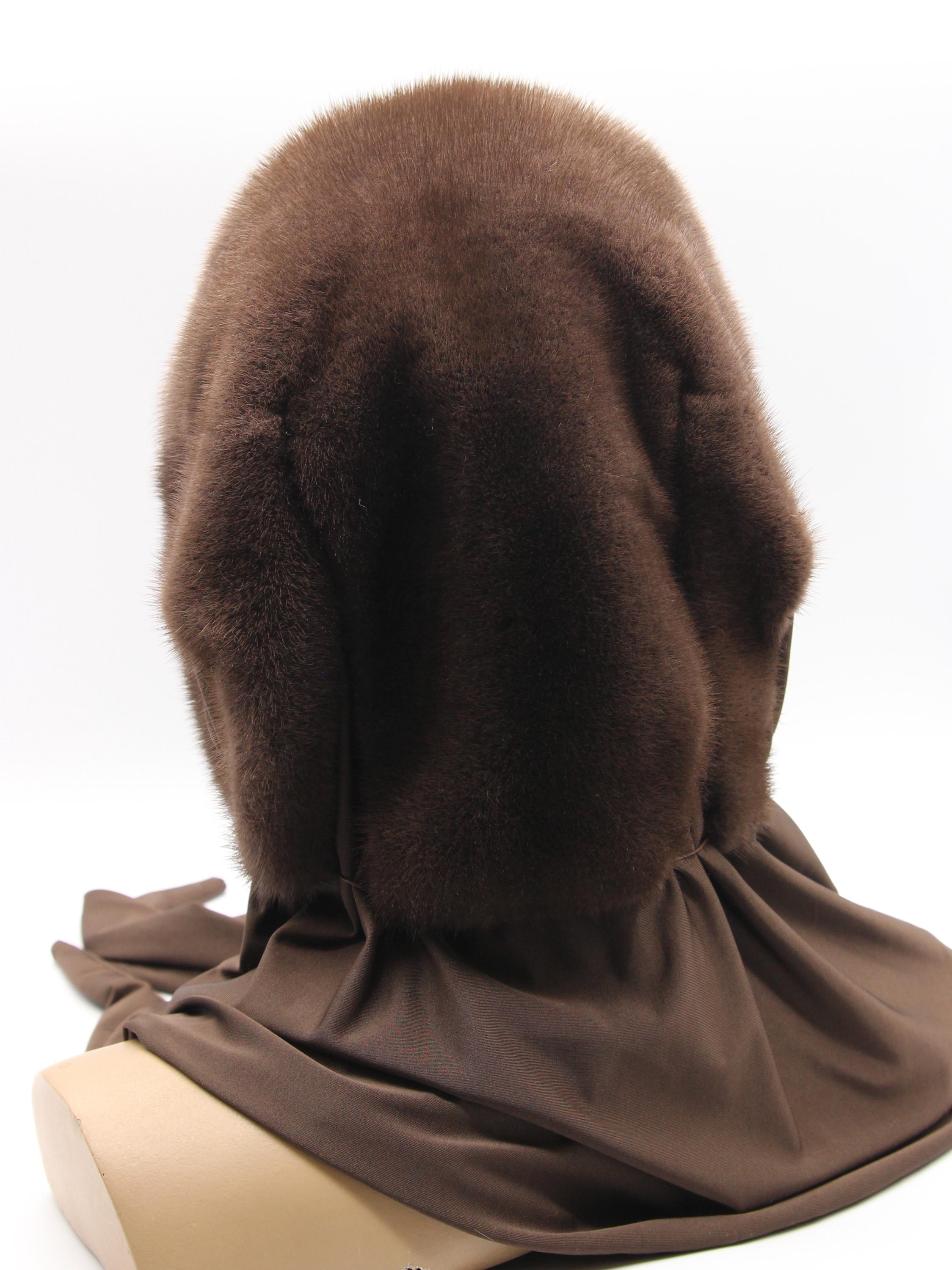 Chocolate brown dyed mink fur hood with light brown fabric scarf combination - functions as winter head wrap, fur hat with scarf, or hooded shawl. Rich chocolate brown mink hood paired with light brown solid fabric scarf, hand-stitched construction. One size adapts through flexible draping - the fur hood covers your head while the neutral fabric scarf wraps naturally. Classic two-tone brown combination carrying warm sophistication.