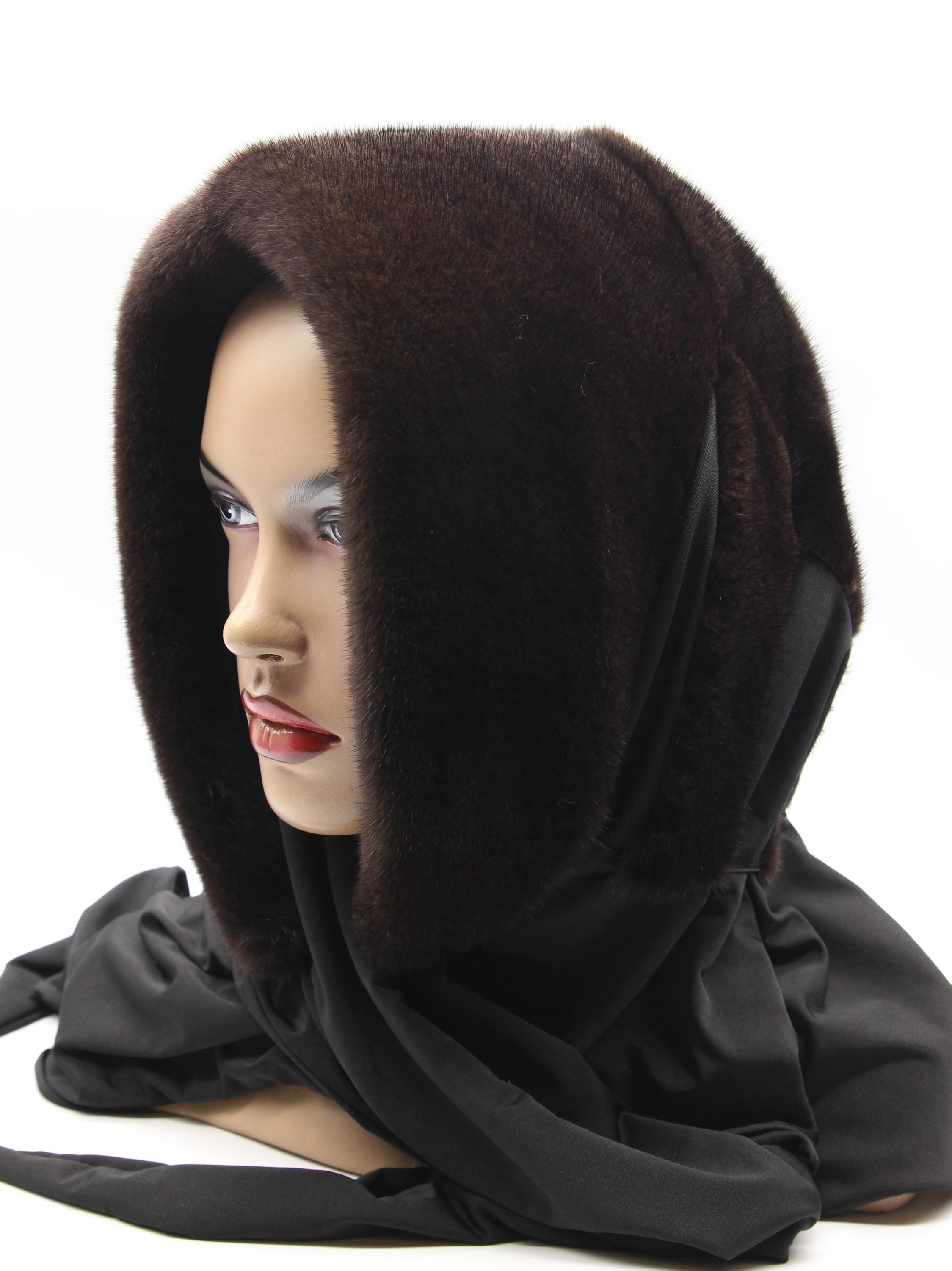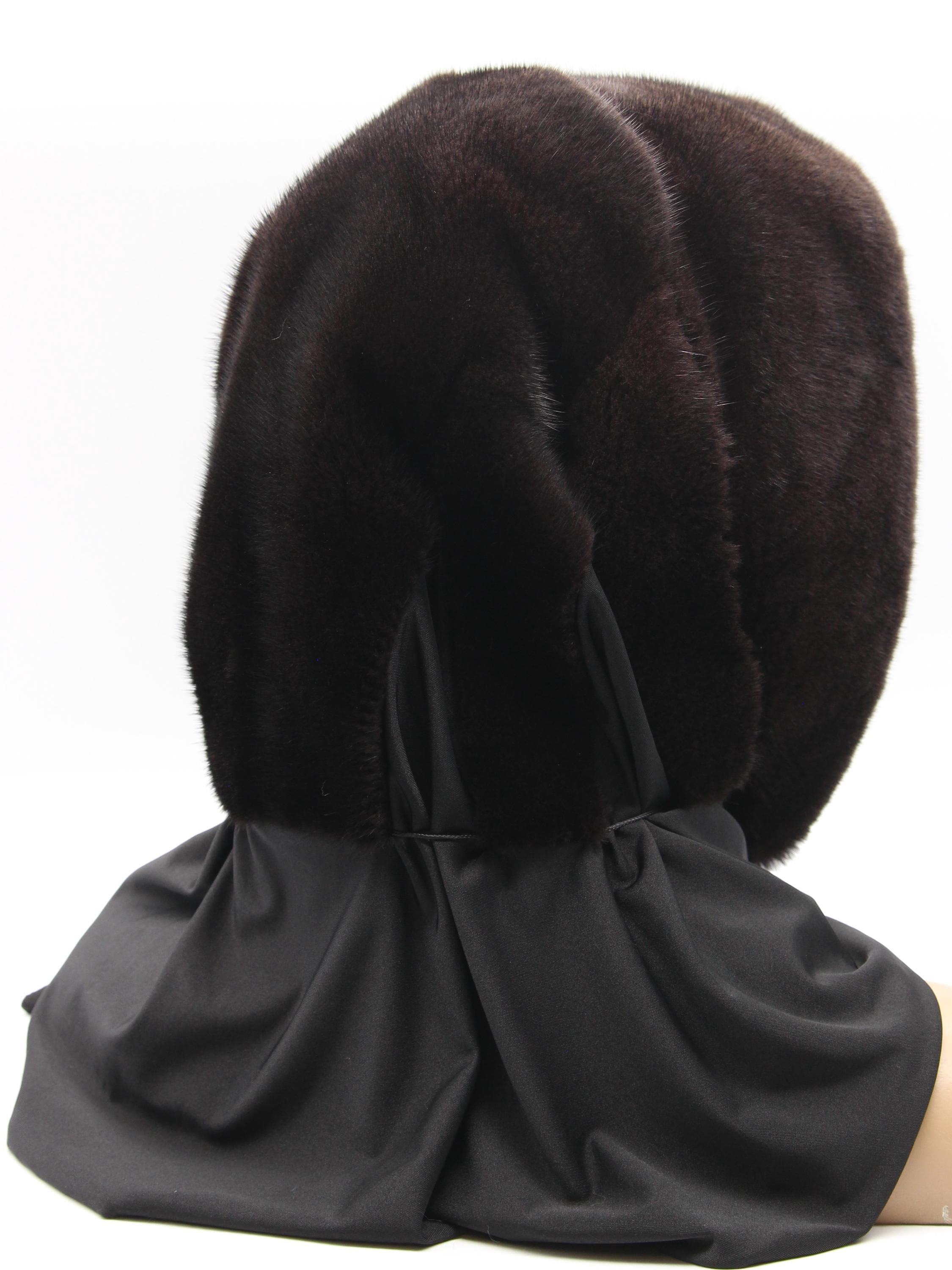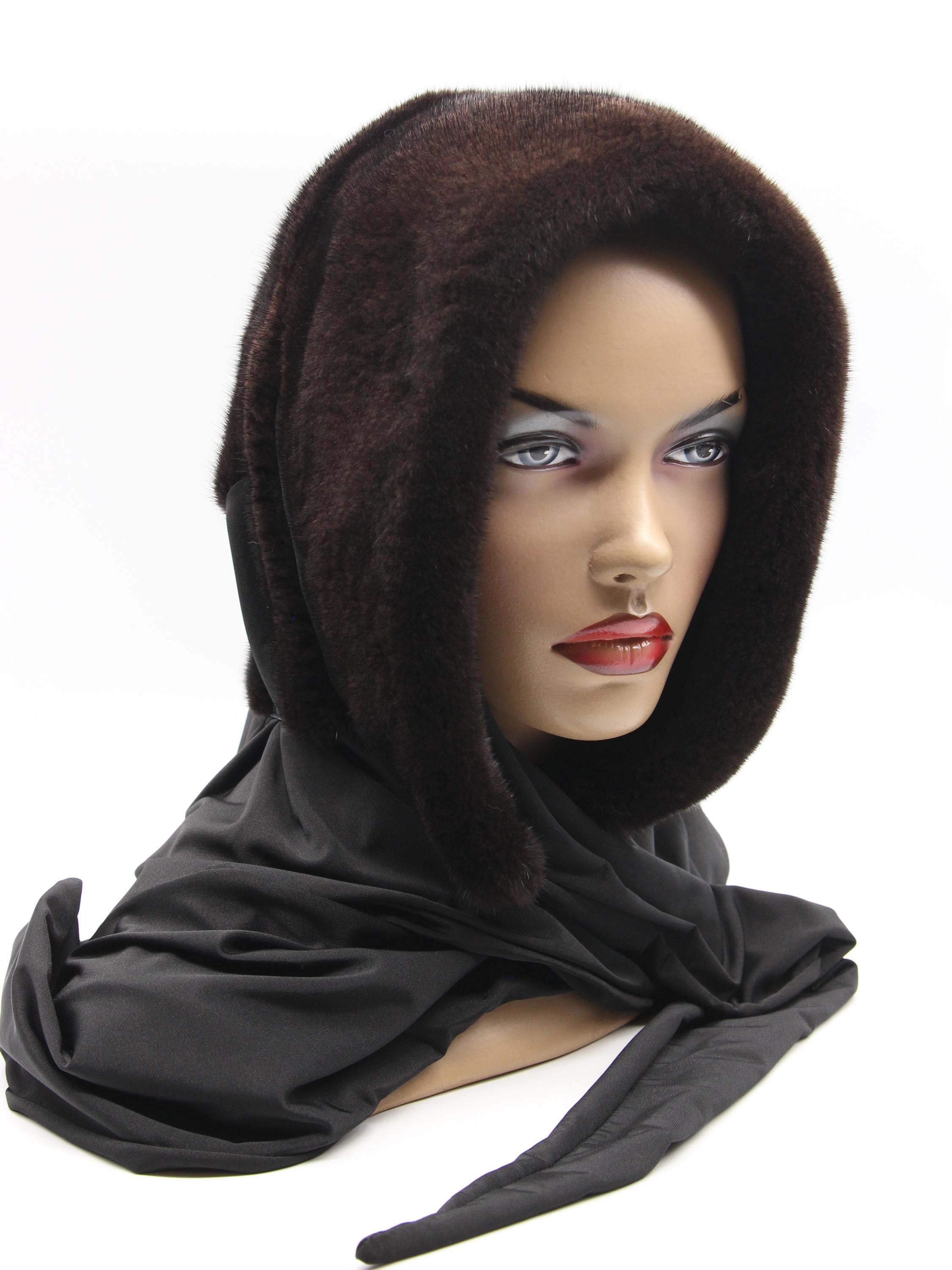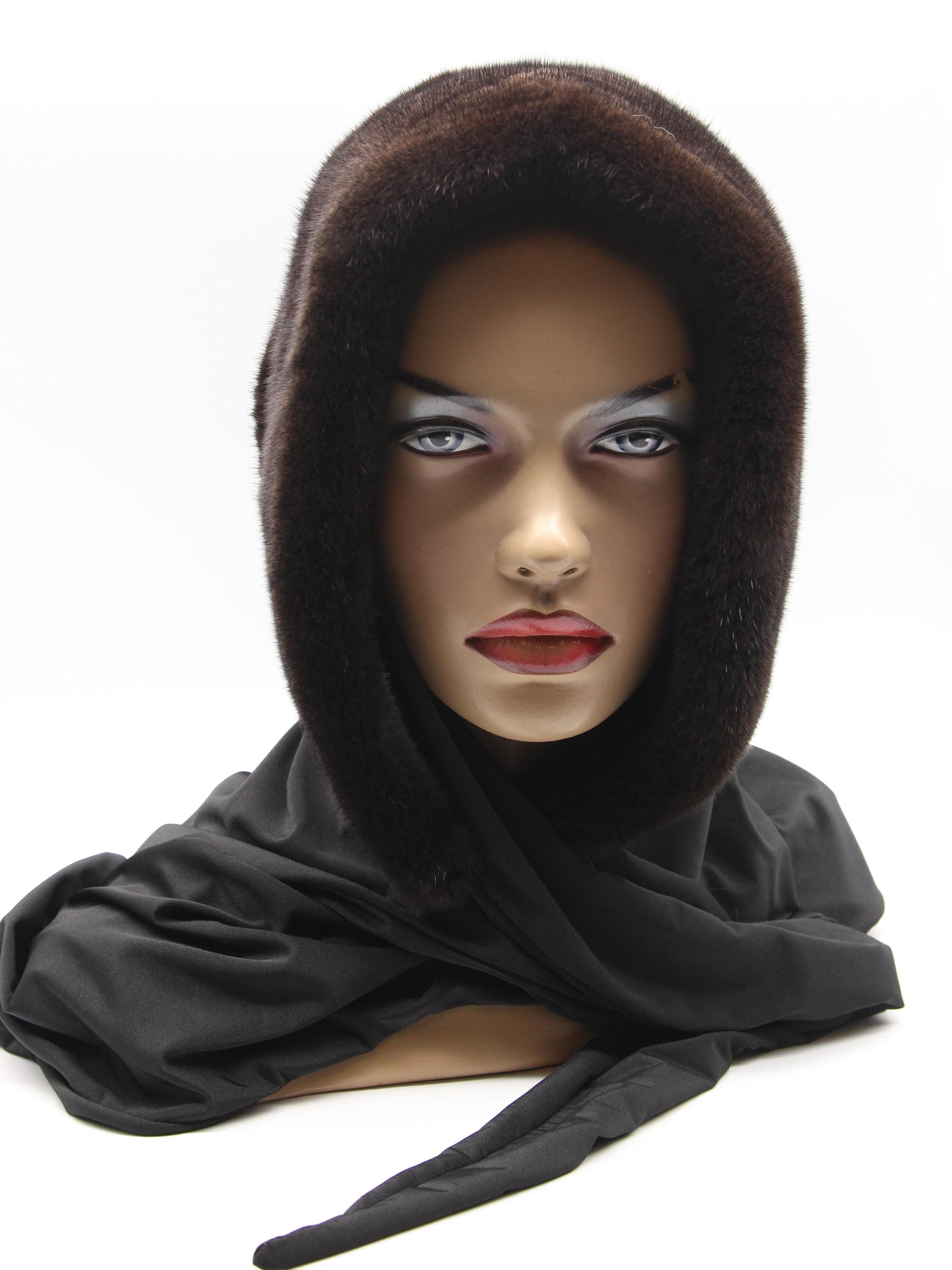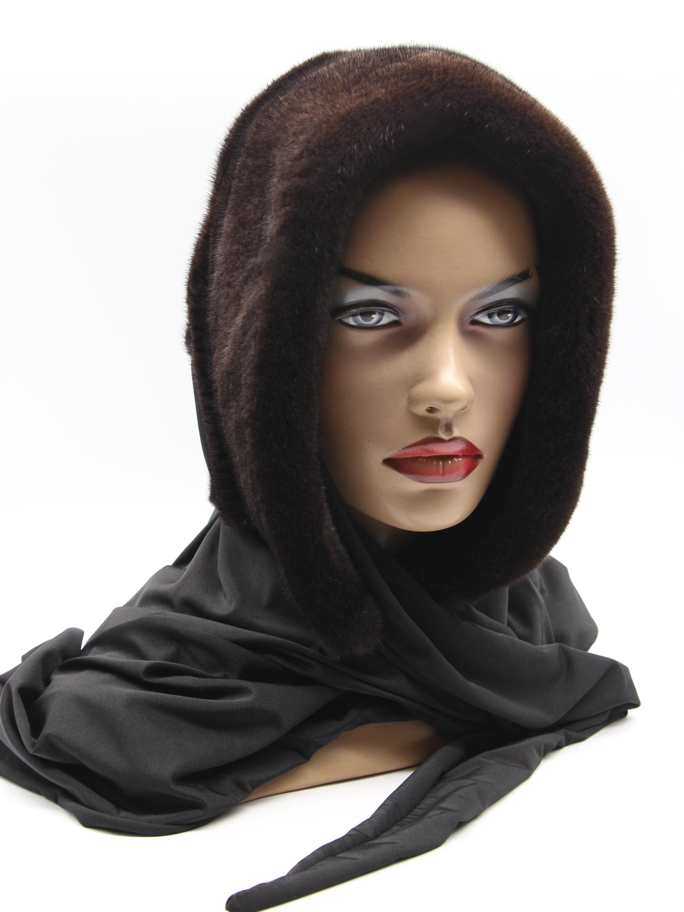 Dark brown natural mink fur hood with black fabric scarf combination - functions as winter head wrap, fur hat with scarf, or hooded shawl. Rich dark brown natural mink hood paired with solid black fabric scarf, hand-stitched construction. One size adapts through flexible draping - the fur hood covers your head while the black fabric scarf wraps naturally. Classic two-tone combination carrying timeless sophistication.