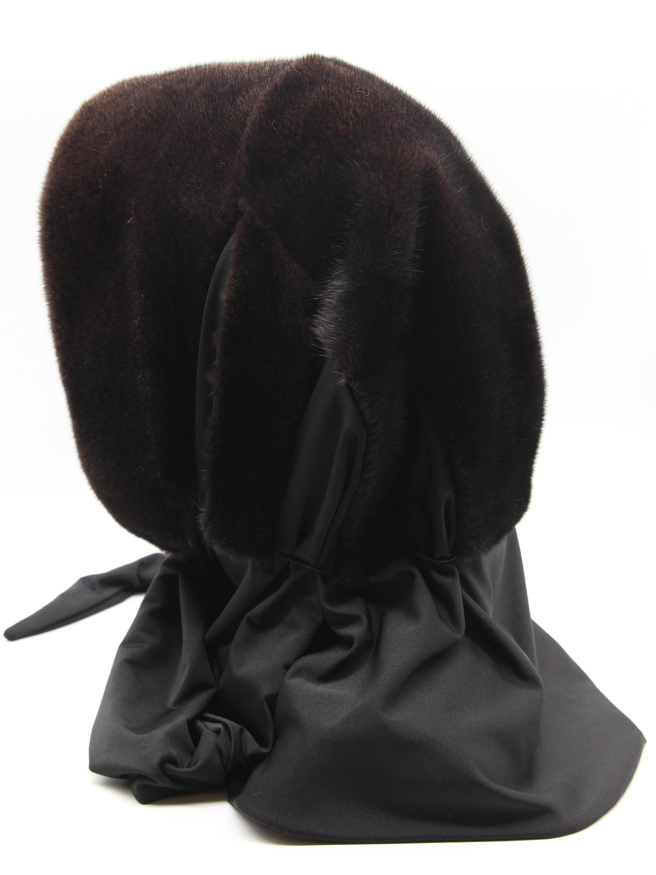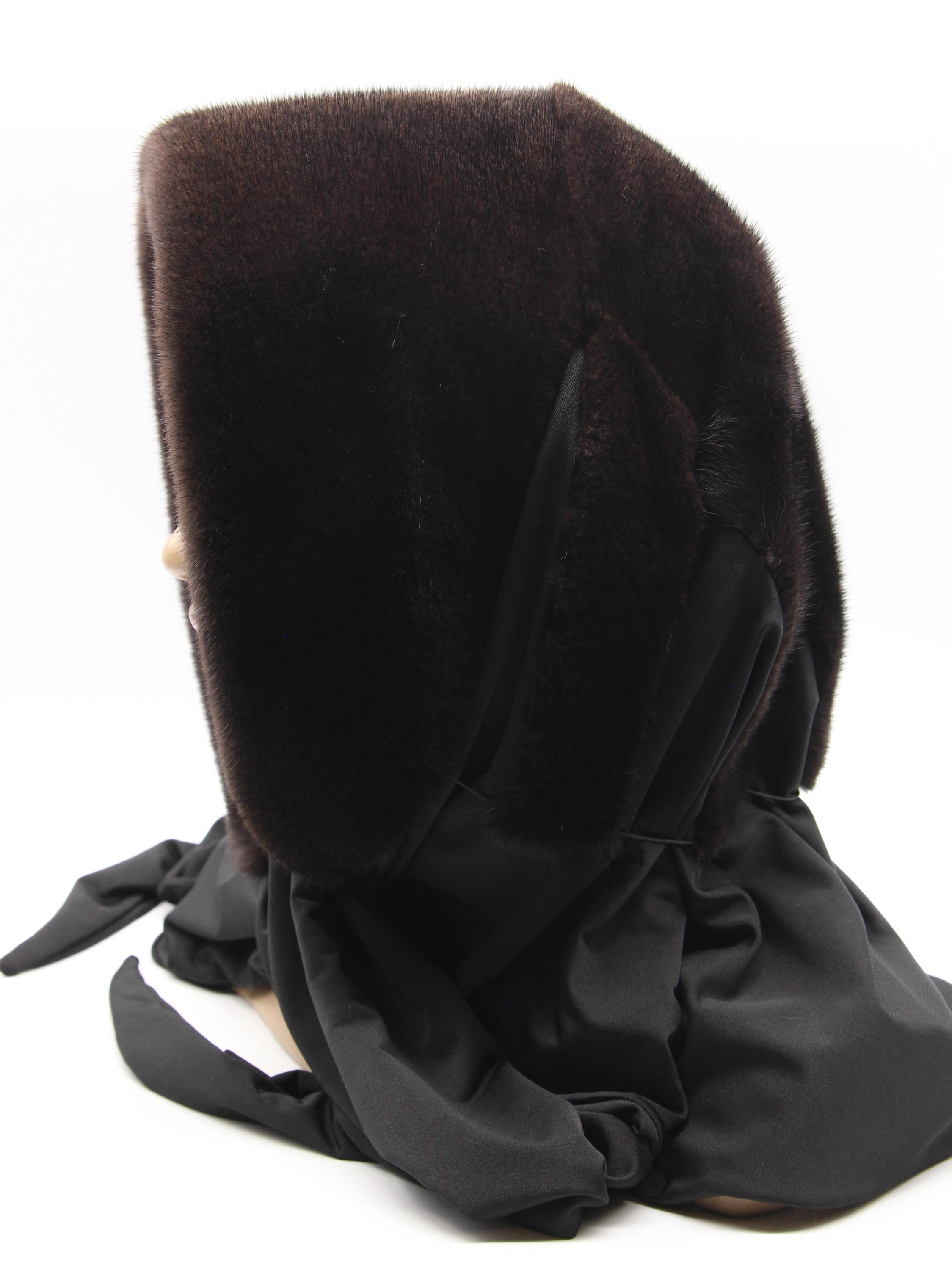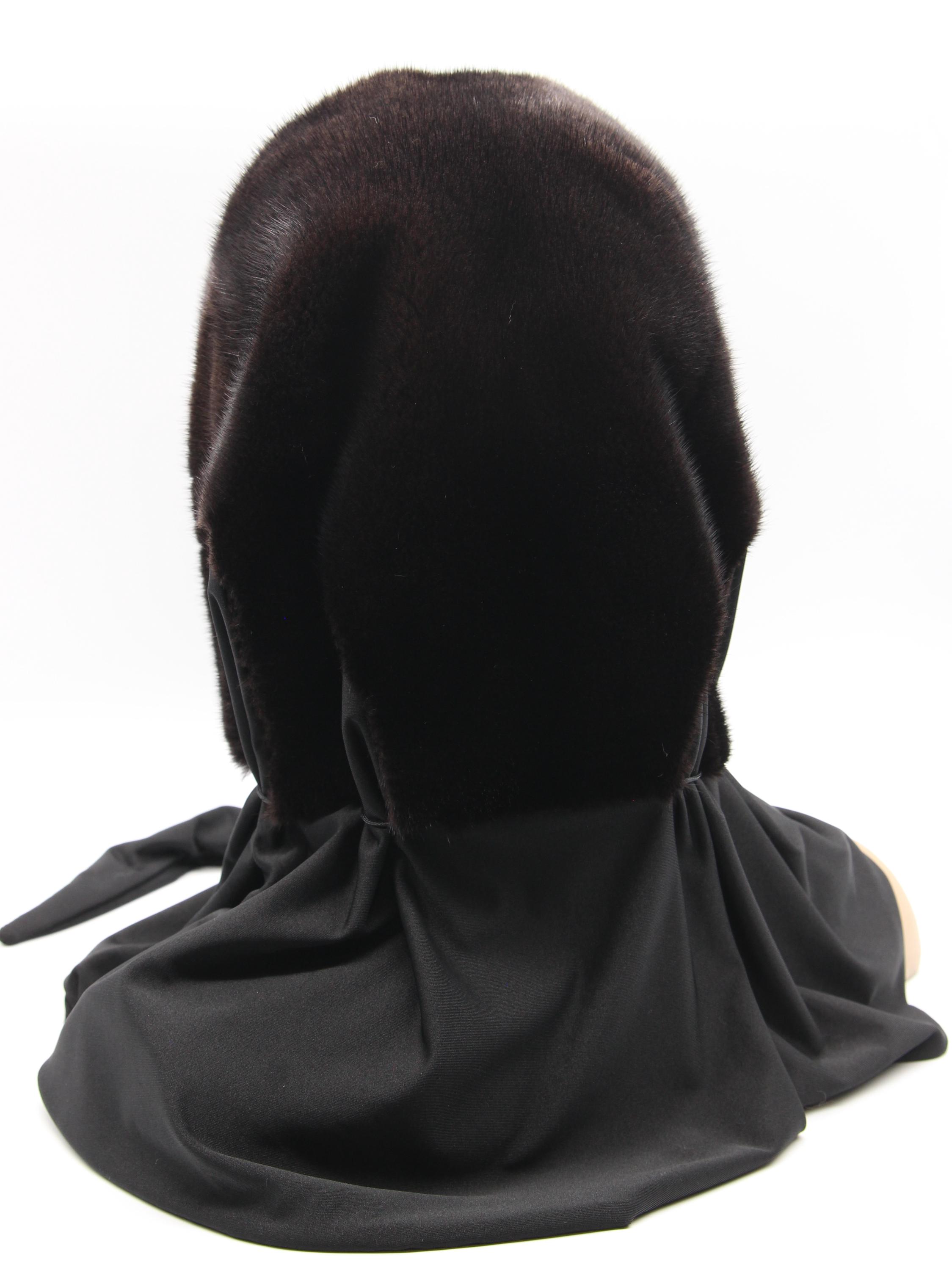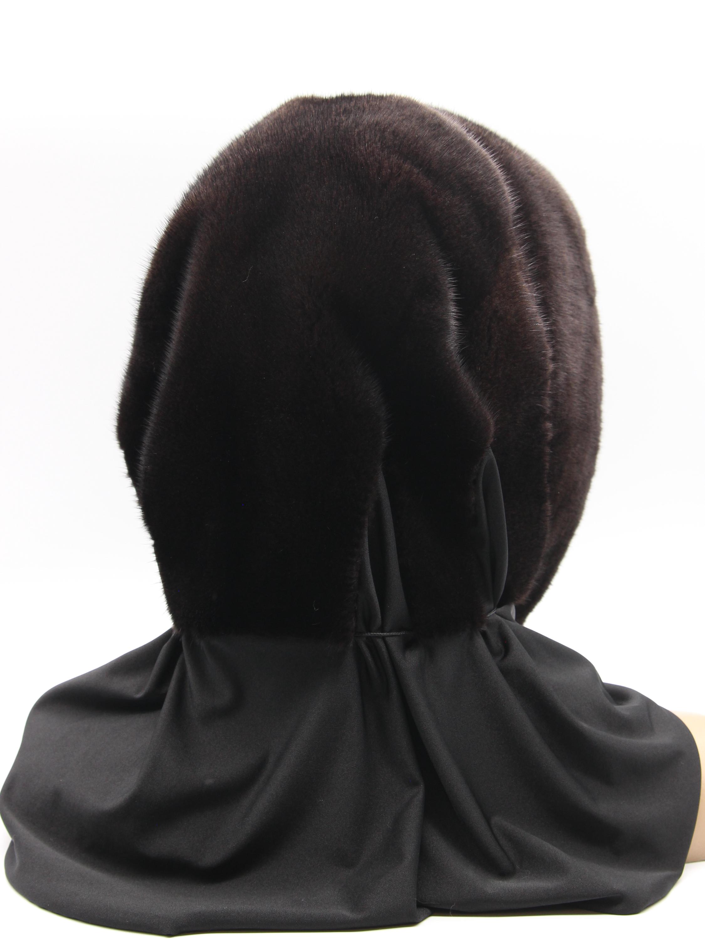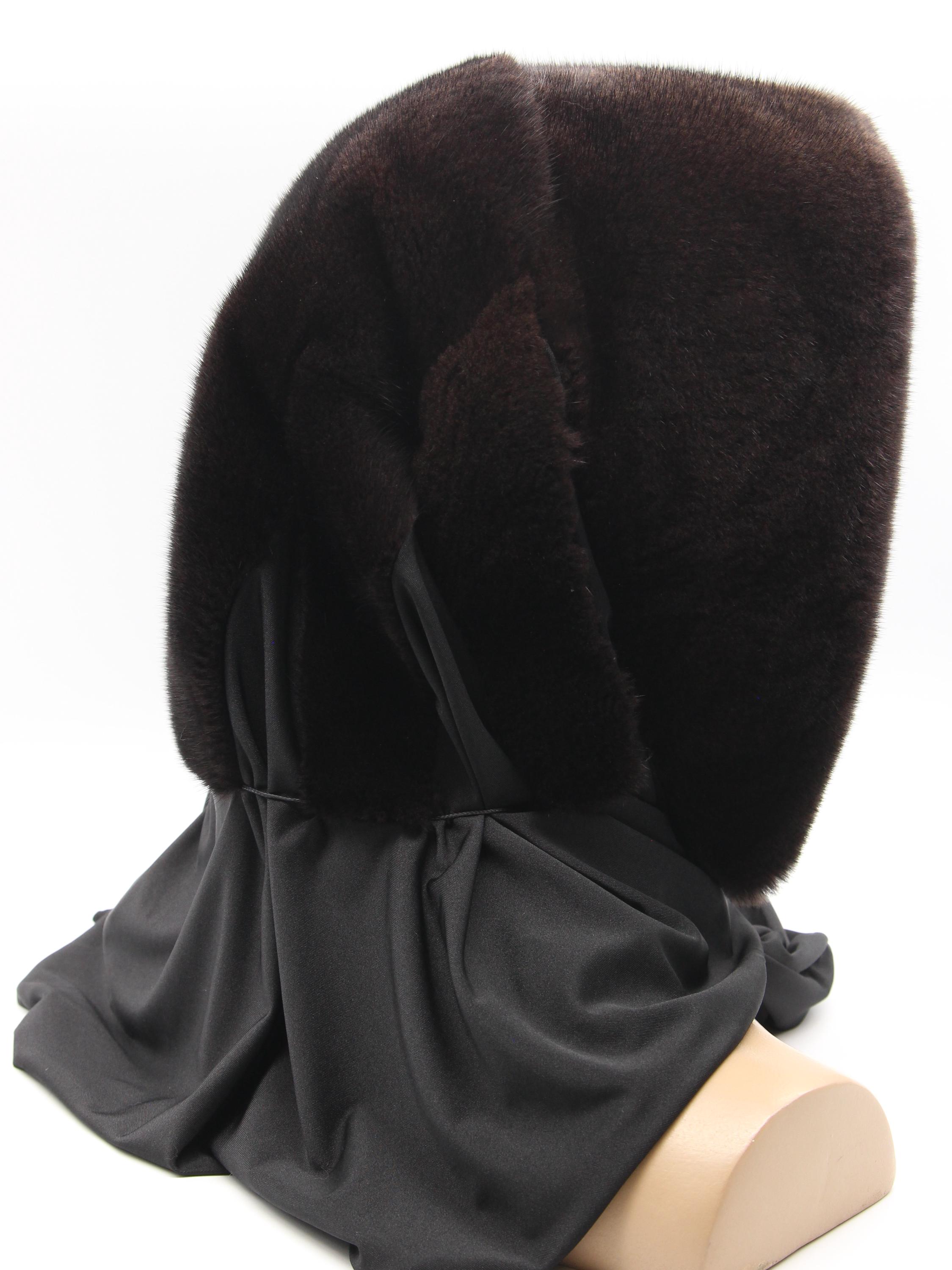 Dark brown natural mink fur hood with black fabric scarf combination - functions as winter head wrap, fur hat with scarf, or hooded shawl. Rich dark brown natural mink hood paired with solid black fabric scarf, hand-stitched construction. One size adapts through flexible draping - the fur hood covers your head while the black fabric scarf wraps naturally. Classic two-tone combination carrying timeless sophistication.