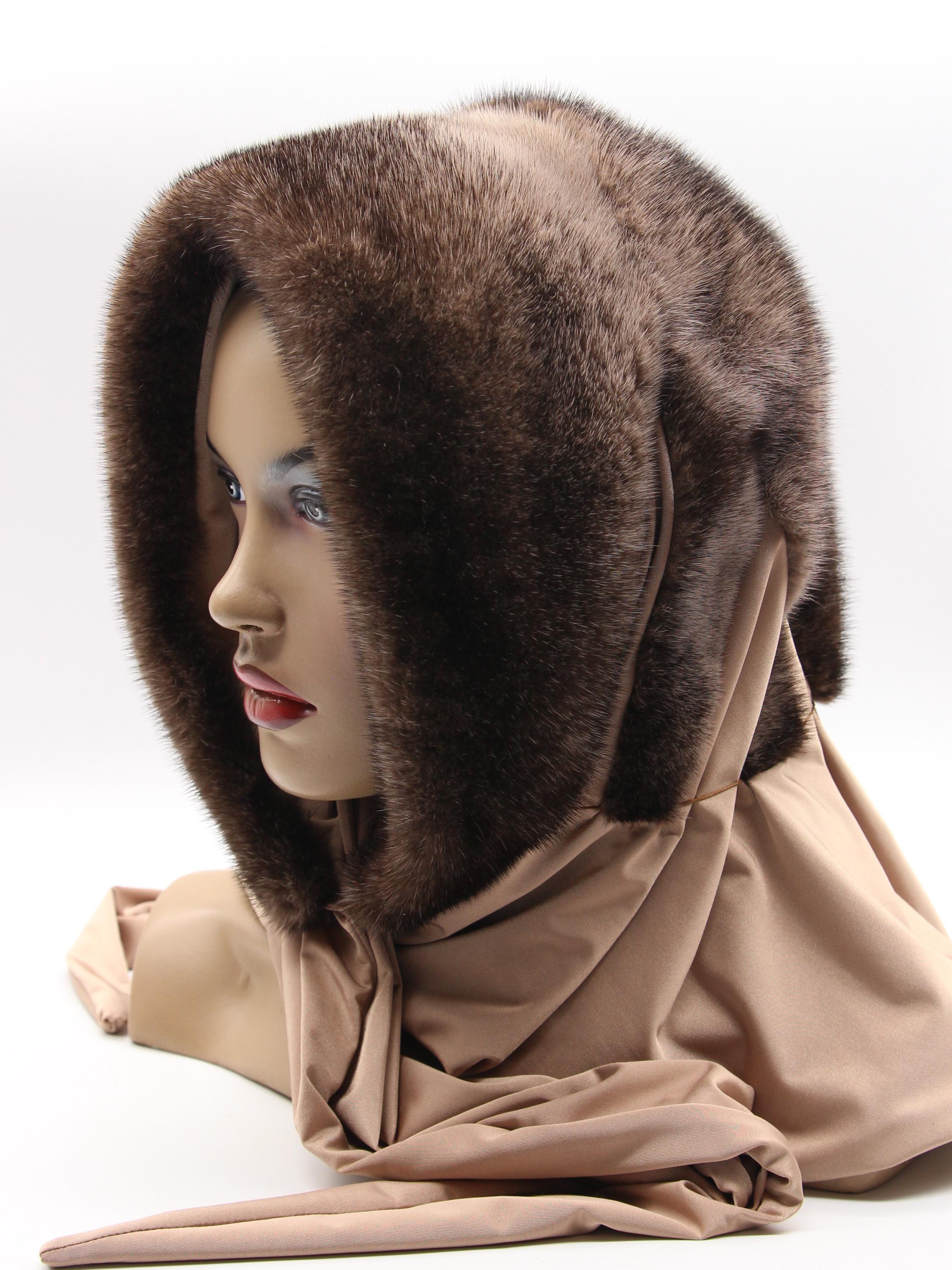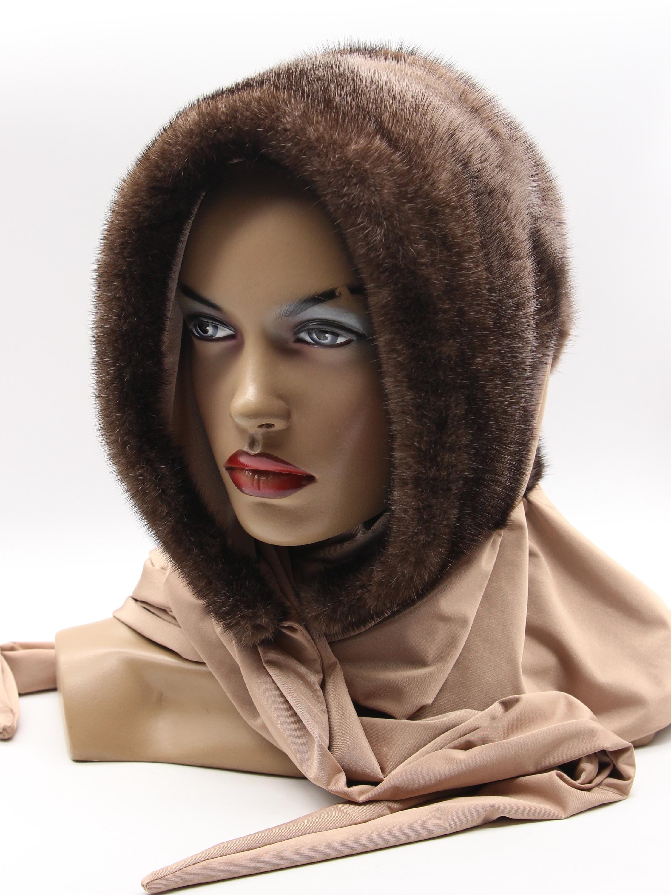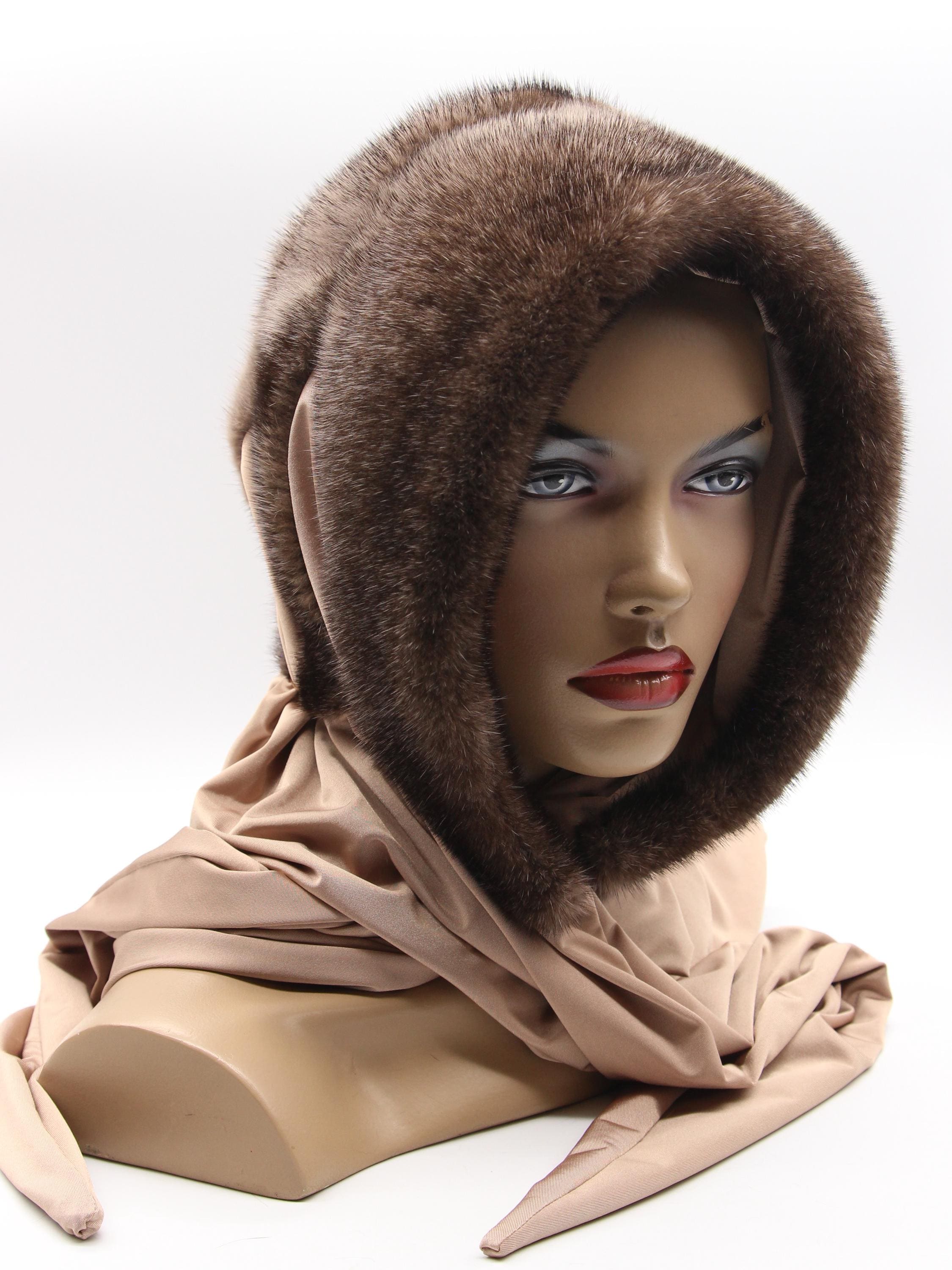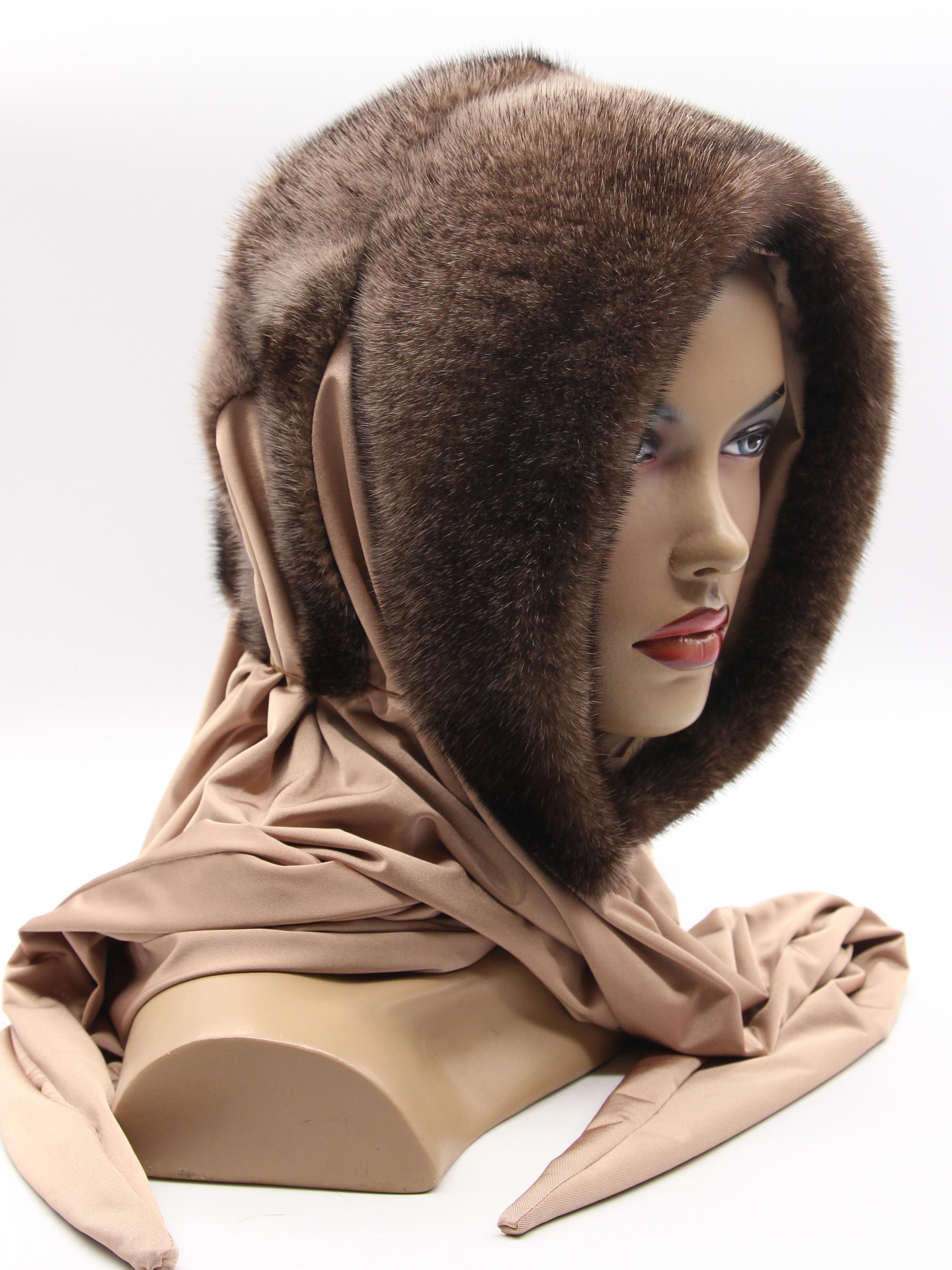 Gradient mink fur hood - brown melting into beige naturally - with champagne fabric scarf attached underneath. Pure natural mink genetics creating this ombre effect, zero dye or paint involved. Super rare fur because breeding for clean color transitions fails most attempts.