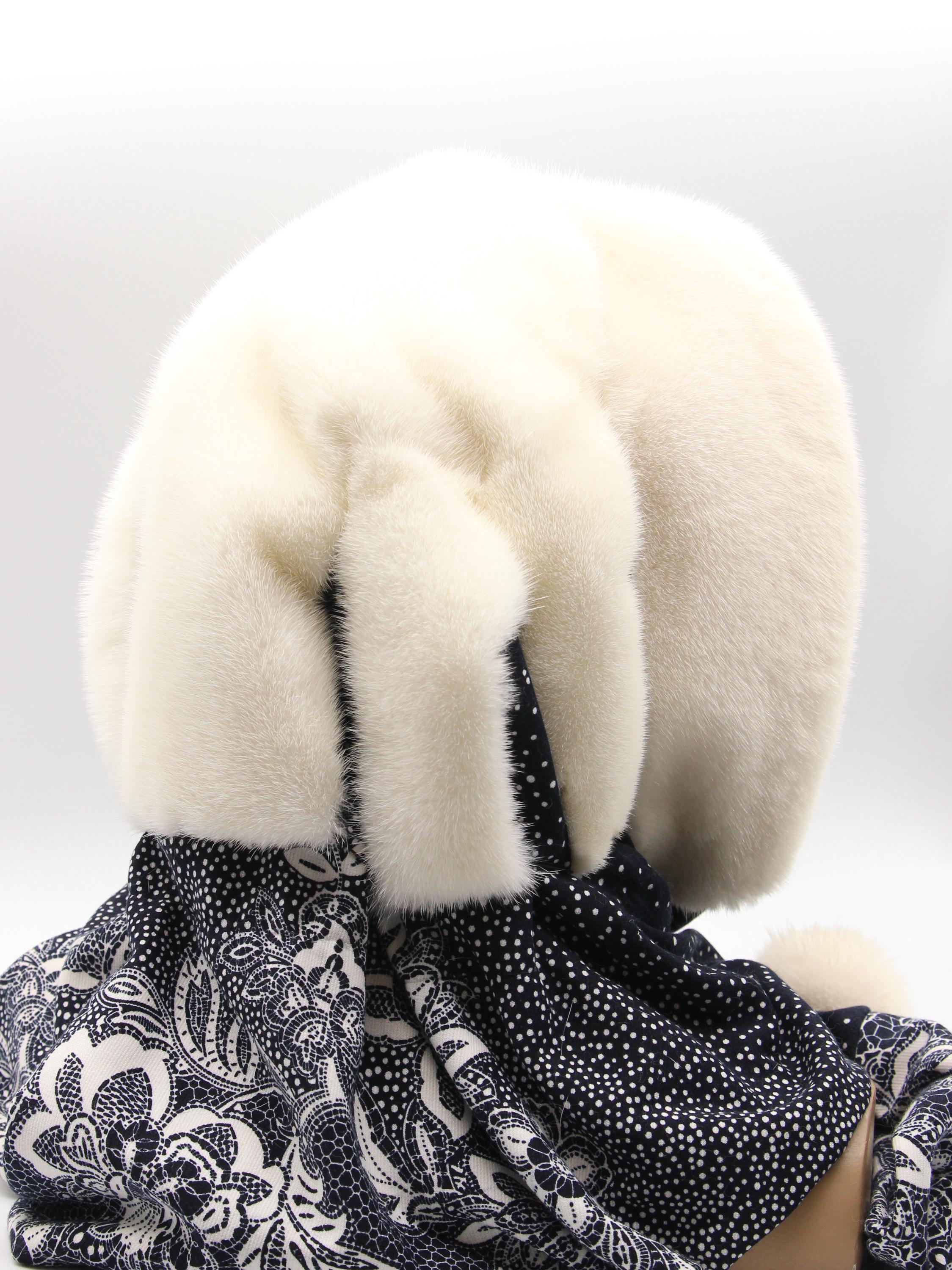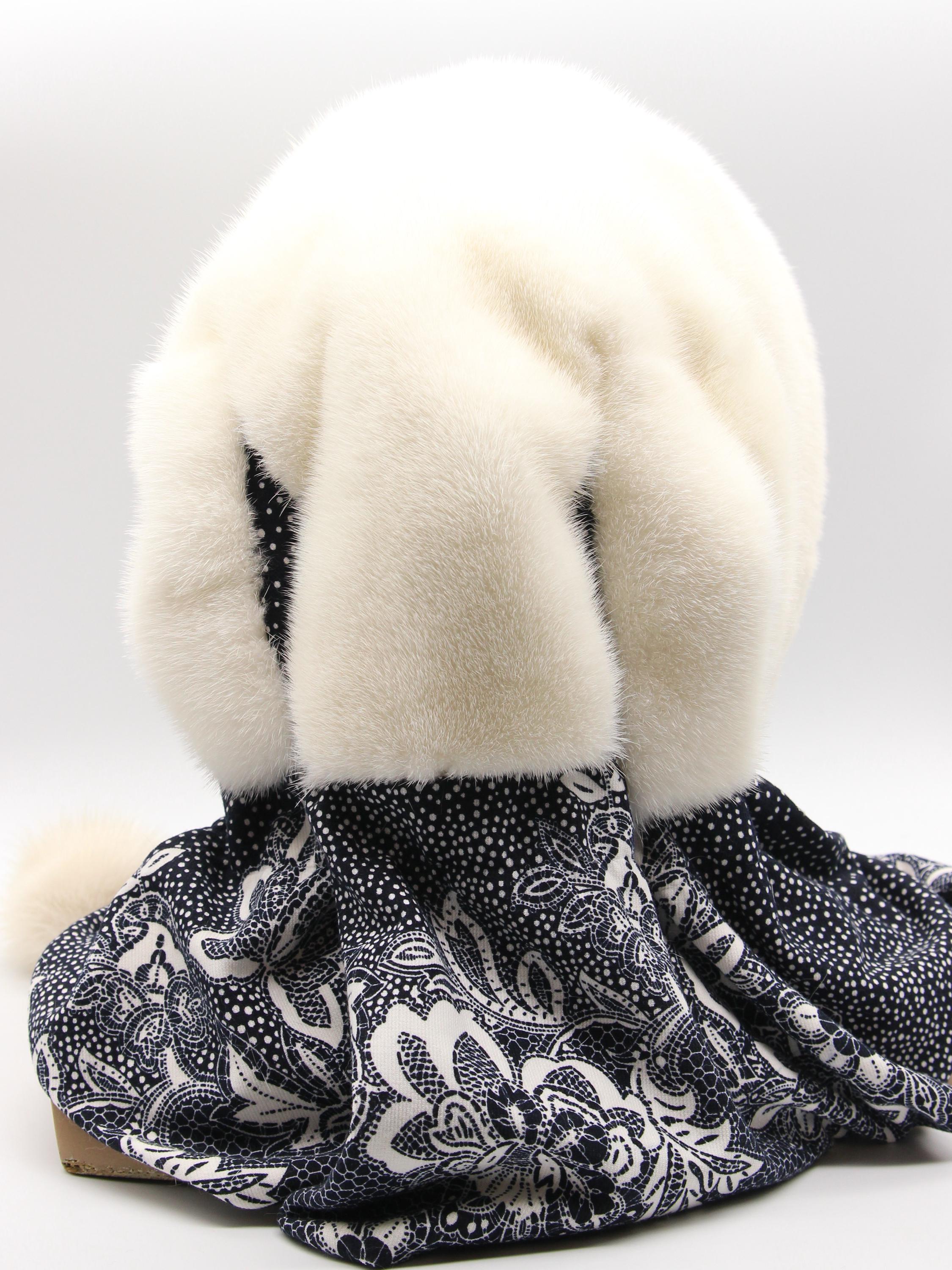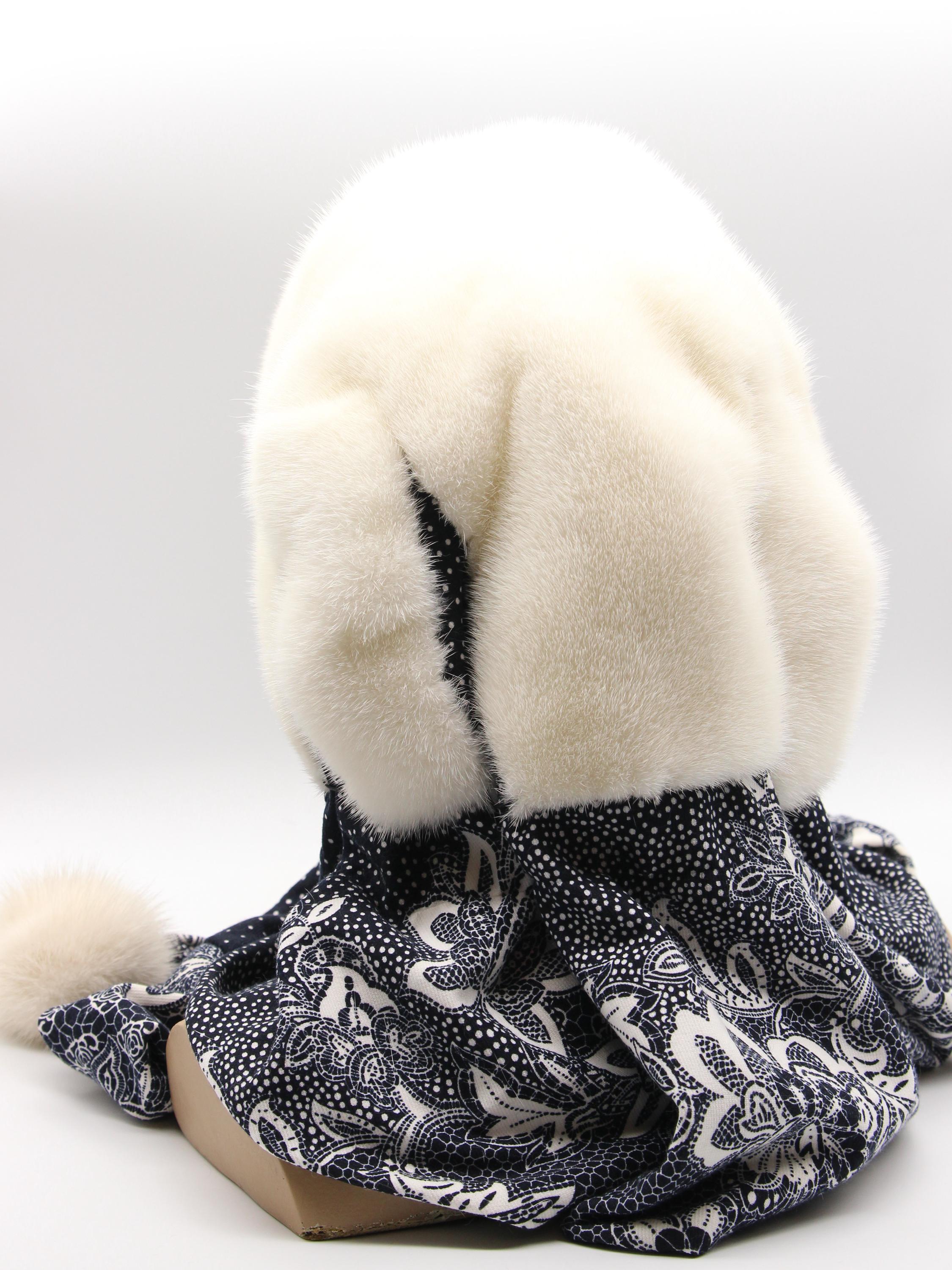 Natural white mink hood for women paired with dark fabric scarf showing floral pattern. Clean white mink from selective breeding - zero bleach or dye involved. Dark floral underneath creates striking contrast making this women's winter fur hat stand out without costume appearance.