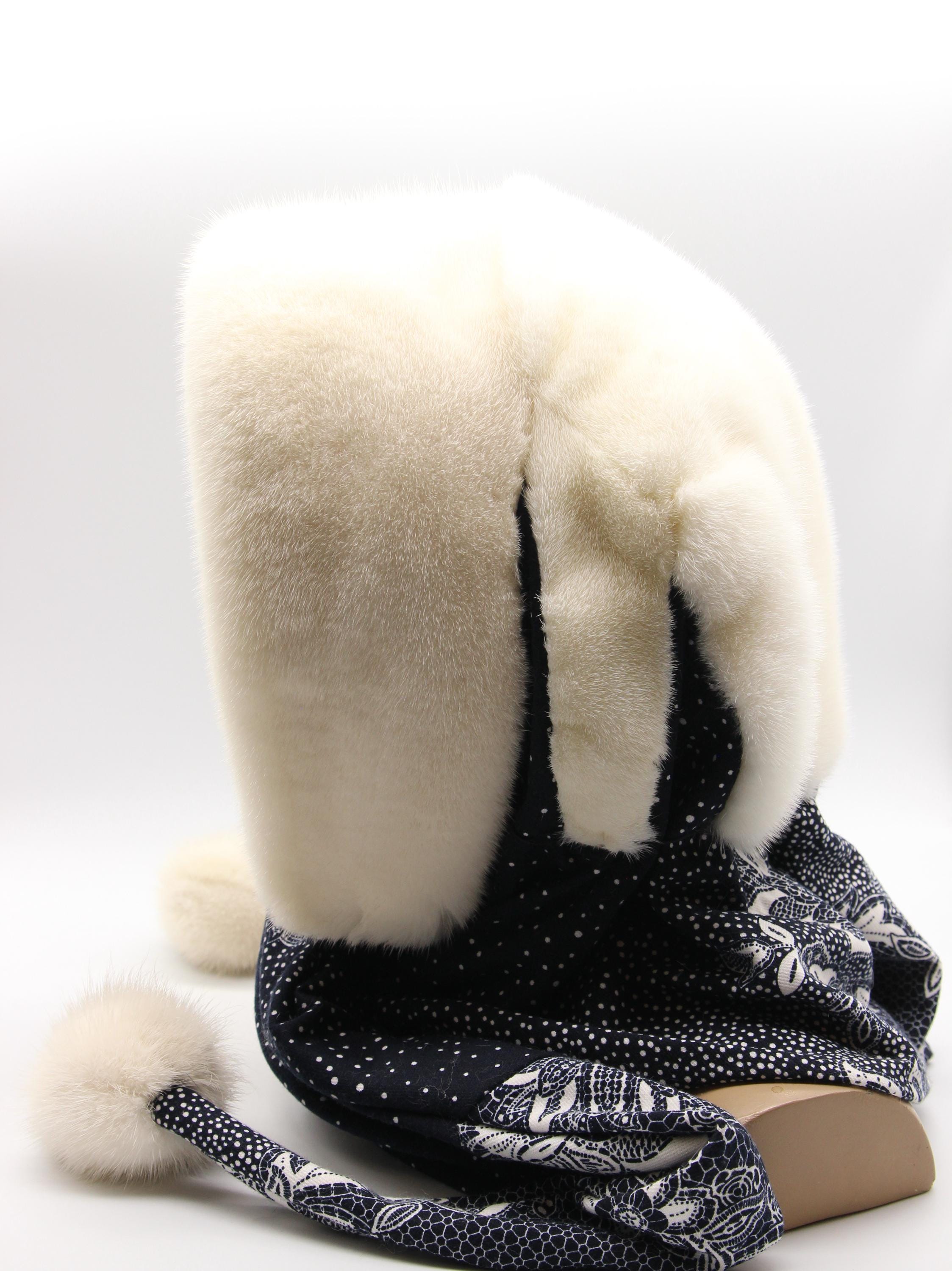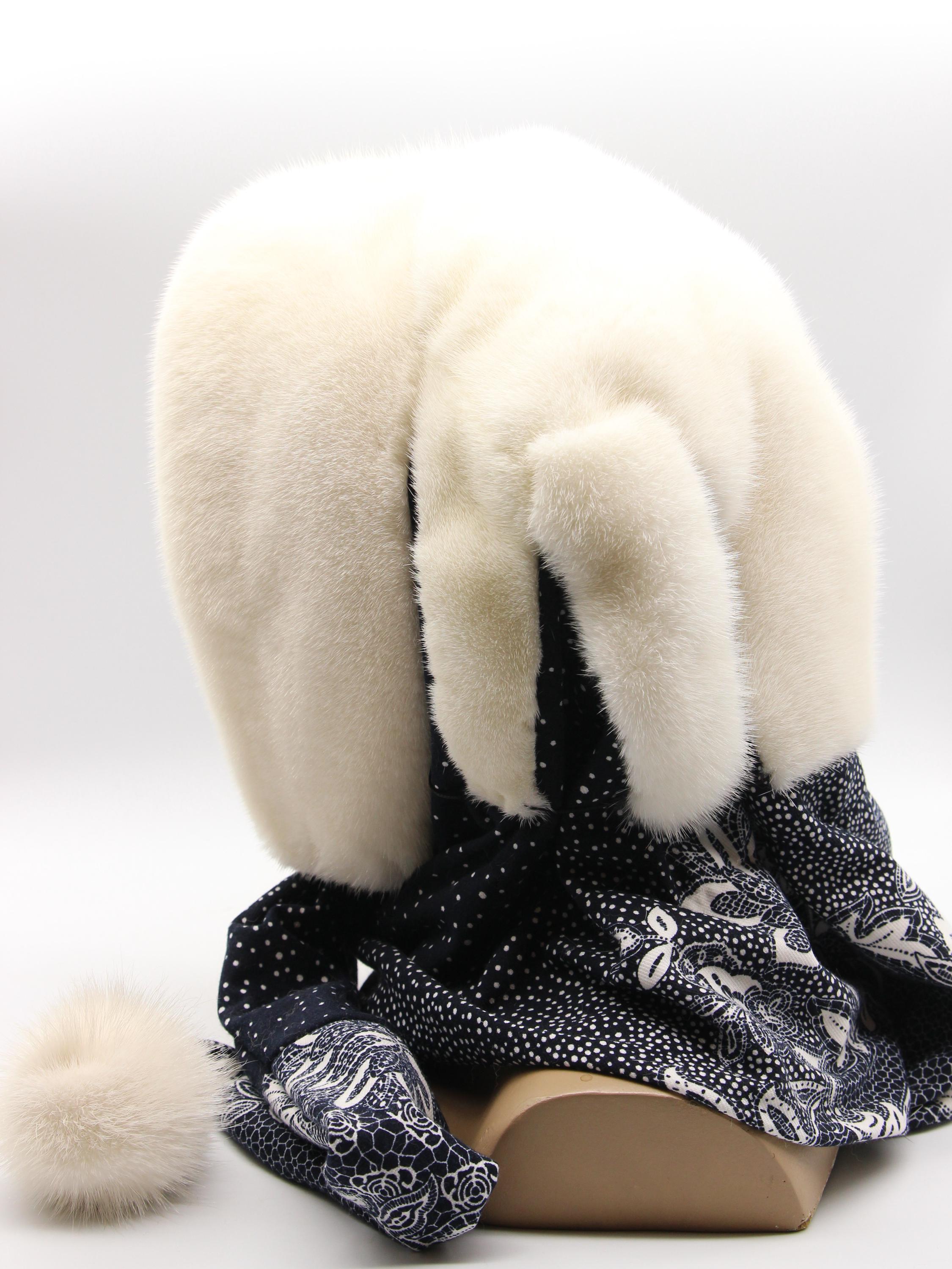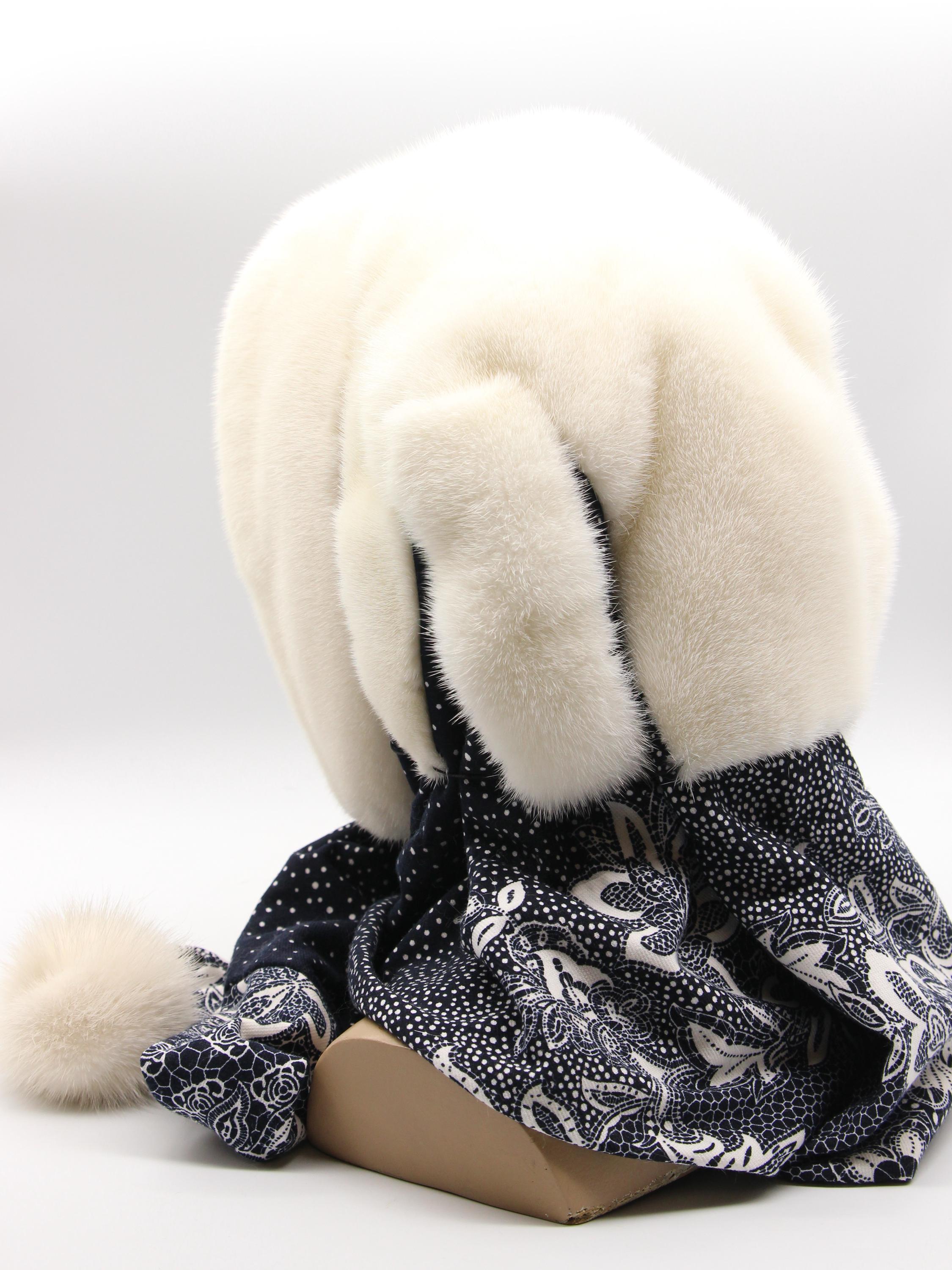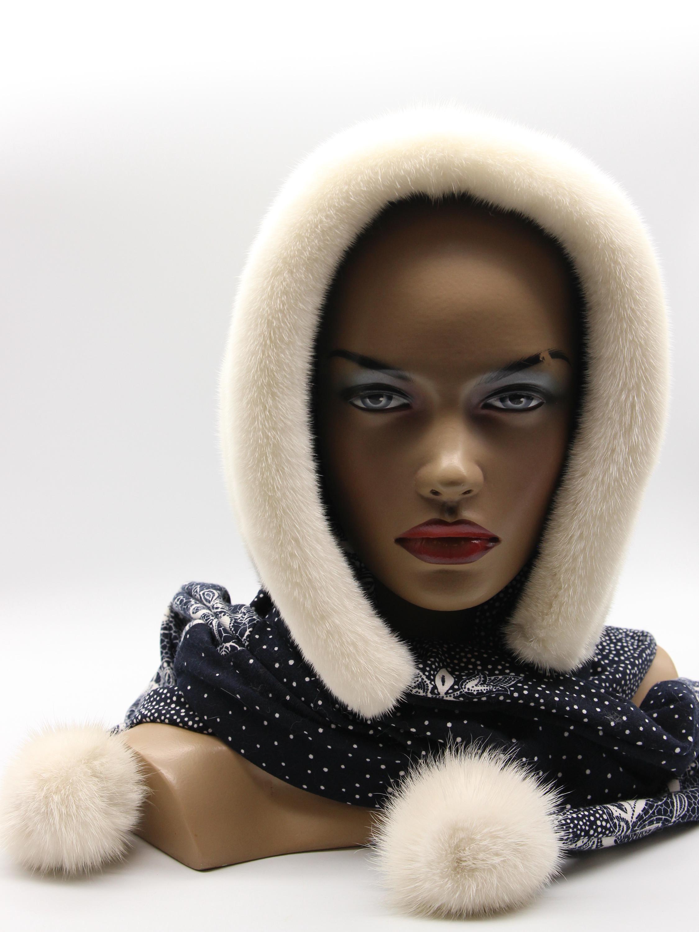 Natural white mink hood for women paired with dark fabric scarf showing floral pattern. Clean white mink from selective breeding - zero bleach or dye involved. Dark floral underneath creates striking contrast making this women's winter fur hat stand out without costume appearance.