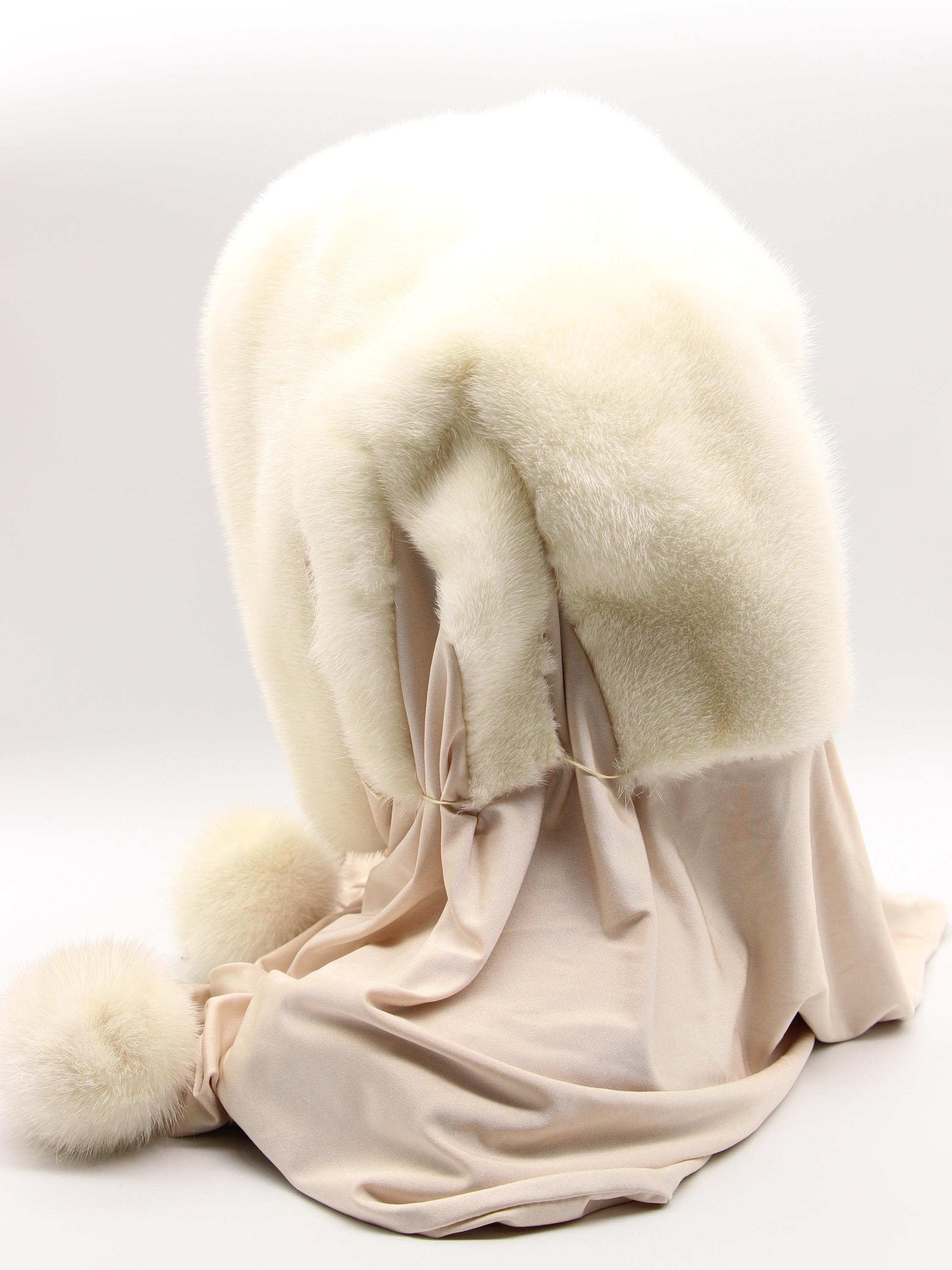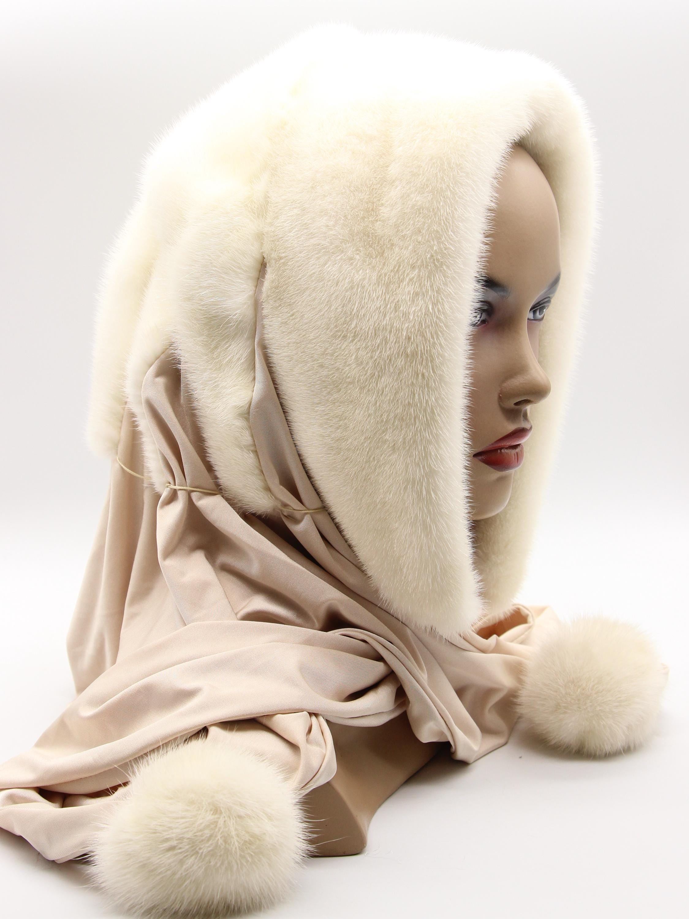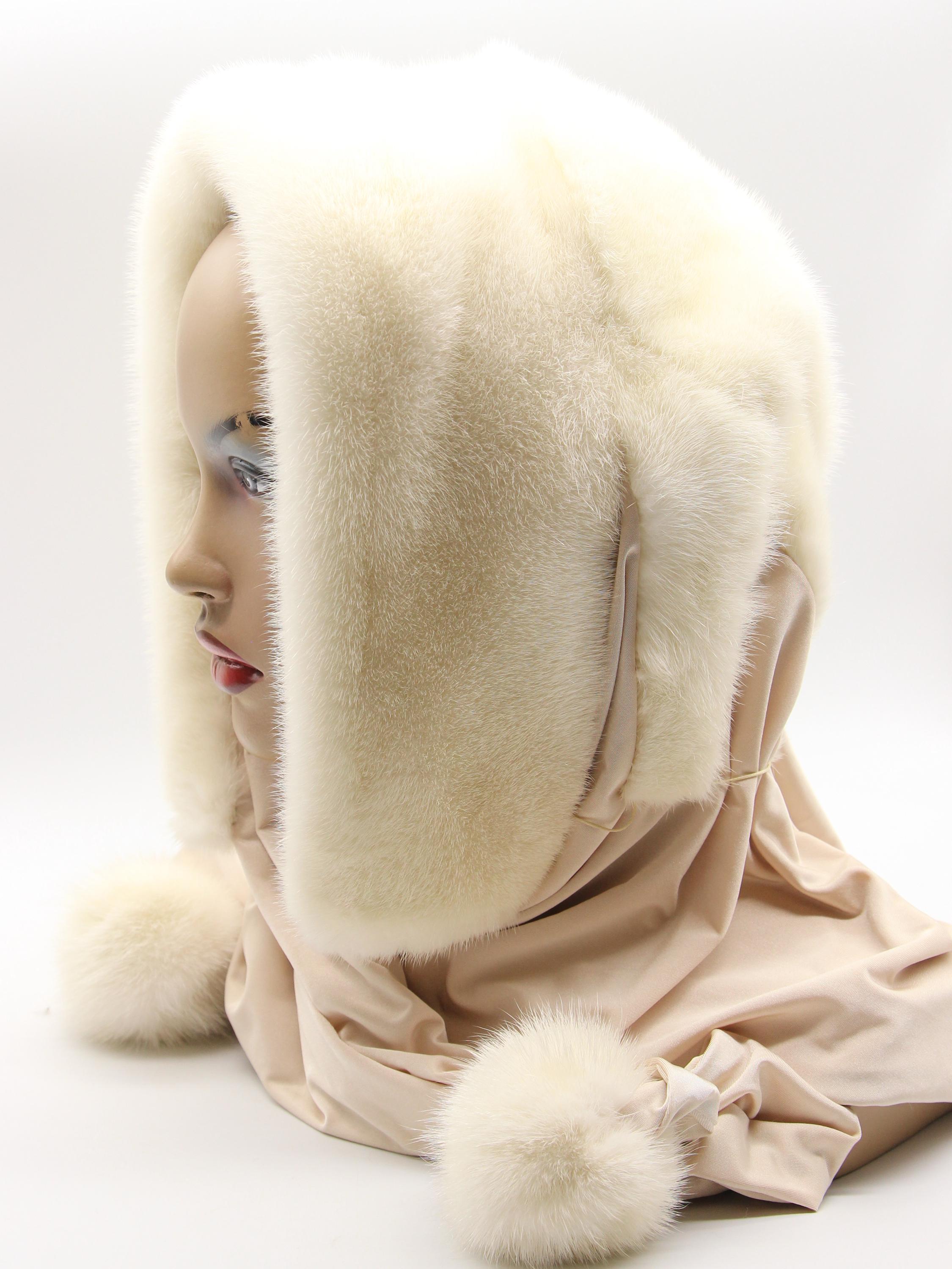 Natural white mink hood for women paired with light beige fabric scarf plus white fur pom-poms adding playful detail. Clean white mink from selective breeding - zero bleach involved. Light beige underneath maintains everything soft and neutral while white pom-poms bring unexpected charm making this women's winter fur hat feel special without forcing it.