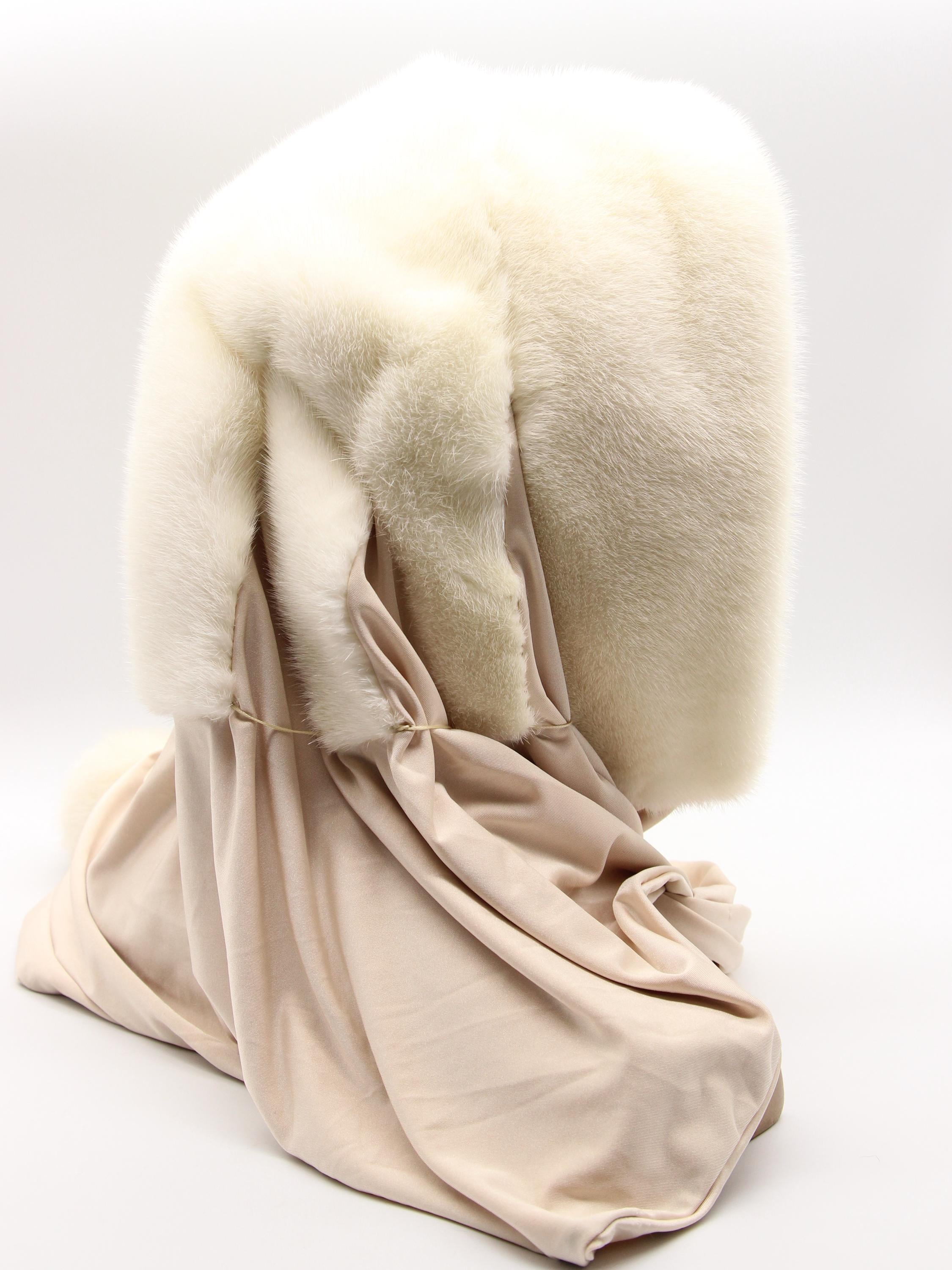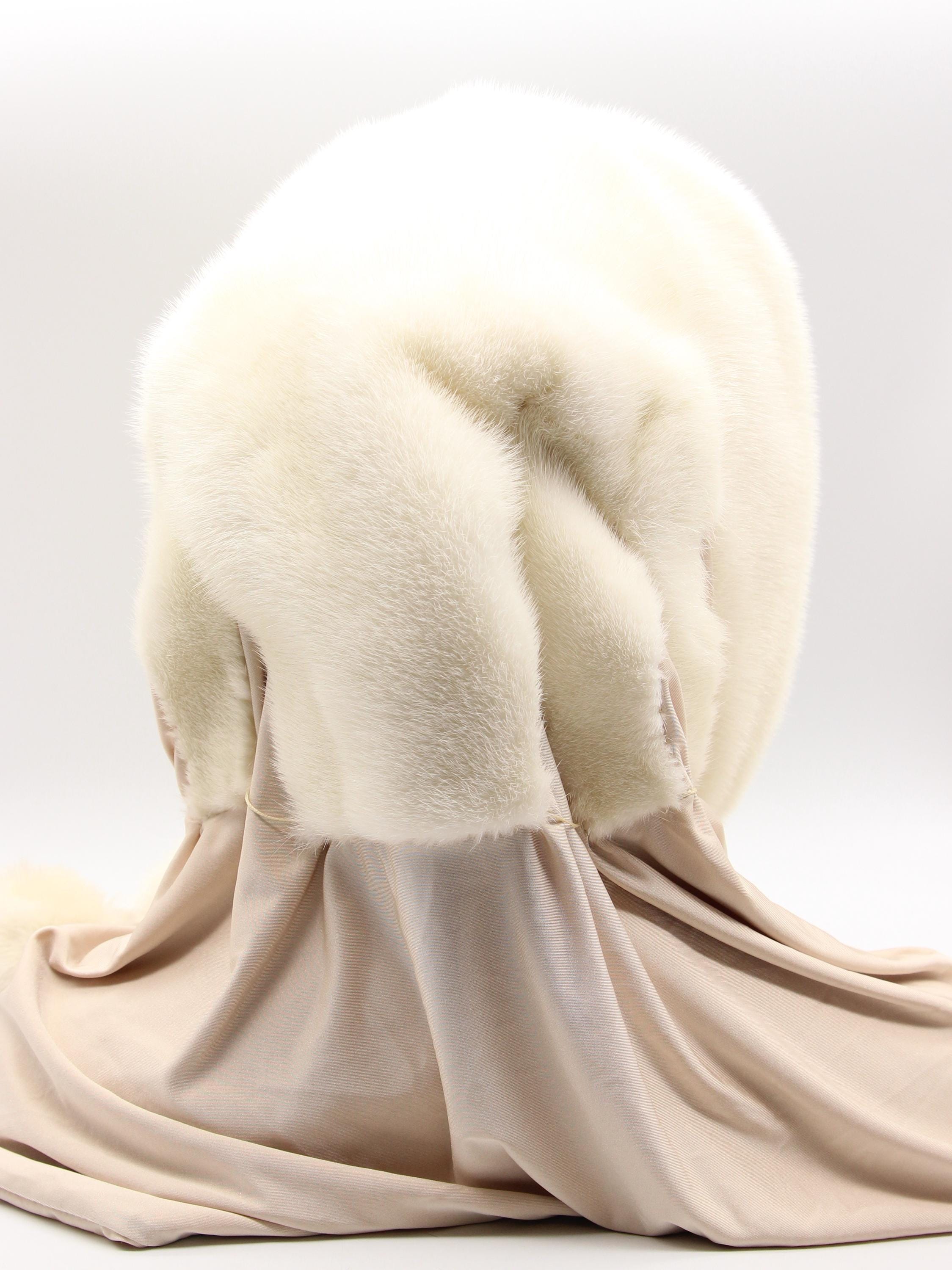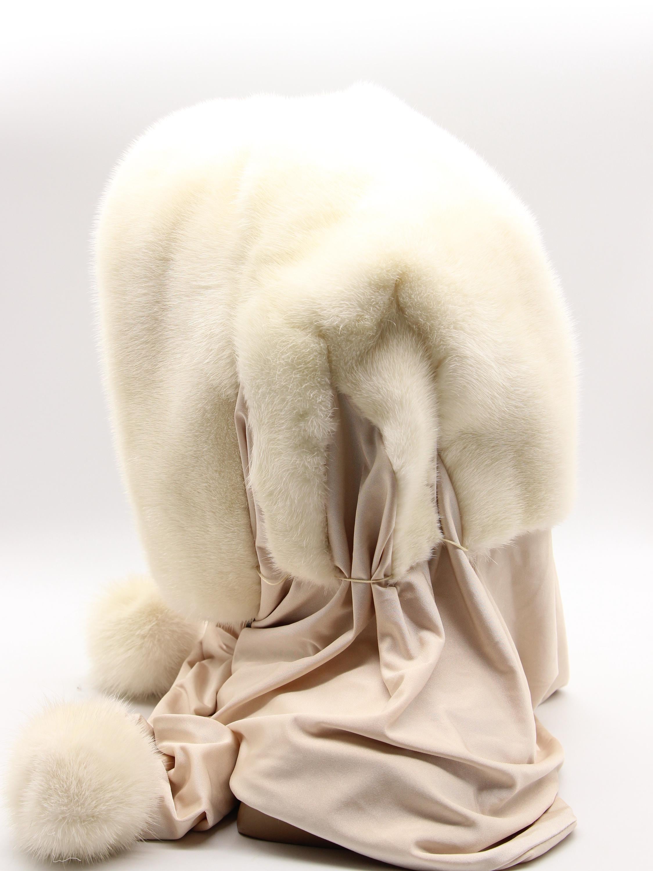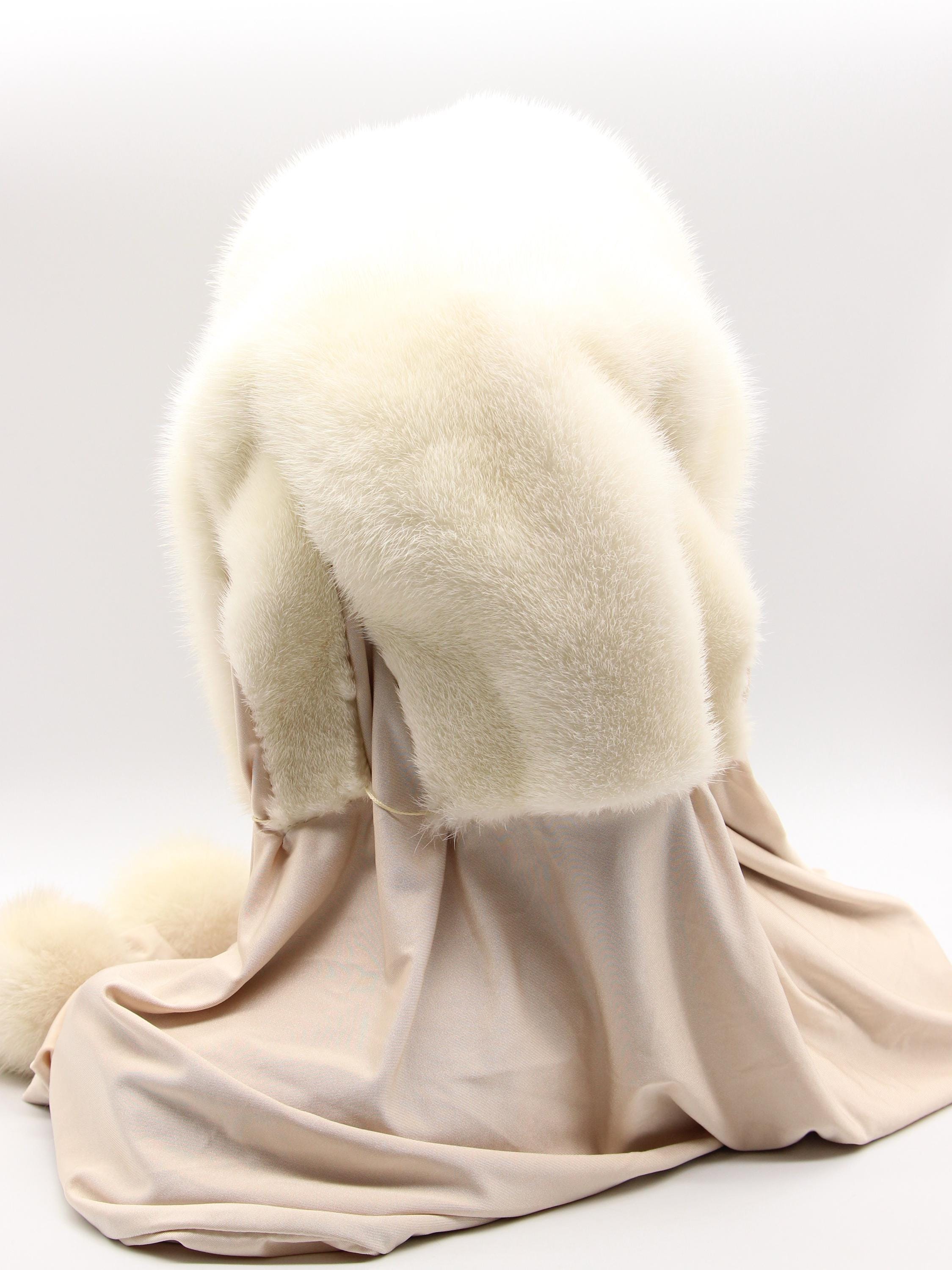 Natural white mink hood for women paired with light beige fabric scarf plus white fur pom-poms adding playful detail. Clean white mink from selective breeding - zero bleach involved. Light beige underneath maintains everything soft and neutral while white pom-poms bring unexpected charm making this women's winter fur hat feel special without forcing it.