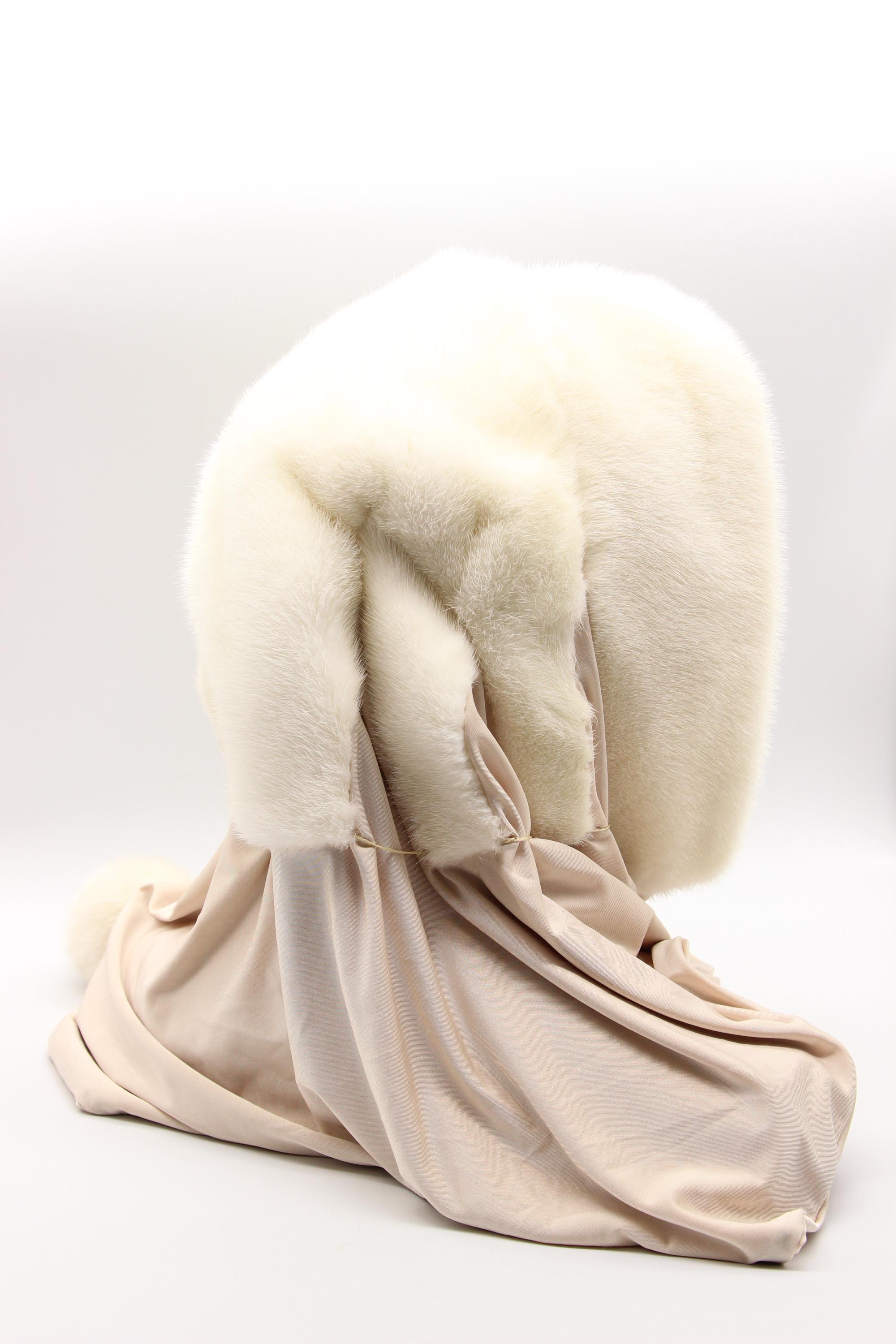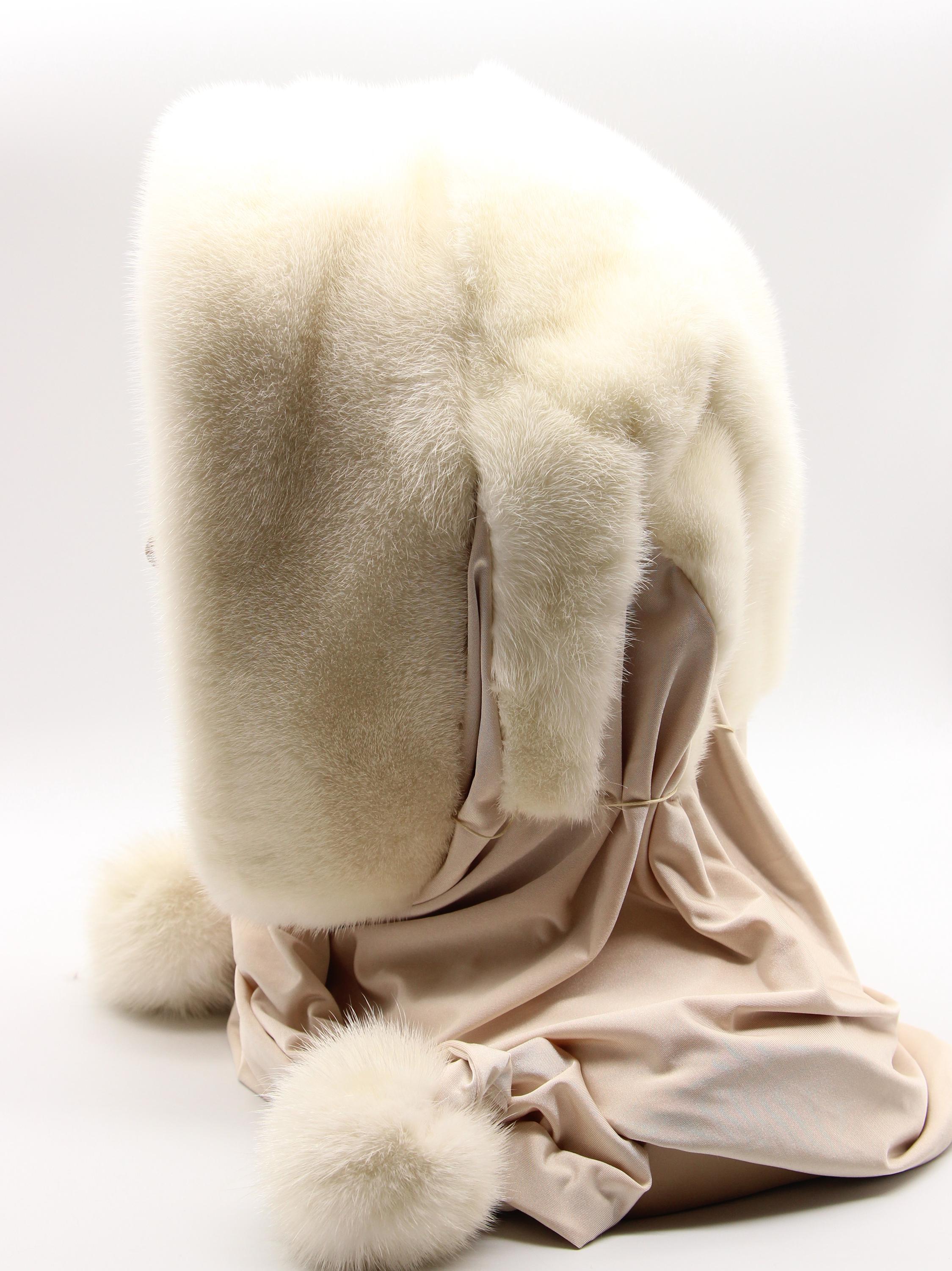 Regular brown women's fur hats appear traditional and serious. Want something feels fresh and fun while staying elegant, this white mink hood with light beige fabric and white pom-poms delivers. Ships ready as finished women's winter piece.