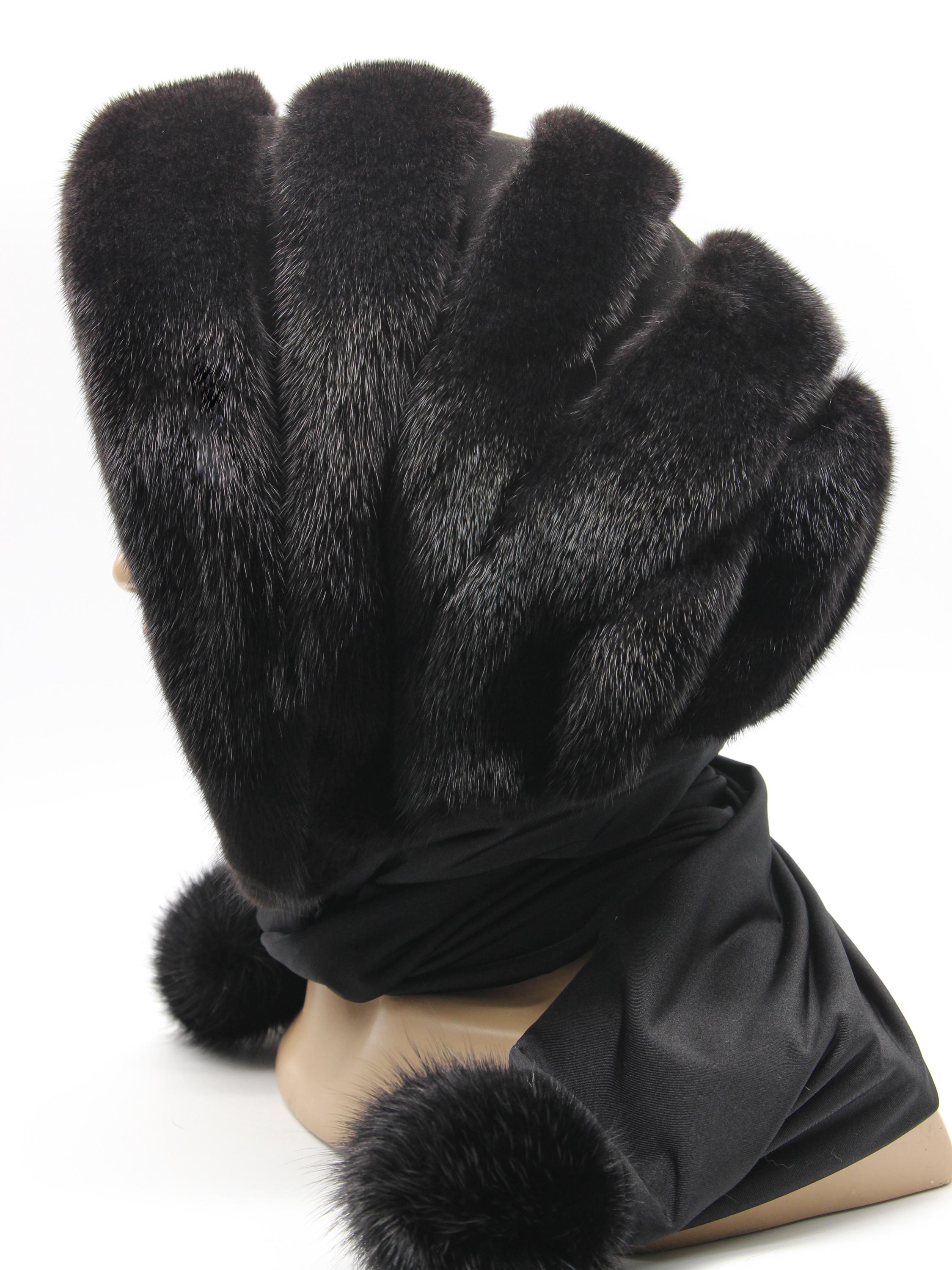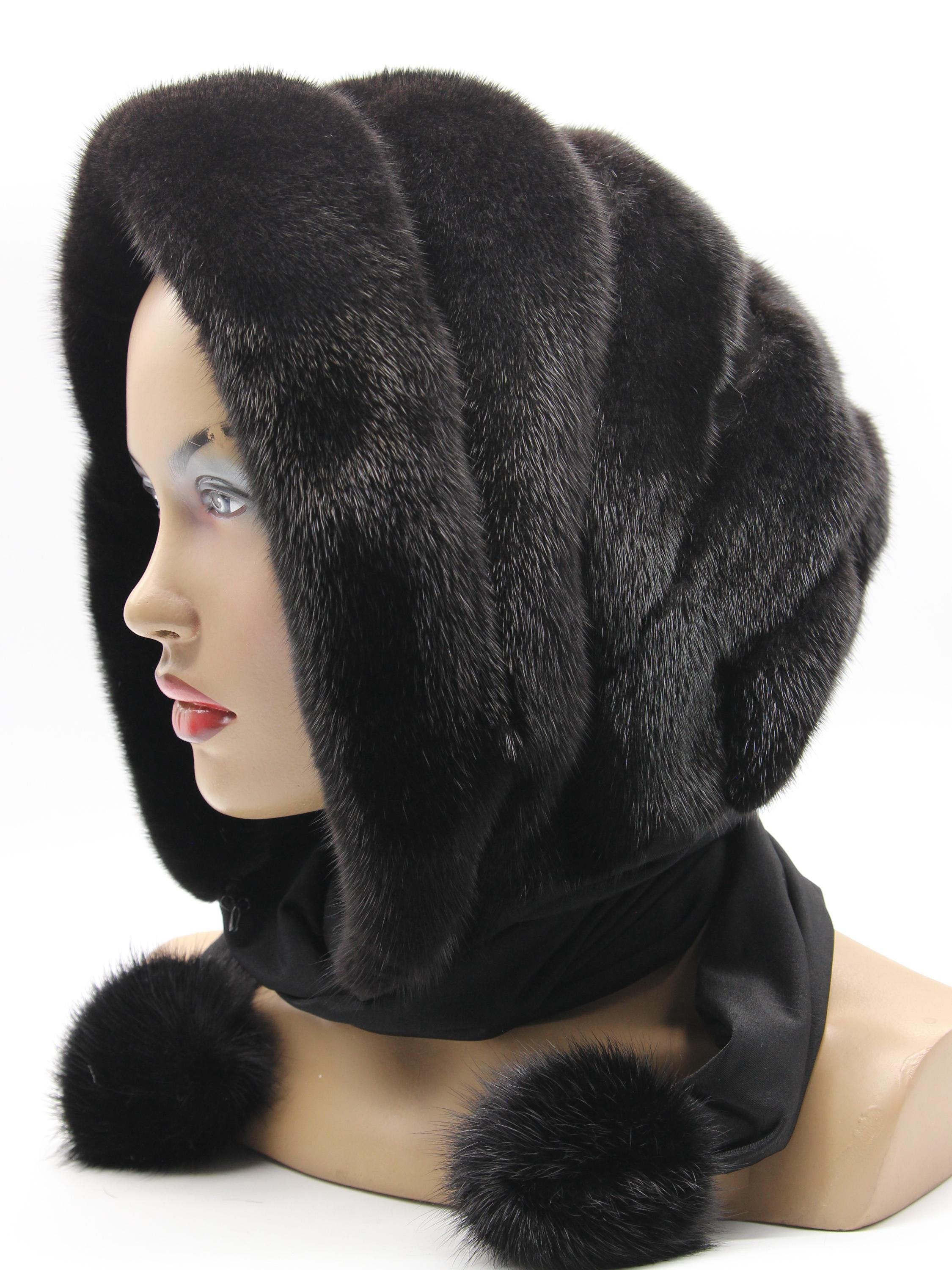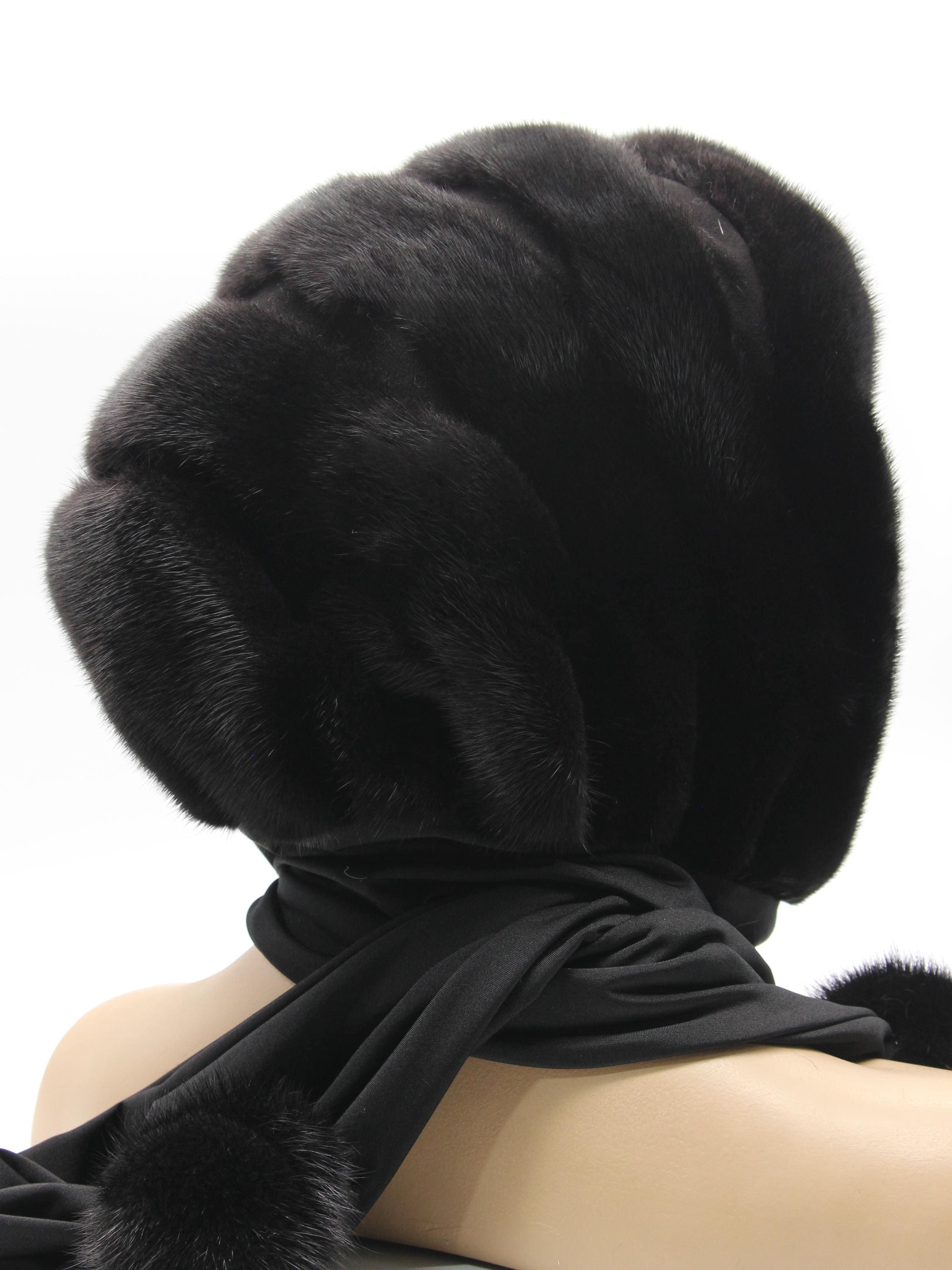 Women's winter hat meets hooded scarf in this natural black mink fur design. Real black mink fur hood wraps your head while black fabric scarf portion covers neck and shoulders. One piece construction eliminates gaps between hat and scarf. Cold weather accessory handmade with black fabric ties and soft lining. Black mink fur head warmer for harsh winter conditions in Milwaukee, Edmonton, and similar climates.