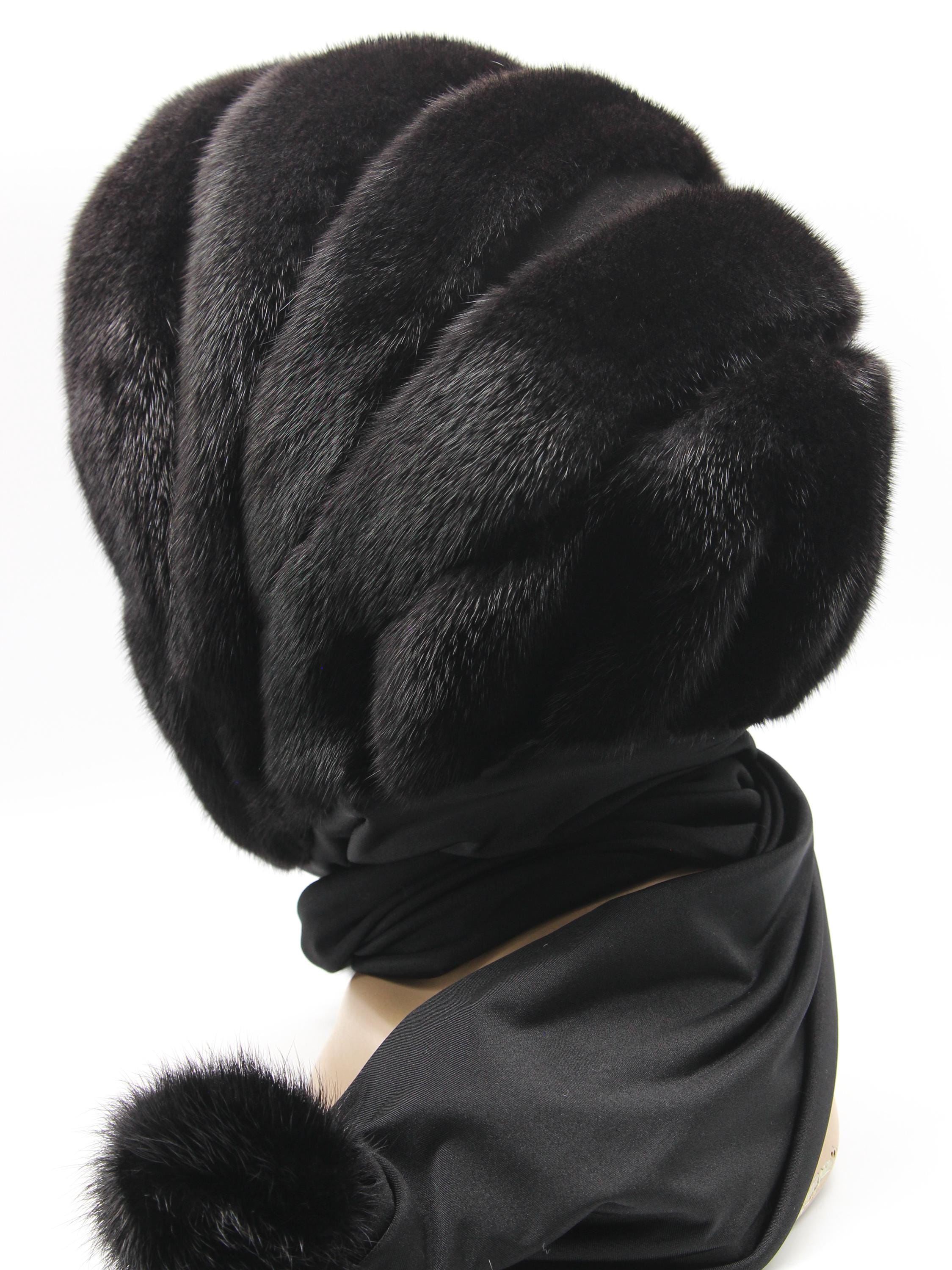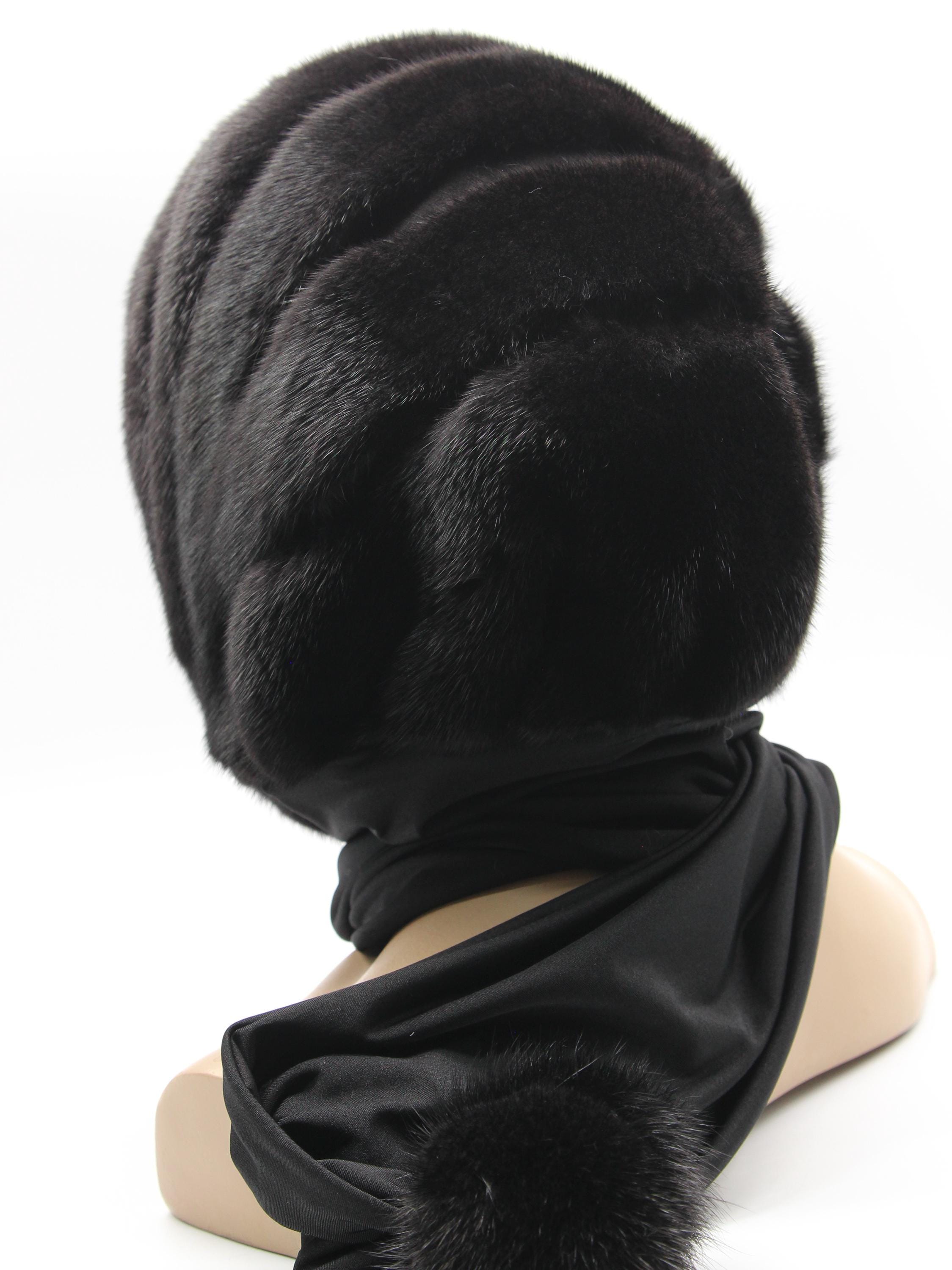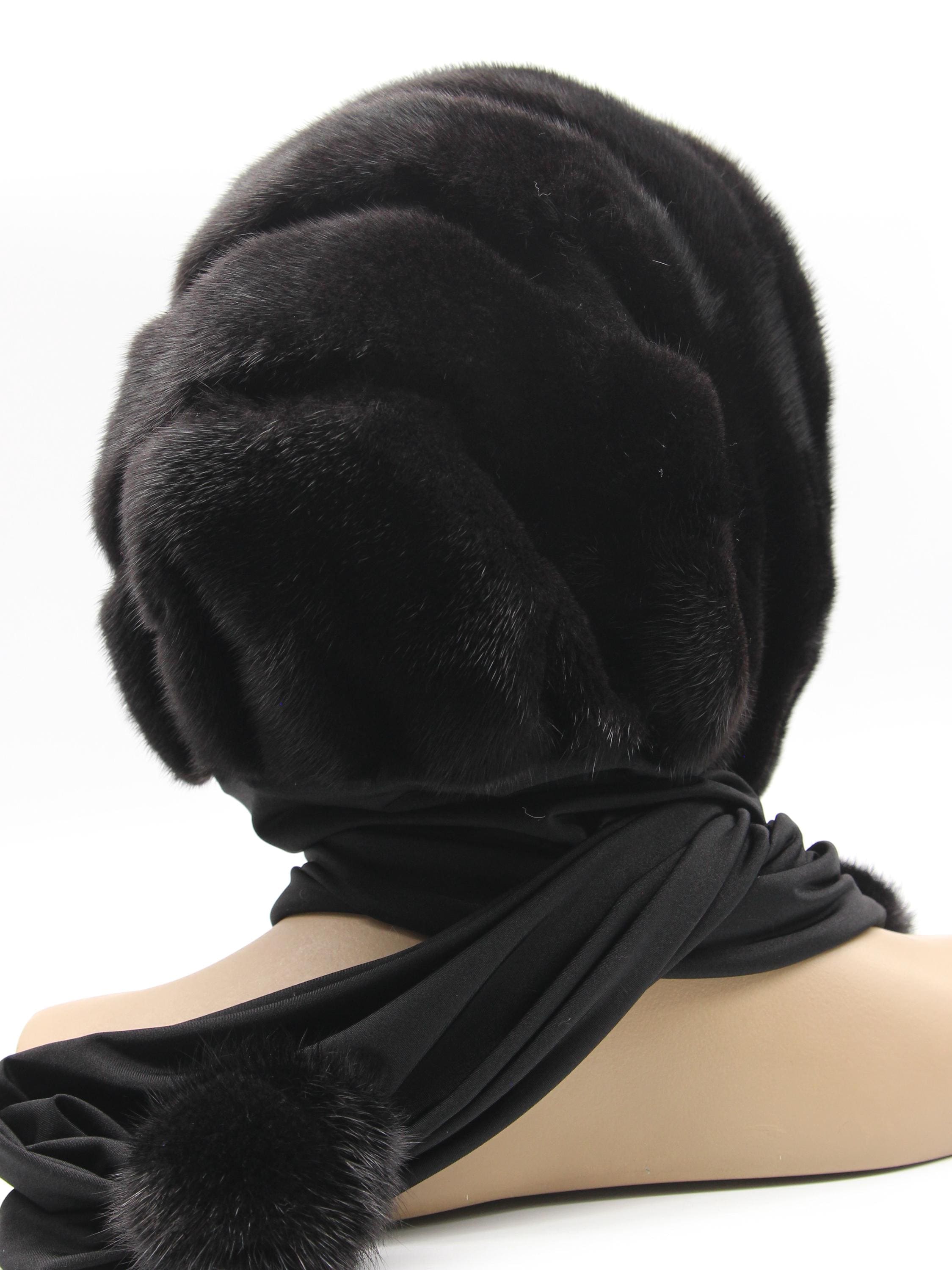 Women's winter hat meets hooded scarf in this natural black mink fur design. Real black mink fur hood wraps your head while black fabric scarf portion covers neck and shoulders. One piece construction eliminates gaps between hat and scarf. Cold weather accessory handmade with black fabric ties and soft lining. Black mink fur head warmer for harsh winter conditions in Milwaukee, Edmonton, and similar climates.